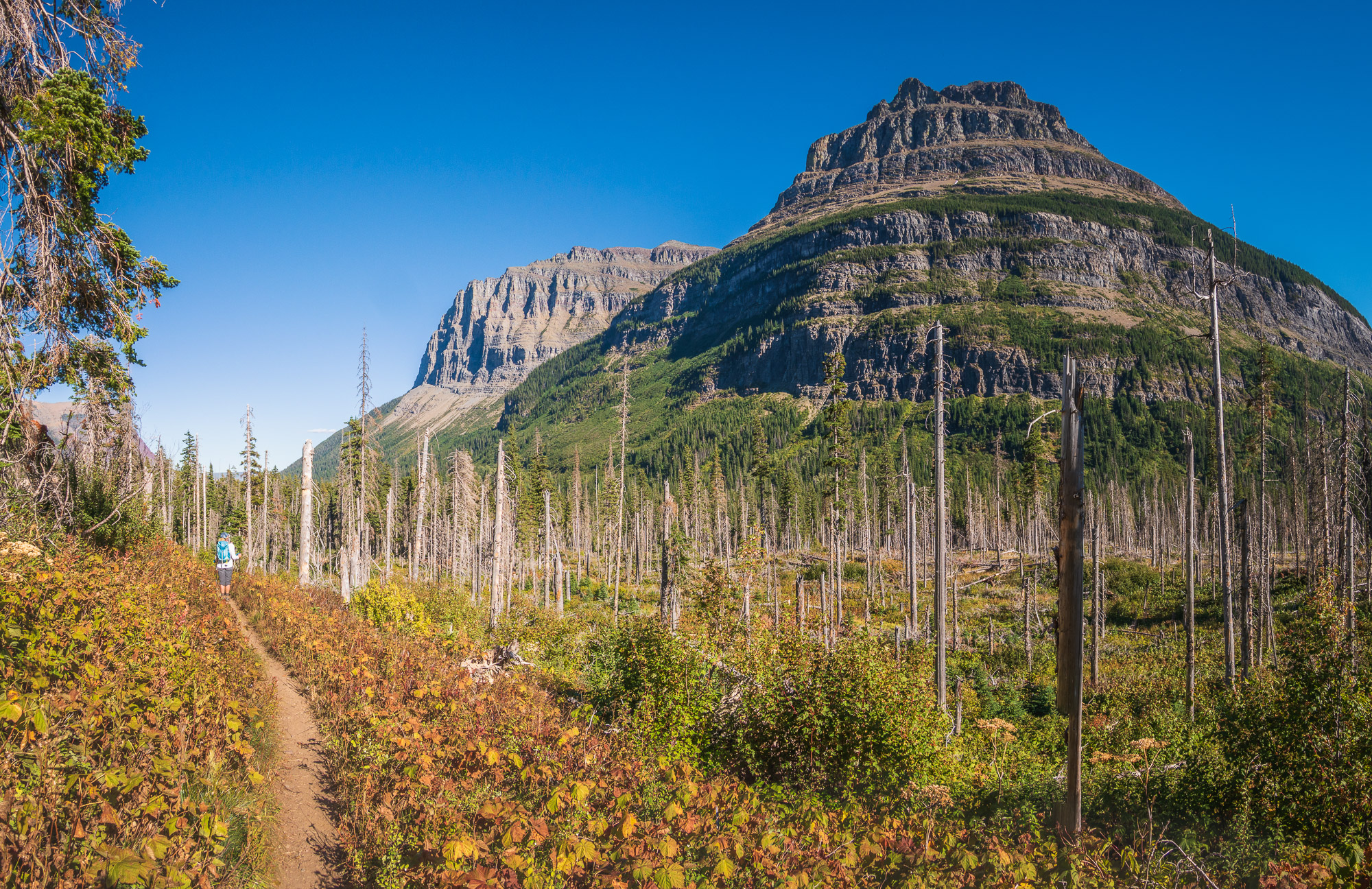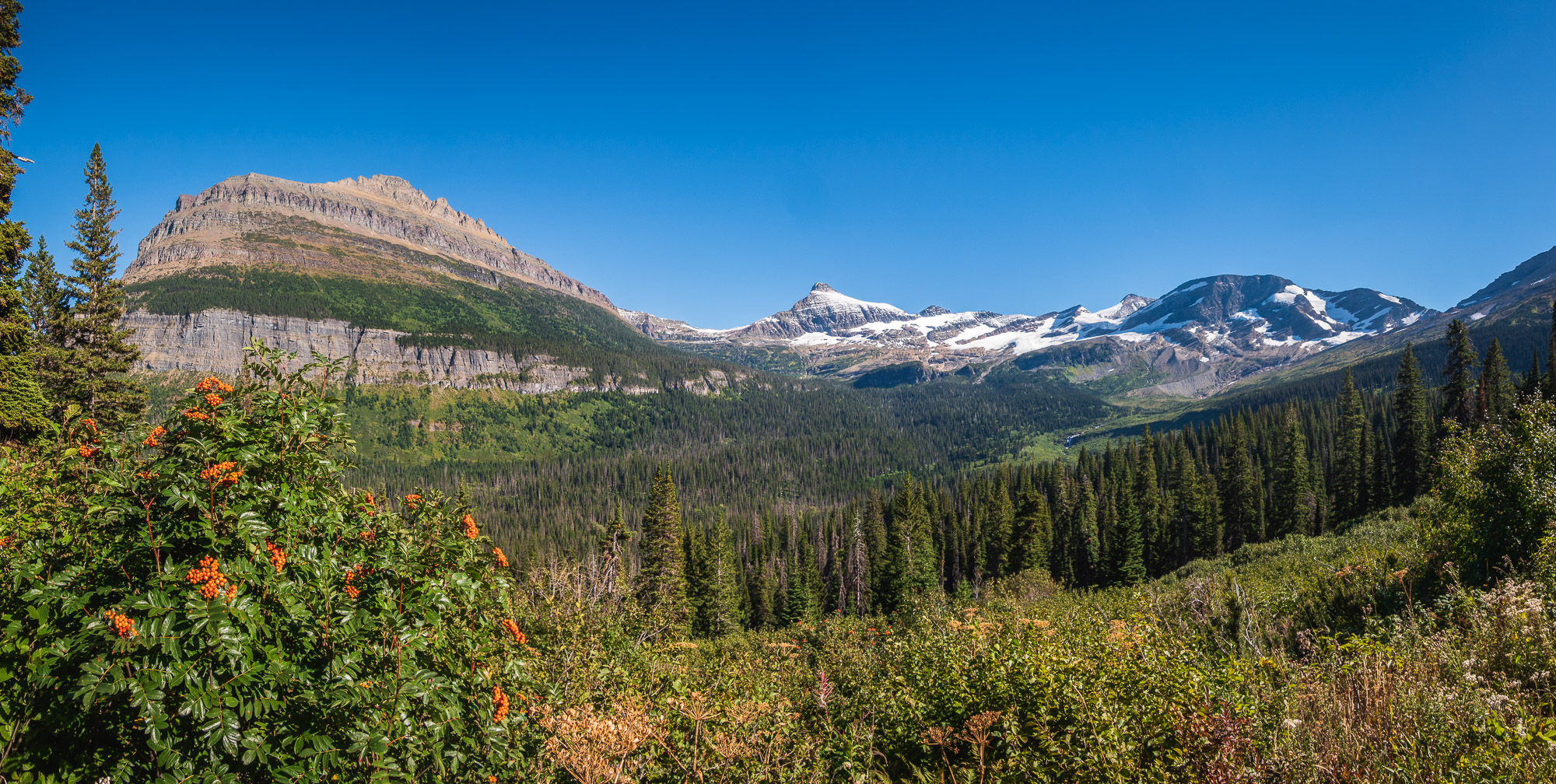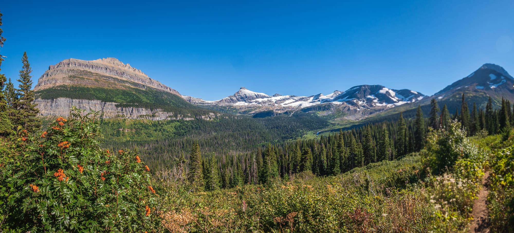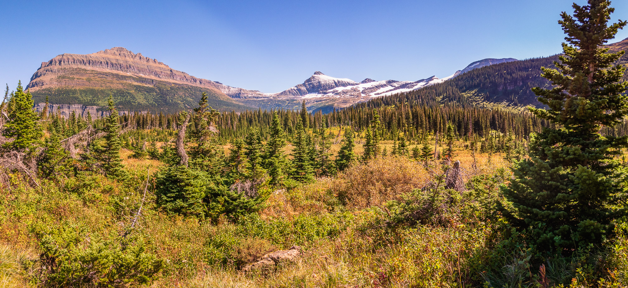 Two more wonderful day hikes that we had not done before while at Glacier National Park, the first was to Gunsight Lake from the Gunsight Pass Trailhead on the Going-to-the-Sun Road east of Logan Pass. The trail started in a gradual descent for about a mile when we came to Deadwood Falls, a beautiful 10-foot waterfall with deep crystal clear pools of water above and below the falls. We continued on for about 2 miles to the St Mary River and the beautiful valley where we were hoping to spot a moose that some hikers had seen earlier. No luck this time. A little further along we came to an opening in the canopy that provided us with one of the most magnificent views in Glacier. In the foreground is an open grassy meadow alongside Mirror Pond and framing the background is Mount Jackson, Gunsight Mountain and Fusillade Mountain, as well as Gunsight Pass.