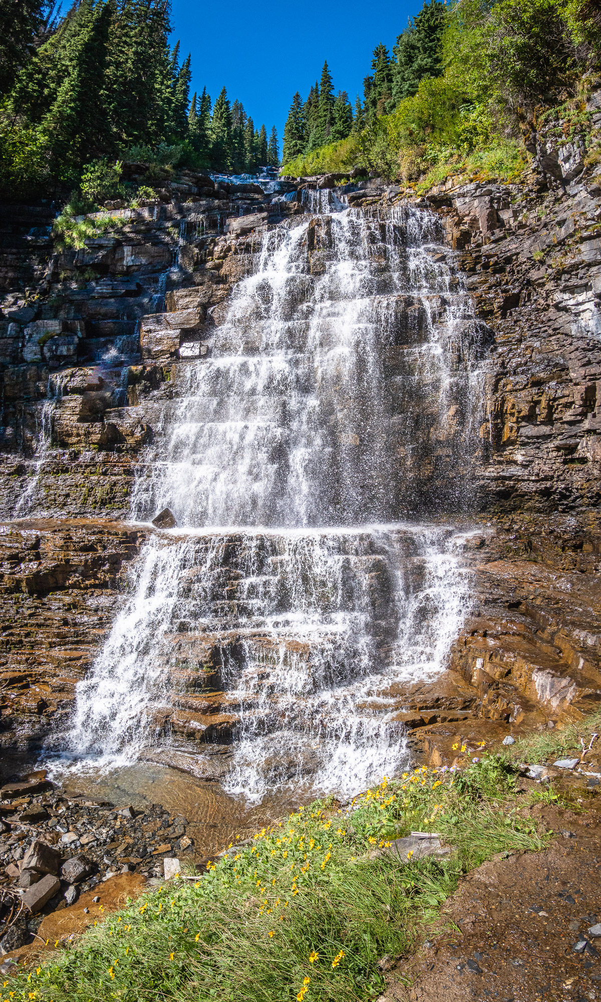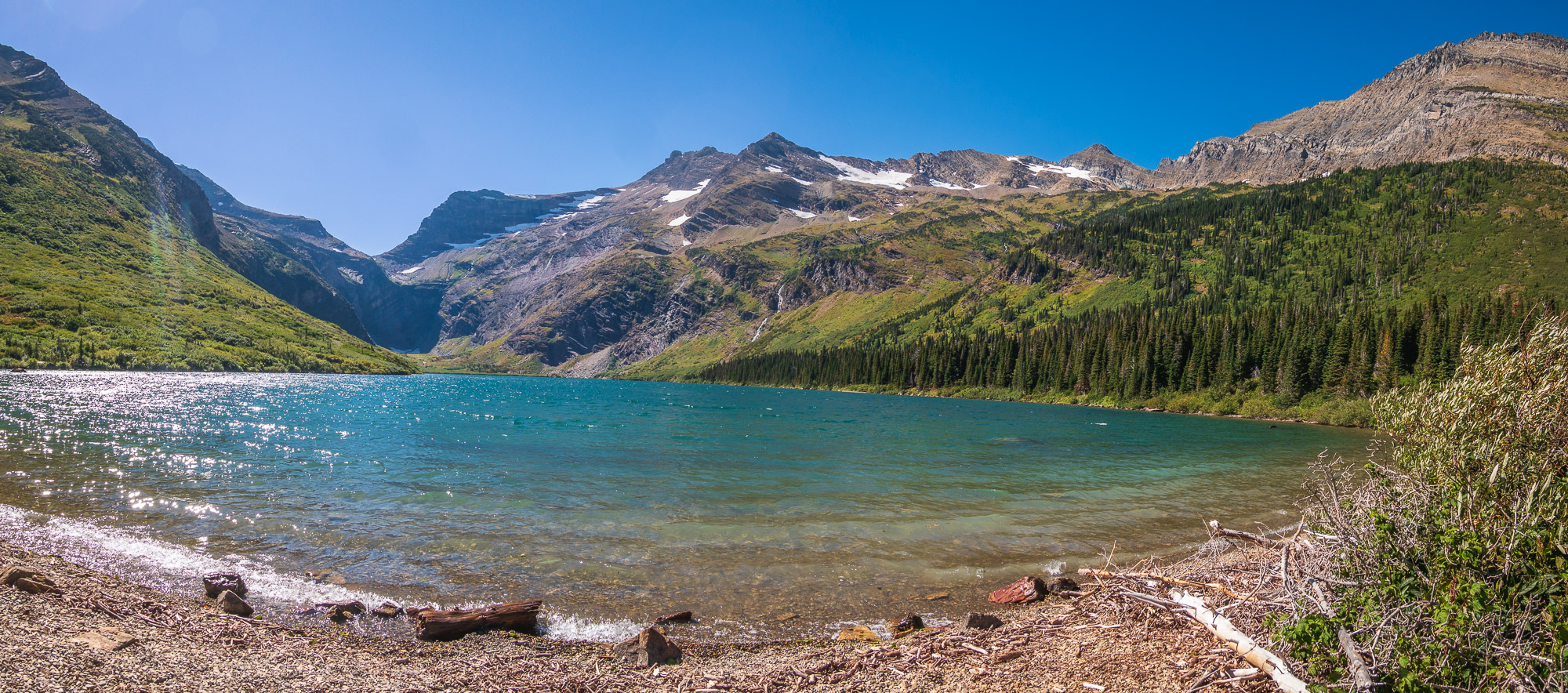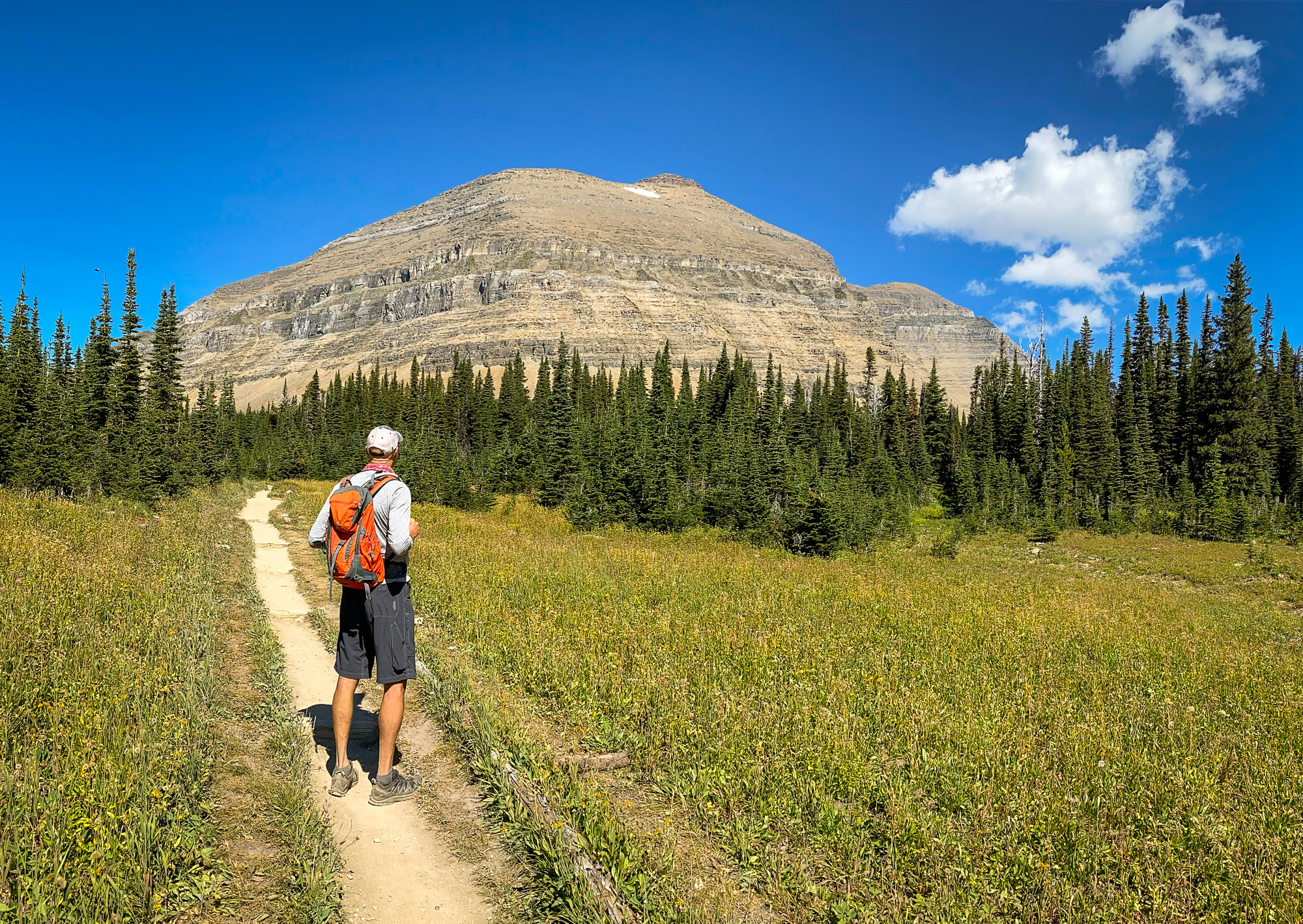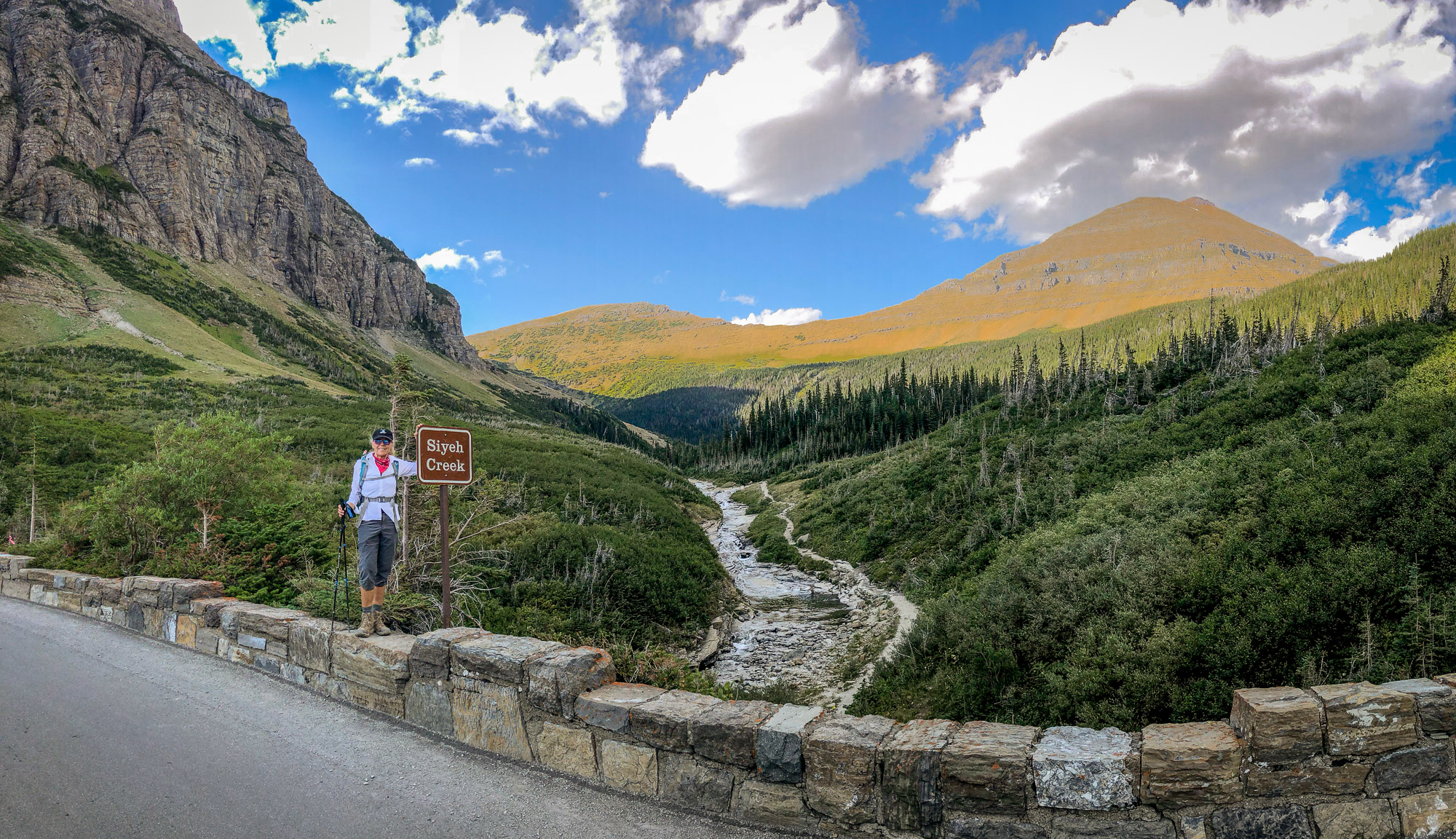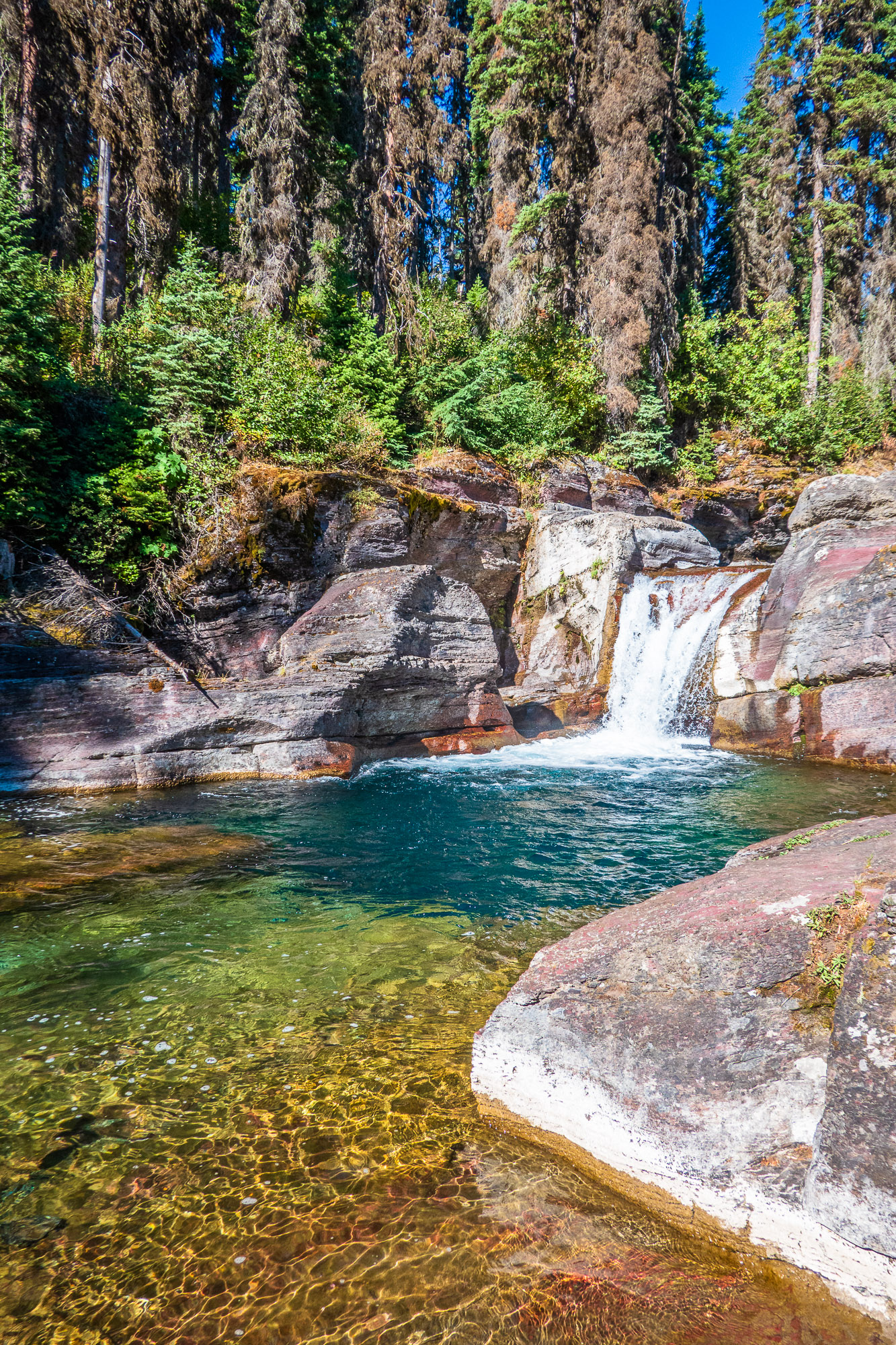 Two more wonderful day hikes that we had not done before while at Glacier National Park, the first was to Gunsight Lake from the Gunsight Pass Trailhead on the Going-to-the-Sun Road east of Logan Pass. The trail started in a gradual descent for about a mile when we came to Deadwood Falls, a beautiful 10-foot waterfall with deep crystal clear pools of water above and below the falls. We continued on for about 2 miles to the St Mary River and the beautiful valley where we were hoping to spot a moose that some hikers had seen earlier. No luck this time. A little further along we came to an opening in the canopy that provided us with one of the most magnificent views in Glacier. In the foreground is an open grassy meadow alongside Mirror Pond and framing the background is Mount Jackson, Gunsight Mountain and Fusillade Mountain, as well as Gunsight Pass.