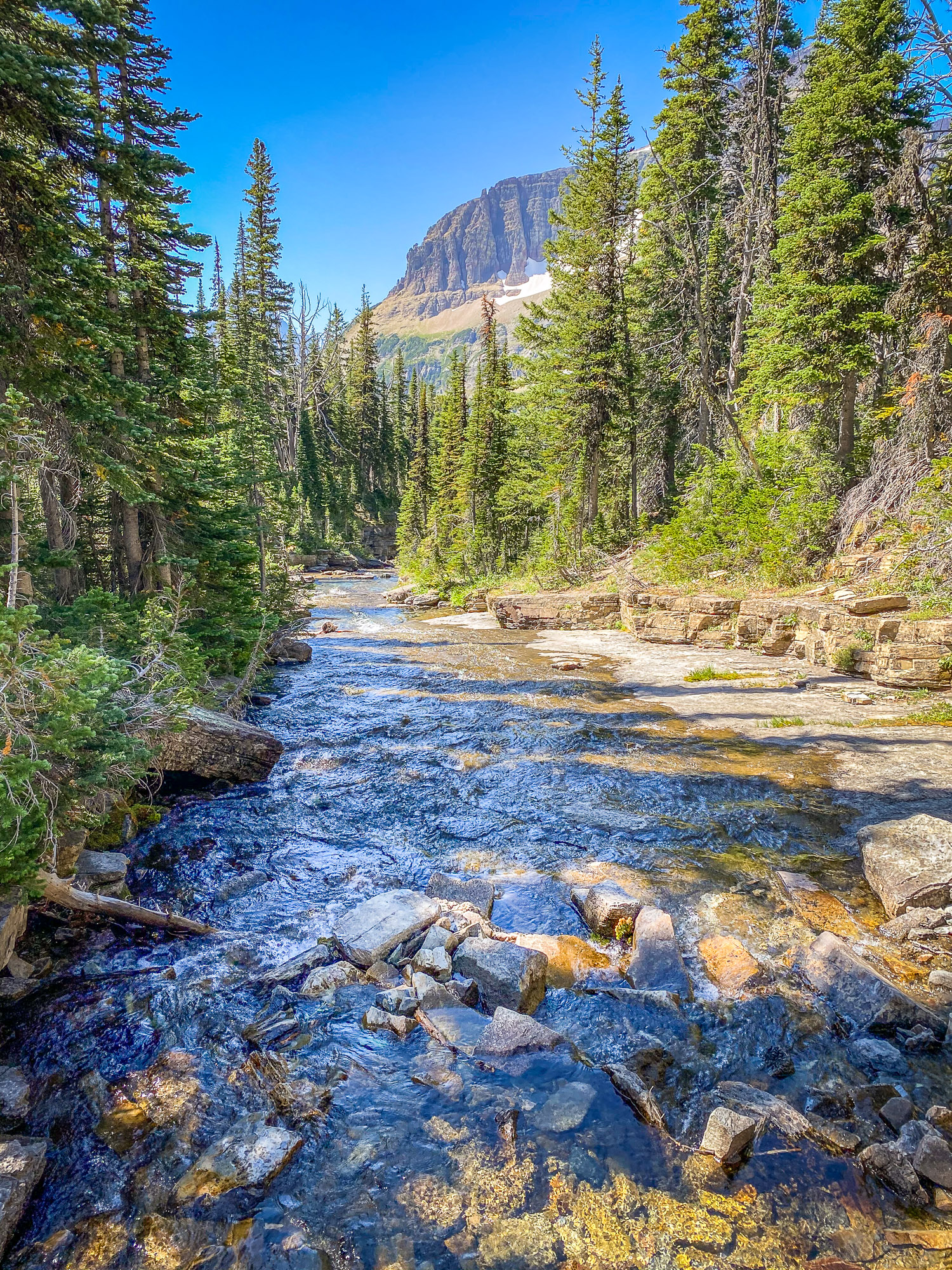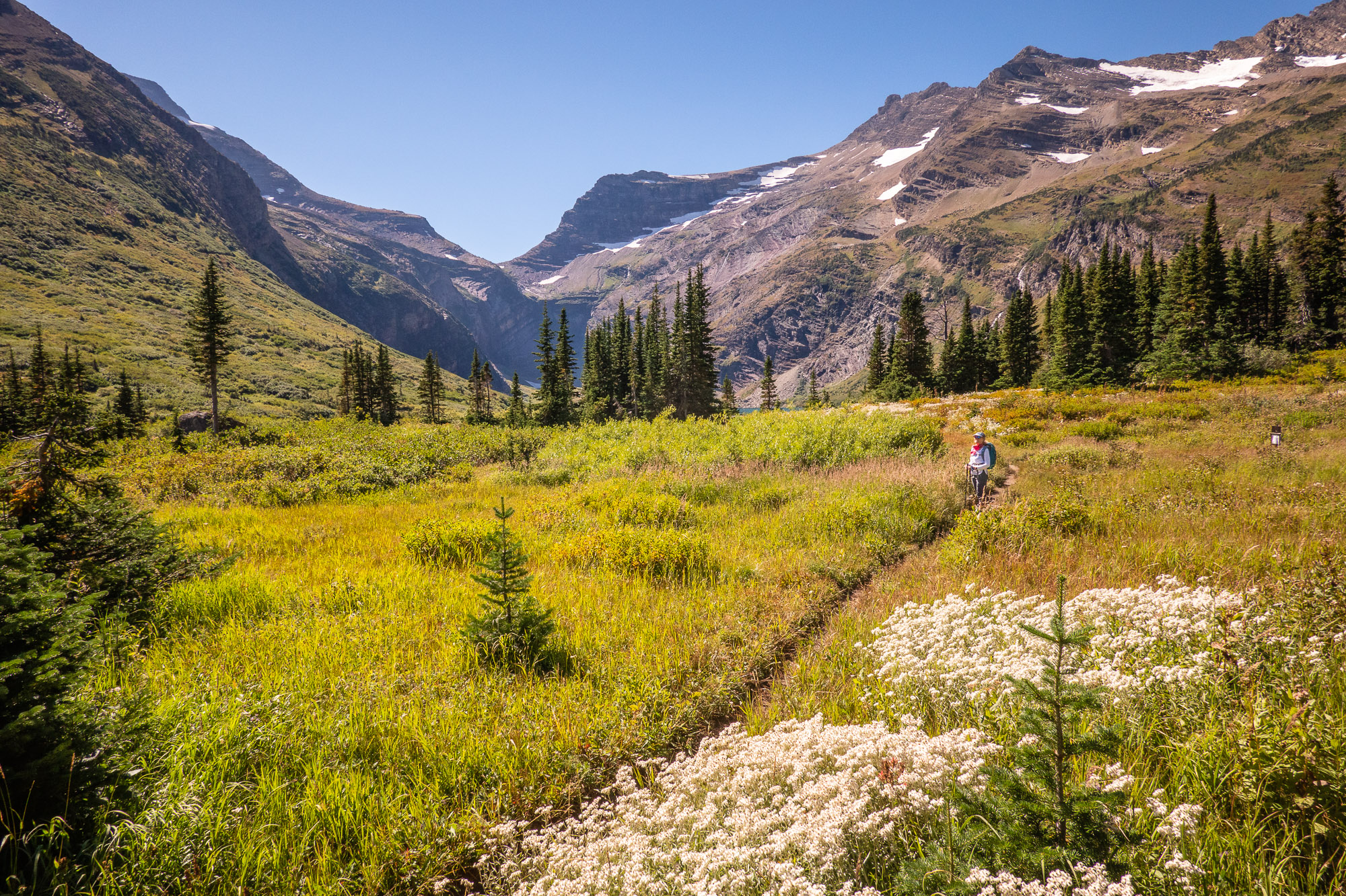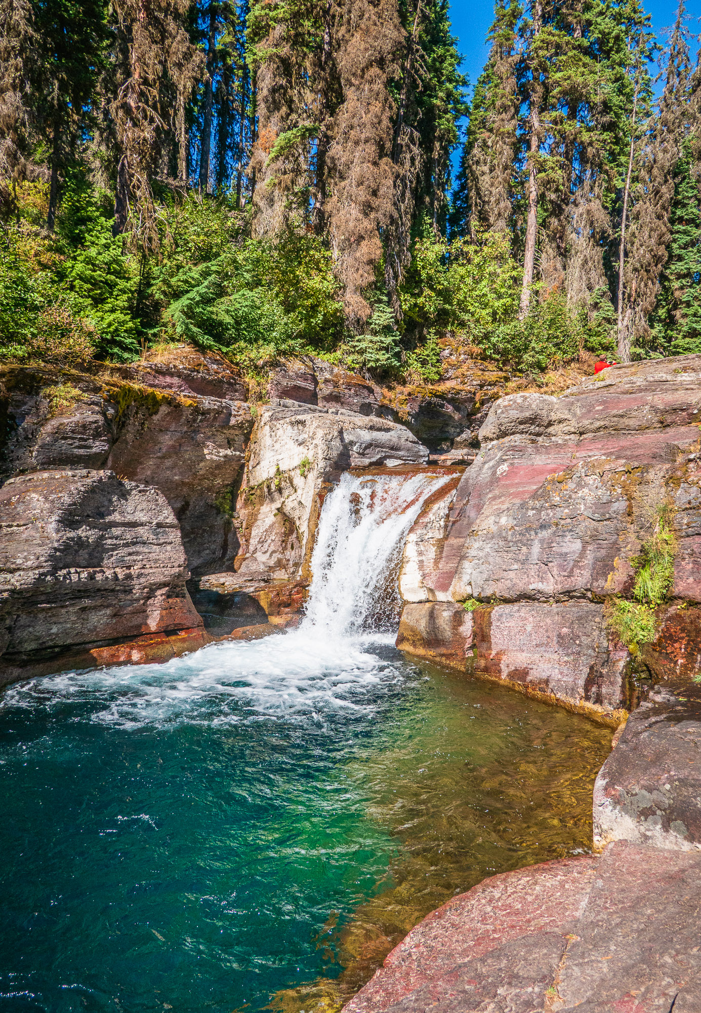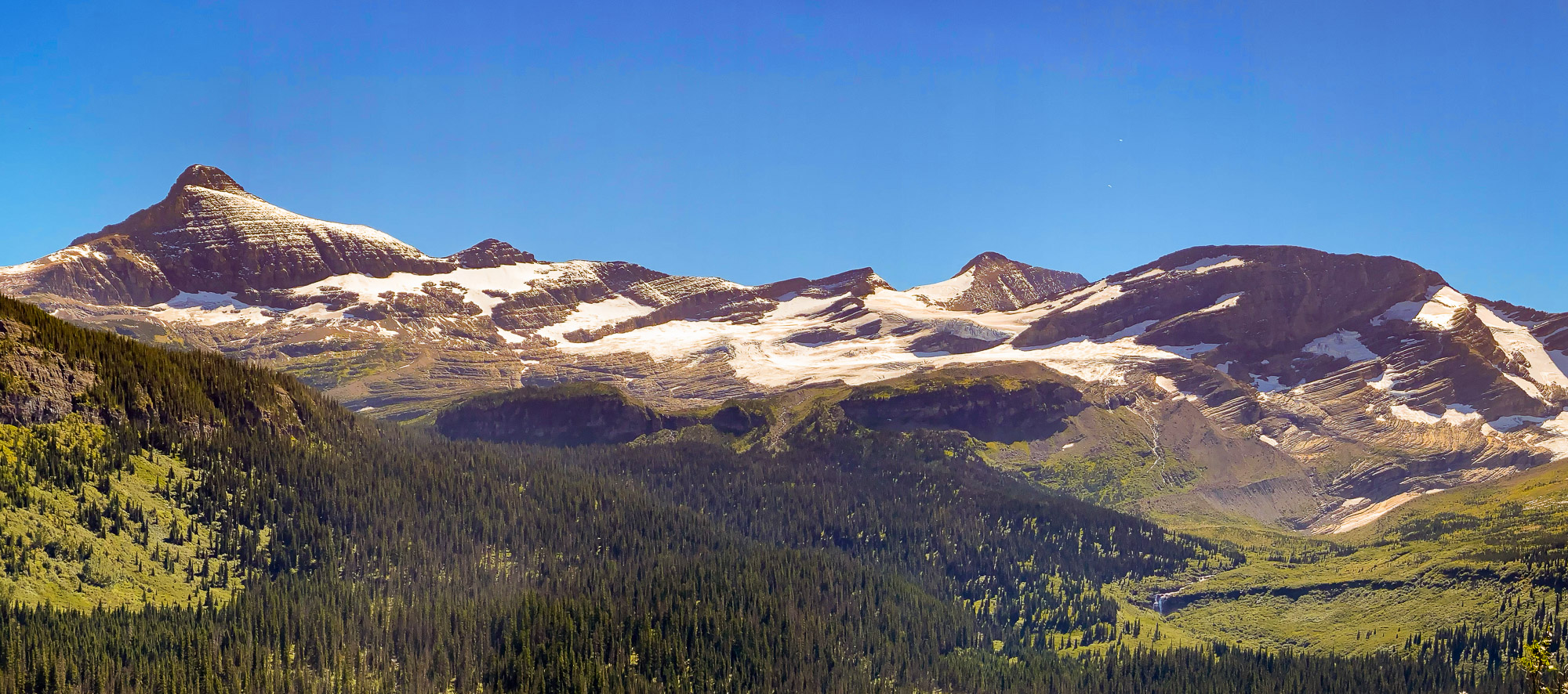 Two more wonderful day hikes that we had not done before while at Glacier National Park, the first was to Gunsight Lake from the Gunsight Pass Trailhead on the Going-to-the-Sun Road east of Logan Pass. The trail started in a gradual descent for about a mile when we came to Deadwood Falls, a beautiful 10-foot waterfall with deep crystal clear pools of water above and below the falls. We continued on for about 2 miles to the St Mary River and the beautiful valley where we were hoping to spot a moose that some hikers had seen earlier. No luck this time. A little further along we came to an opening in the canopy that provided us with one of the most magnificent views in Glacier. In the foreground is an open grassy meadow alongside Mirror Pond and framing the background is Mount Jackson, Gunsight Mountain and Fusillade Mountain, as well as Gunsight Pass.