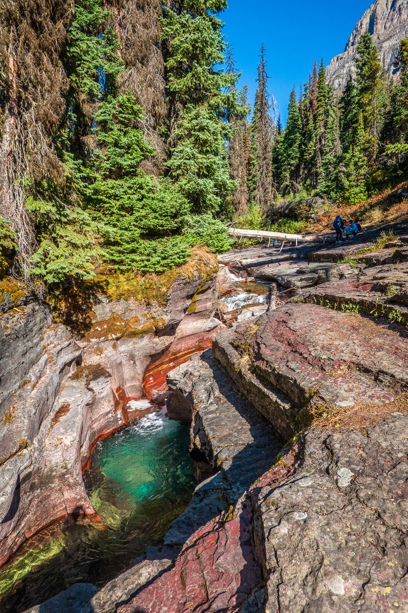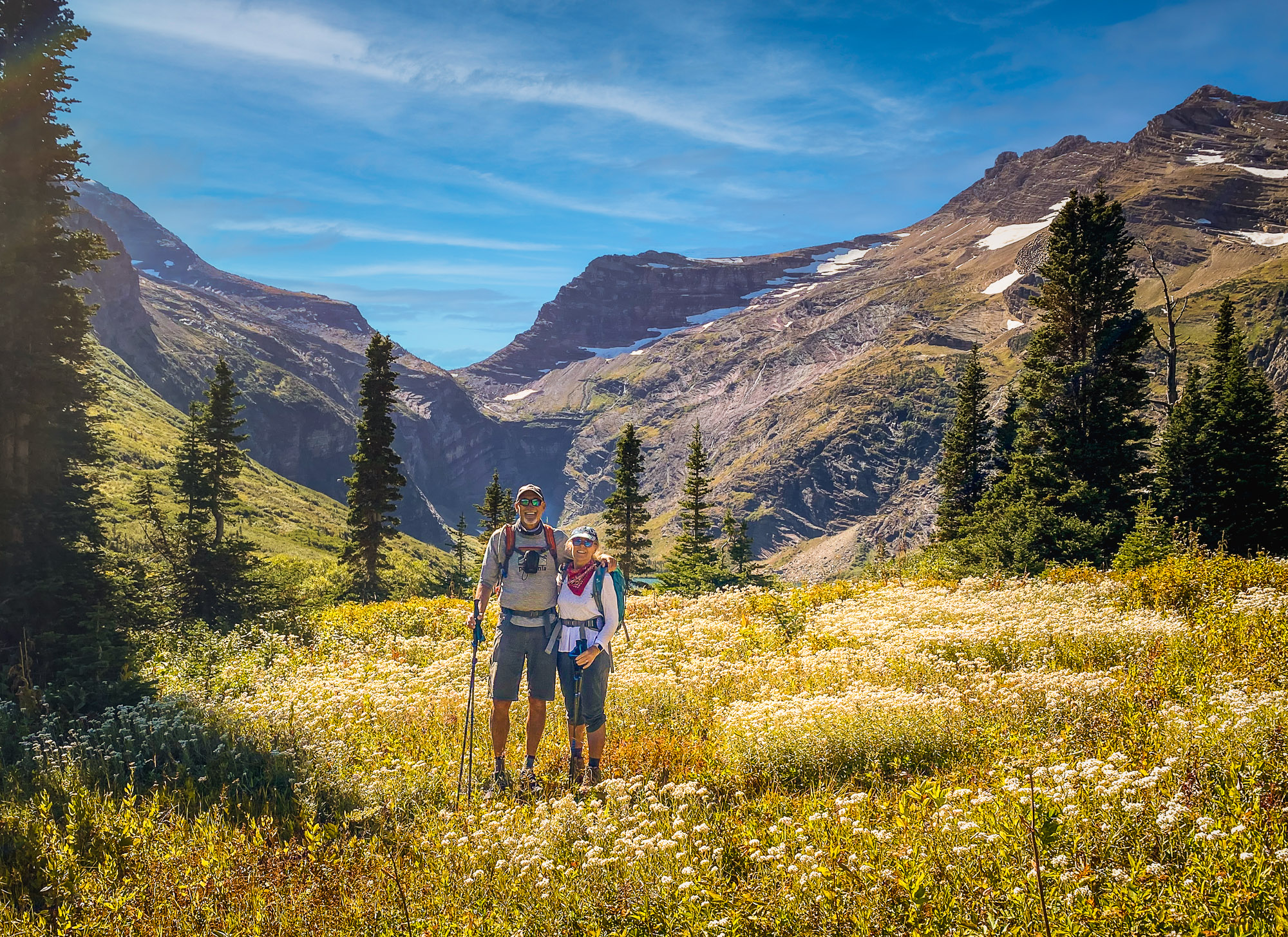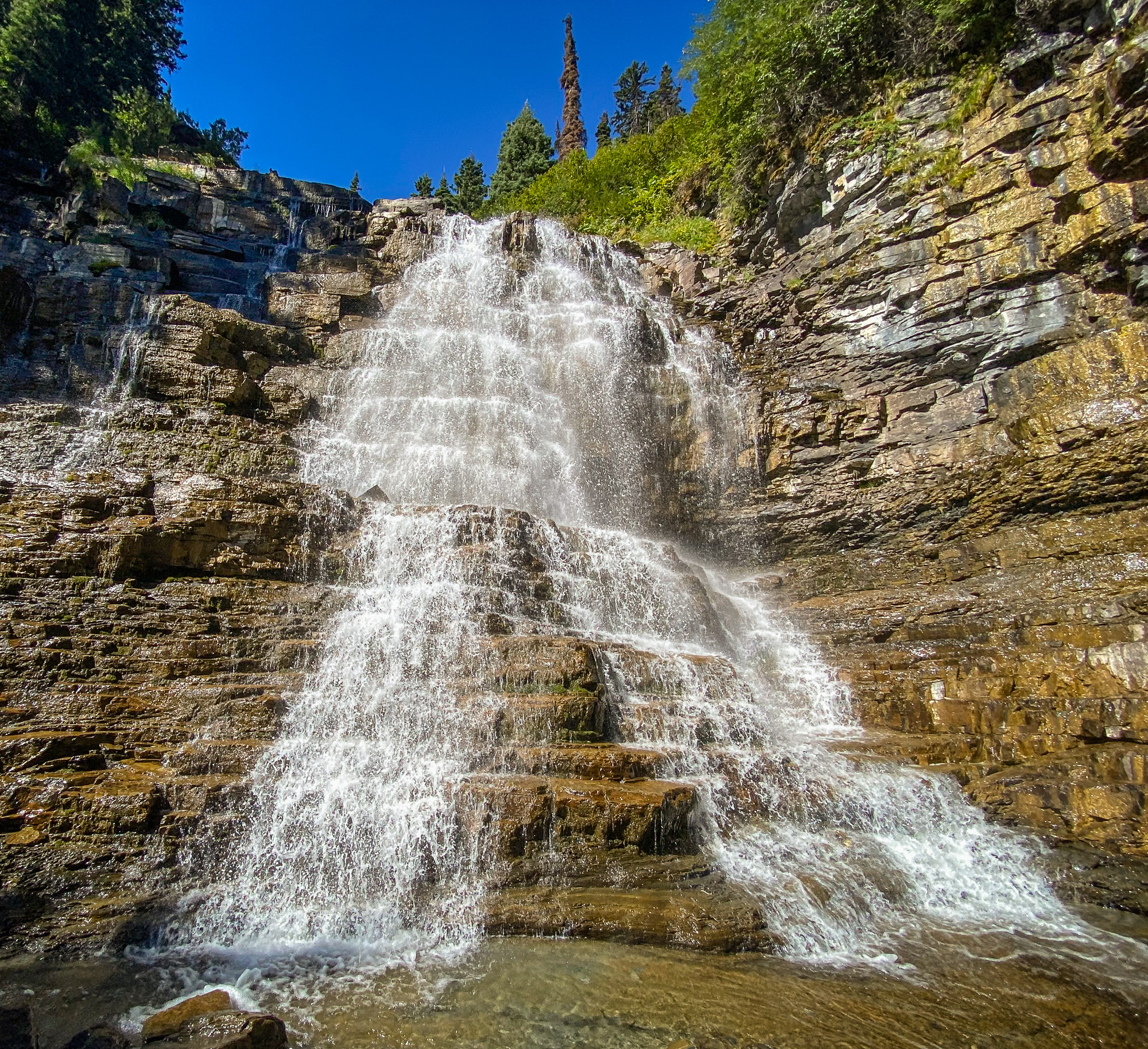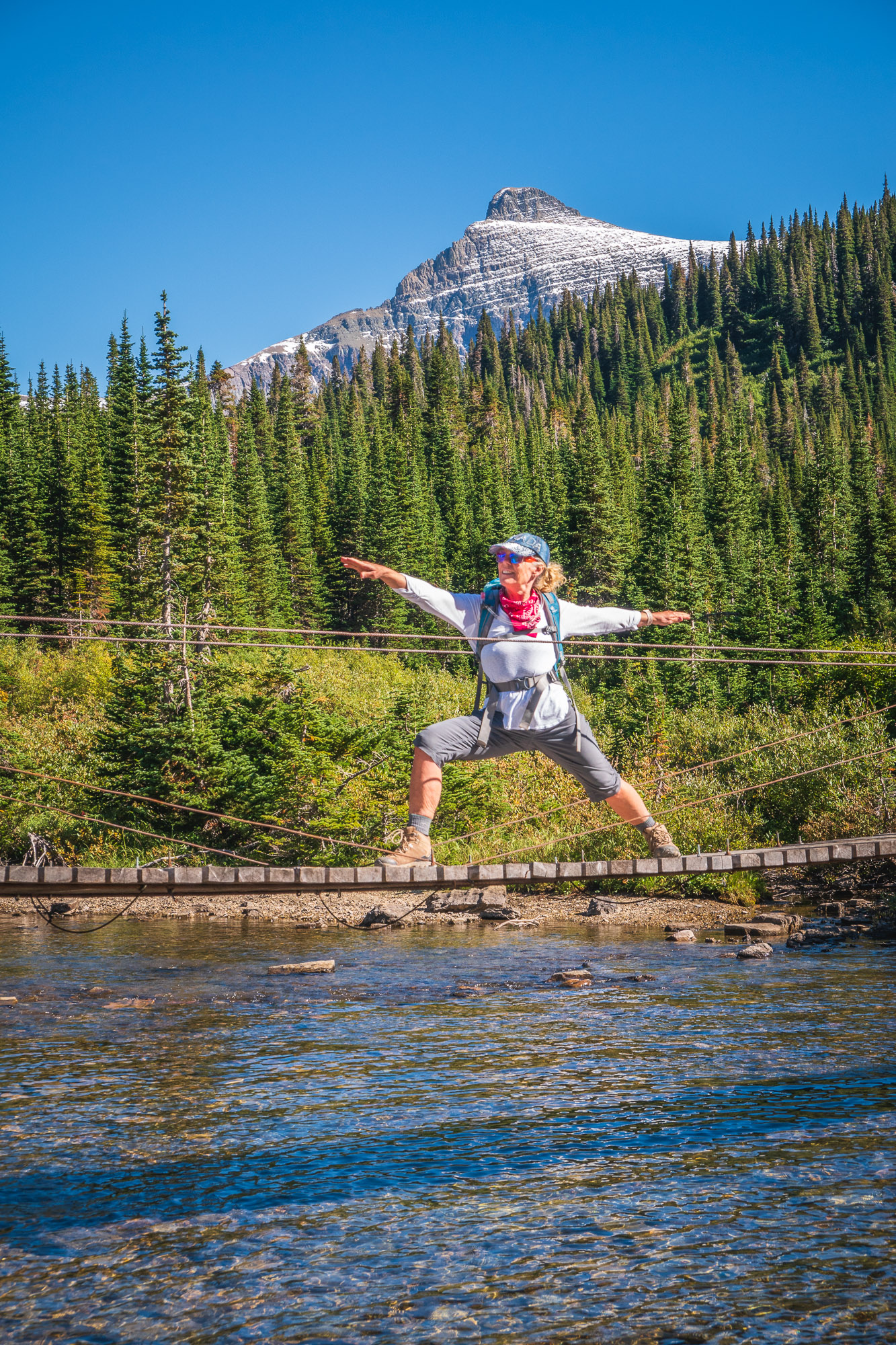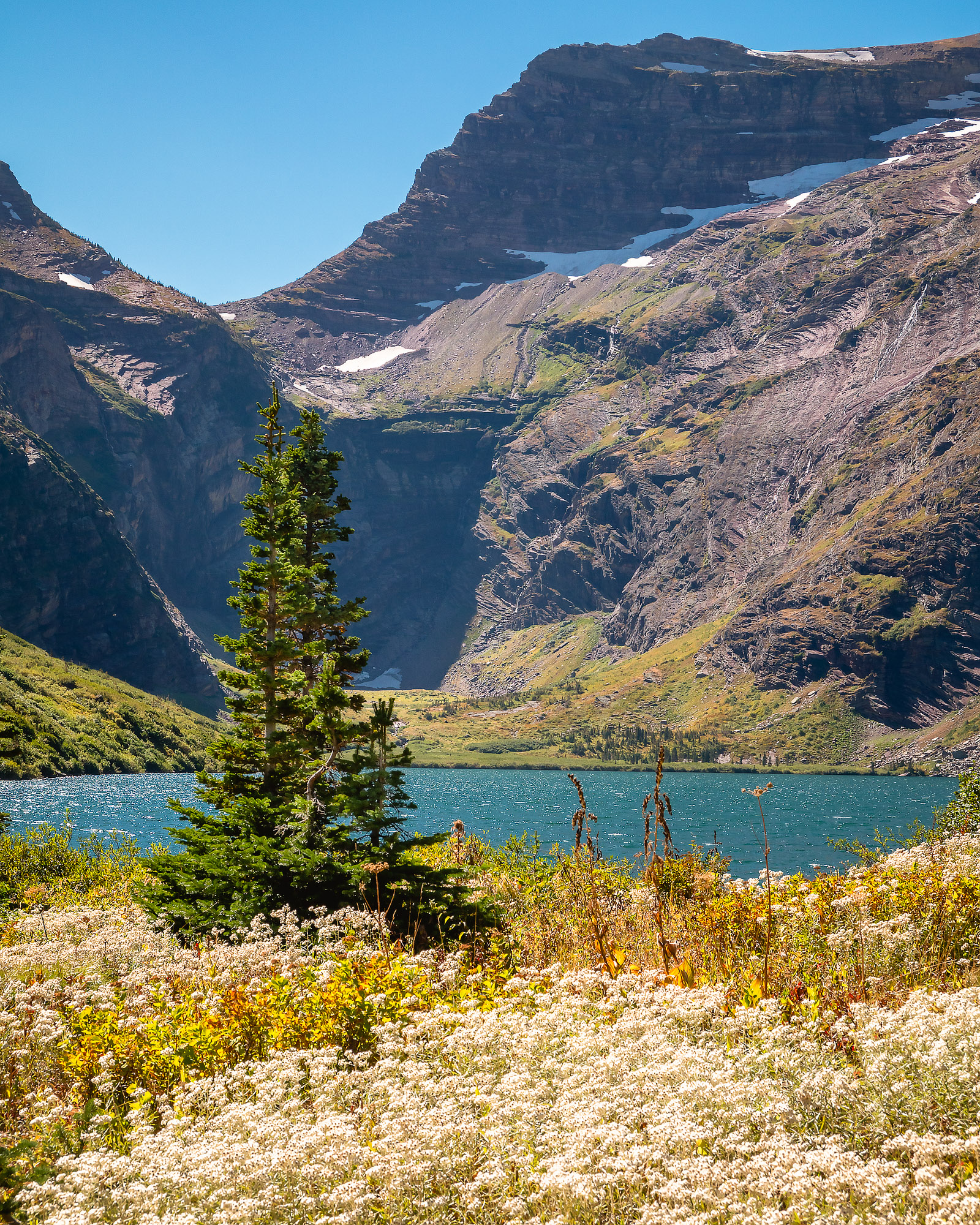 Two more wonderful day hikes that we had not done before while at Glacier National Park, the first was to Gunsight Lake from the Gunsight Pass Trailhead on the Going-to-the-Sun Road east of Logan Pass. The trail started in a gradual descent for about a mile when we came to Deadwood Falls, a beautiful 10-foot waterfall with deep crystal clear pools of water above and below the falls. We continued on for about 2 miles to the St Mary River and the beautiful valley where we were hoping to spot a moose that some hikers had seen earlier. No luck this time. A little further along we came to an opening in the canopy that provided us with one of the most magnificent views in Glacier. In the foreground is an open grassy meadow alongside Mirror Pond and framing the background is Mount Jackson, Gunsight Mountain and Fusillade Mountain, as well as Gunsight Pass.