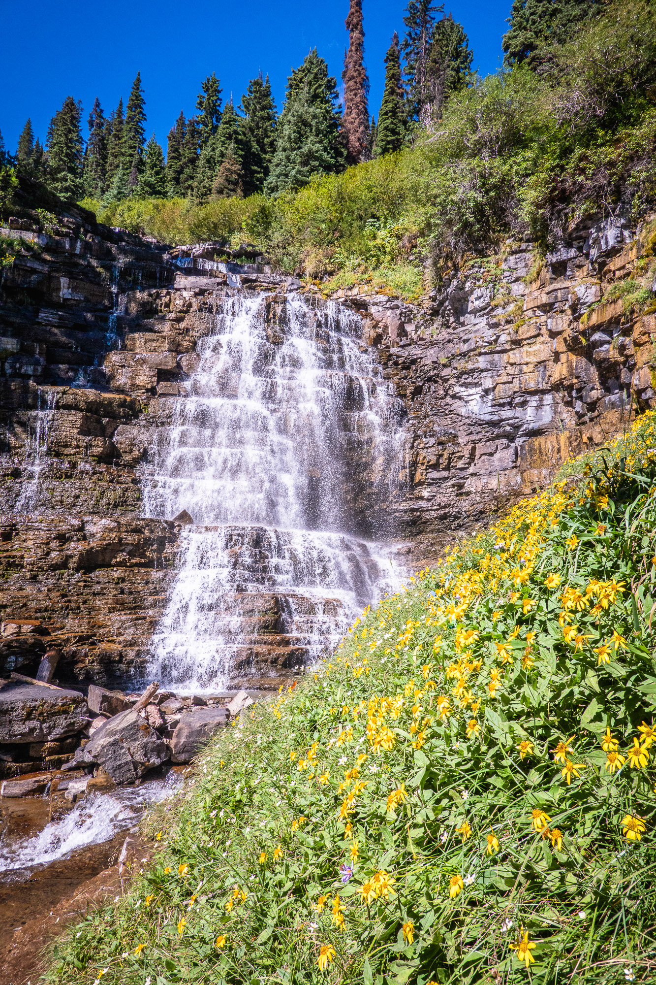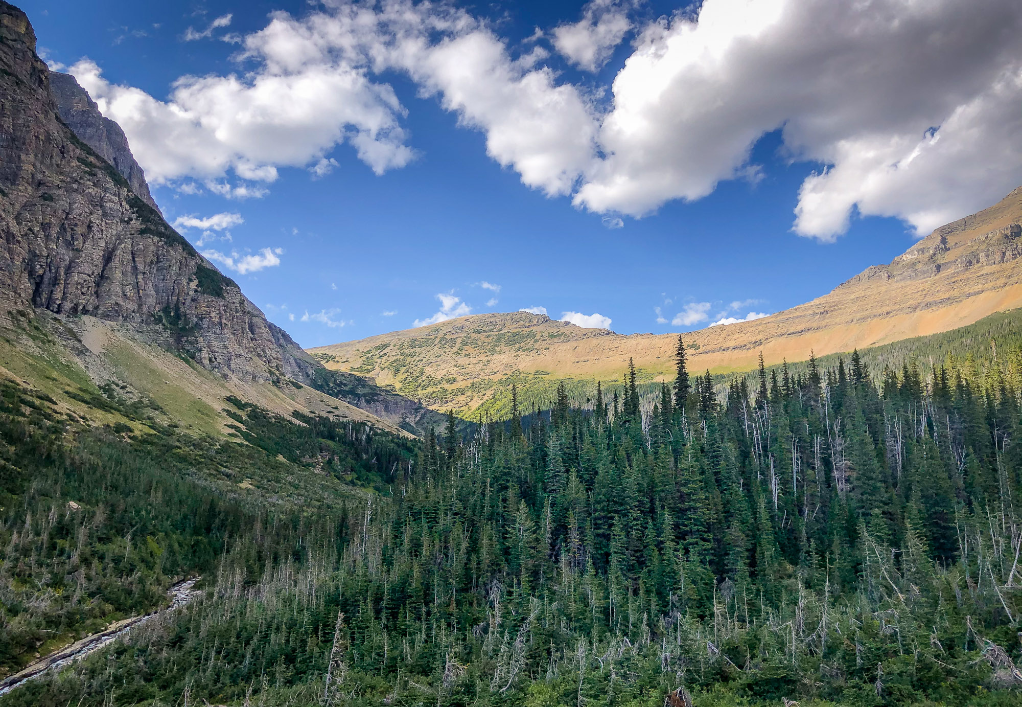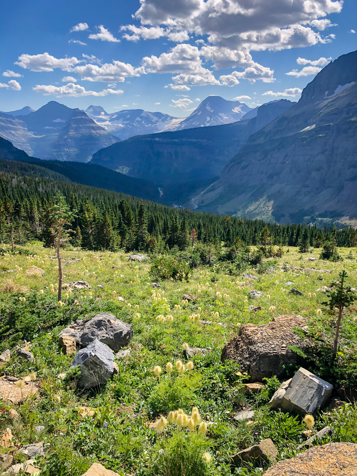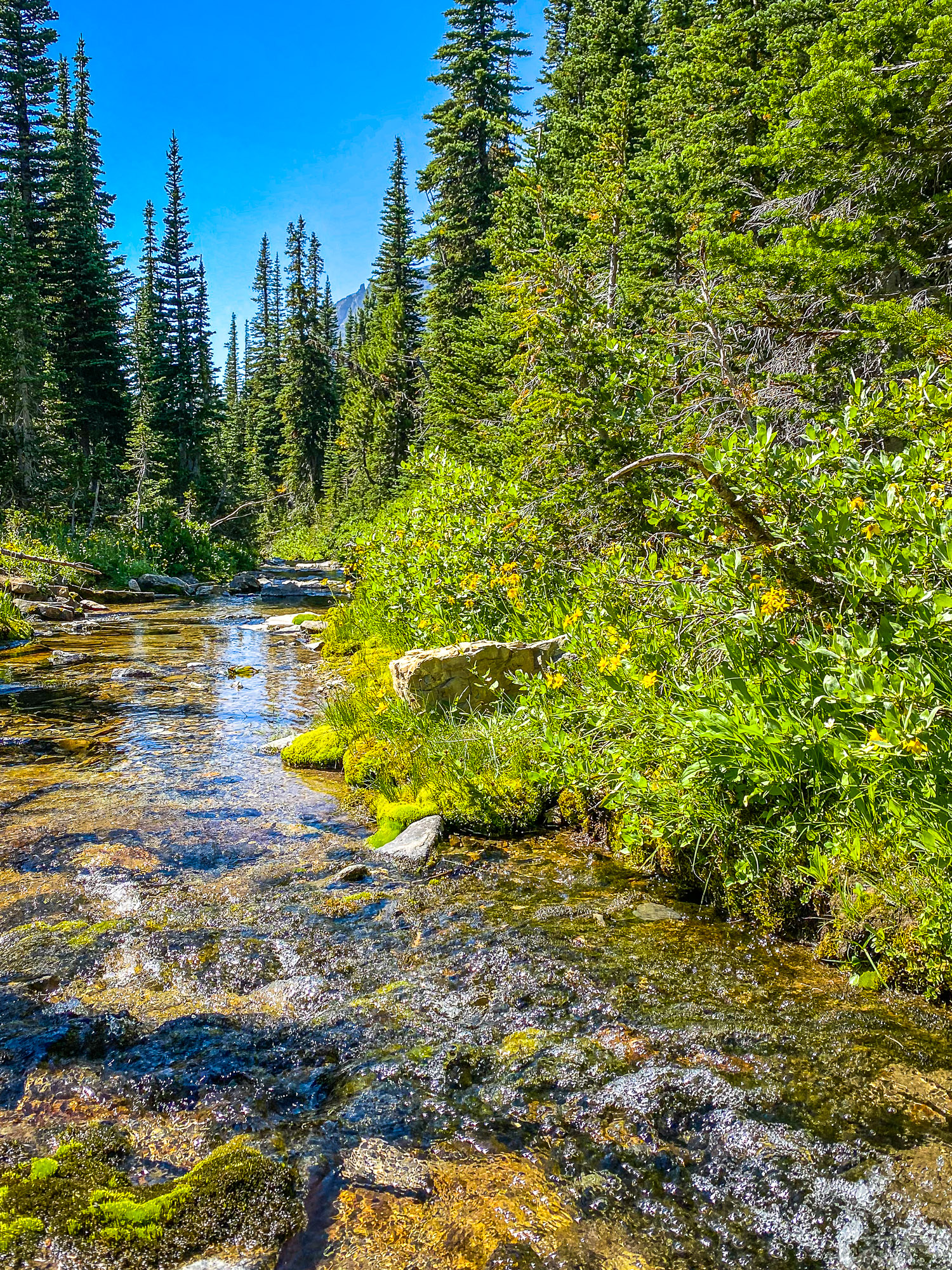 Two more wonderful day hikes that we had not done before while at Glacier National Park, the first was to Gunsight Lake from the Gunsight Pass Trailhead on the Going-to-the-Sun Road east of Logan Pass. The trail started in a gradual descent for about a mile when we came to Deadwood Falls, a beautiful 10-foot waterfall with deep crystal clear pools of water above and below the falls. We continued on for about 2 miles to the St Mary River and the beautiful valley where we were hoping to spot a moose that some hikers had seen earlier. No luck this time. A little further along we came to an opening in the canopy that provided us with one of the most magnificent views in Glacier. In the foreground is an open grassy meadow alongside Mirror Pond and framing the background is Mount Jackson, Gunsight Mountain and Fusillade Mountain, as well as Gunsight Pass.