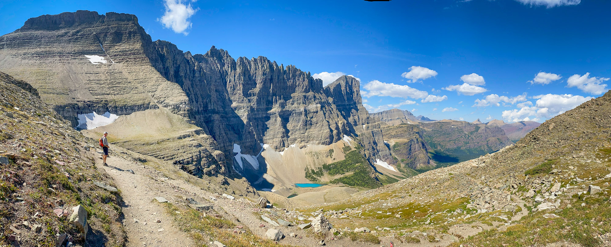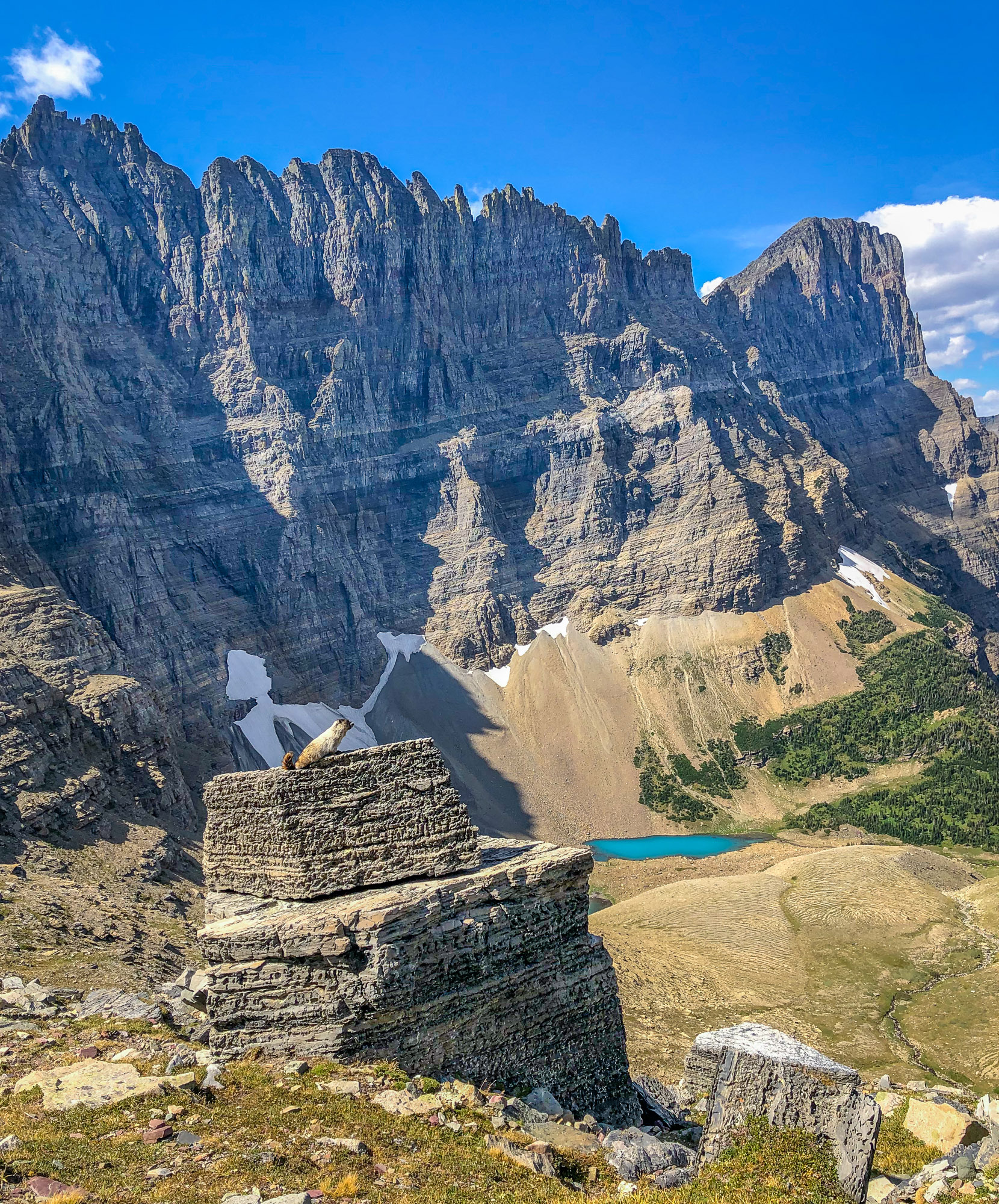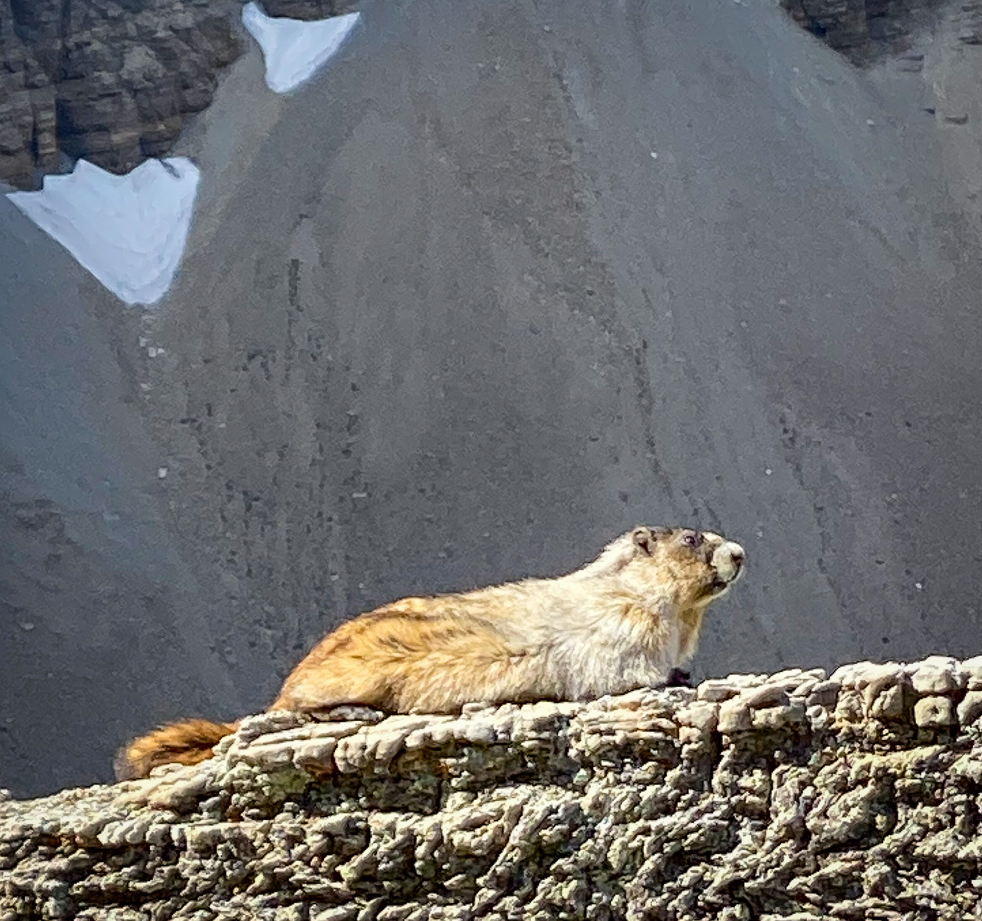 Our second day hike was to Piegan Pass, beginning from the Siyeh Bend Trailhead, located 2 miles east of Logan Pass on the Going-to-the-Sun Road. It was a beautiful blue-bird day in late August, a perfect day for this hike. The Siyeh Bend Trail travels alongside the Siyeh Creek for a few hundred yards before reaching the turnoff to the Piegan Pass Trail. After about 3 miles we emerged above the tree-line and onto the talus-scree slopes of 10,014-foot Mount Siyeh. As we traversed along the trail ascending toward Piegan Pass, the views of Piegan Glacier sitting just below the summit of 9,220-foot Piegan Mountain were breathtaking. At about 4.5 miles we reached the top of Piegan Pass and just a little further on we had outstanding views of Angel Wing, Bishops Cap, and Mount Gould along the Garden Wall, as well as views deep into the Many Glacier valley. Due to COVID the trail was closed going down into the valley, so we stopped here for lunch to marvel at the magnificent views in front of us. A marmot decided to befriend us and joined us while we ate lunch, posing on top of a rock.