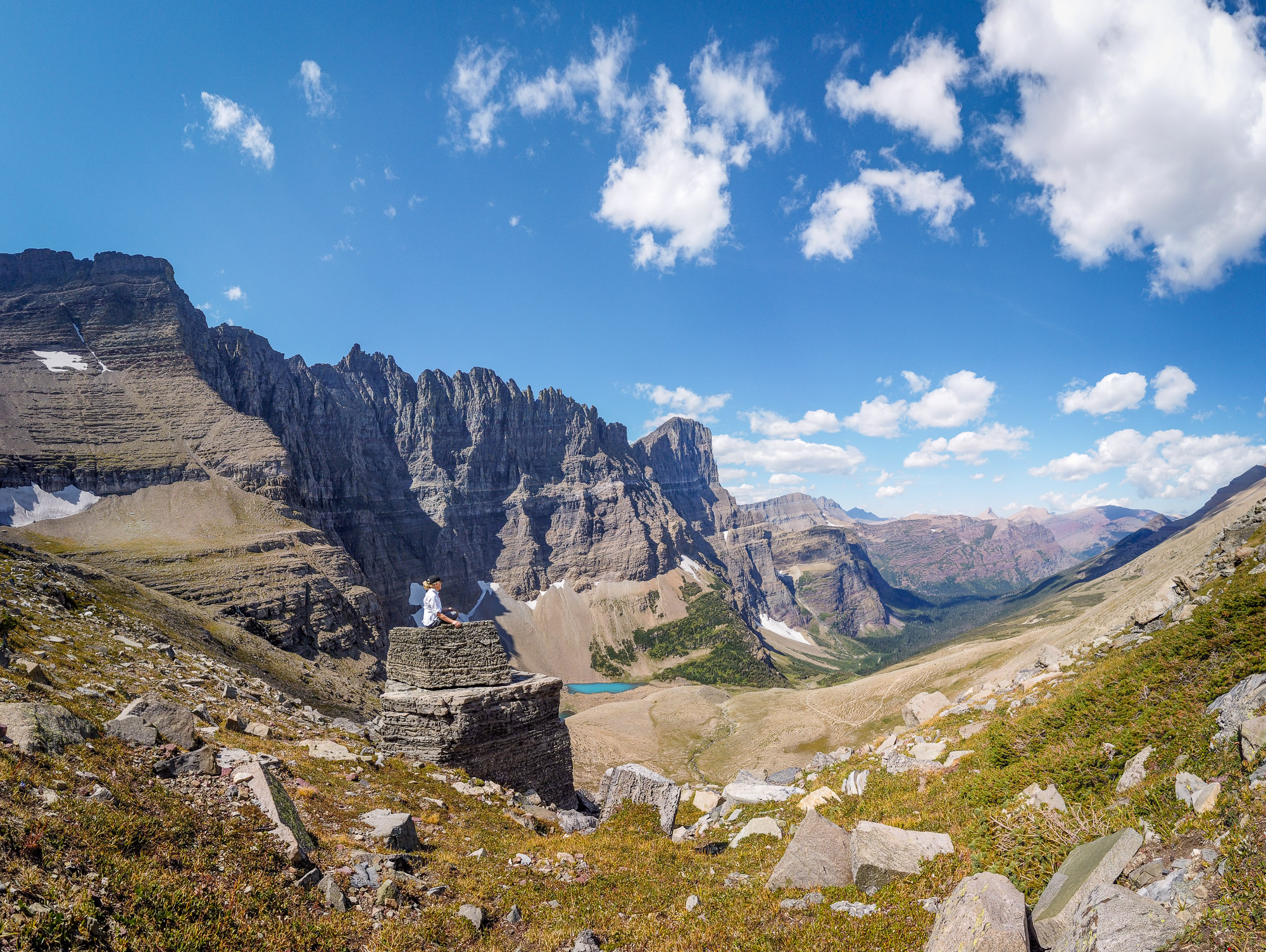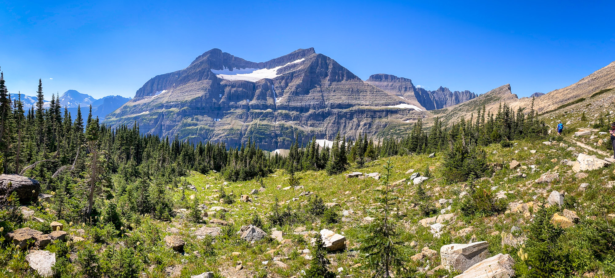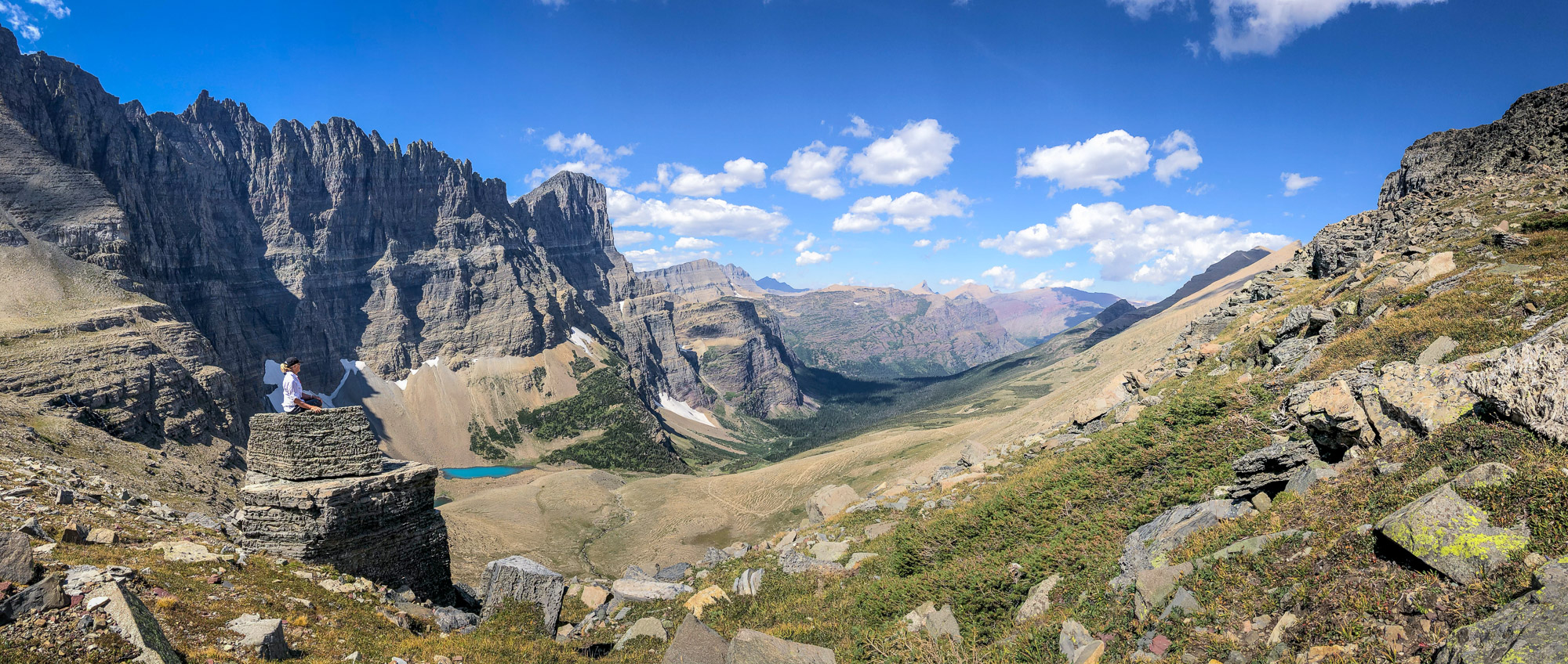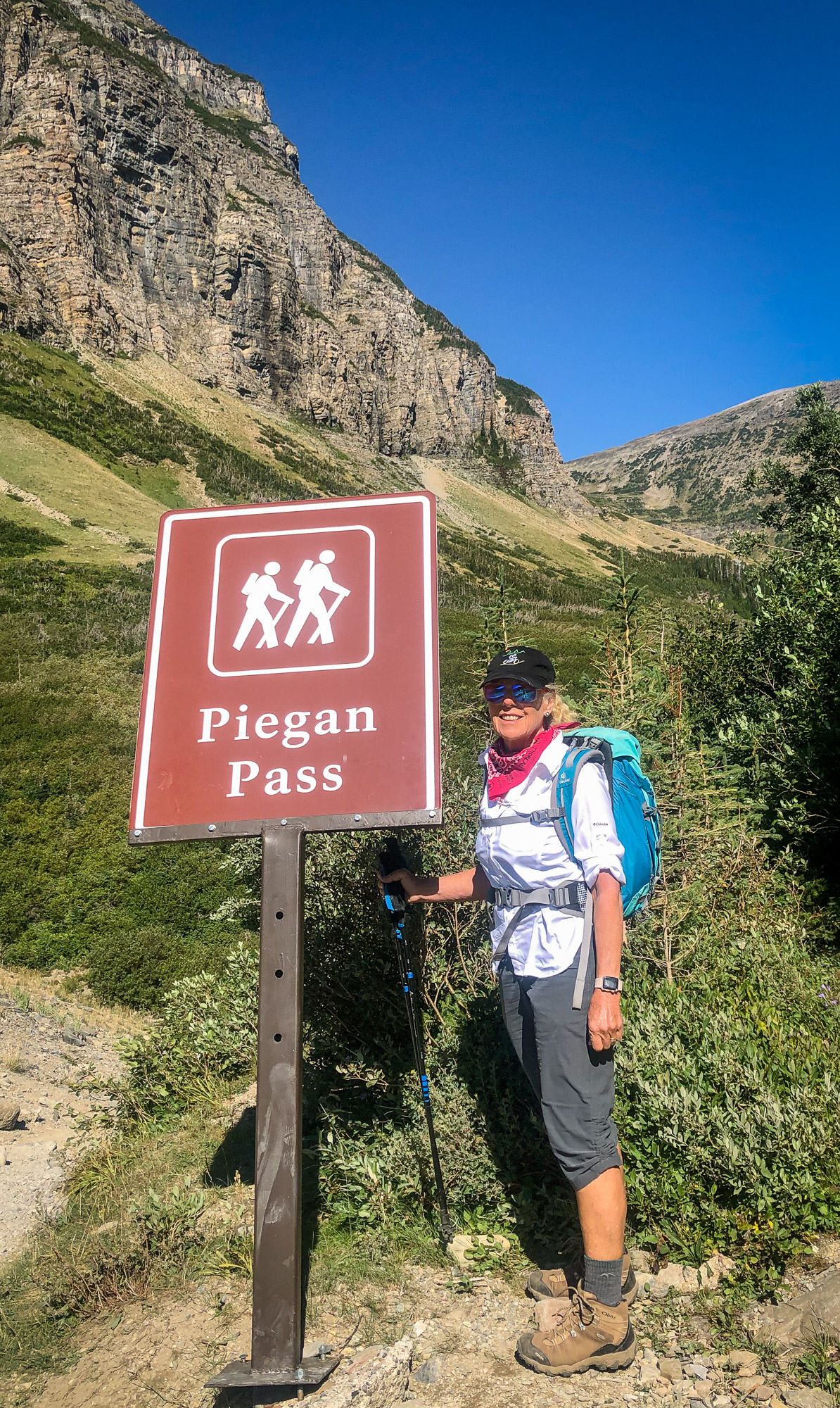 Our second day hike was to Piegan Pass, beginning from the Siyeh Bend Trailhead, located 2 miles east of Logan Pass on the Going-to-the-Sun Road. It was a beautiful blue-bird day in late August, a perfect day for this hike. The Siyeh Bend Trail travels alongside the Siyeh Creek for a few hundred yards before reaching the turnoff to the Piegan Pass Trail. After about 3 miles we emerged above the tree-line and onto the talus-scree slopes of 10,014-foot Mount Siyeh. As we traversed along the trail ascending toward Piegan Pass, the views of Piegan Glacier sitting just below the summit of 9,220-foot Piegan Mountain were breathtaking. At about 4.5 miles we reached the top of Piegan Pass and just a little further on we had outstanding views of Angel Wing, Bishops Cap, and Mount Gould along the Garden Wall, as well as views deep into the Many Glacier valley. Due to COVID the trail was closed going down into the valley, so we stopped here for lunch to marvel at the magnificent views in front of us. A marmot decided to befriend us and joined us while we ate lunch, posing on top of a rock.