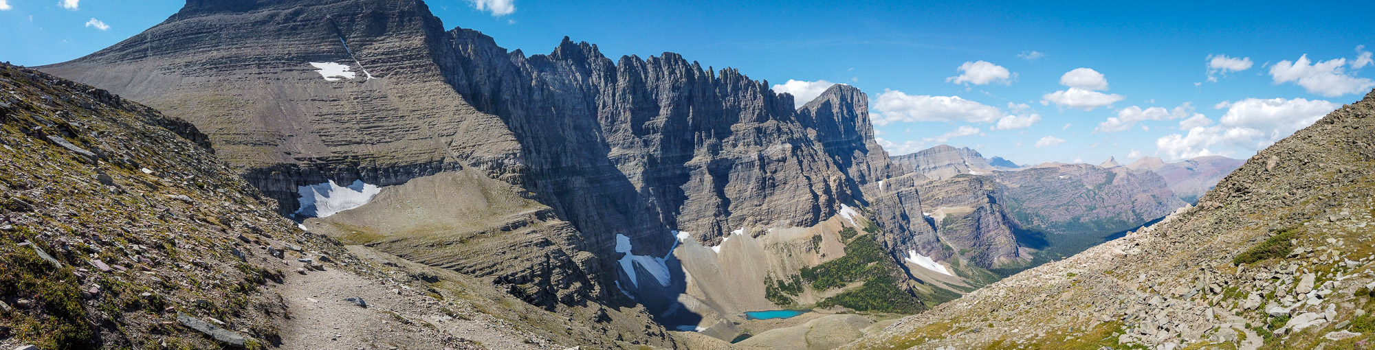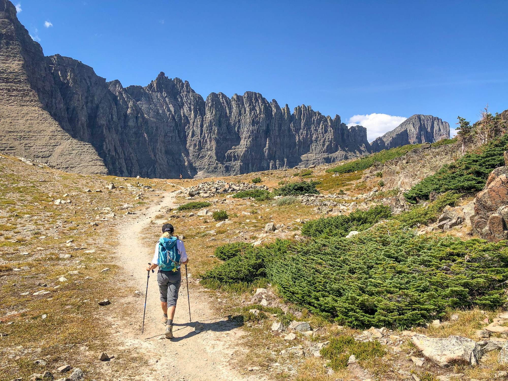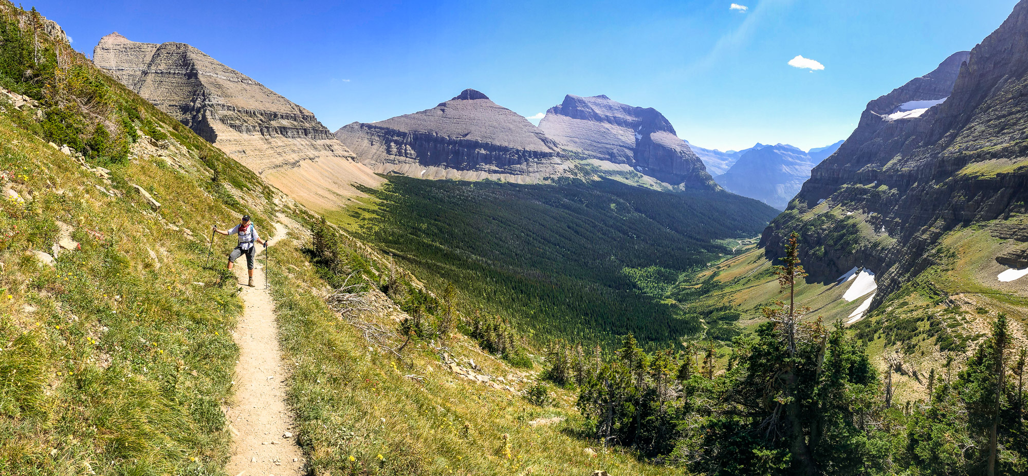Piegan Pass has the distinction of being one of four sites in Glacier to have had a locomotive bell installed on it. In September, 1926 the bells were installed, based on the old Swiss custom of ringing loud bells high in the mountains, and to let people know that they had reached their goal. The bells remained in place until the fall of 1943. The Piegan Pass Trail is also part of the Continental Divide Trail, which runs from the Mexico border to the town of Waterton Park in Canada. The entire Piegan Pass area offers spectacular views and scenery, easily making this one of the best hikes in Glacier. Another time when the east side of the Park is open it would be fun to hike all the way to Many Glaciers and catch the shuttle back to our car. On our way back down Piegan Pass Trail, looking toward the south across the valley, we had absolutely grand views of Jackson Glacier and Blackfoot Glacier, the largest glacier in the Park. This truly was one of the best hikes in Glacier. Click on thumbnail to view images