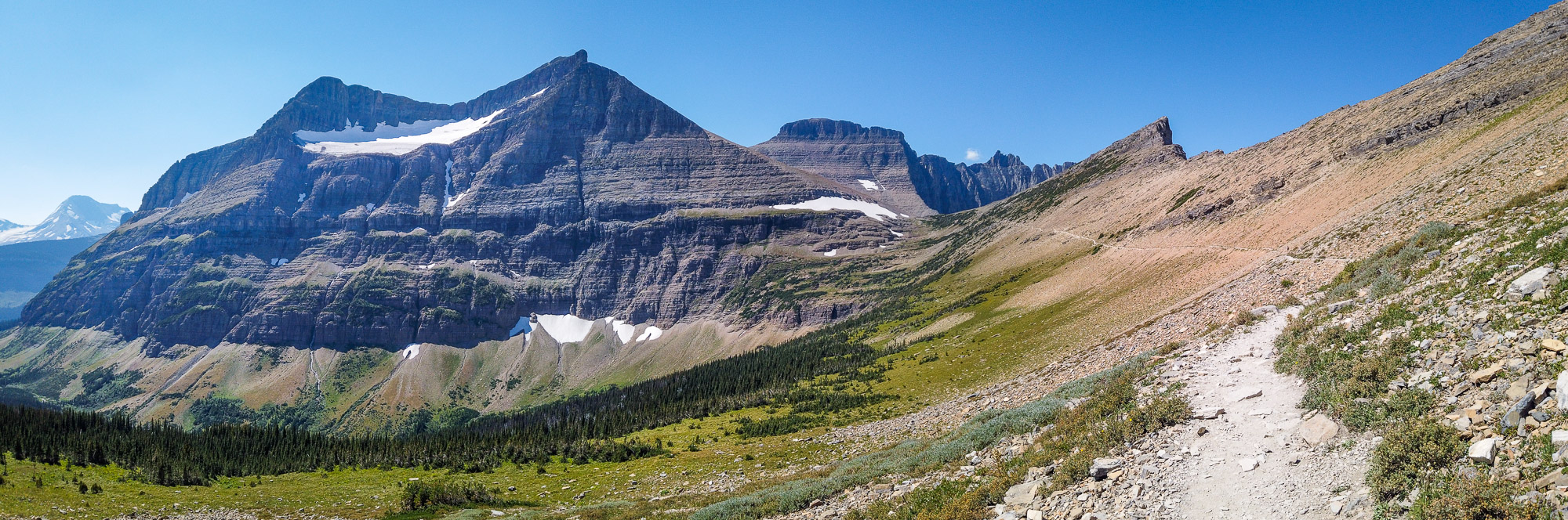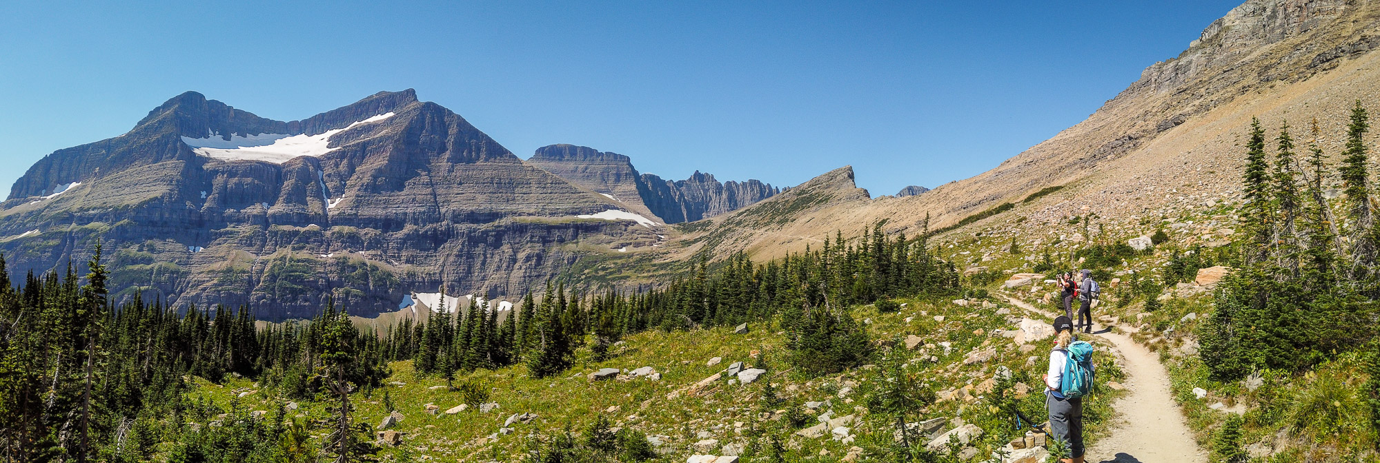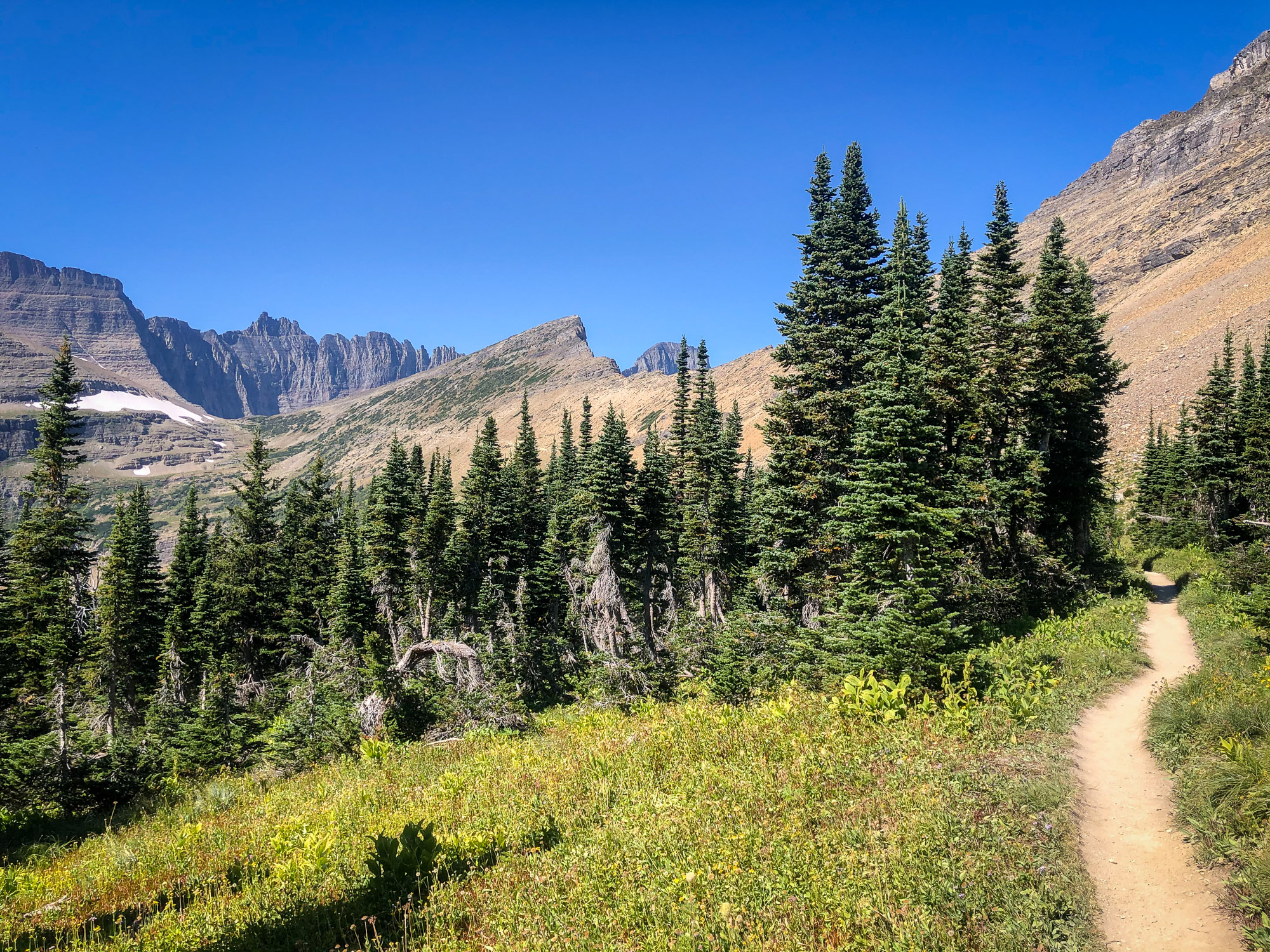 Piegan Pass has the distinction of being one of four sites in Glacier to have had a locomotive bell installed on it. In September, 1926 the bells were installed, based on the old Swiss custom of ringing loud bells high in the mountains, and to let people know that they had reached their goal. The bells remained in place until the fall of 1943. The Piegan Pass Trail is also part of the Continental Divide Trail, which runs from the Mexico border to the town of Waterton Park in Canada. The entire Piegan Pass area offers spectacular views and scenery, easily making this one of the best hikes in Glacier. Another time when the east side of the Park is open it would be fun to hike all the way to Many Glaciers and catch the shuttle back to our car. On our way back down Piegan Pass Trail, looking toward the south across the valley, we had absolutely grand views of Jackson Glacier and Blackfoot Glacier, the largest glacier in the Park. This truly was one of the best hikes in Glacier. Click on thumbnail to view images