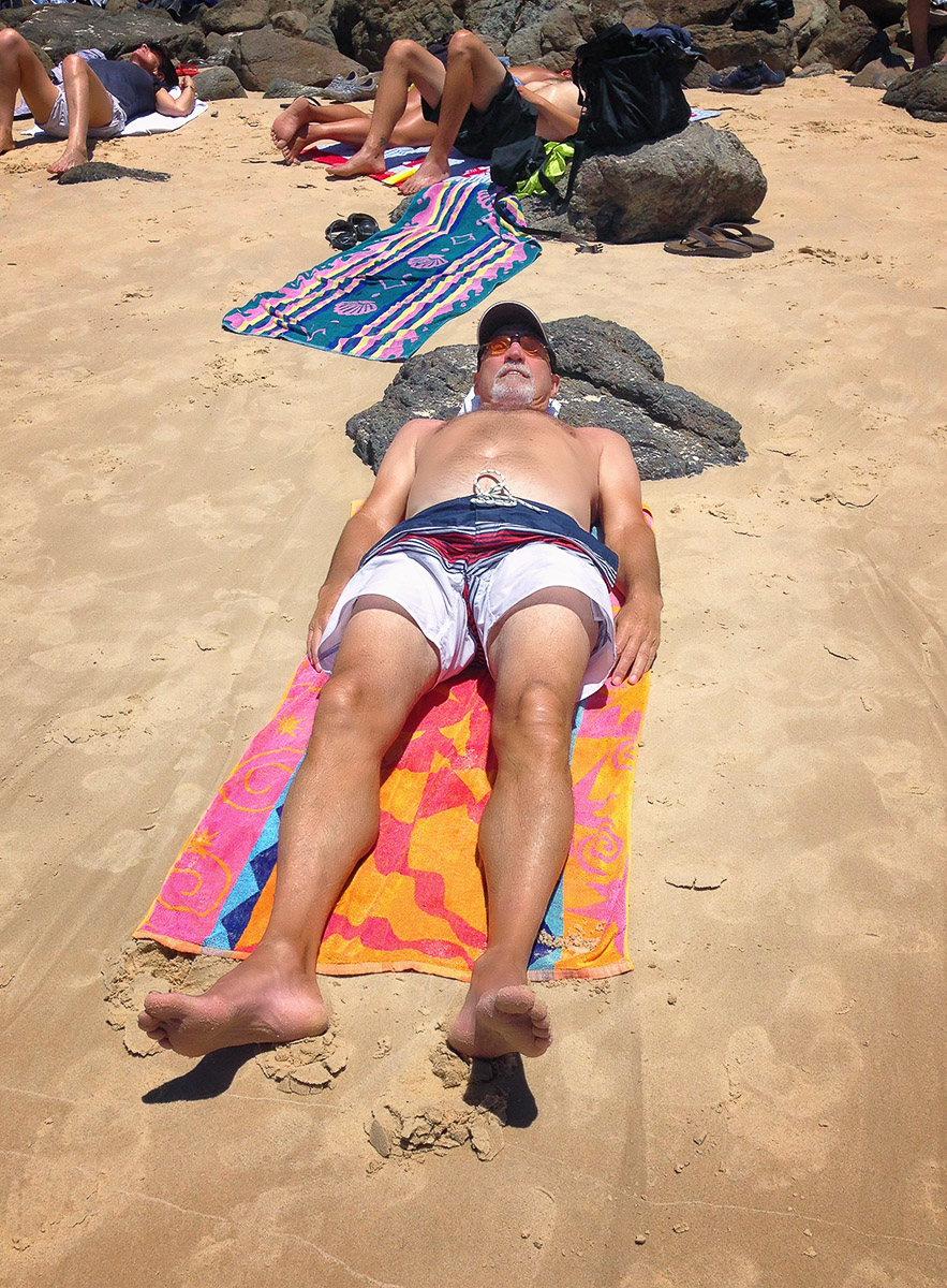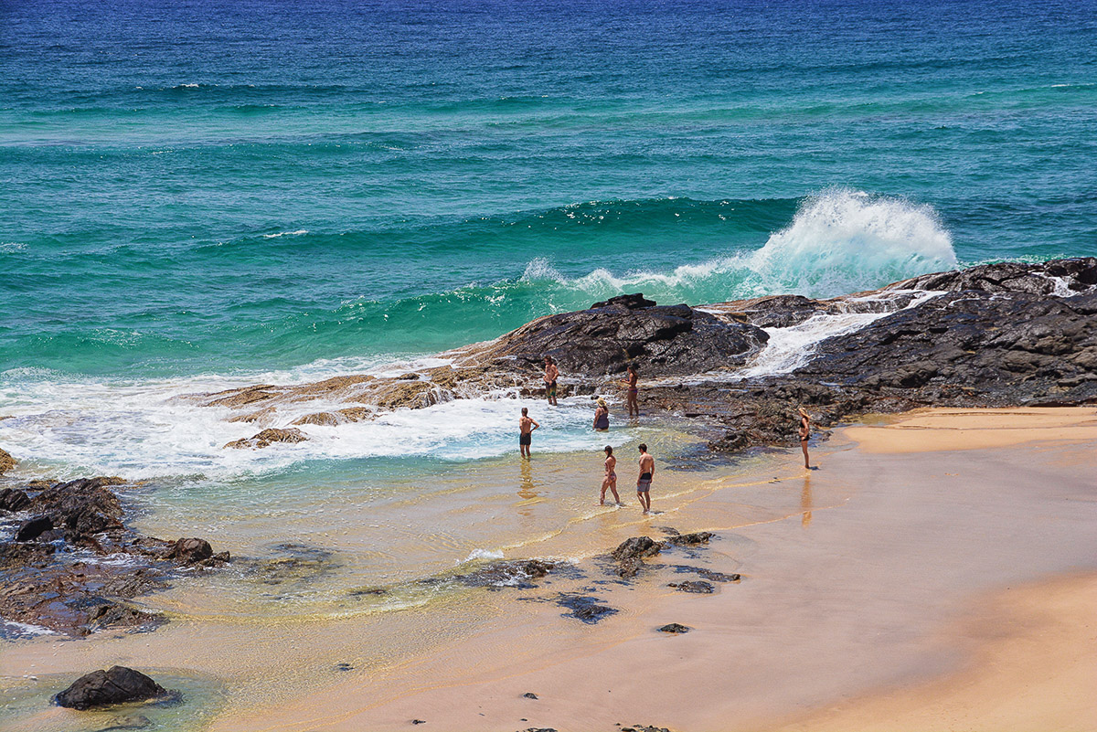We walked up to the far end of the boardwalk to the bridge, jumped into the creek and swam or floated down the swiftly flowing creek back to the beach, it was a fun, and invigorating experience, so we did it again and again! As mentioned earlier swimming in the ocean is not recommended on the entire Eastern Beach of the Island. There are various dangers that may harm swimmers, such as strong rips and undertows, as well as sea stingers and sharks that infest the ocean. There is only one place where salt water swimming is allowed along the 75 mile beach, it is one of the Island’s treasures, the Champagne Pools, Fraser Island’s very own natural jacuzzi. The pools are fed by waves crashing over the top of the rocks into shallow sandy pools, and once the waves settle you are left with the fizzing foam…..hence champagne! We had a great time exploring these pools.