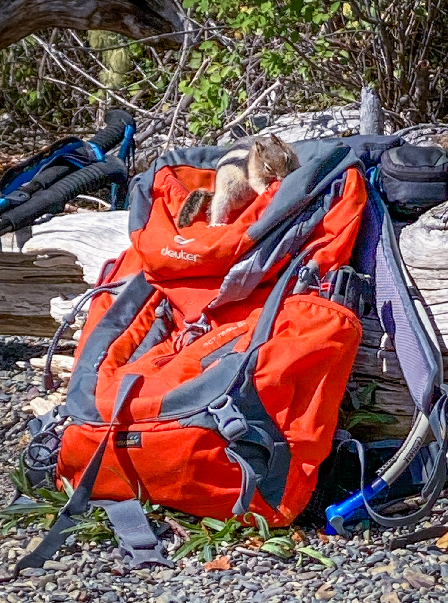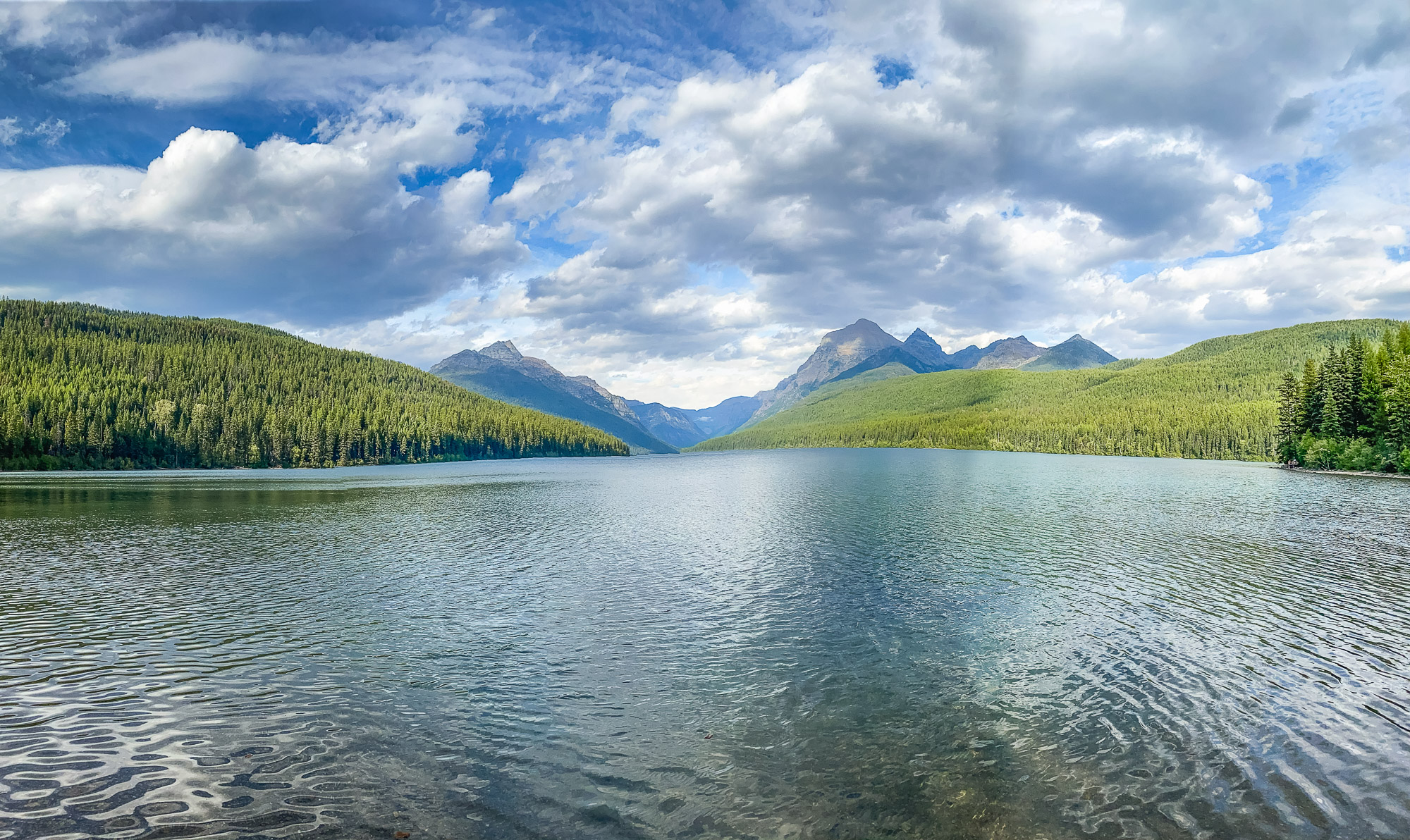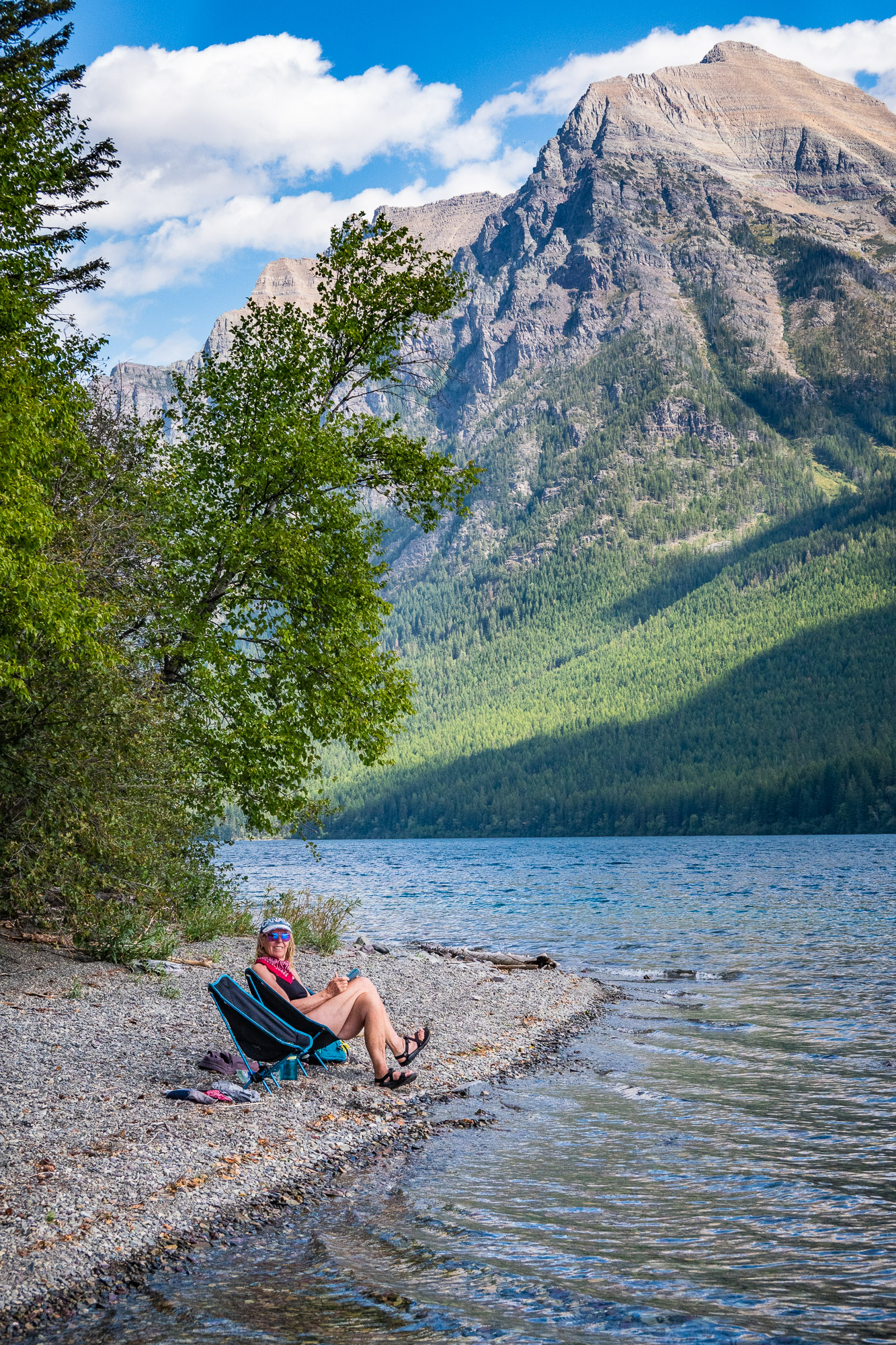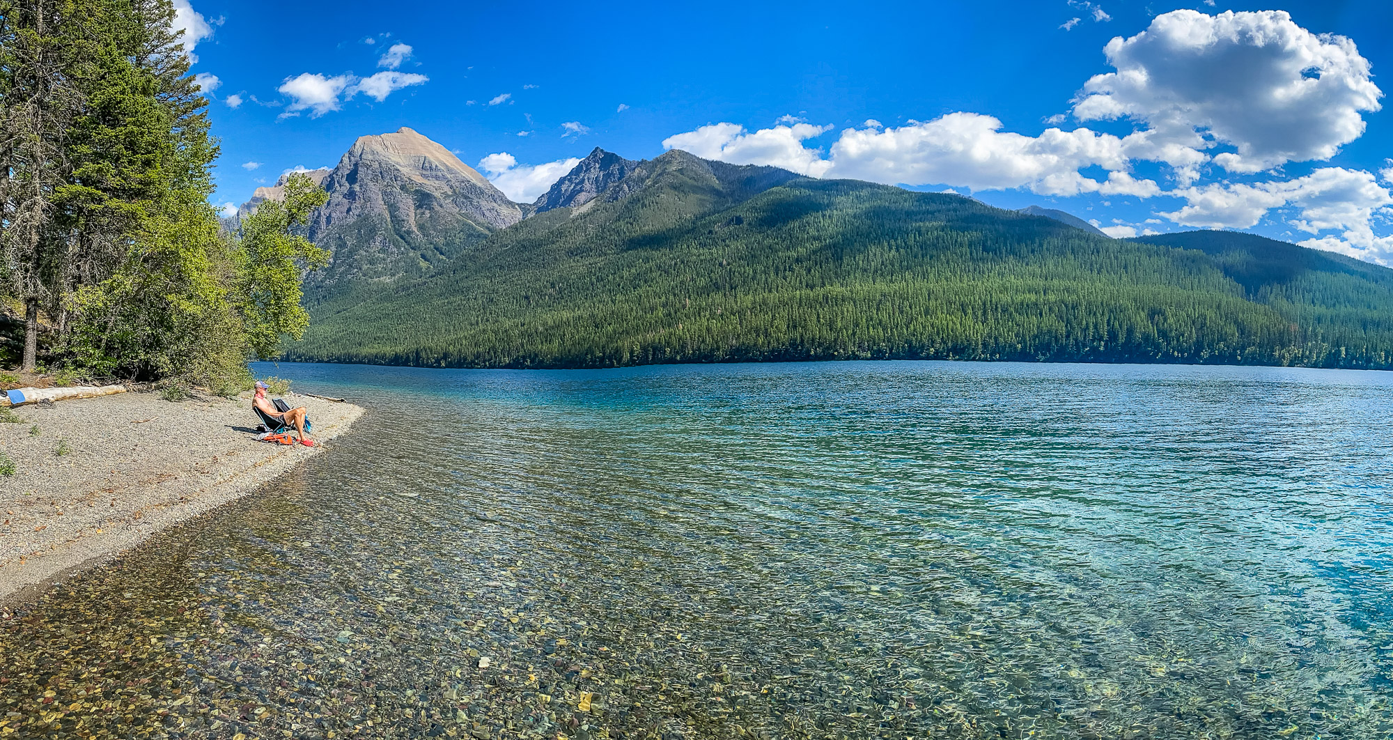 We came back to Glacier National Park for another 3 week stay at Columbia Falls RV Park in late August and September. We took another drive out to Polebridge for the day to hike along Bowman Lake. It is approximately one mile wide and eight miles in length. We stopped at Polebridge to buy the famous bear claws again to take on the hike to the backpacking campsite where we went down to the lake just before the campsite and set up our camping chairs. Bowman Lake is a very peaceful lake and a perfect place to chill out and swim in the lake while enjoying the tranquility of the surroundings. Click on thumbnail to view images
