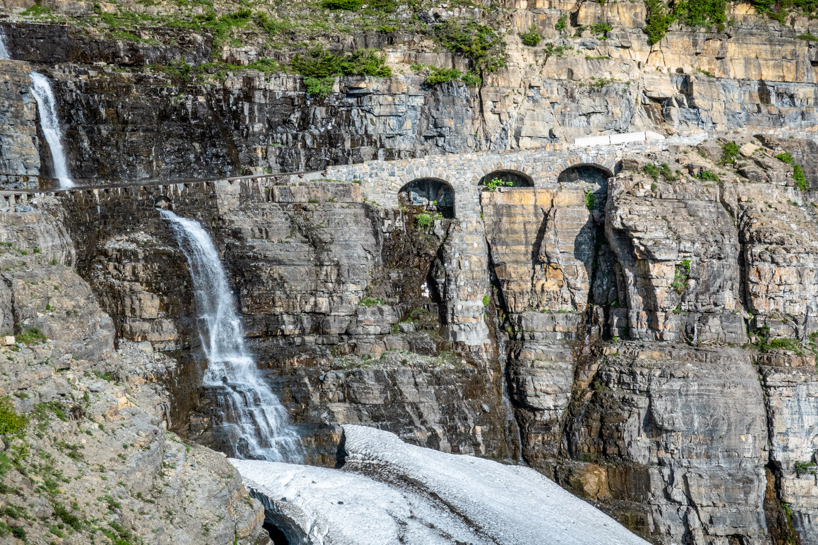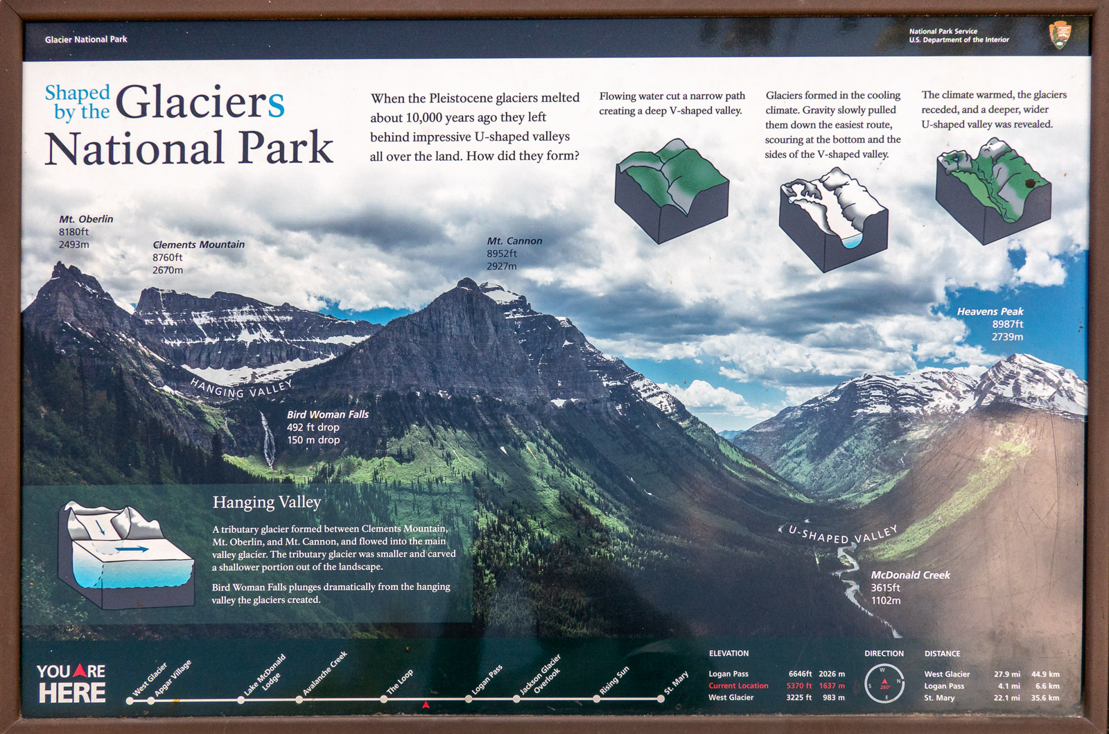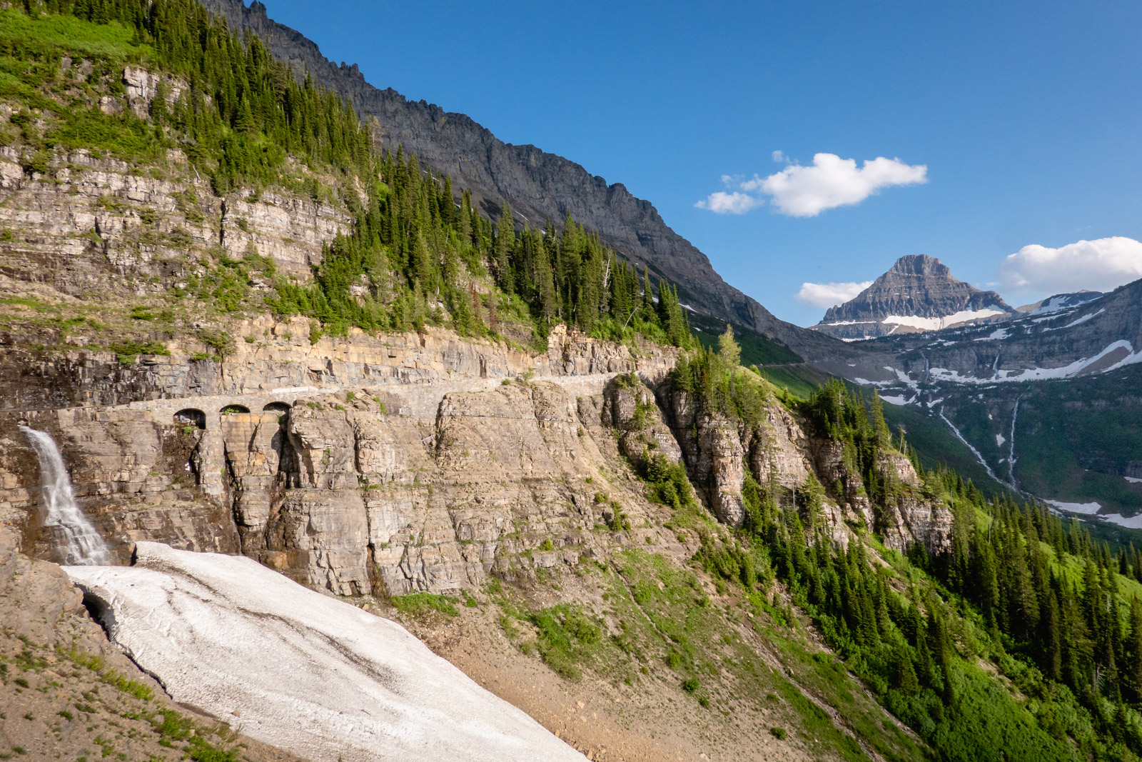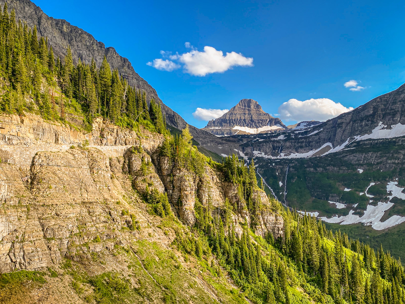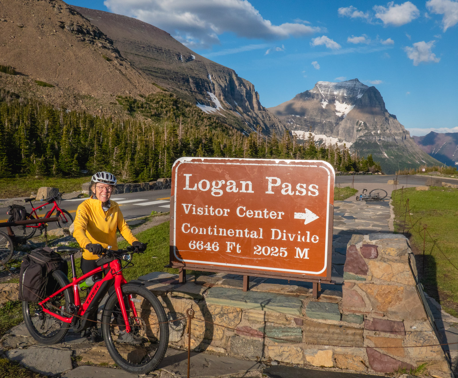 The 53-mile Going-to-the-Sun Road, completed in 1932, for nearly $2 million, bisects the Park from east to west, and crosses the Continental Divide through Logan Pass at an elevation of 6,646 feet. The Going-to-the-Sun Road was not fully open to vehicles for the season but was open on the weekend for bikers and hikers. So on Saturday, July 4th, we decided to ride our Trek e-bikes all the way to Logan Pass from the road closure at Avalanche Creek,16 miles one way. We started our ride at 5pm on a beautiful warm, sunny evening, in order to be able to find a parking space for the Jeep, and maybe see the full moon rise on Logan Pass. Also, at this hour we were practically the only riders on the road. Biking offers a way to ultimately savor all of the detail that created the country’s only road that is a National Historic Landmark and National Civil Engineering Landmark.