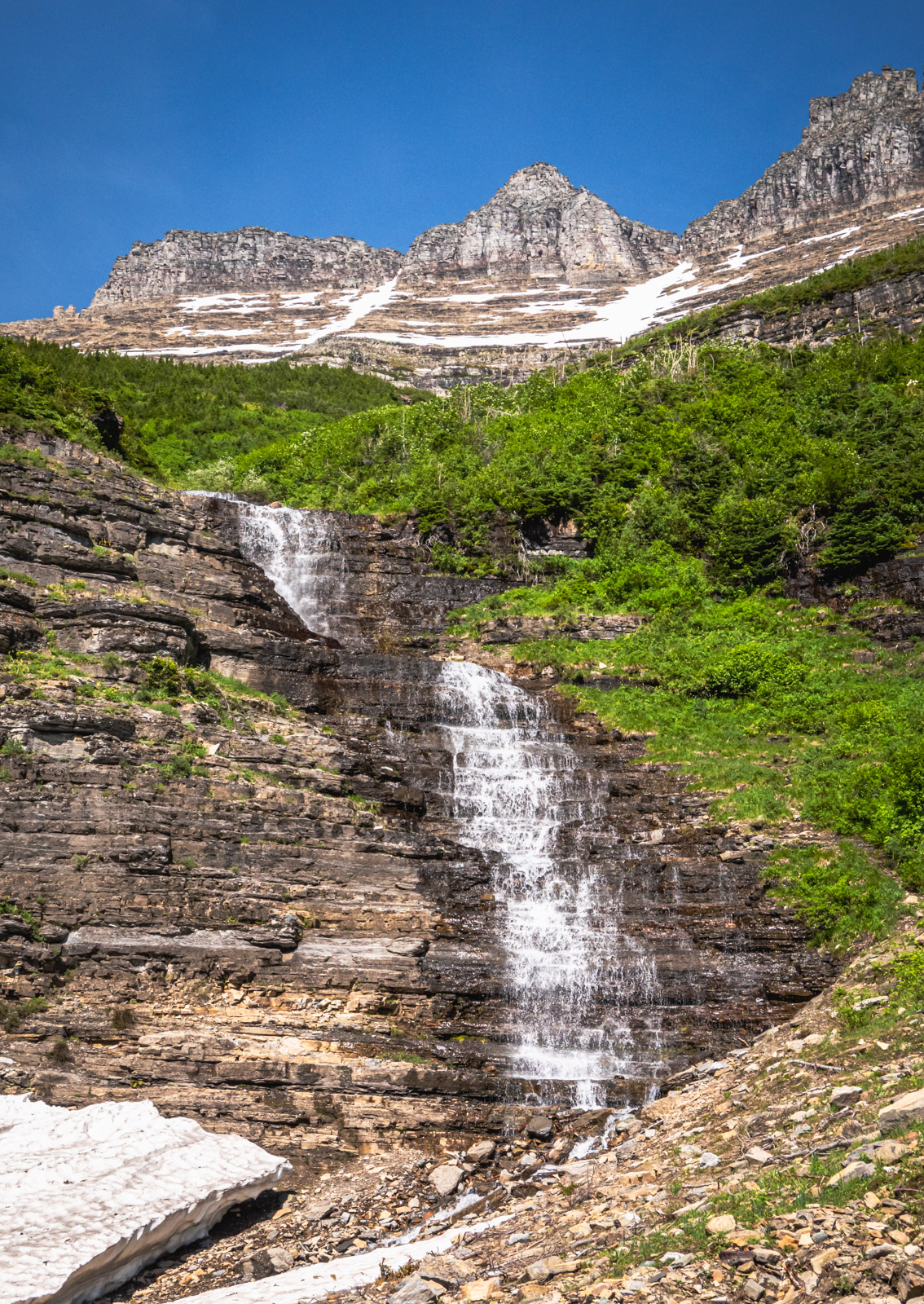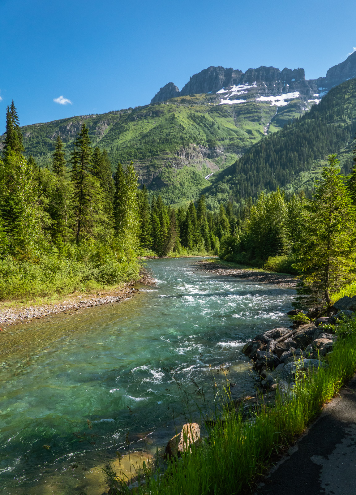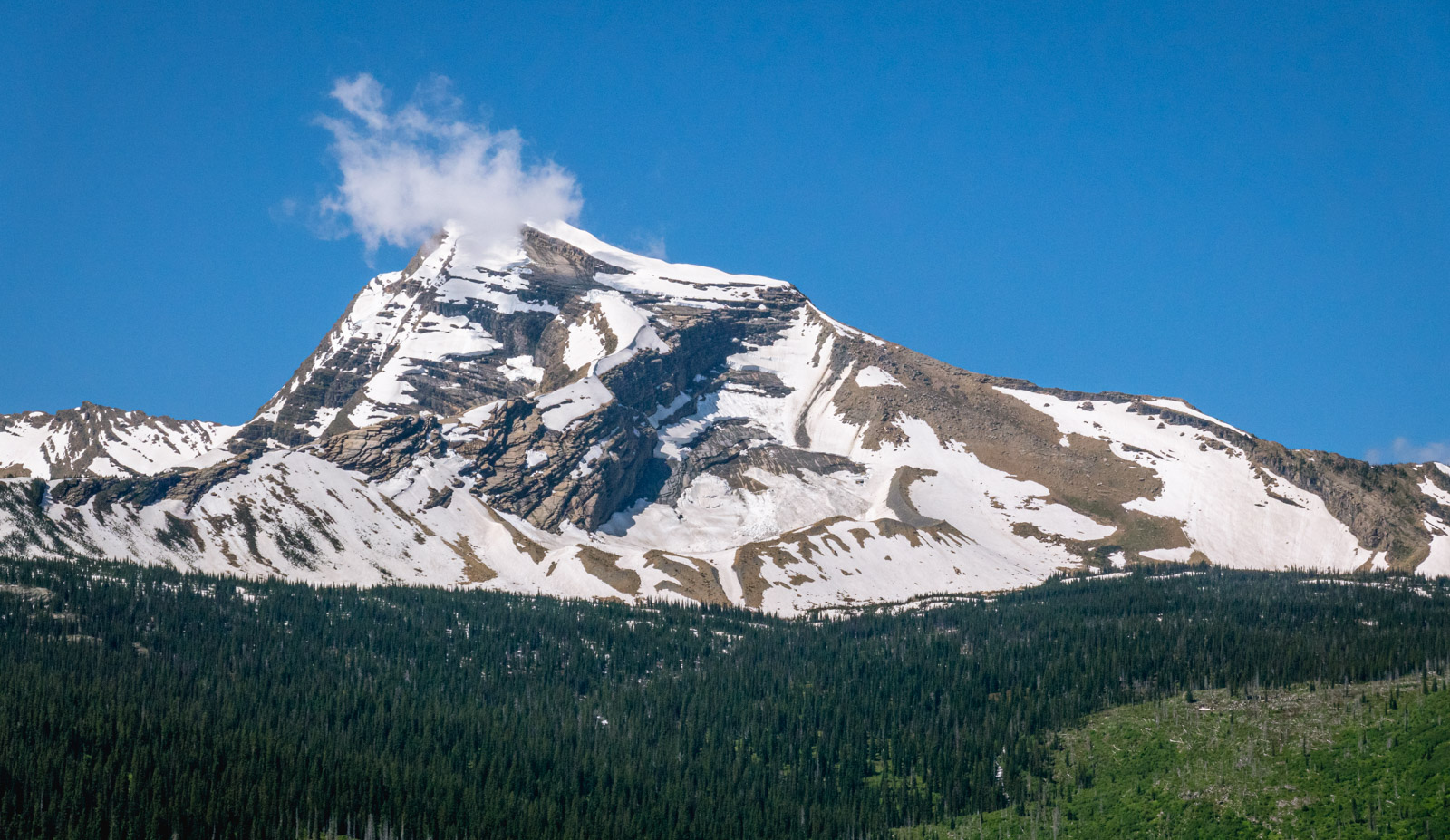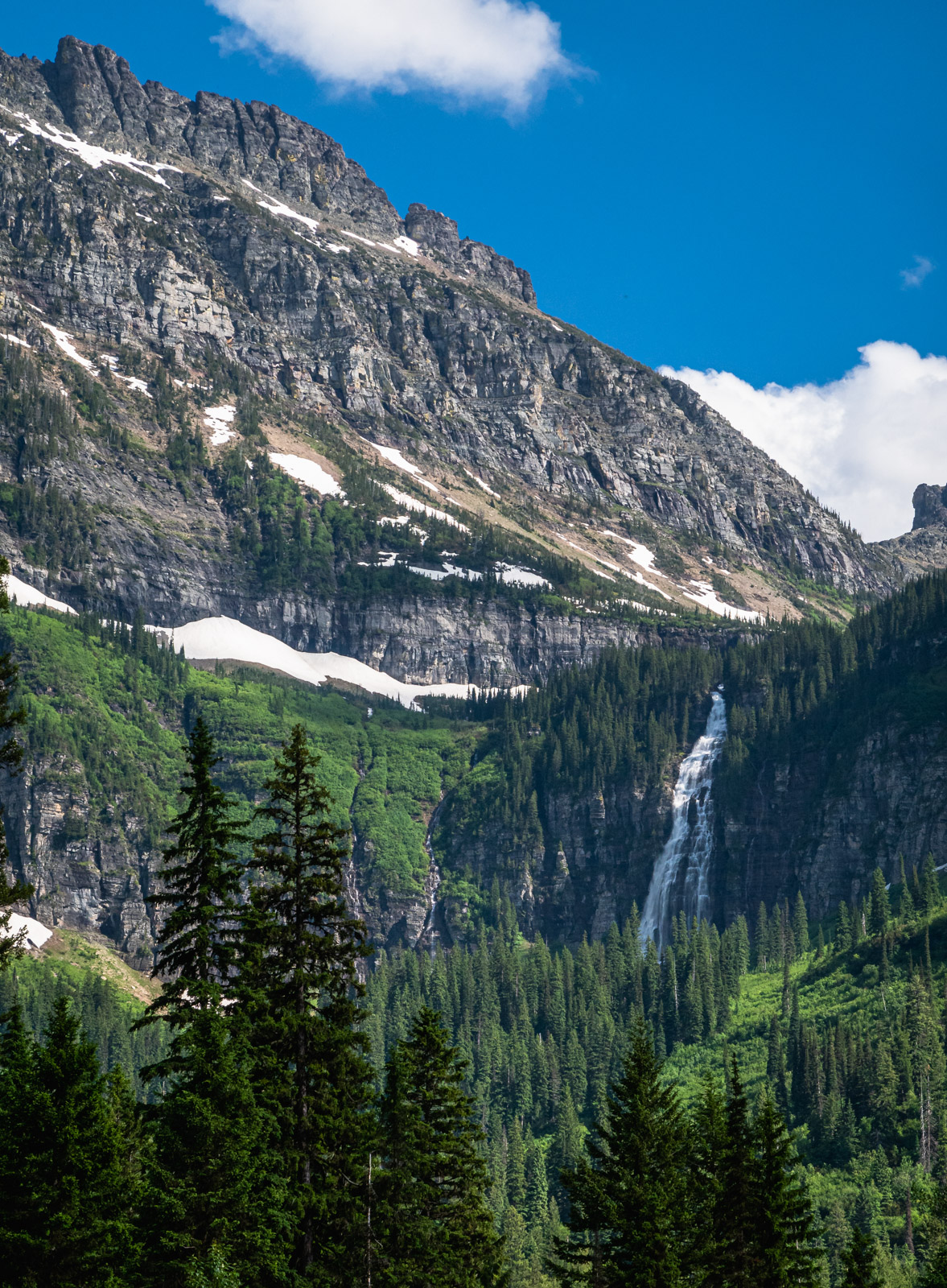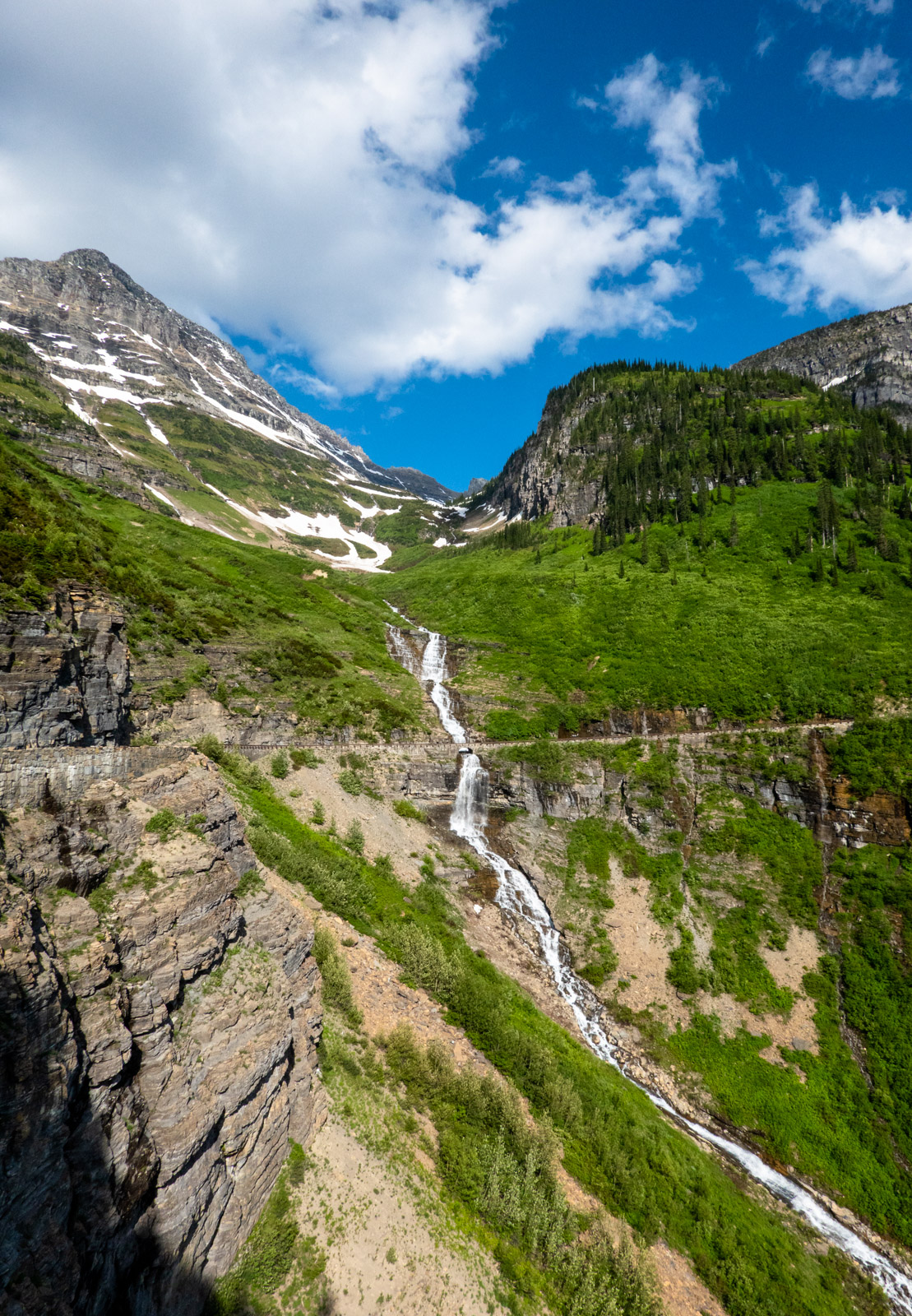 The 53-mile Going-to-the-Sun Road, completed in 1932, for nearly $2 million, bisects the Park from east to west, and crosses the Continental Divide through Logan Pass at an elevation of 6,646 feet. The Going-to-the-Sun Road was not fully open to vehicles for the season but was open on the weekend for bikers and hikers. So on Saturday, July 4th, we decided to ride our Trek e-bikes all the way to Logan Pass from the road closure at Avalanche Creek,16 miles one way. We started our ride at 5pm on a beautiful warm, sunny evening, in order to be able to find a parking space for the Jeep, and maybe see the full moon rise on Logan Pass. Also, at this hour we were practically the only riders on the road. Biking offers a way to ultimately savor all of the detail that created the country’s only road that is a National Historic Landmark and National Civil Engineering Landmark.