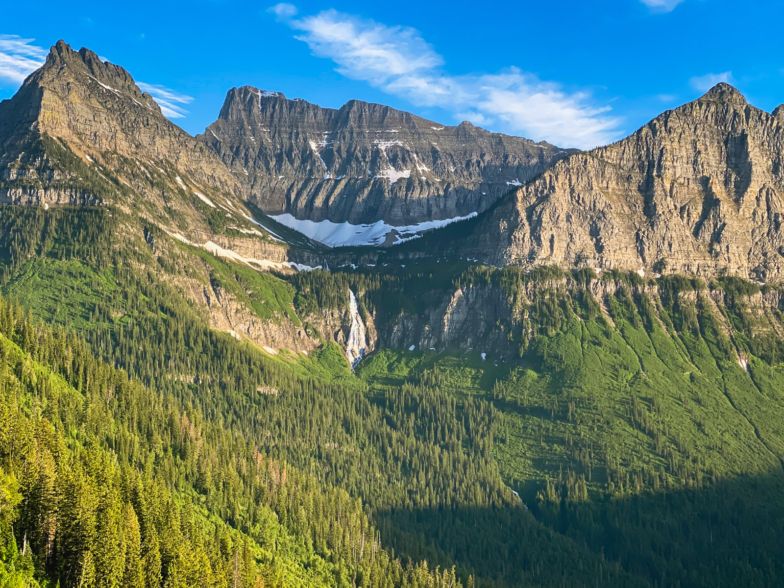 On Saturday, July 13th, we rode the Going-to-the-Sun Road again but this time I wanted to ride my road bike because I bought the bike jersey with the Going-to-the-Sun Road logo. This time we left early in the morning and parked on the road beside Lake McDonald because there was no more parking places further up the road, where we had left from Avalanche Lake parking lot before, and the road was closed. Therefore, we had a longer ride today to Logan Pass, but the best part was that there were still no cars on the road. Also, the light on the peaks was totally different because we were there early in the day. It was a spectacular ride and so happy that I did it on my road bike this time.