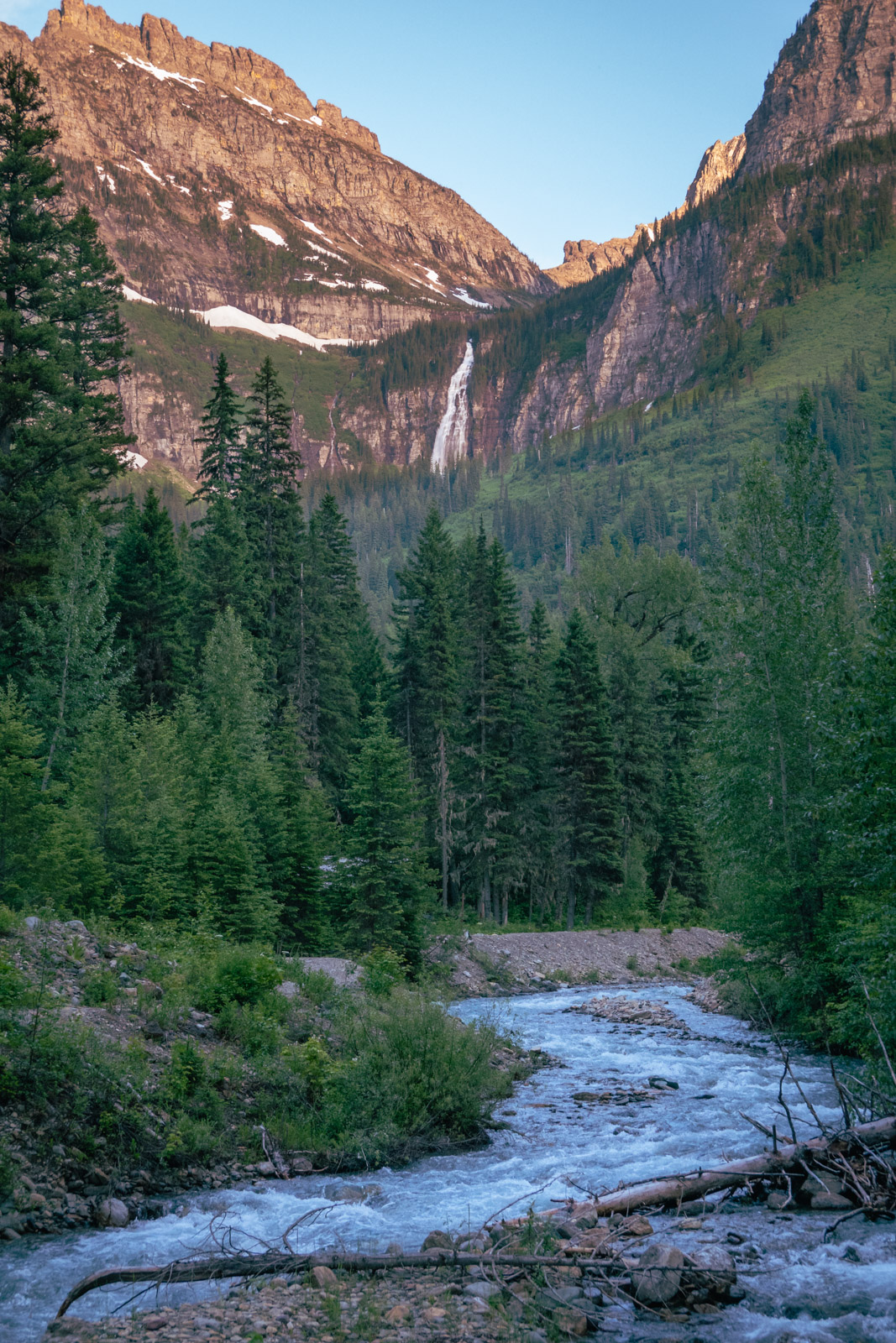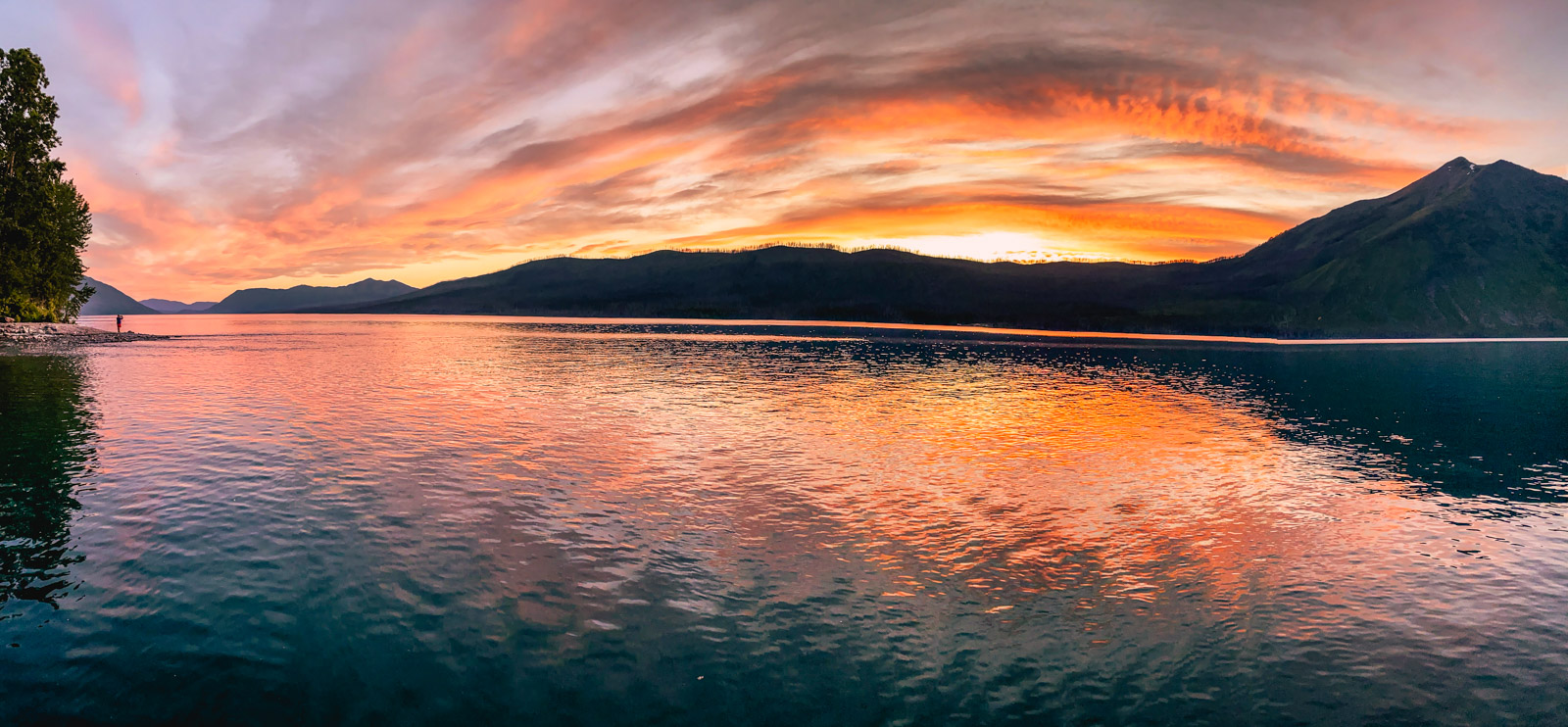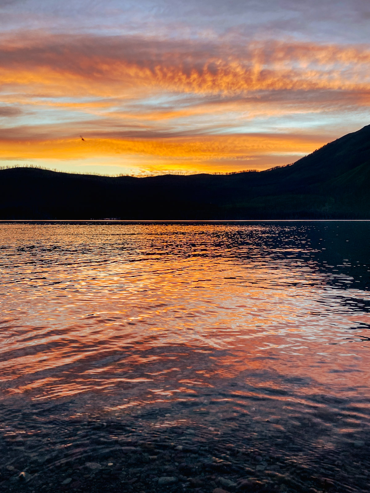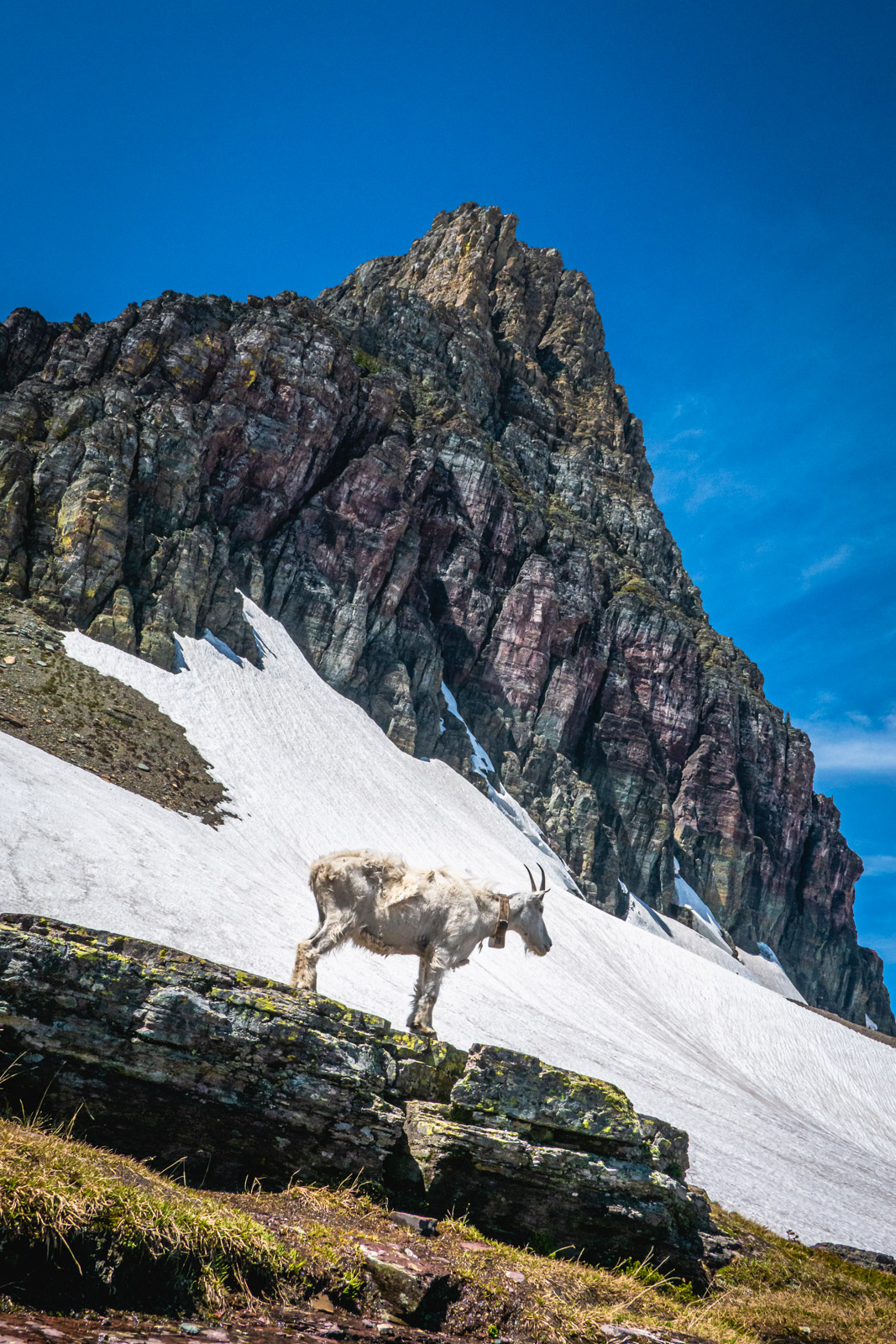 The WOW factor of experiencing the awe of Glacier National Park firsthand, on a bicycle, with no cars, is a bucket-list item and you should absolutely do it. On our bikes we had the time and space to enjoy every detail of the National Park, without worrying about traffic or crowds. The ride follows the cascading waters of McDonald Creek for the first few miles, and we could see the road way up ahead winding up to Logan Pass. We stopped on the bridge crossing Logan Creek to view the stunning 492-foot Bird Woman Falls. These falls are always in shadow when we have come up before and it was such a treat to enjoy the full view of the falls in the sunlight. We arrived at the West Side Tunnel, stopping to marvel at this 192-foot long tunnel and the windows that peek out at Heavens Peak dominating the horizon ahead. At the Loop, the road makes a sharp180-degree turn and the 10 mile climb to Logan Pass begins. We captured a photo of the 490 foot Haystack Falls cascading underneath the road and then plunging further down the valley. We rode past the Weeping Wall, a 100-foot long feature of the Going-to-the-Sun Road, best viewed in early season when water “weeps” over the rock face of the road and we saw plenty of water flowing today. The Triple Arches are one of the engineering marvels of the Sun Road, and we spent time gazing at the construction of these three stone arches. At the summit we were greeted by a lonely mountain goat, who watched us go by. We ate dinner on a bench in the empty parking lot as we waited for the full moon to rise. After some time we decided that we had better start back down before the sun set and what a thrilling ride, all the way to the Avalanche Creek road gates, 32 miles total. We stopped a few times going down to get a different perspective of the mountain scenery from the Sun Road. We drove into Lake McDonald to see the red sunset lighting up the water 10pm at night. What an experience, we will always remember, and one you should absolutely do at least once in your lifetime. Click on thumbnail to view images
