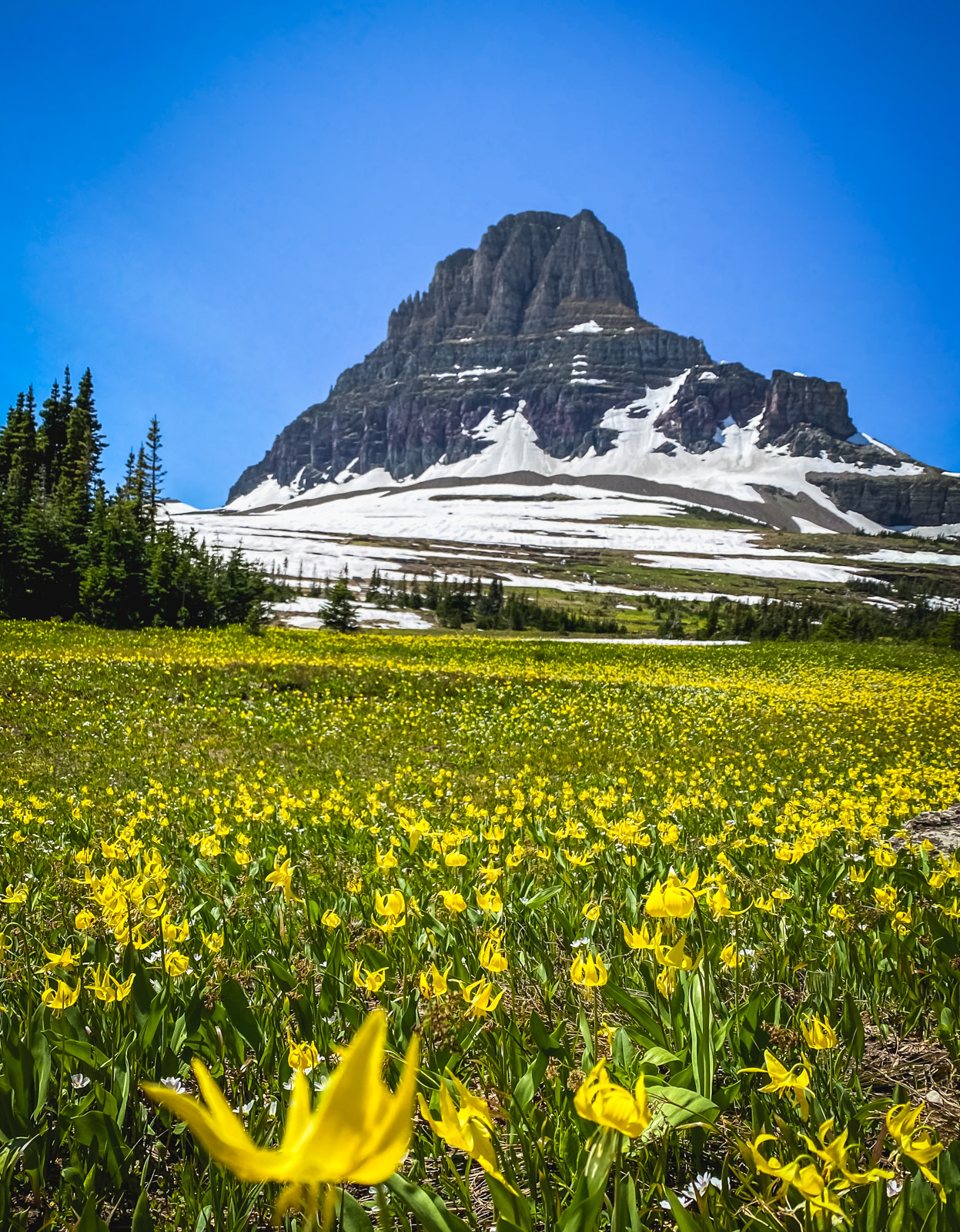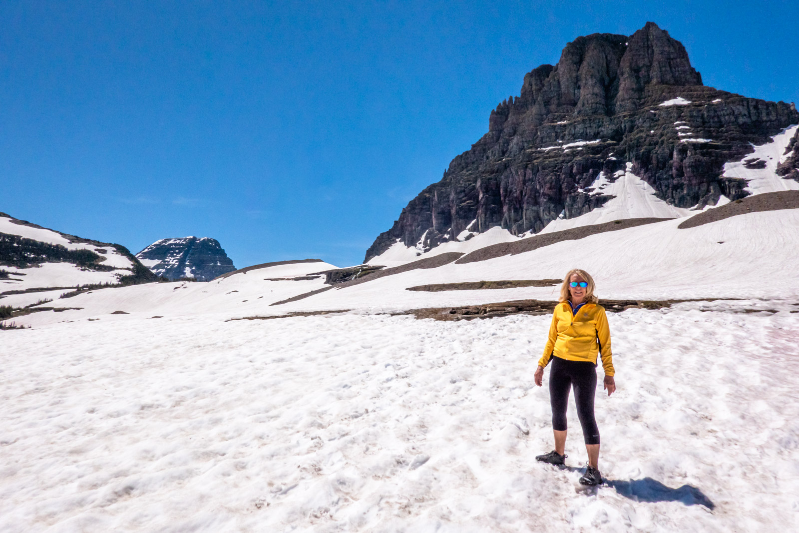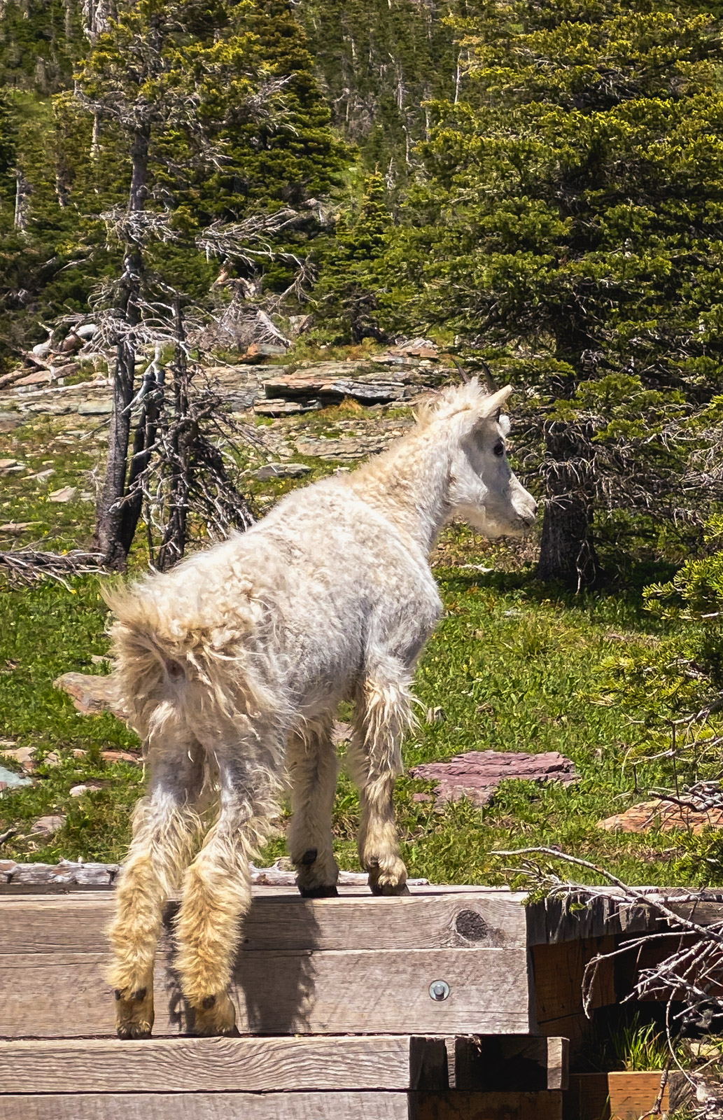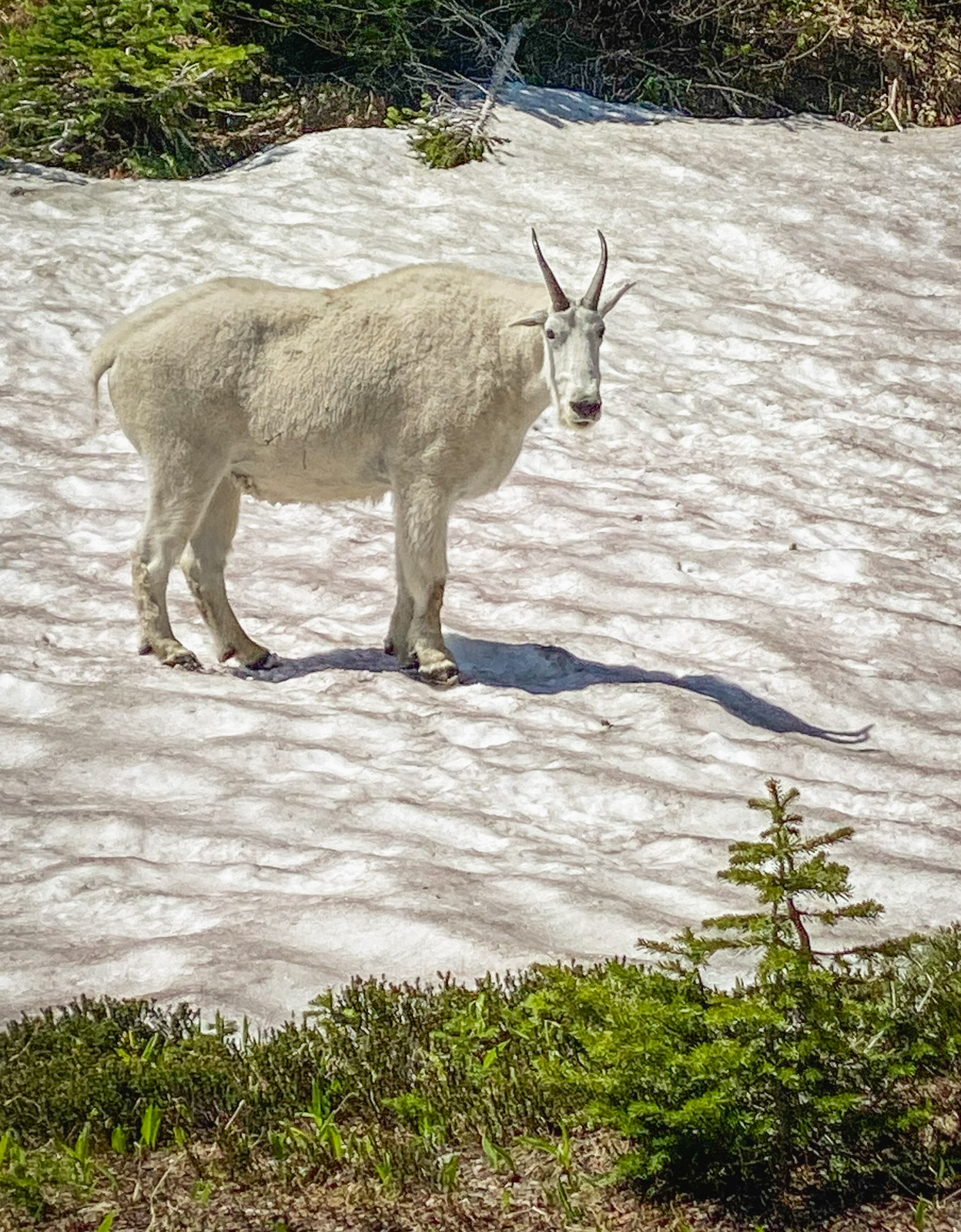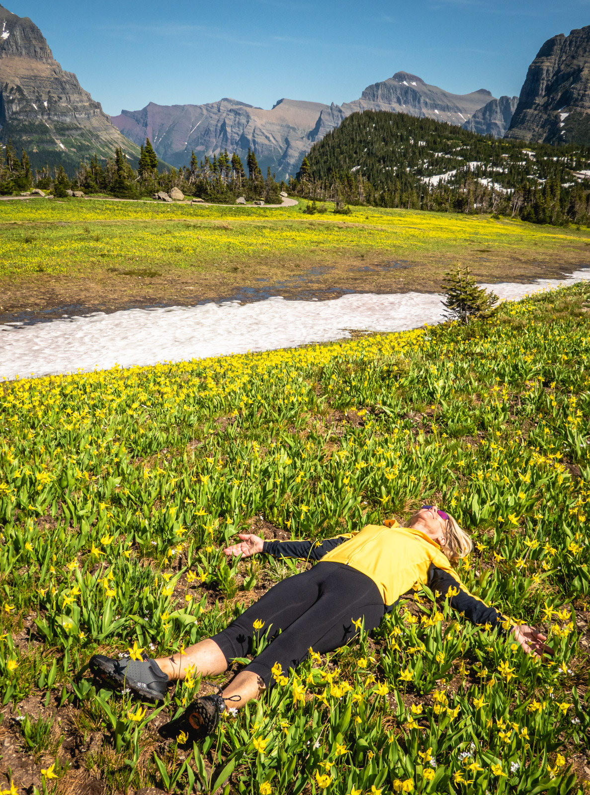 More Mountain goats were surrounding the overlook and a small Marmot was hiding under the deck. We soaked in the views of Mount Cannon, Fusillade Mountain, Gunsight Mountain and Sperry Glacier in the far off distance. We made it back through the snow, downhill was a lot easier, and back to the Hanging Gardens and the incredibly beautiful carpet of wildflowers. I rested in Savasana among the Glacier Lilies enjoying the peacefulness and beauty of this place. The ride back down was fast and we did a total of 40 miles on our bikes today. I highly recommend riding the Going-to-the-Sun Road on your bike without the hassle of cars on the road. What an unforgettable day, a once-in-a-lifetime experience!!