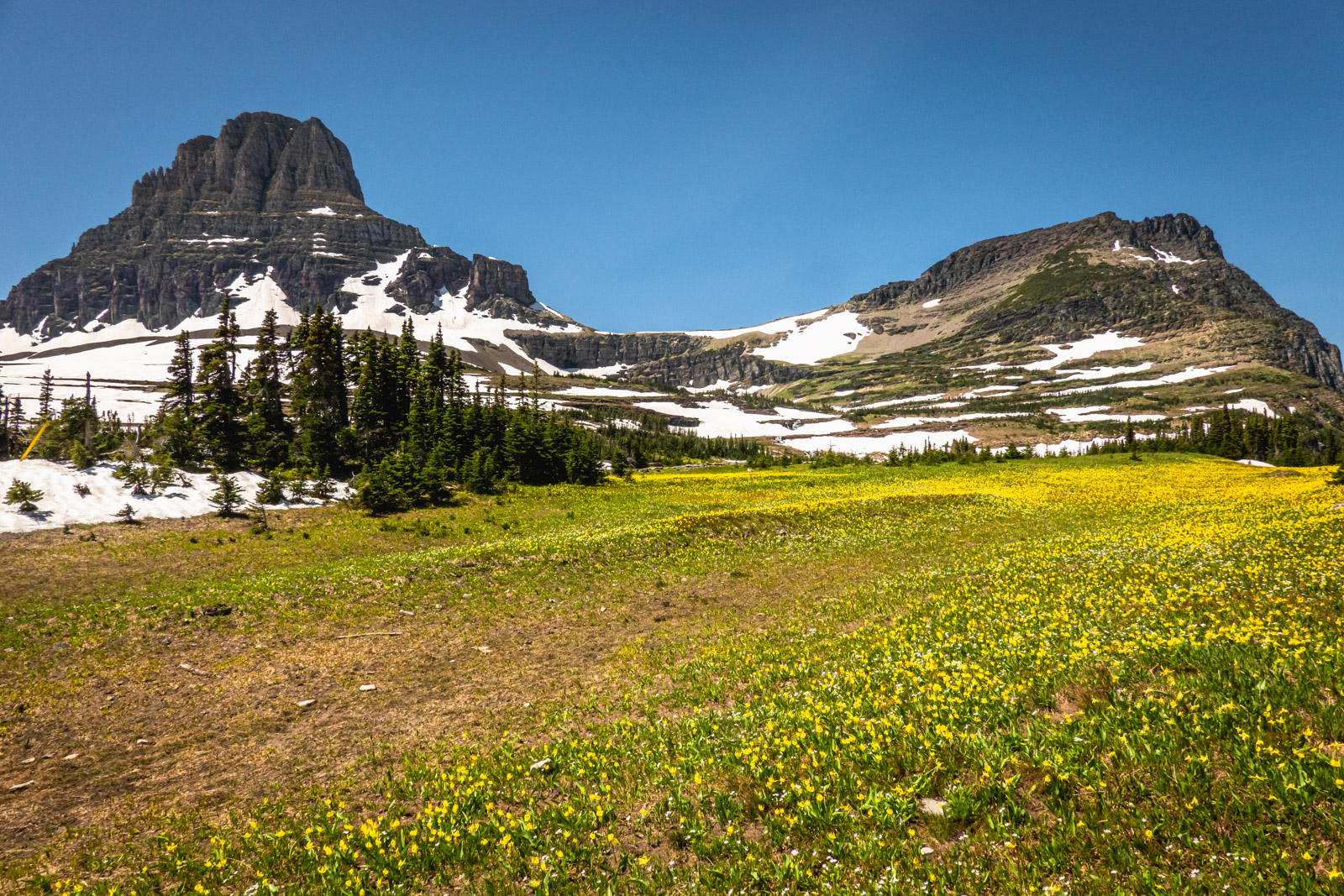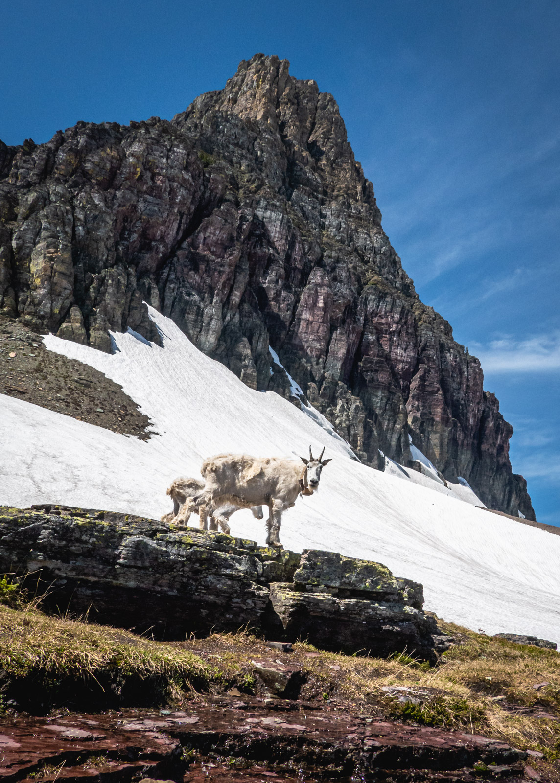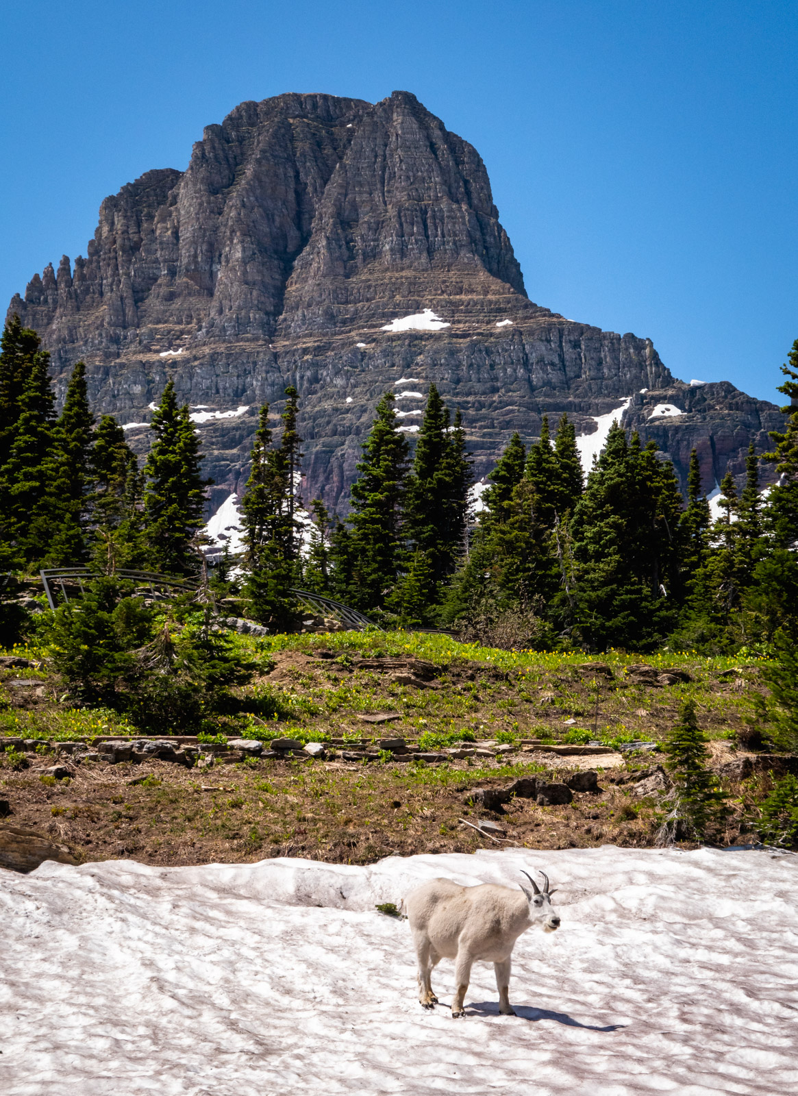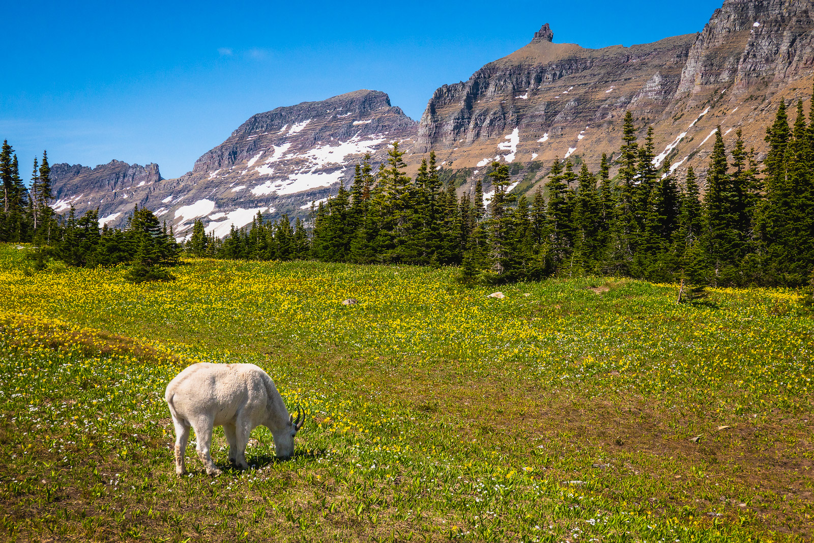 More Mountain goats were surrounding the overlook and a small Marmot was hiding under the deck. We soaked in the views of Mount Cannon, Fusillade Mountain, Gunsight Mountain and Sperry Glacier in the far off distance. We made it back through the snow, downhill was a lot easier, and back to the Hanging Gardens and the incredibly beautiful carpet of wildflowers. I rested in Savasana among the Glacier Lilies enjoying the peacefulness and beauty of this place. The ride back down was fast and we did a total of 40 miles on our bikes today. I highly recommend riding the Going-to-the-Sun Road on your bike without the hassle of cars on the road. What an unforgettable day, a once-in-a-lifetime experience!!