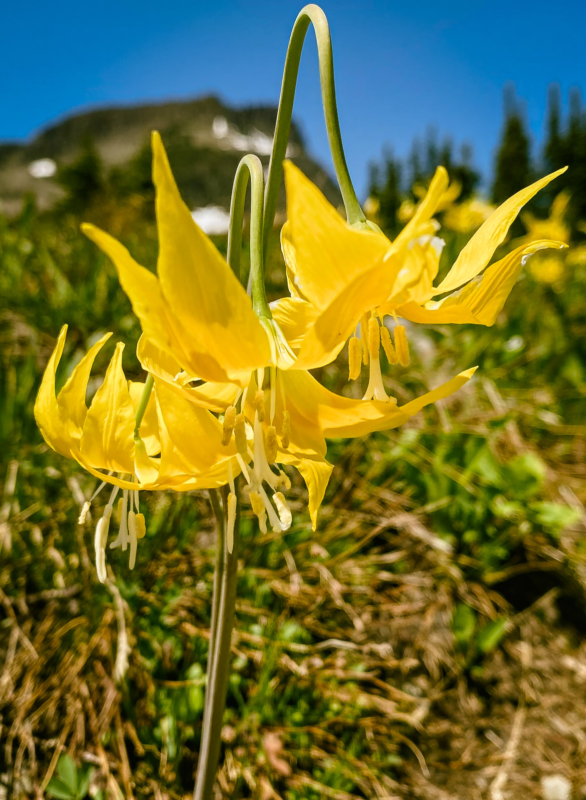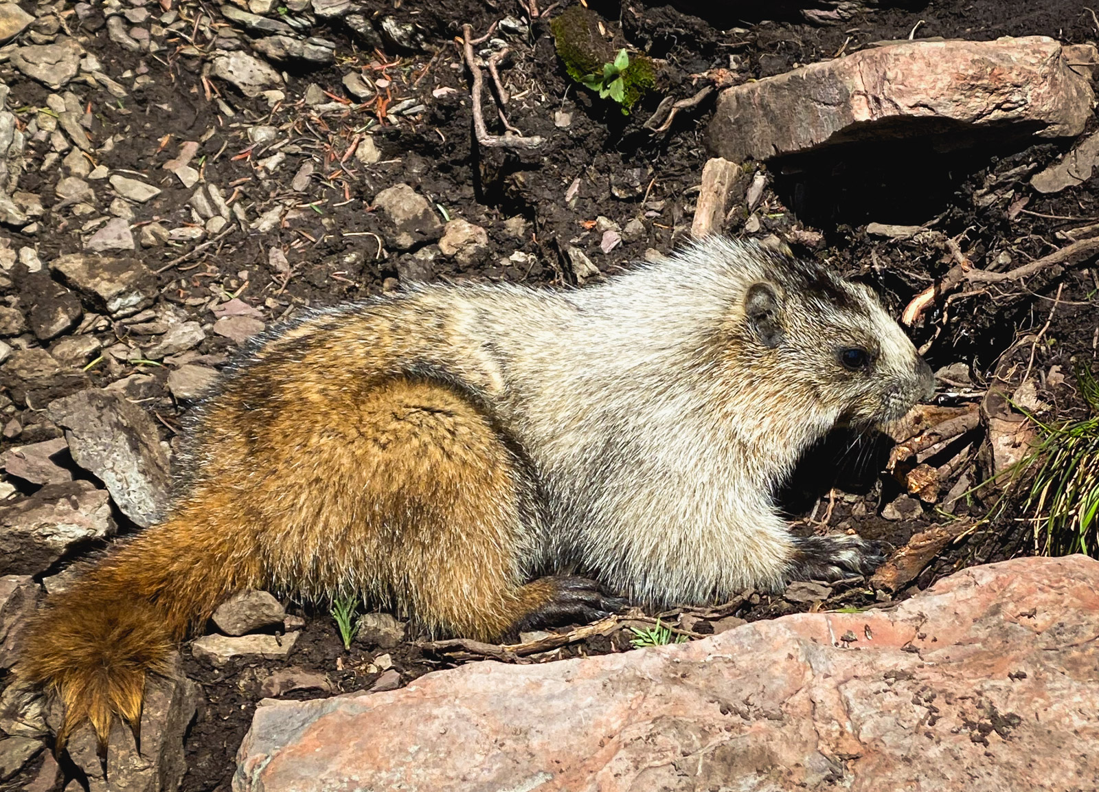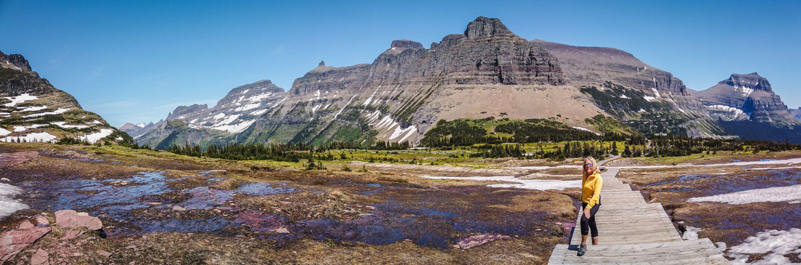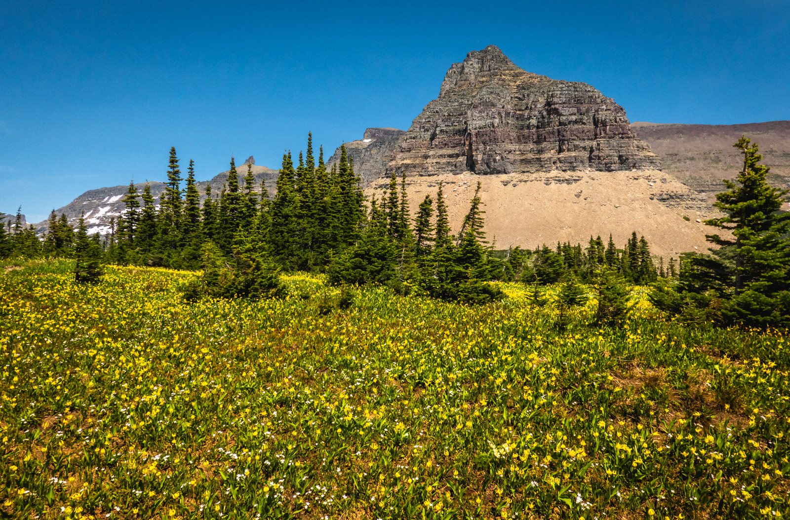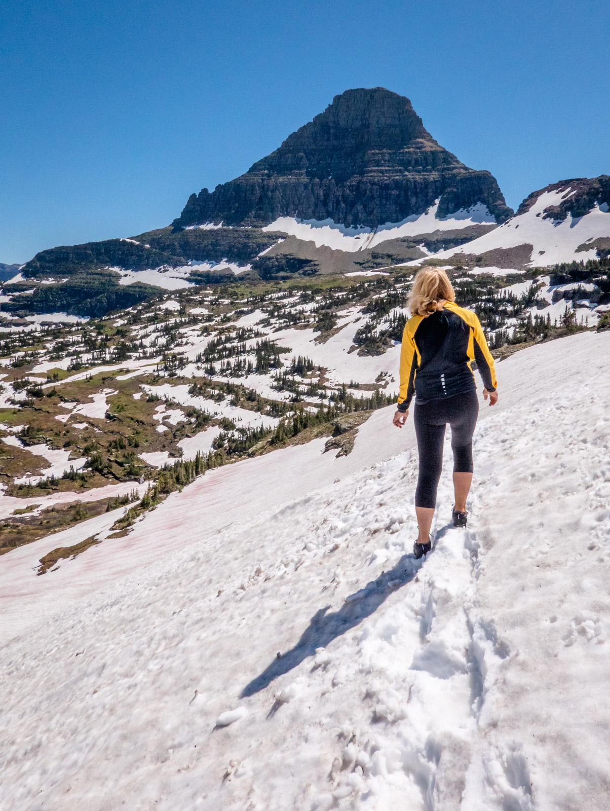 More Mountain goats were surrounding the overlook and a small Marmot was hiding under the deck. We soaked in the views of Mount Cannon, Fusillade Mountain, Gunsight Mountain and Sperry Glacier in the far off distance. We made it back through the snow, downhill was a lot easier, and back to the Hanging Gardens and the incredibly beautiful carpet of wildflowers. I rested in Savasana among the Glacier Lilies enjoying the peacefulness and beauty of this place. The ride back down was fast and we did a total of 40 miles on our bikes today. I highly recommend riding the Going-to-the-Sun Road on your bike without the hassle of cars on the road. What an unforgettable day, a once-in-a-lifetime experience!!