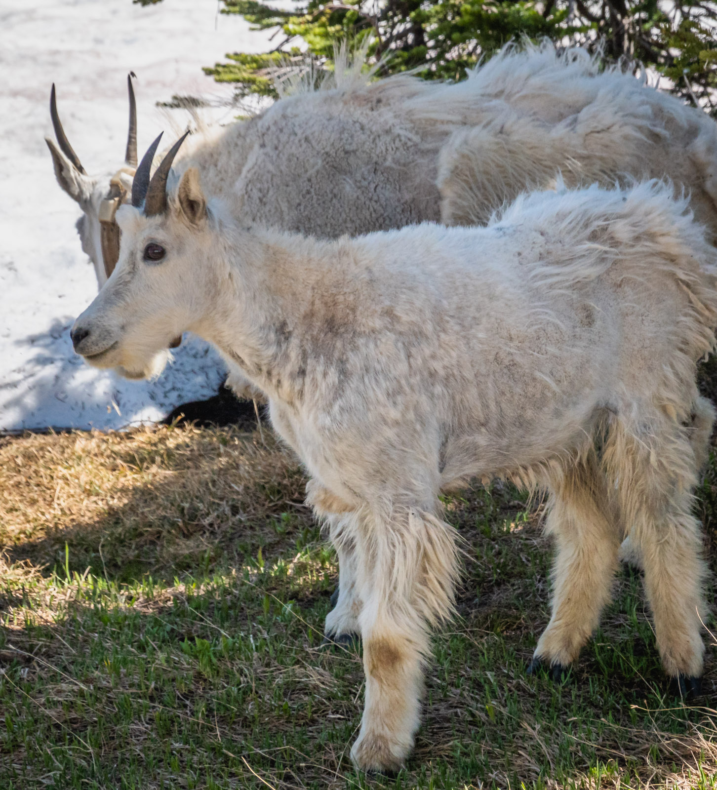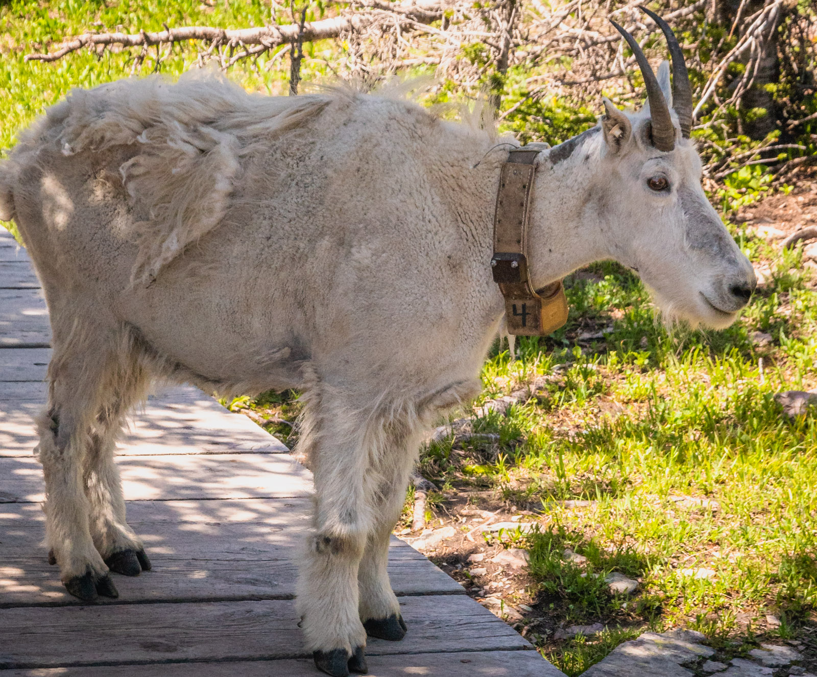 We had our photo taken at the Logan Pass sign with my Trek road bike and the new well- earned Going-to-the-Sun Road bike jersey. It was still early so we decided to hike to Hidden Lake Overlook. However, it was a harder hike than we had anticipated because of all the snow we had to walk through in our bike shoes. But the view of the magnificent yellow Glacier Lilies was so worth the hike. WOW, what a fantastic sea of yellow everywhere you look, I was so impressed by the abundance of Glacier Lilies at this time of year. The yellow petals of glacier lilies bloom at the higher elevations around June, just as the snow melts, and have six yellow petals that curve upward toward the sky. They are now my favorite flower in Glacier National Park. We eventually made it to the boardwalk where we encountered a Mountain goat with a new baby watching us. At 1.35 miles we arrived at the Hidden Lake Overlook with outstanding panoramic views of the Lake and surrounding mountains. From this vantage point Bearhat Mountain (8,952 ft) is the dominating feature above Hidden Lake.