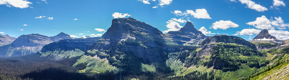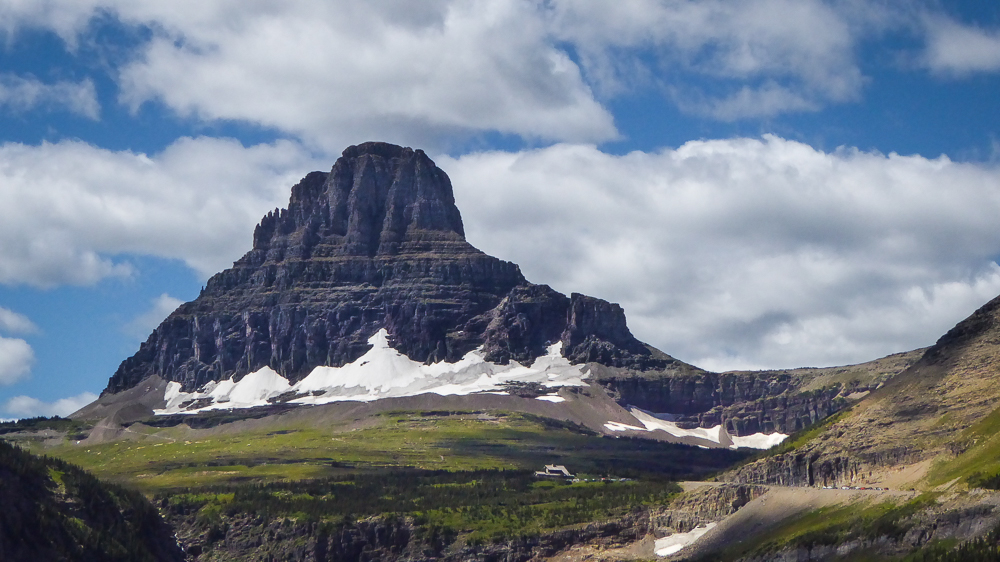 The rain from yesterday cleared the sky of the smoke from the fires, mostly from Washington, and the Going-to-the-Sun road opened back up today. We decided to take this opportunity to drive this Road to see the damage from the fire and the magnificent mountain views. There is still construction on the road and we were stopped in traffic for some time. As we started to move again a black bear cub came running across the road in front of us. We were able to capture some photos of him as he looked back with curiosity at us, and then he was gone. The road went right through the middle of the burnt out area and the devastation was immense. We were not allowed to stop anywhere along the road until we passed the fire damage. The blue sky was dotted with puffy white clouds and the mountain vistas were beautiful to see again. Click on thumbnail to view images