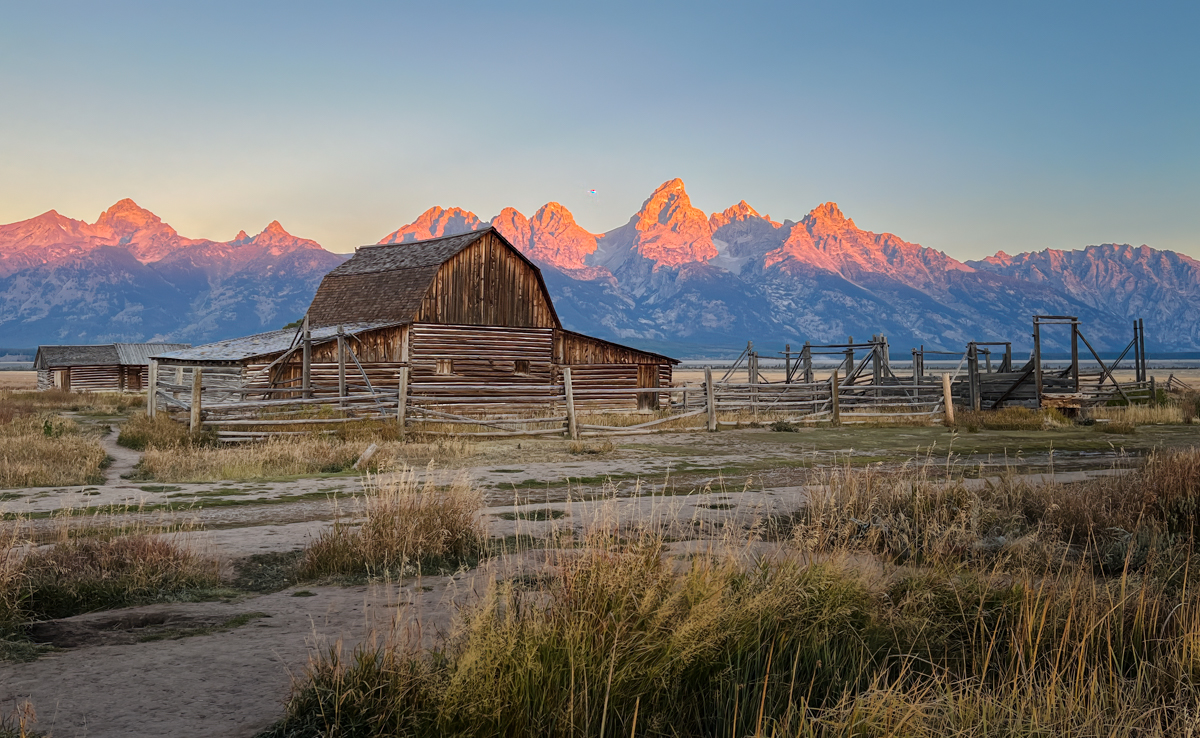 As we arrived at the barn, the first light of dawn was just starting to appear on the horizon, casting a soft glow over the Teton Range in the distance. As the barn and mountain peaks were lite up by the rising sun, and it was a truly magical sight to behold. As the sun continued to rise higher in the sky, the colors of the landscape began to change, and rugged peaks of the Teton Range were bathed in a warm and golden light. It was an awe-inspiring moment that left us speechless and in complete awe of the natural beauty that surrounded us. Click on thumbnail to view image