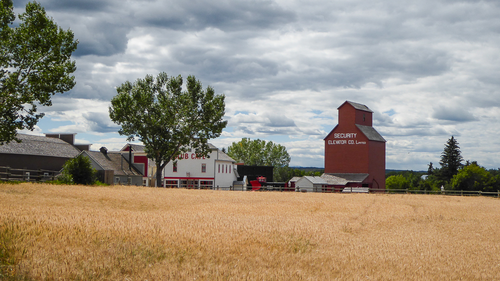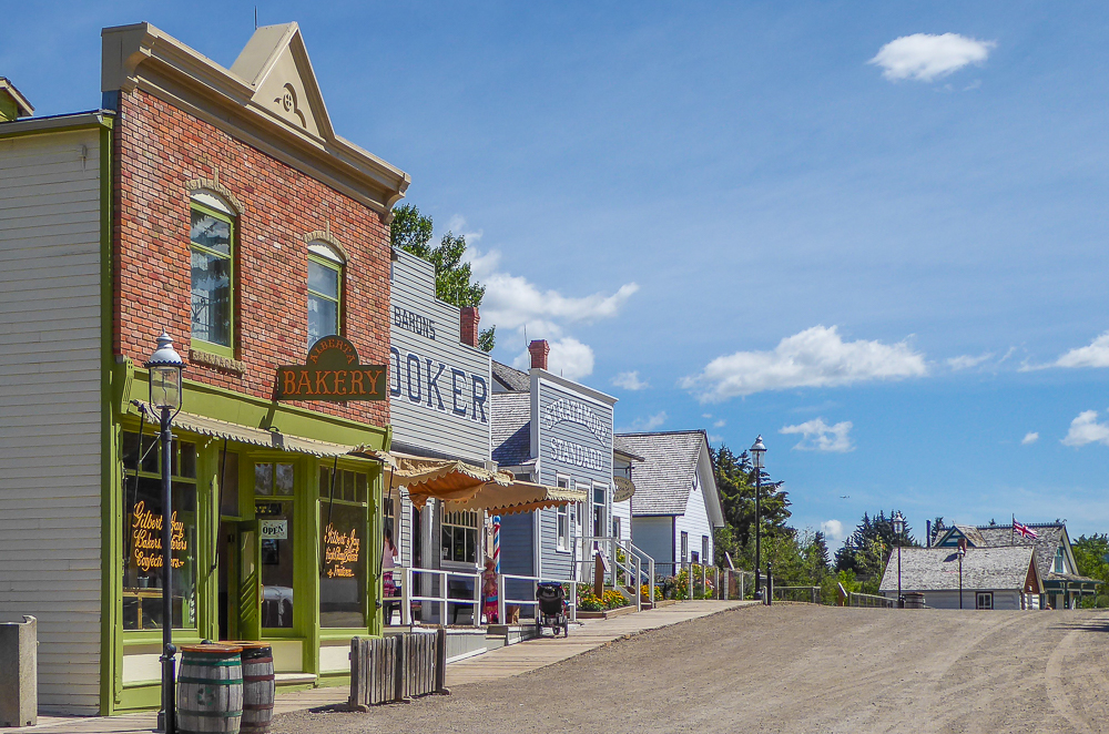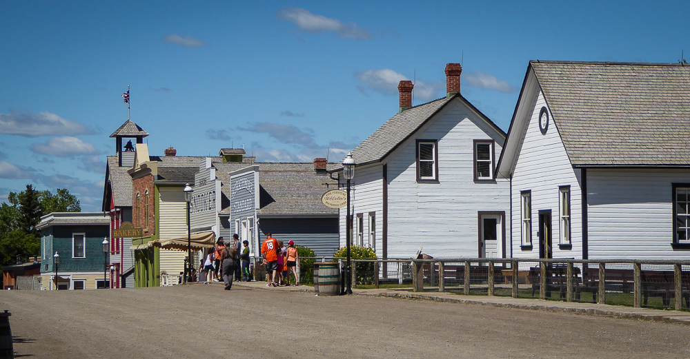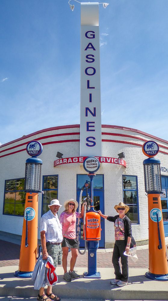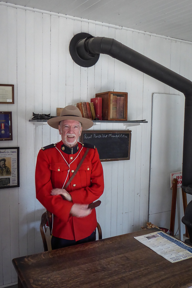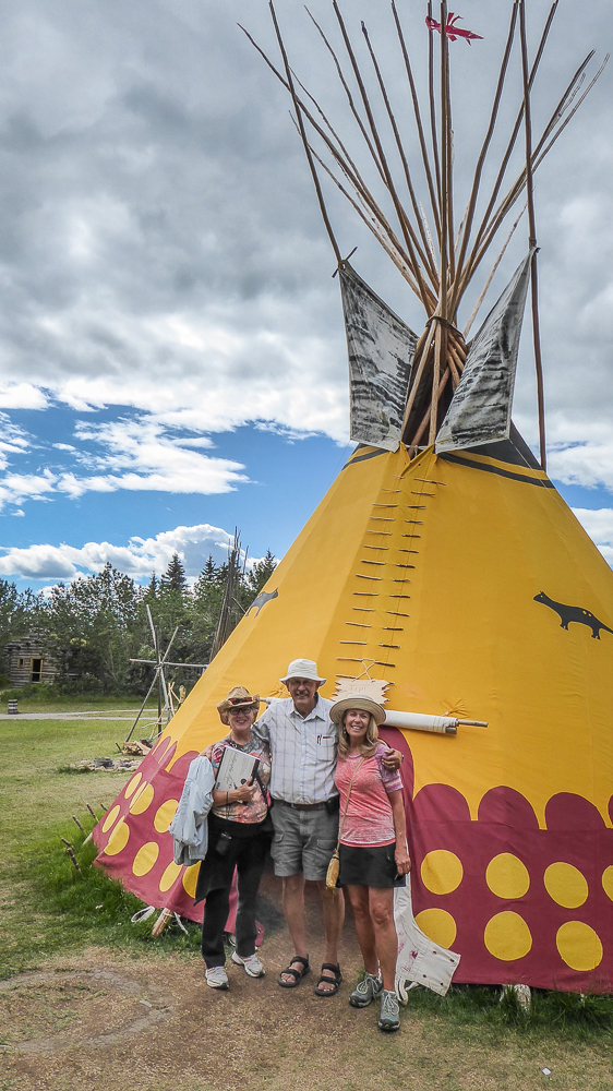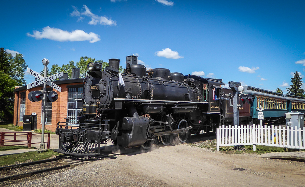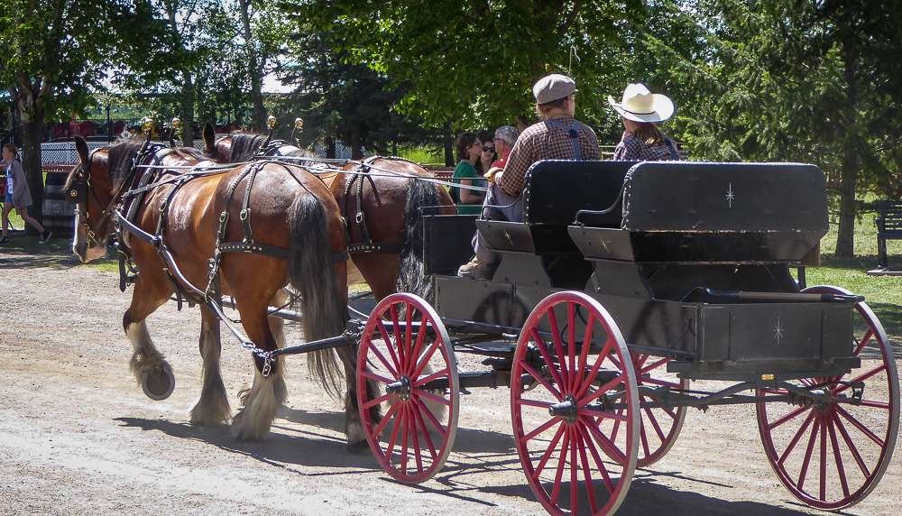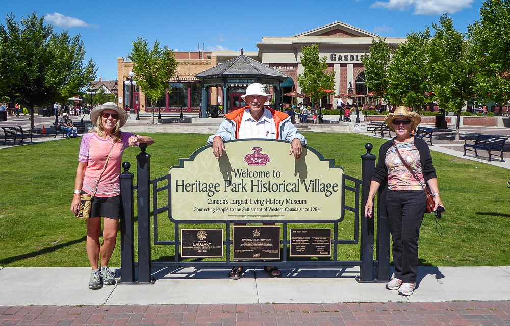 Today our tour guides Harry & Pat took us to the Heritage Park Historical Village in Calgary, that opened on July 1, 1964. The Park is located on 127 acres of parkland on the banks of the Glenmore Reservoir, and is Canada’s largest living history museum. Exhibits span Western Canadian history from the 1860s to the 1950s, and many of the buildings are historical and were transported to the park for display. The people dress in historic costumes, and antique and horse-drawn vehicles service the site. We rode the steam locomotive train on a small railway that goes around the circumference of the park which has original 1900s stations. We also visited the roundhouse that houses various railway equipment, an operational turntable, and a car shop with very rare and unique passenger cars. We saw the working smithy and an aboriginal encampment the representing the Blackfeet where the women were braiding sweet grass. We ate lunch in the historical Wainwright Hotel where Pat used to visit when she was a child. As we walked around the Park we followed a moving play showing how the RCMP “always get their man”. It was such a great day enjoying the past and finished it off with a tasty beer at the Big Rock Brewery. This place is a must see when you are in Calgary. Click on thumbnail to view images