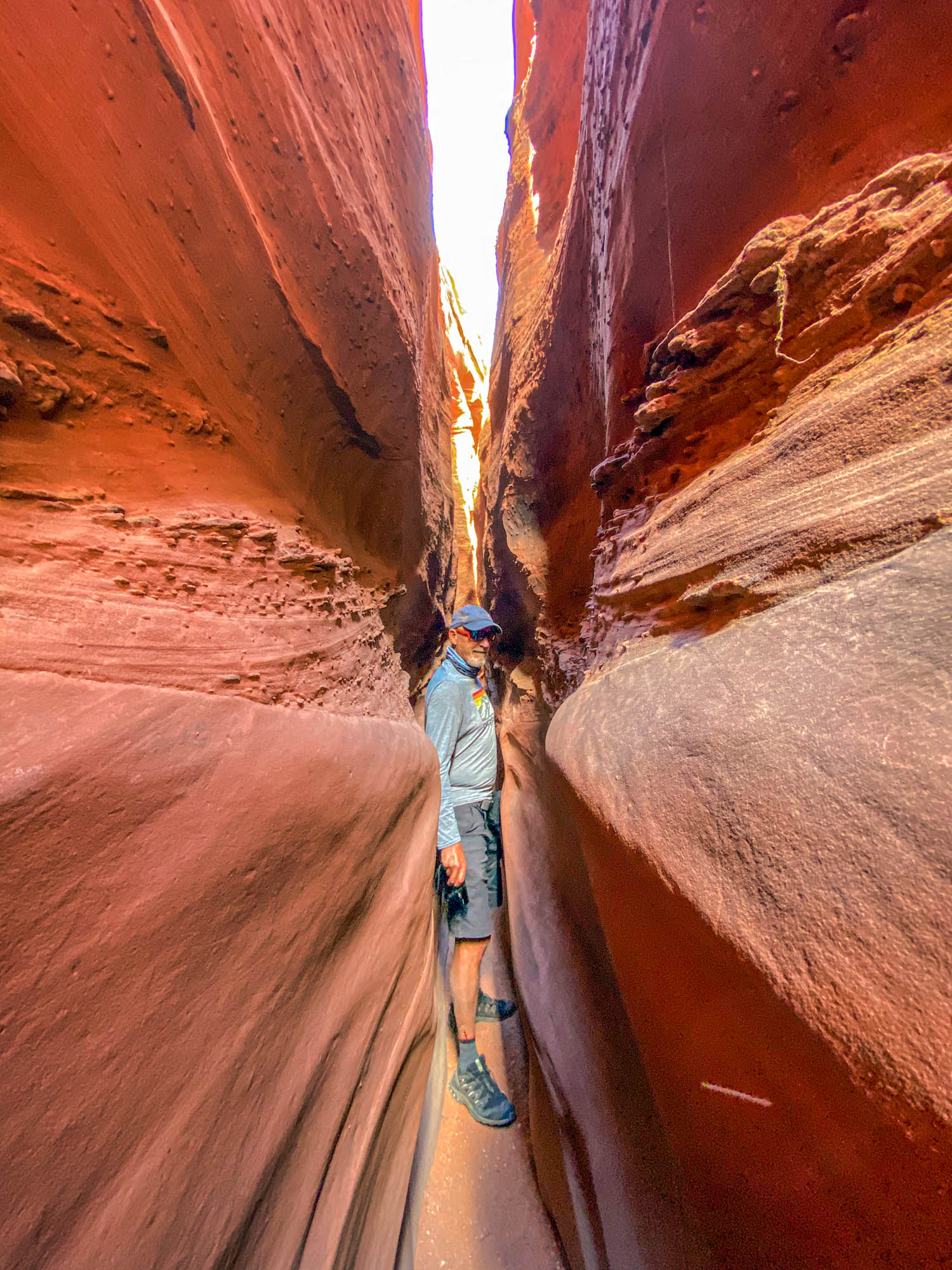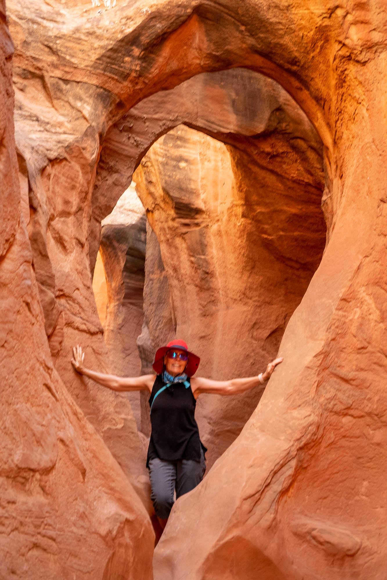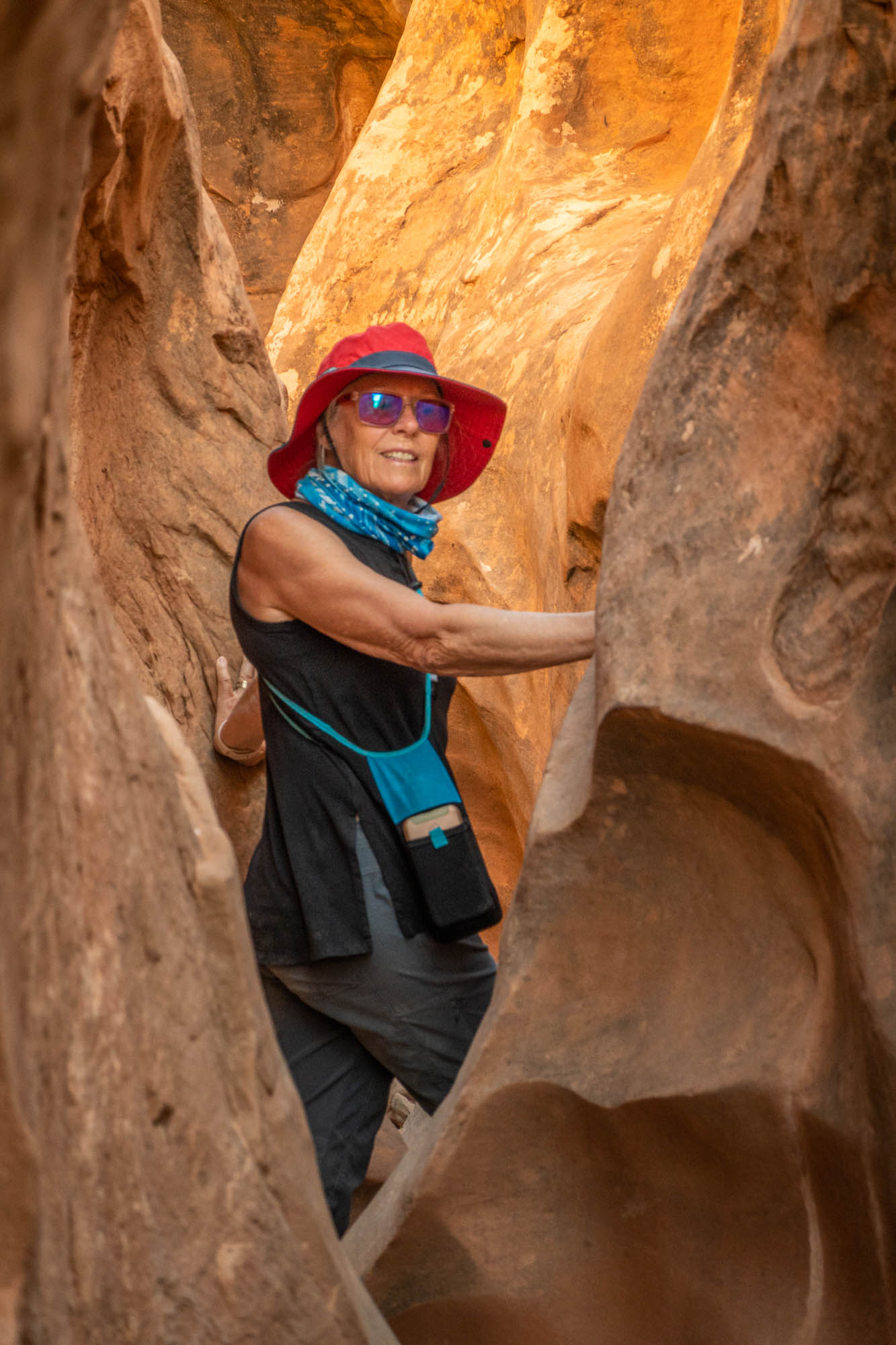 Peek-a-boo and Spooky Slot Canyons is a 6.1 mile loop trail in the Dry Fork area of the Grand Staircase-Escalante area, located off the Hole in the Rock Road. The trail to Peek-a-boo was an adventure in itself, over rock ledges and through a narrow canyon, we finally made it to the entrance of Peek-a-boo. The climb up into the canyon was difficult and I needed a helping hand to get to the top. Once in the canyon the sandstone rock walls, curvatures and arches were so impressive that we stopped often for photos. It was narrow in places and some scrambling but it was a lot of fun. Then we got into Spooky Slot Canyon and it was so narrow that Bob had to crawl on his knees to get through the opening. These were without a doubt the most fun we have had climbing through slot canyons. Click on thumbnail to view images