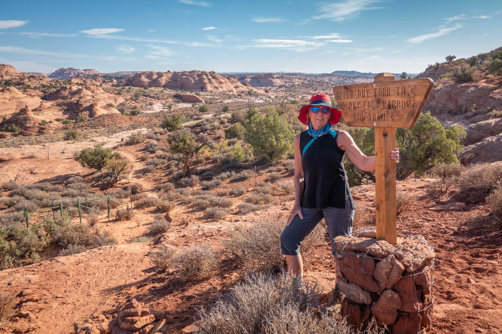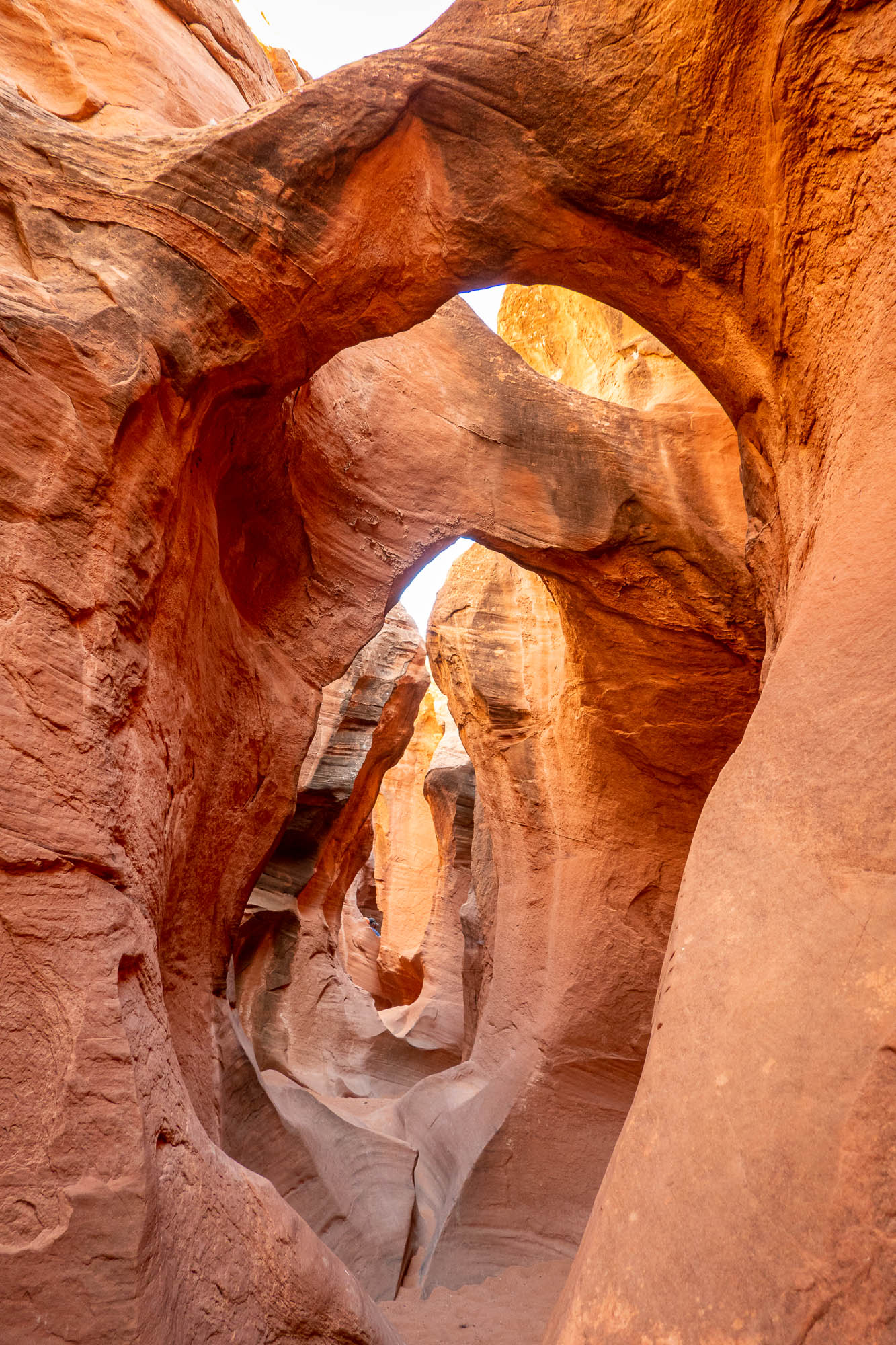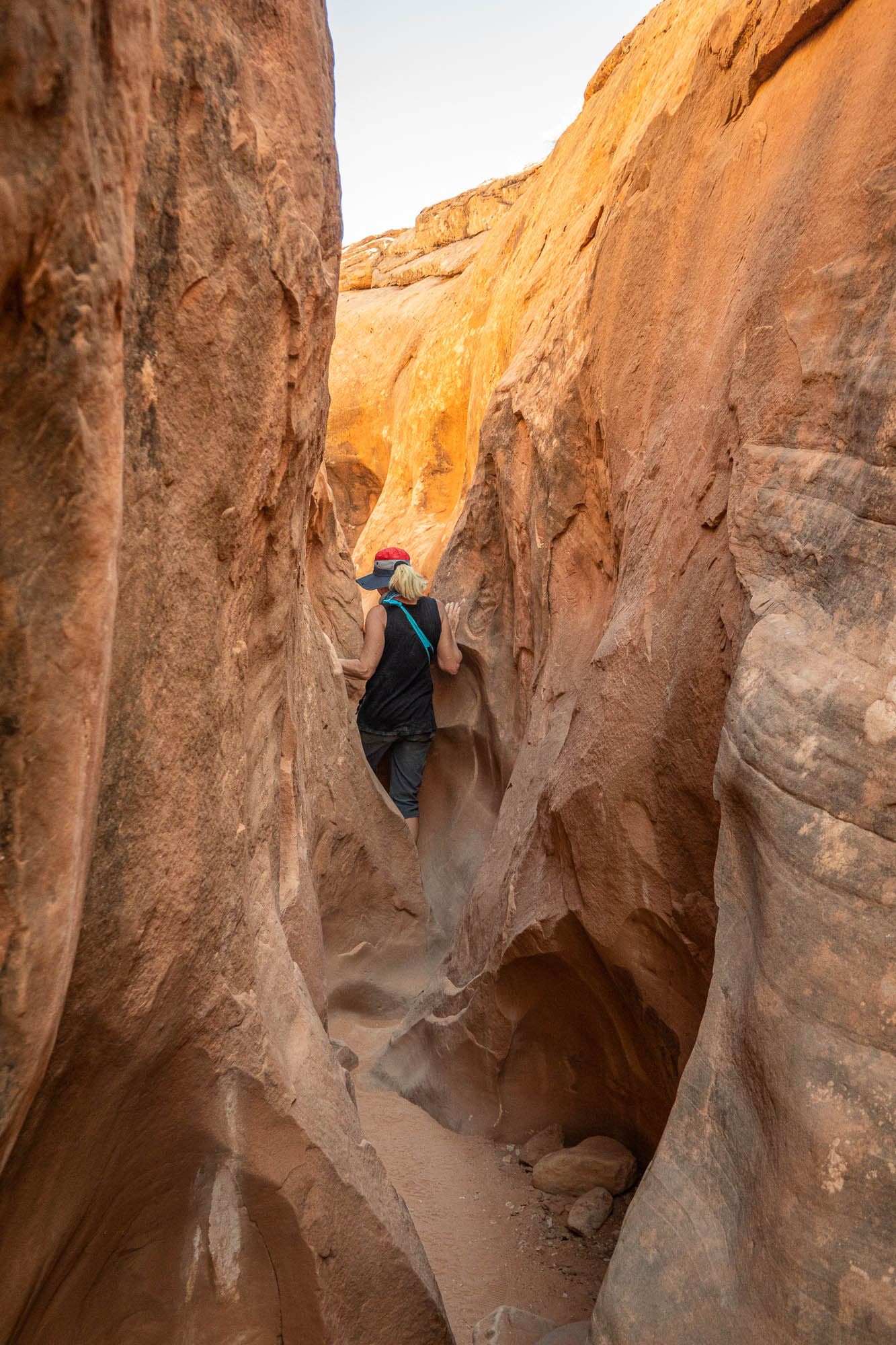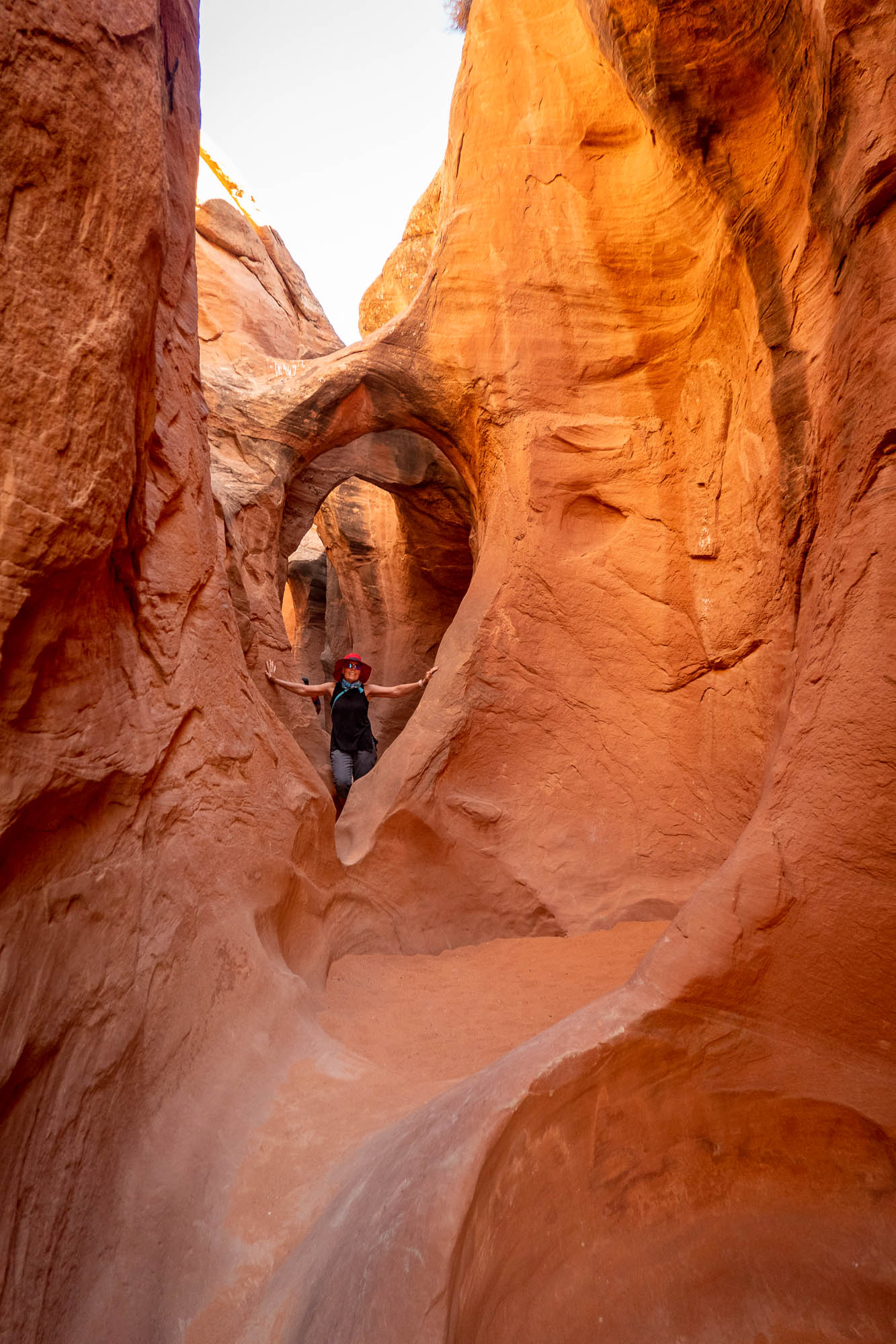 Peek-a-boo and Spooky Slot Canyons is a 6.1 mile loop trail in the Dry Fork area of the Grand Staircase-Escalante area, located off the Hole in the Rock Road. The trail to Peek-a-boo was an adventure in itself, over rock ledges and through a narrow canyon, we finally made it to the entrance of Peek-a-boo. The climb up into the canyon was difficult and I needed a helping hand to get to the top. Once in the canyon the sandstone rock walls, curvatures and arches were so impressive that we stopped often for photos. It was narrow in places and some scrambling but it was a lot of fun. Then we got into Spooky Slot Canyon and it was so narrow that Bob had to crawl on his knees to get through the opening. These were without a doubt the most fun we have had climbing through slot canyons. Click on thumbnail to view images