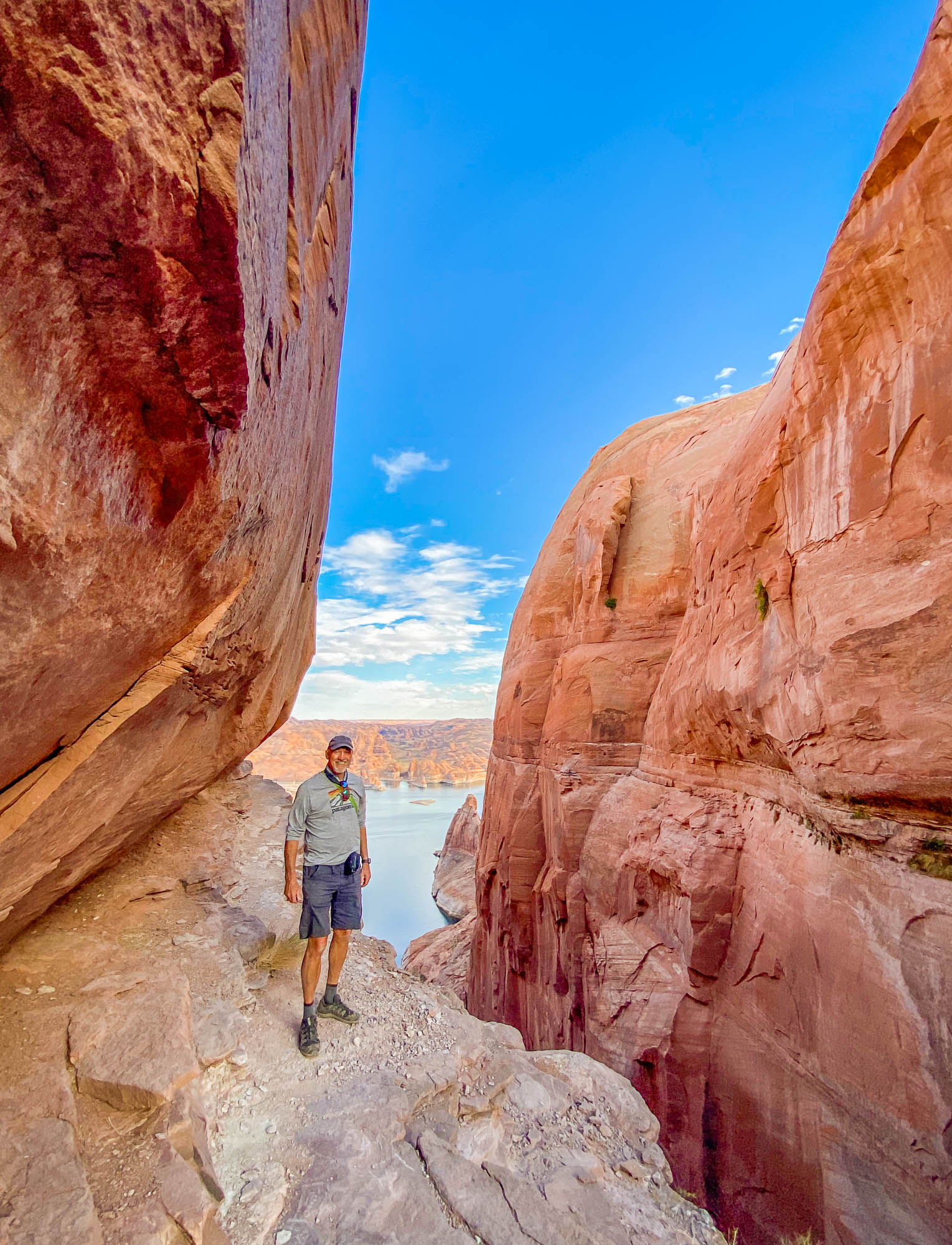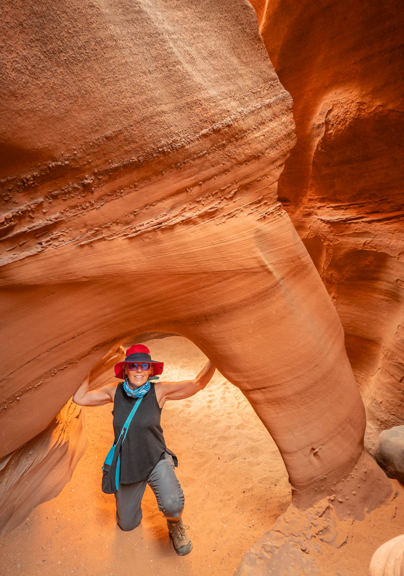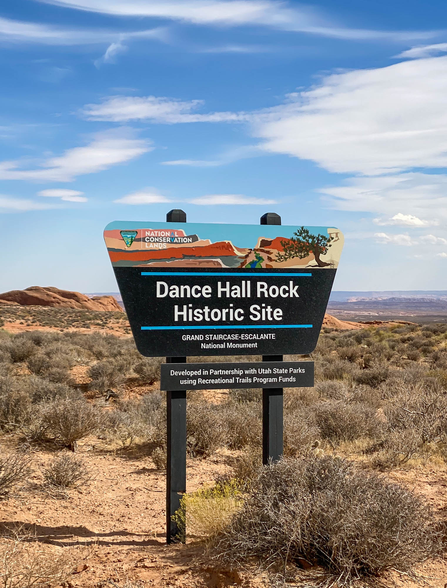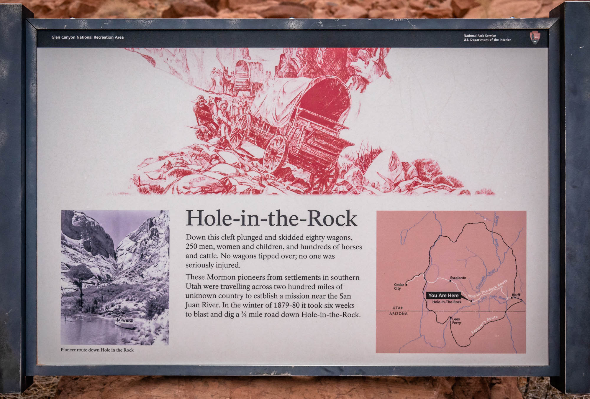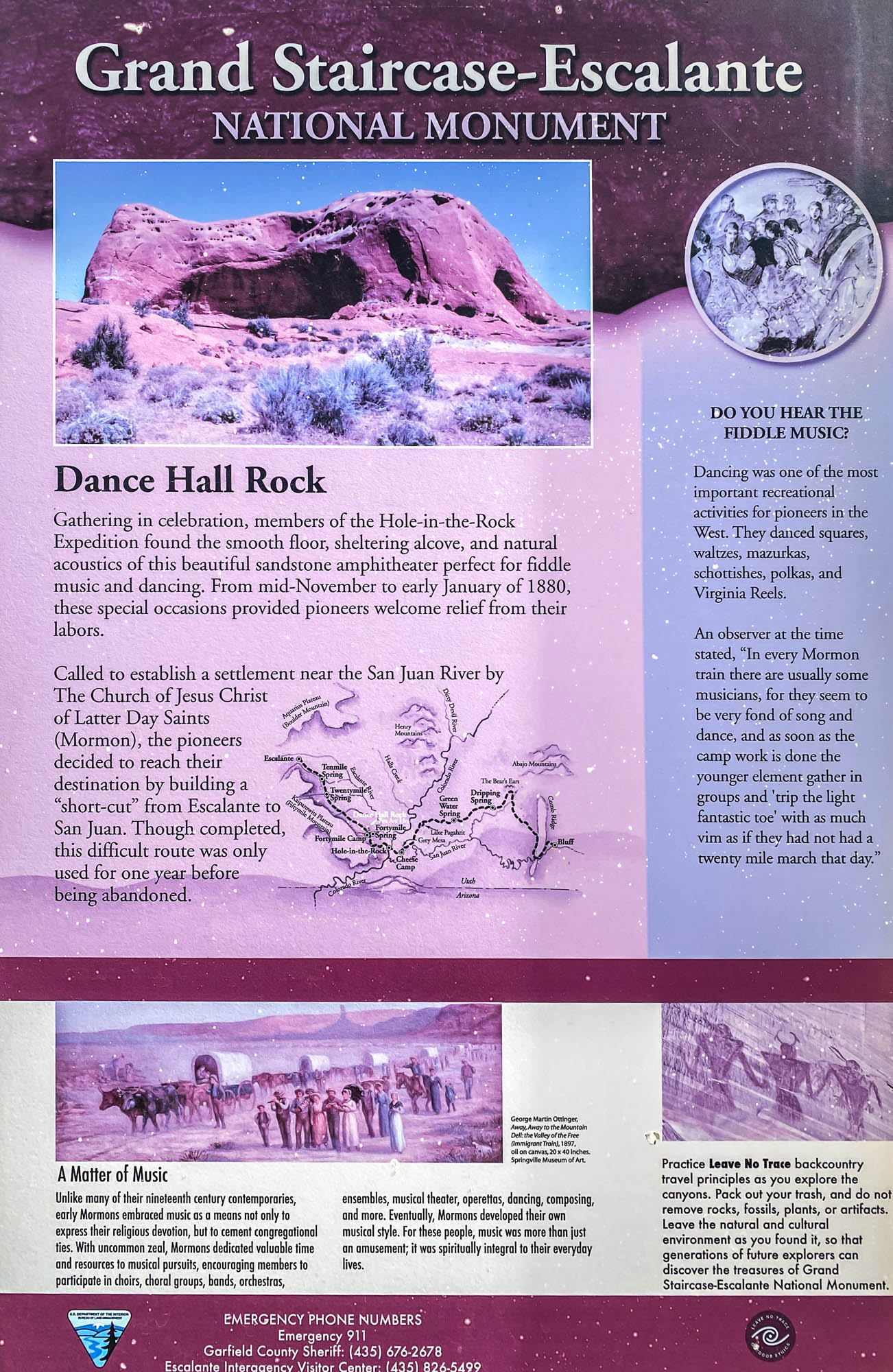 The Hole-in-the-Rock Trail is a historic 180-mile trail starting near the town of Escalante and ending in Bluff, Utah, located within the Grand Staircase-Escalante National Monument and the adjacent Glen Canyon National Recreation Area. It is named for the place where the San Juan Mission of Mormon Pioneers constructed a descent to the Colorado River in 1879-80, a geological feature called the Hole in the Rock. A modern unpaved road closely follows this historic trail to the point where it enters the Glen Canyon National Recreation Area. We drove the entire length of the Hole in the Rock Road, 60 miles, stopping at Peek-a-boo and Spooky slot canyons, and Dance Hall Rock before reaching the Hole in the Rock where we descended down the natural crevice on the 1,000 foot cliff to Lake Powell. Dance Hall Rock was an important staging area for the Mormon pioneers, while scouts looked for a viable route to their destination. They stayed here for months while the scouts drilled and blasted their way down the Hole in the Rock. They held square dances in the large sandstone formation shaped like an amphitheater, to keep their spirits high as they waited.