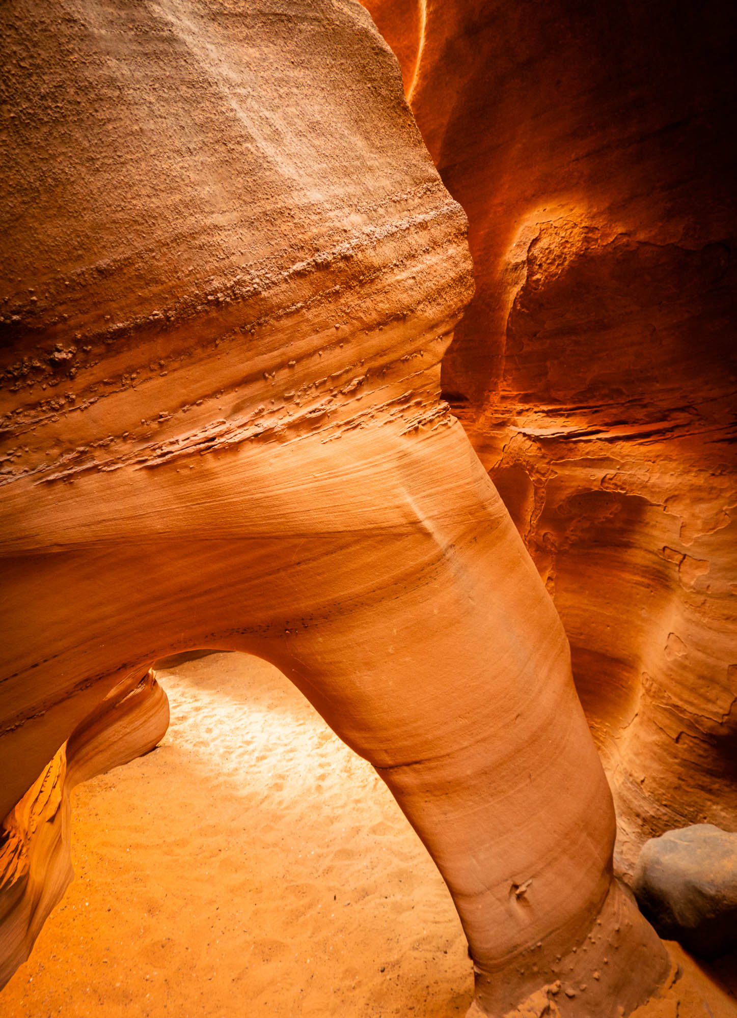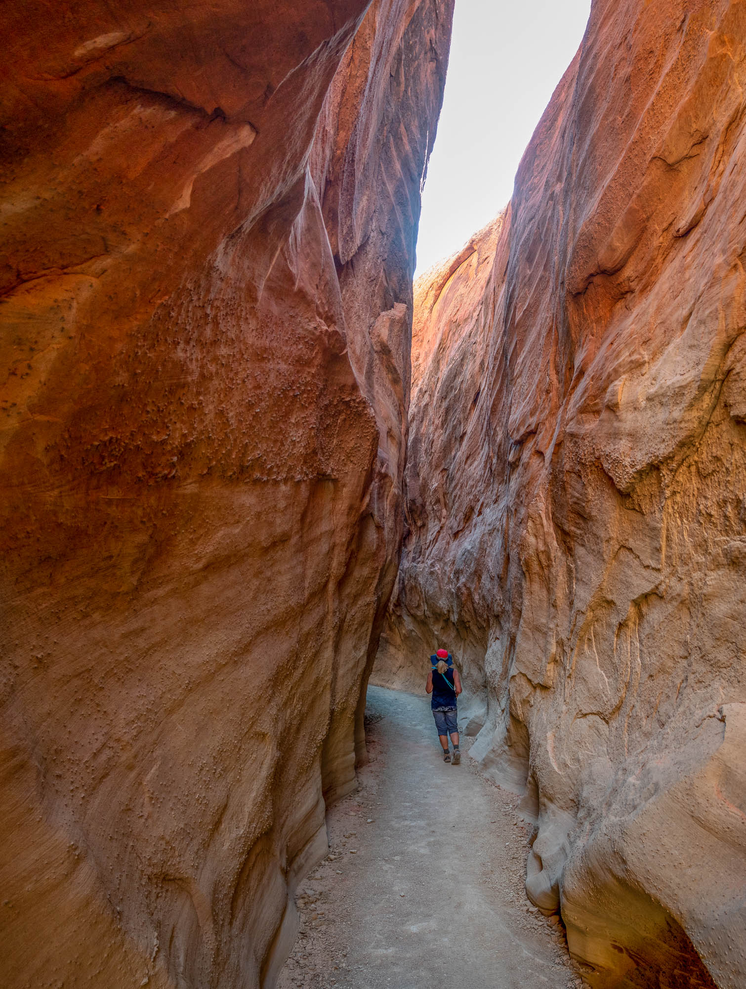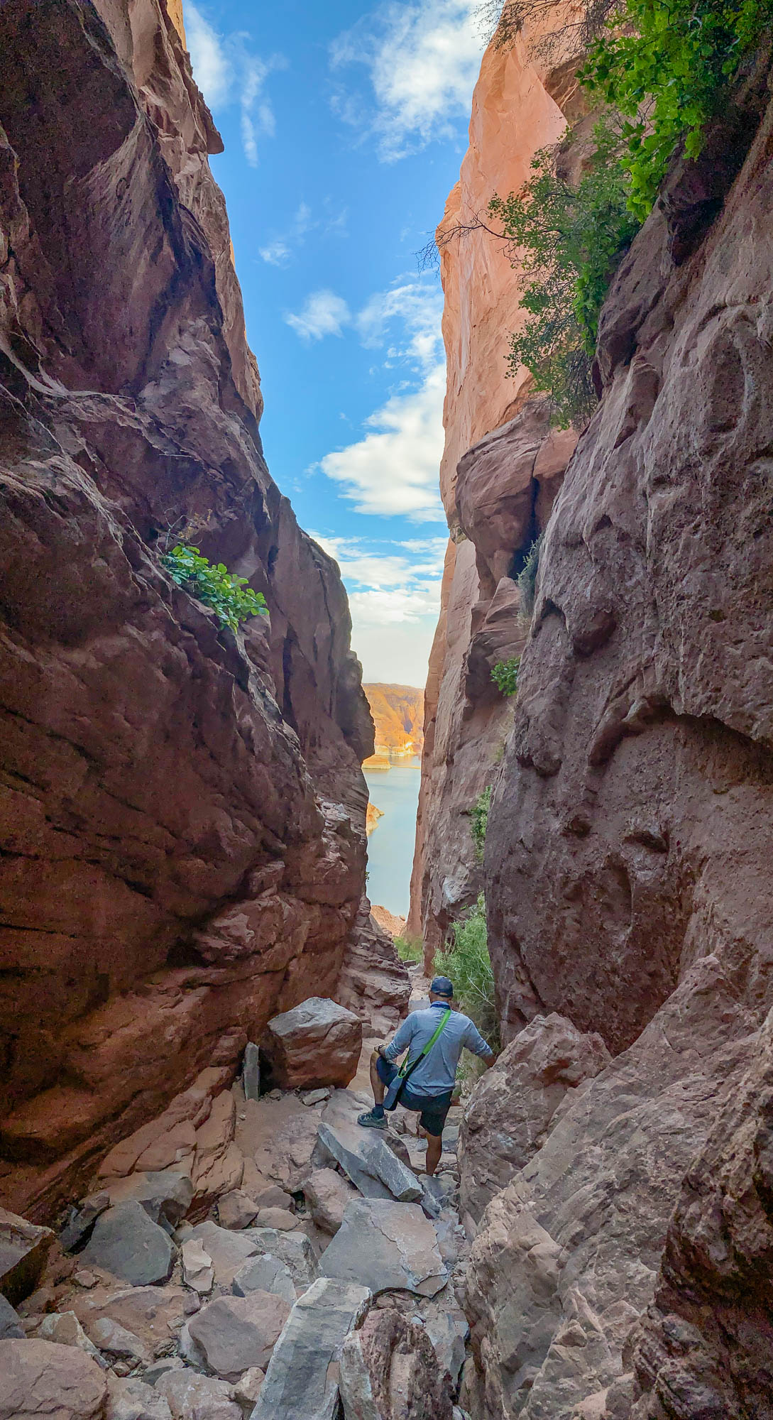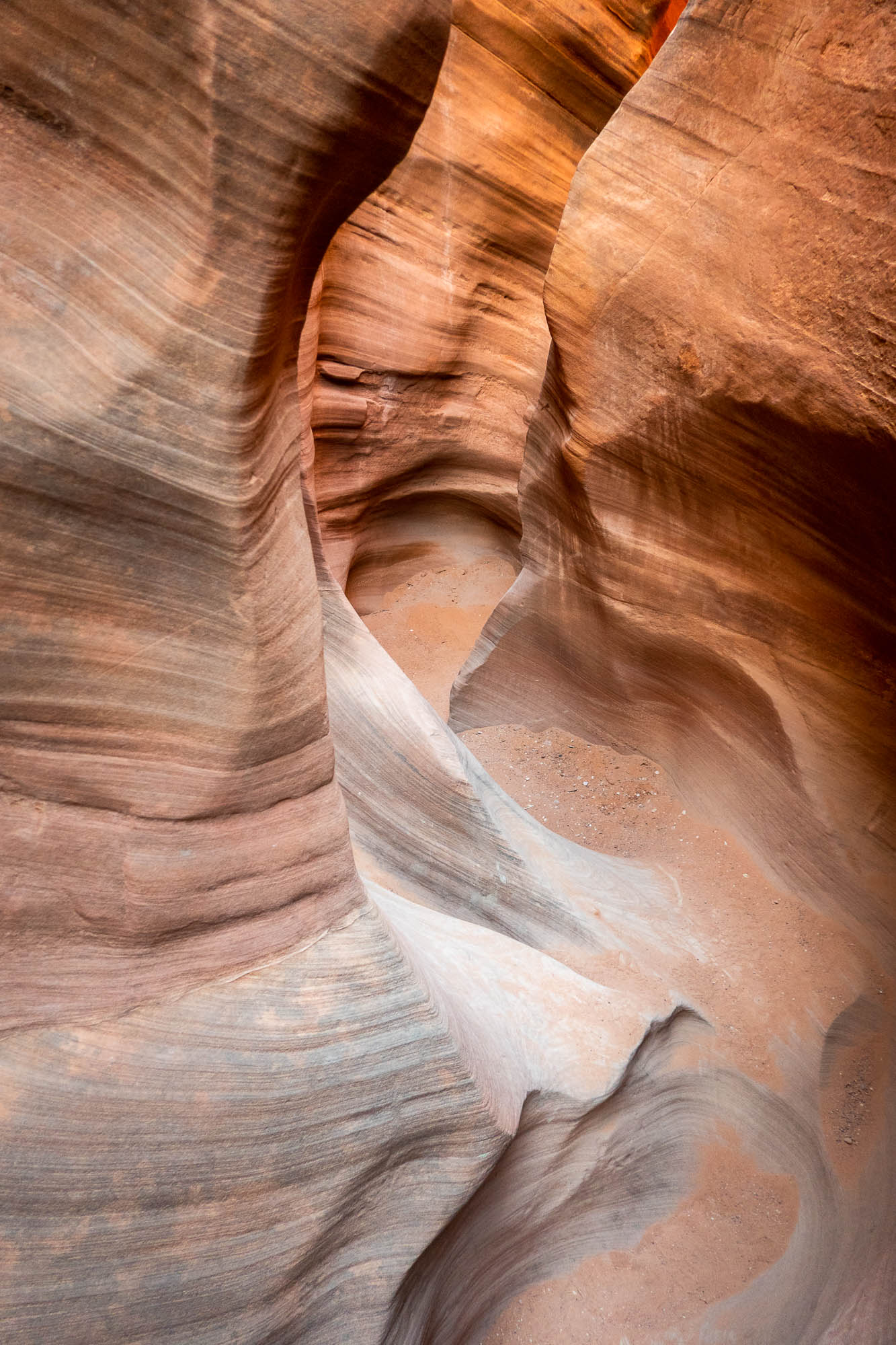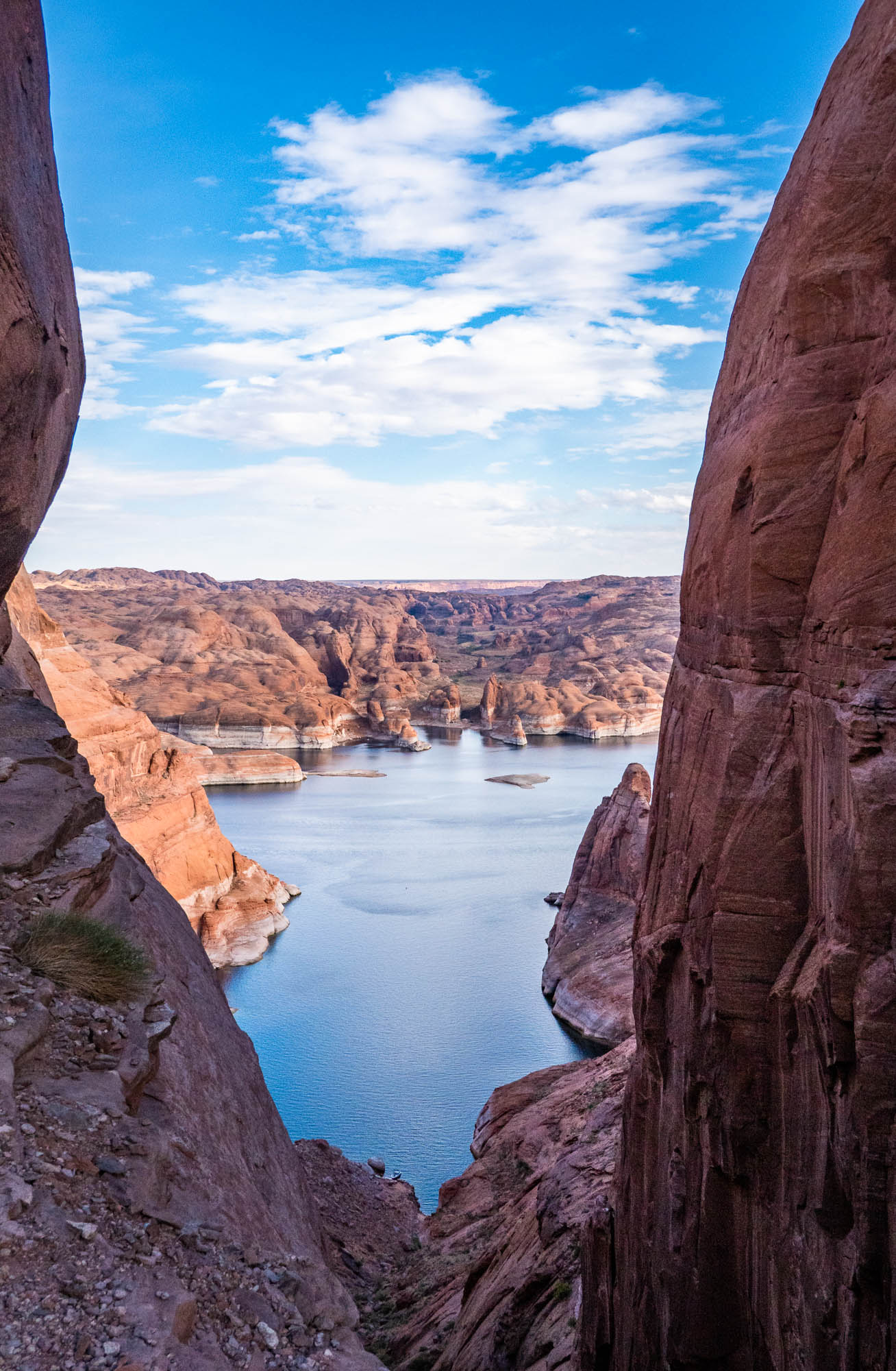 The Hole-in-the-Rock Trail is a historic 180-mile trail starting near the town of Escalante and ending in Bluff, Utah, located within the Grand Staircase-Escalante National Monument and the adjacent Glen Canyon National Recreation Area. It is named for the place where the San Juan Mission of Mormon Pioneers constructed a descent to the Colorado River in 1879-80, a geological feature called the Hole in the Rock. A modern unpaved road closely follows this historic trail to the point where it enters the Glen Canyon National Recreation Area. We drove the entire length of the Hole in the Rock Road, 60 miles, stopping at Peek-a-boo and Spooky slot canyons, and Dance Hall Rock before reaching the Hole in the Rock where we descended down the natural crevice on the 1,000 foot cliff to Lake Powell. Dance Hall Rock was an important staging area for the Mormon pioneers, while scouts looked for a viable route to their destination. They stayed here for months while the scouts drilled and blasted their way down the Hole in the Rock. They held square dances in the large sandstone formation shaped like an amphitheater, to keep their spirits high as they waited.
