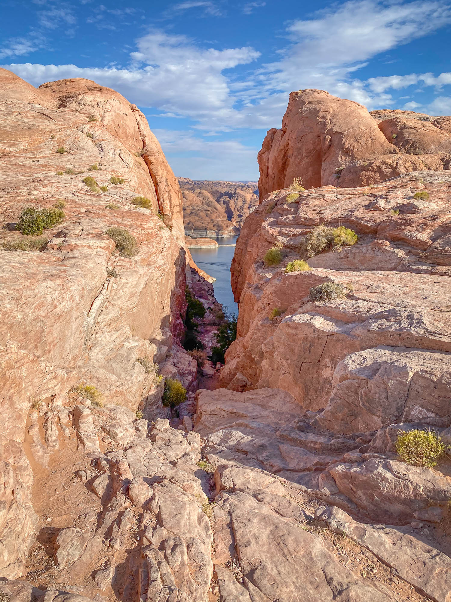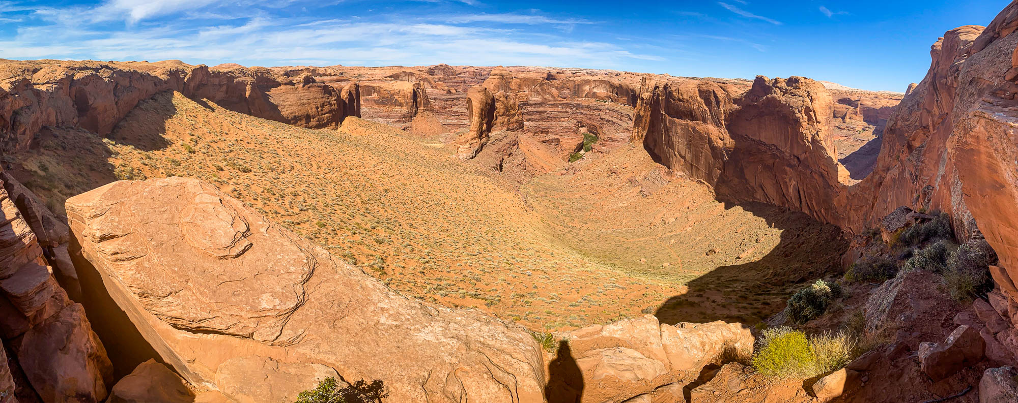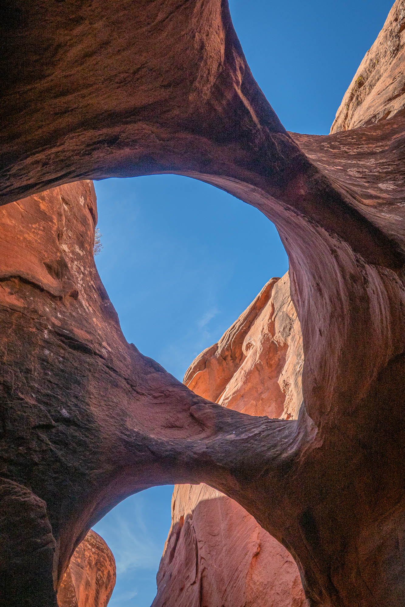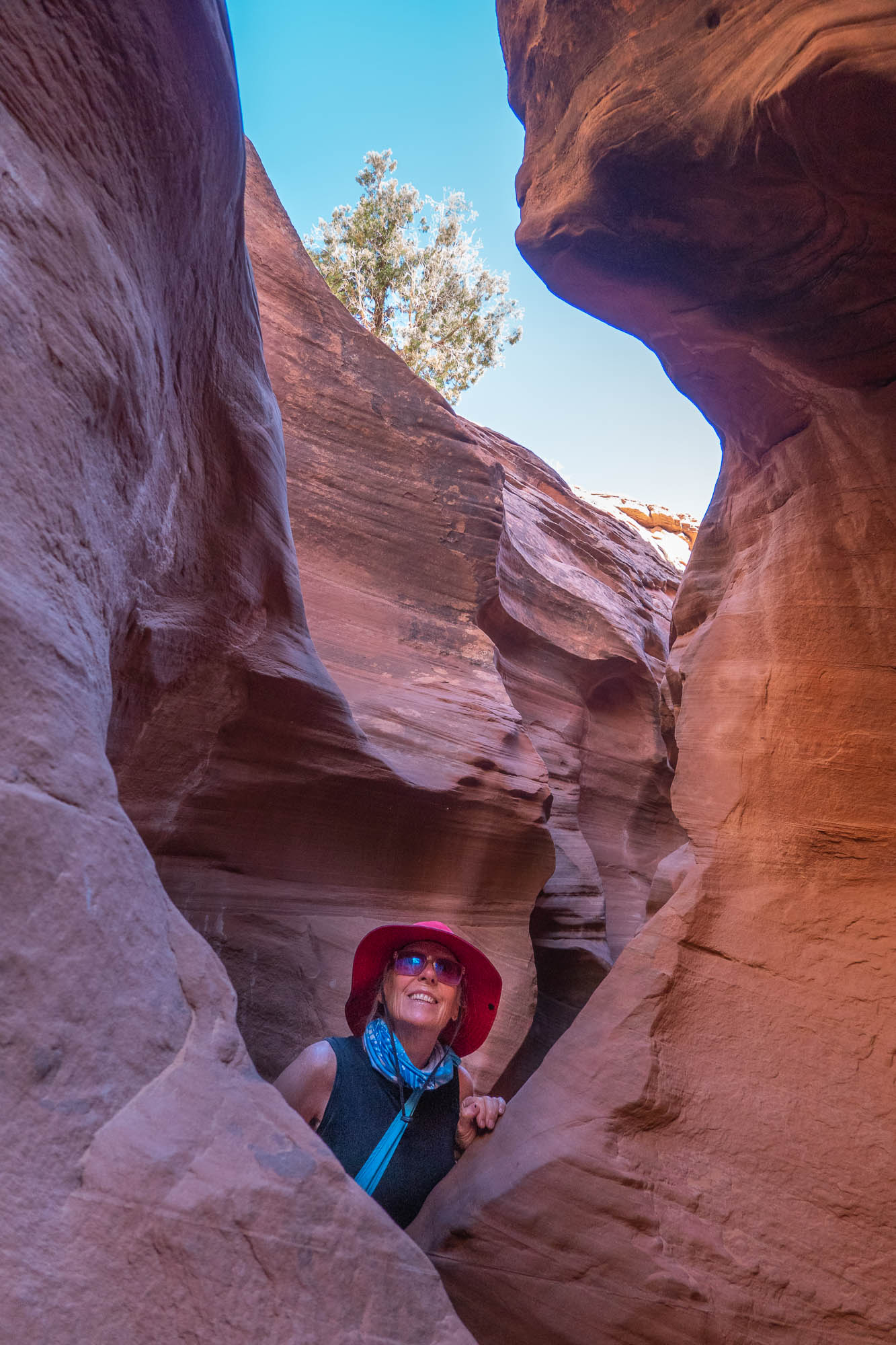 The Hole-in-the-Rock Trail is a historic 180-mile trail starting near the town of Escalante and ending in Bluff, Utah, located within the Grand Staircase-Escalante National Monument and the adjacent Glen Canyon National Recreation Area. It is named for the place where the San Juan Mission of Mormon Pioneers constructed a descent to the Colorado River in 1879-80, a geological feature called the Hole in the Rock. A modern unpaved road closely follows this historic trail to the point where it enters the Glen Canyon National Recreation Area. We drove the entire length of the Hole in the Rock Road, 60 miles, stopping at Peek-a-boo and Spooky slot canyons, and Dance Hall Rock before reaching the Hole in the Rock where we descended down the natural crevice on the 1,000 foot cliff to Lake Powell. Dance Hall Rock was an important staging area for the Mormon pioneers, while scouts looked for a viable route to their destination. They stayed here for months while the scouts drilled and blasted their way down the Hole in the Rock. They held square dances in the large sandstone formation shaped like an amphitheater, to keep their spirits high as they waited.