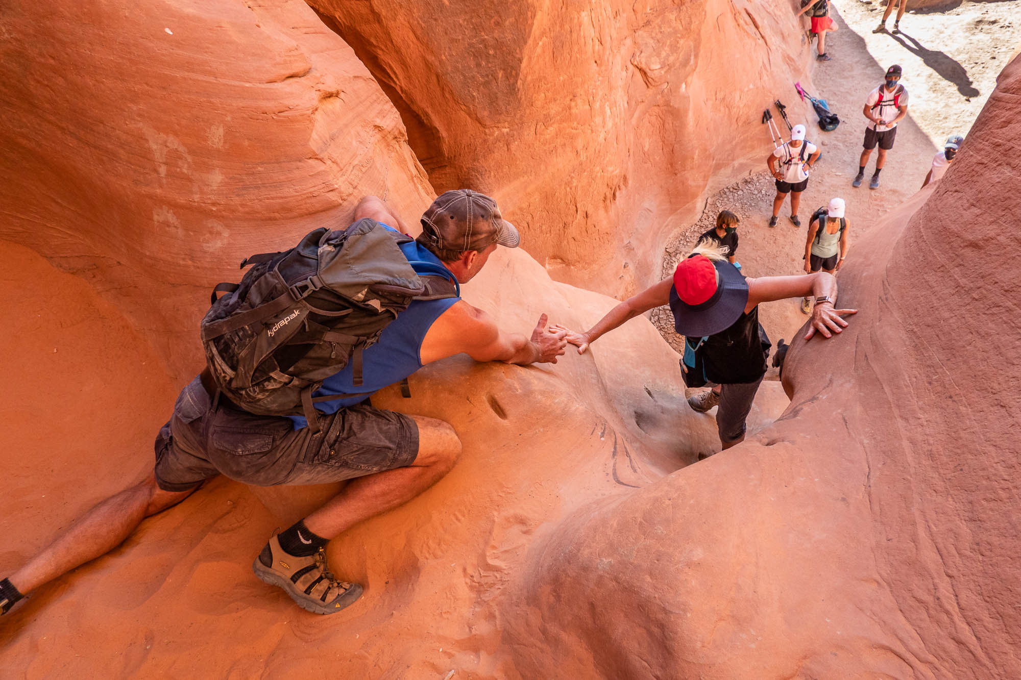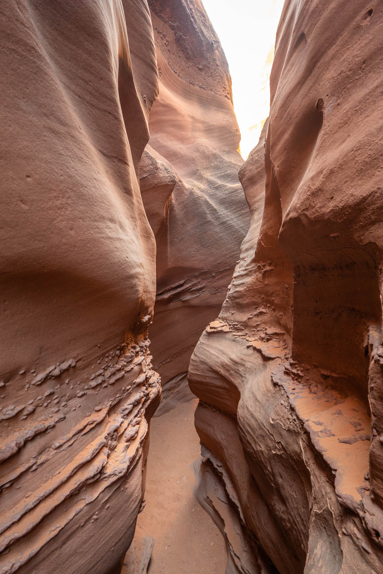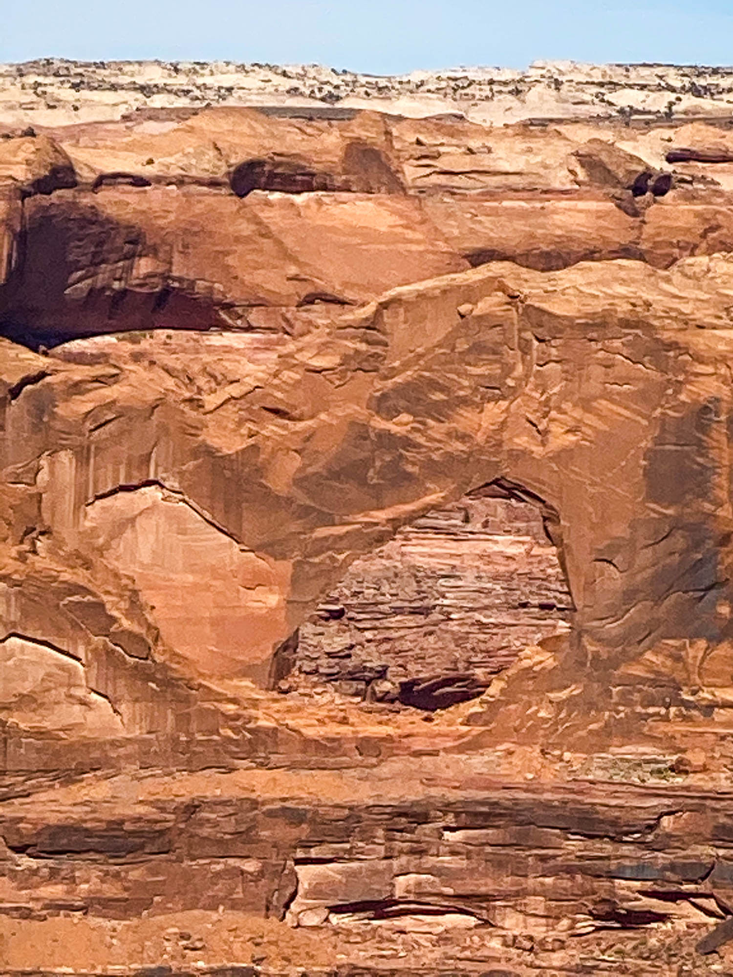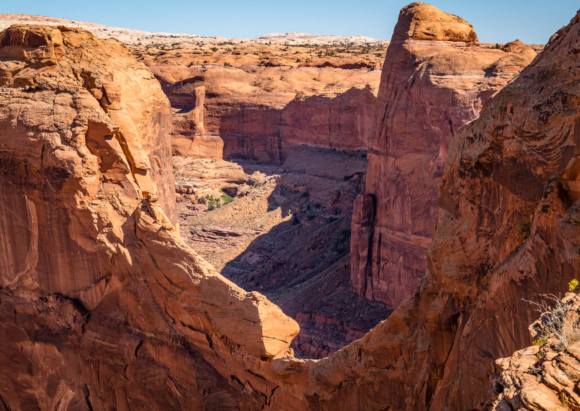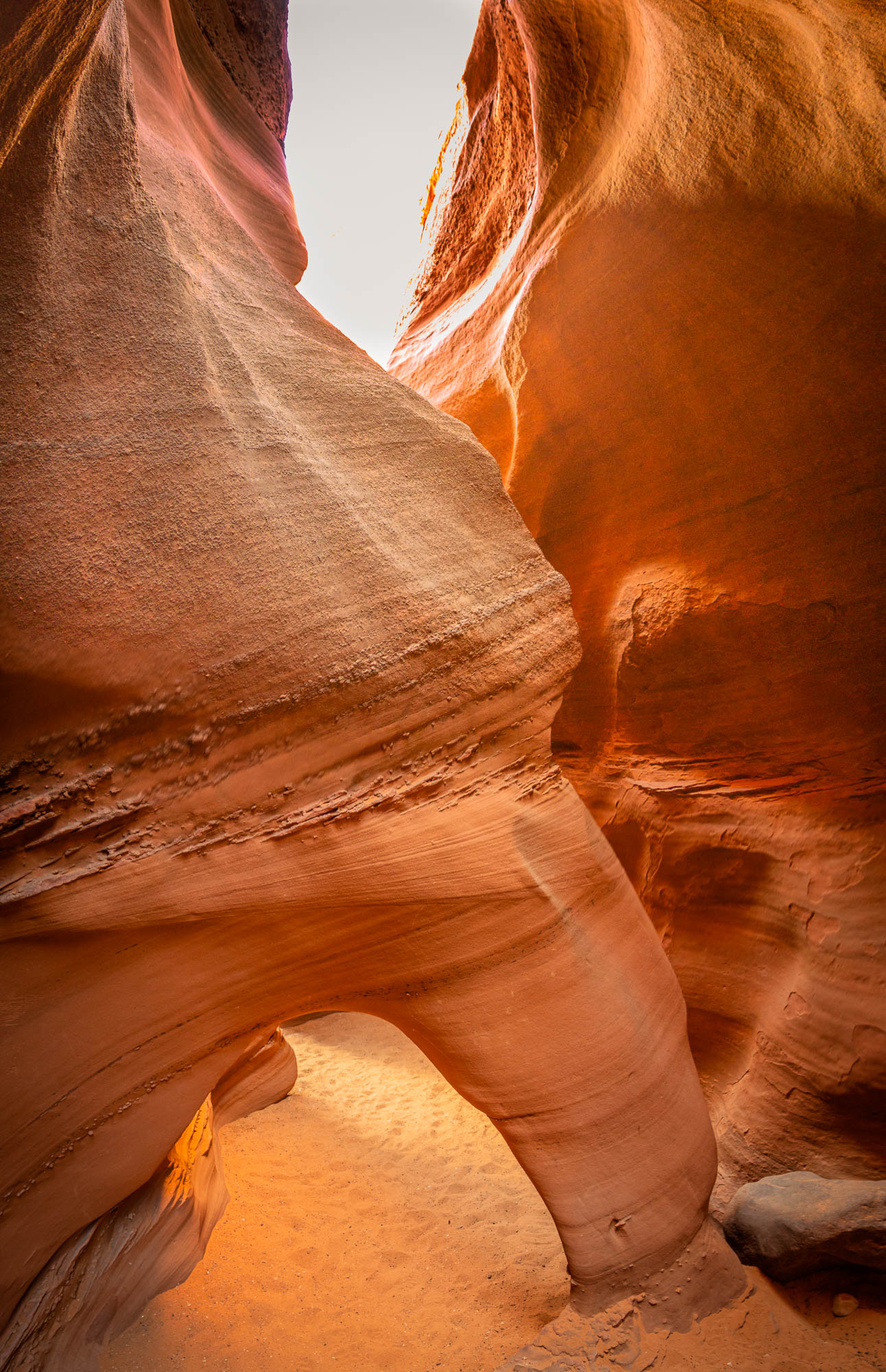 The Hole-in-the-Rock Trail is a historic 180-mile trail starting near the town of Escalante and ending in Bluff, Utah, located within the Grand Staircase-Escalante National Monument and the adjacent Glen Canyon National Recreation Area. It is named for the place where the San Juan Mission of Mormon Pioneers constructed a descent to the Colorado River in 1879-80, a geological feature called the Hole in the Rock. A modern unpaved road closely follows this historic trail to the point where it enters the Glen Canyon National Recreation Area. We drove the entire length of the Hole in the Rock Road, 60 miles, stopping at Peek-a-boo and Spooky slot canyons, and Dance Hall Rock before reaching the Hole in the Rock where we descended down the natural crevice on the 1,000 foot cliff to Lake Powell. Dance Hall Rock was an important staging area for the Mormon pioneers, while scouts looked for a viable route to their destination. They stayed here for months while the scouts drilled and blasted their way down the Hole in the Rock. They held square dances in the large sandstone formation shaped like an amphitheater, to keep their spirits high as they waited.