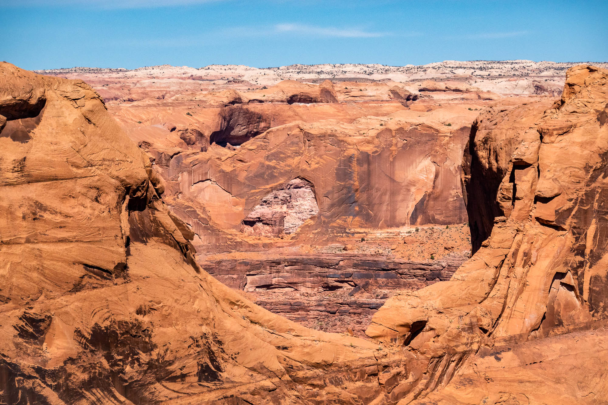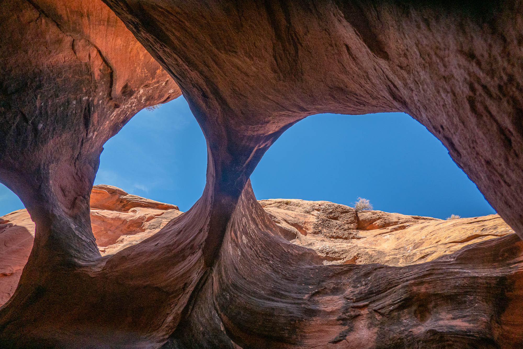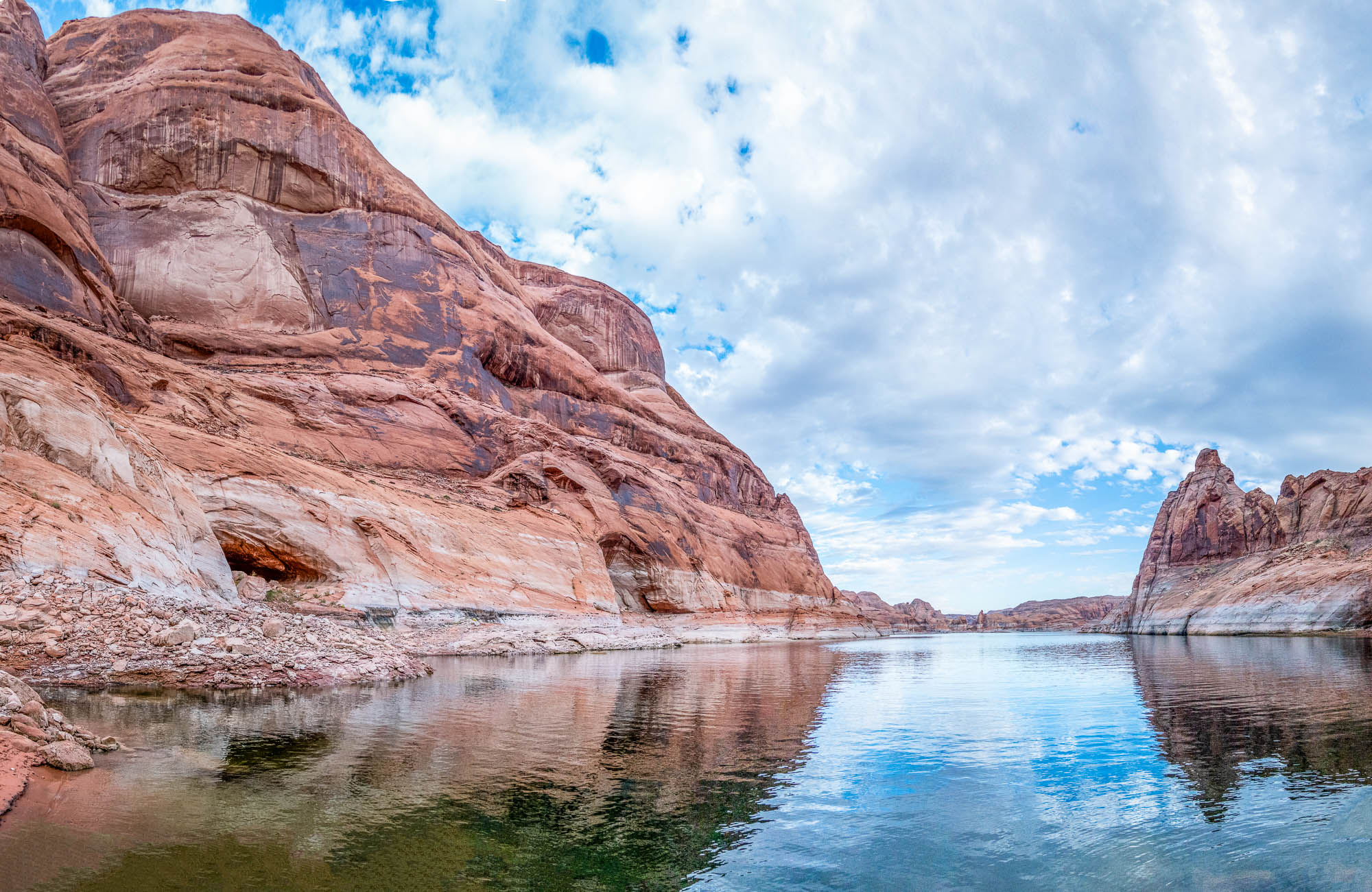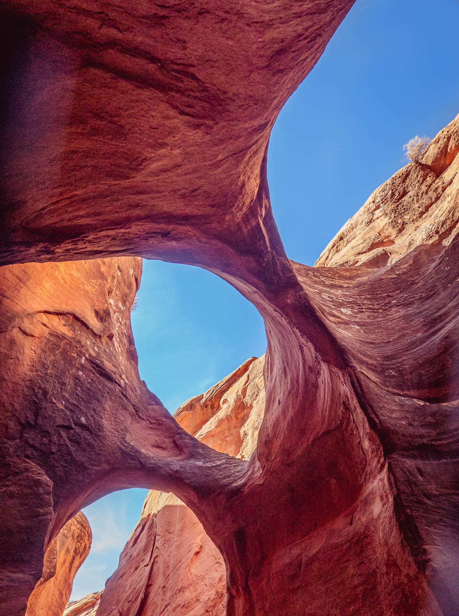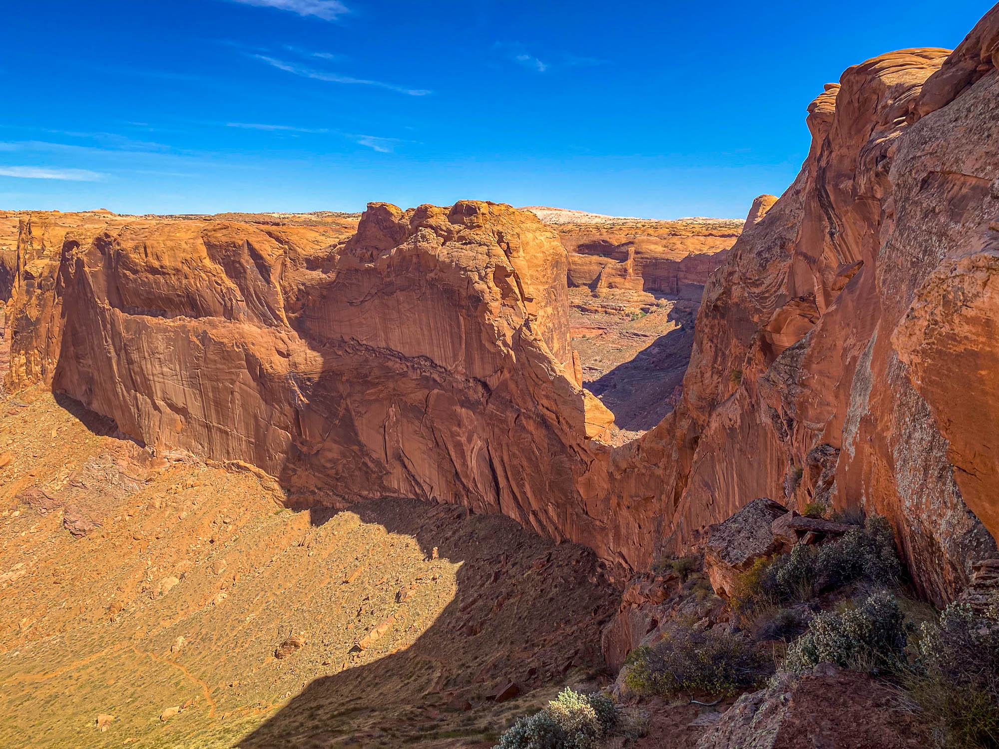 The Hole-in-the-Rock Trail is a historic 180-mile trail starting near the town of Escalante and ending in Bluff, Utah, located within the Grand Staircase-Escalante National Monument and the adjacent Glen Canyon National Recreation Area. It is named for the place where the San Juan Mission of Mormon Pioneers constructed a descent to the Colorado River in 1879-80, a geological feature called the Hole in the Rock. A modern unpaved road closely follows this historic trail to the point where it enters the Glen Canyon National Recreation Area. We drove the entire length of the Hole in the Rock Road, 60 miles, stopping at Peek-a-boo and Spooky slot canyons, and Dance Hall Rock before reaching the Hole in the Rock where we descended down the natural crevice on the 1,000 foot cliff to Lake Powell. Dance Hall Rock was an important staging area for the Mormon pioneers, while scouts looked for a viable route to their destination. They stayed here for months while the scouts drilled and blasted their way down the Hole in the Rock. They held square dances in the large sandstone formation shaped like an amphitheater, to keep their spirits high as they waited.