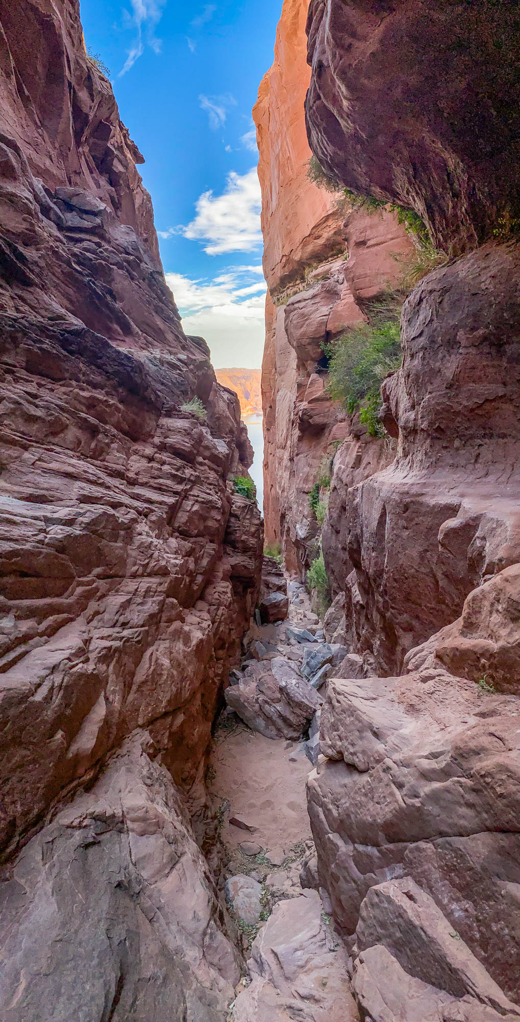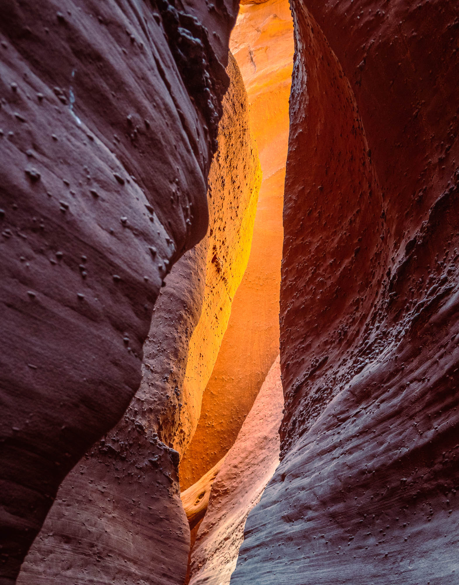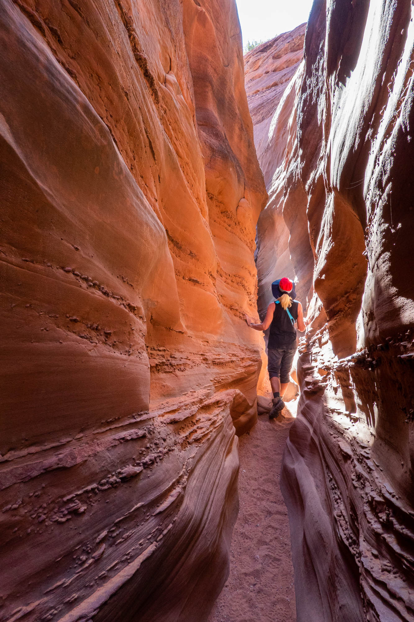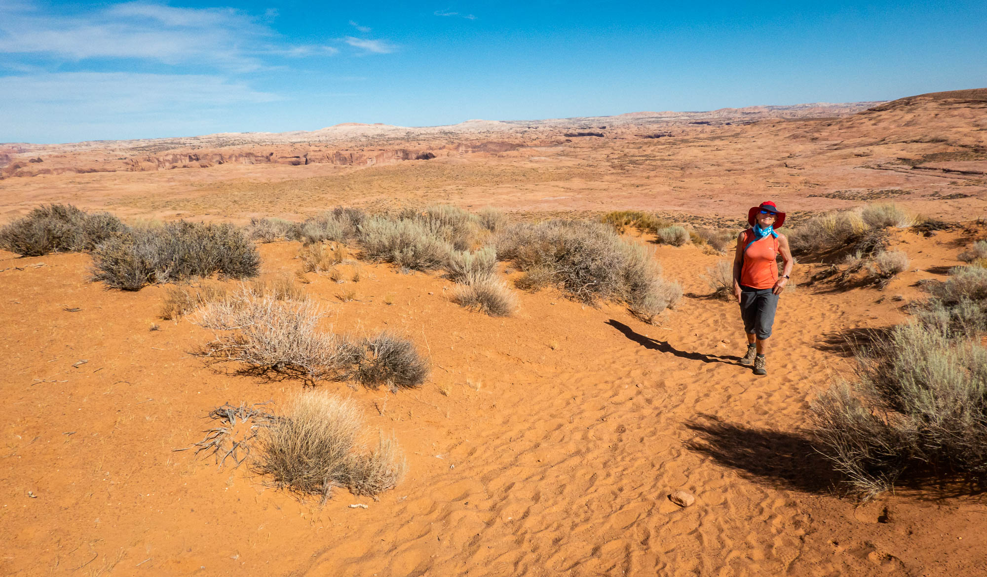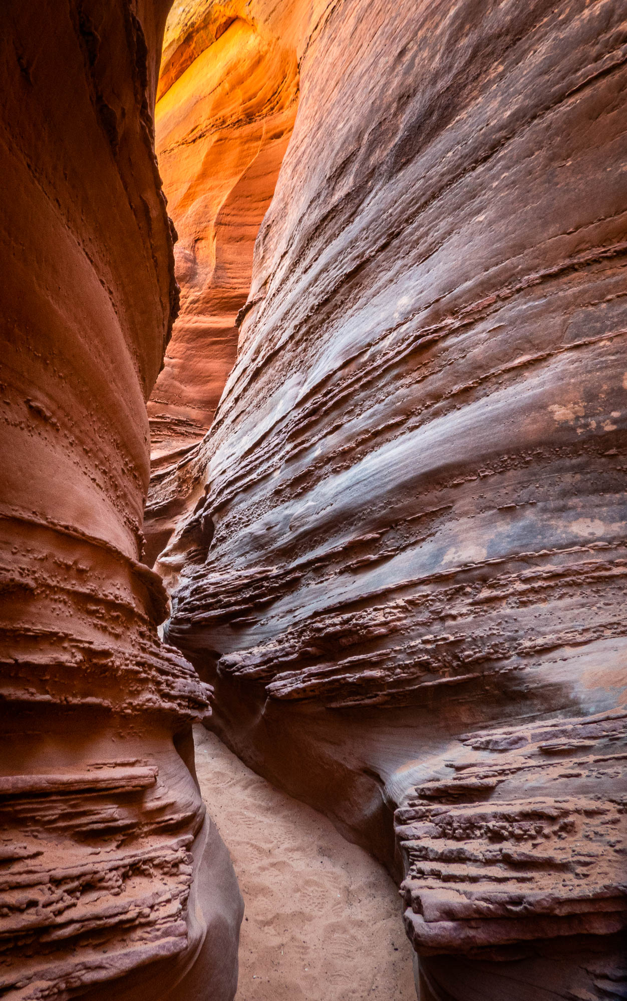 The Hole-in-the-Rock Trail is a historic 180-mile trail starting near the town of Escalante and ending in Bluff, Utah, located within the Grand Staircase-Escalante National Monument and the adjacent Glen Canyon National Recreation Area. It is named for the place where the San Juan Mission of Mormon Pioneers constructed a descent to the Colorado River in 1879-80, a geological feature called the Hole in the Rock. A modern unpaved road closely follows this historic trail to the point where it enters the Glen Canyon National Recreation Area. We drove the entire length of the Hole in the Rock Road, 60 miles, stopping at Peek-a-boo and Spooky slot canyons, and Dance Hall Rock before reaching the Hole in the Rock where we descended down the natural crevice on the 1,000 foot cliff to Lake Powell. Dance Hall Rock was an important staging area for the Mormon pioneers, while scouts looked for a viable route to their destination. They stayed here for months while the scouts drilled and blasted their way down the Hole in the Rock. They held square dances in the large sandstone formation shaped like an amphitheater, to keep their spirits high as they waited.