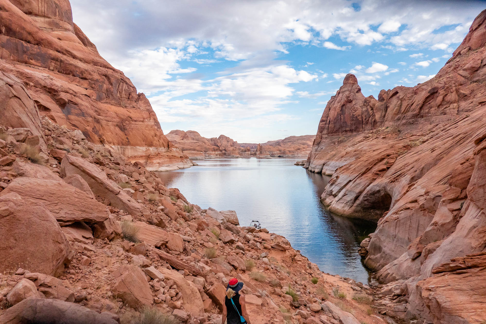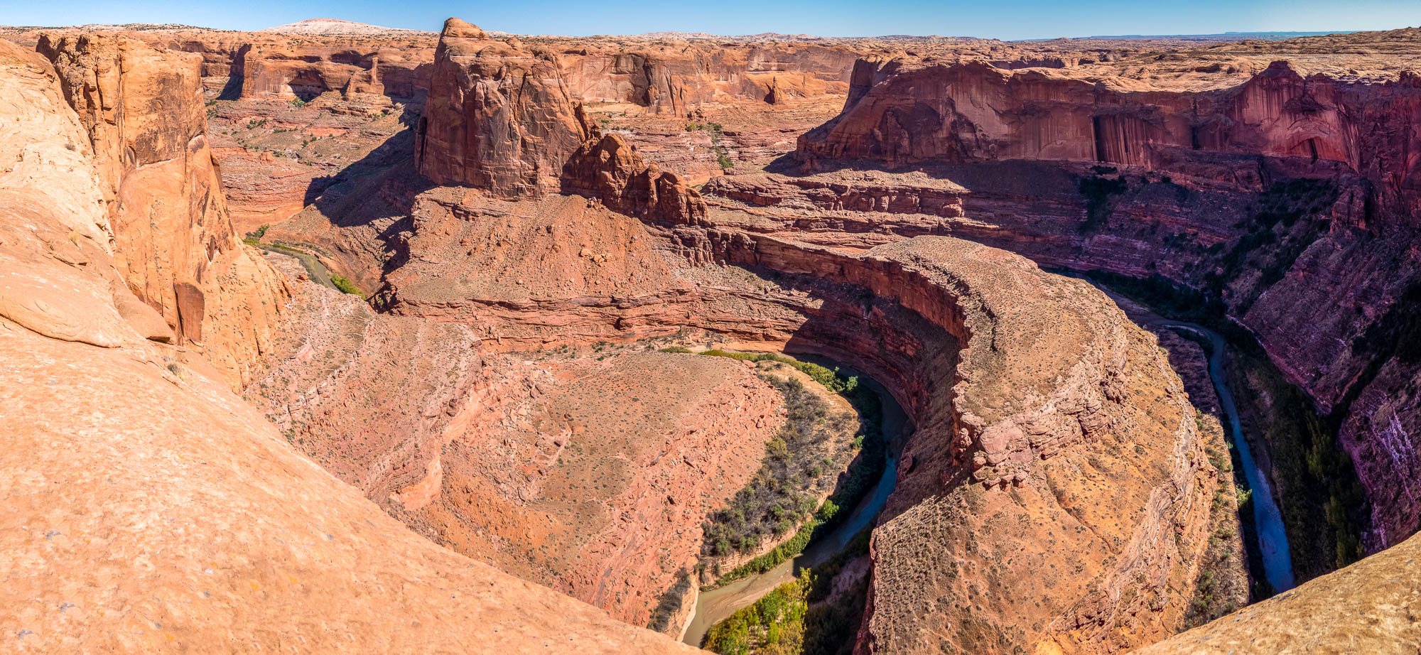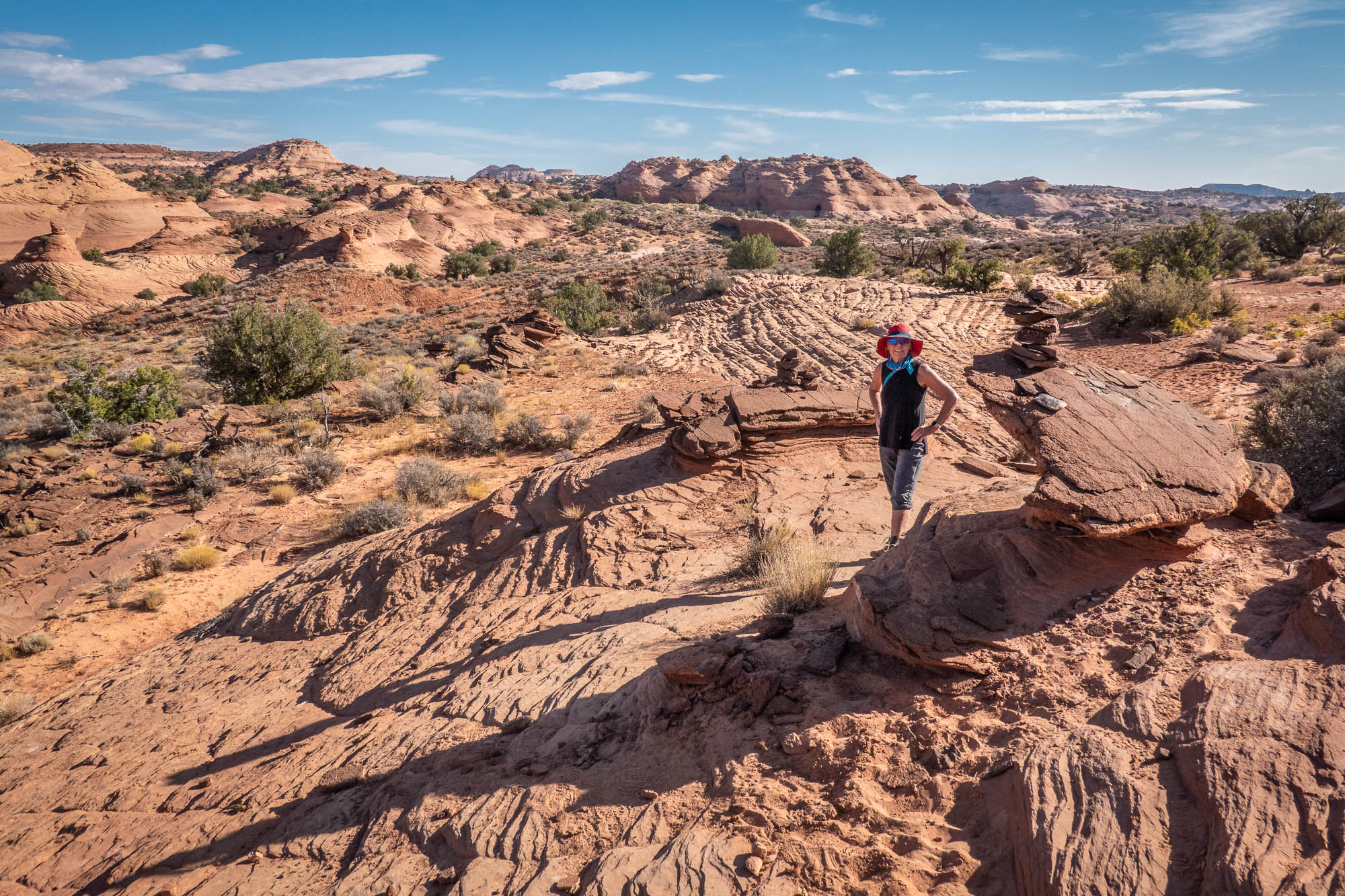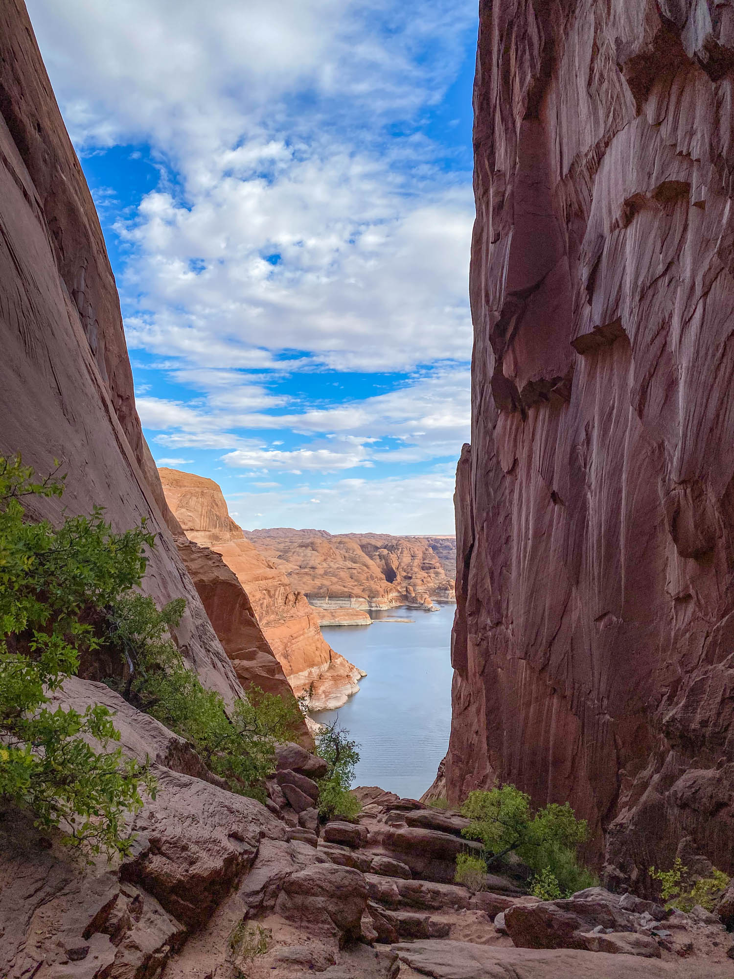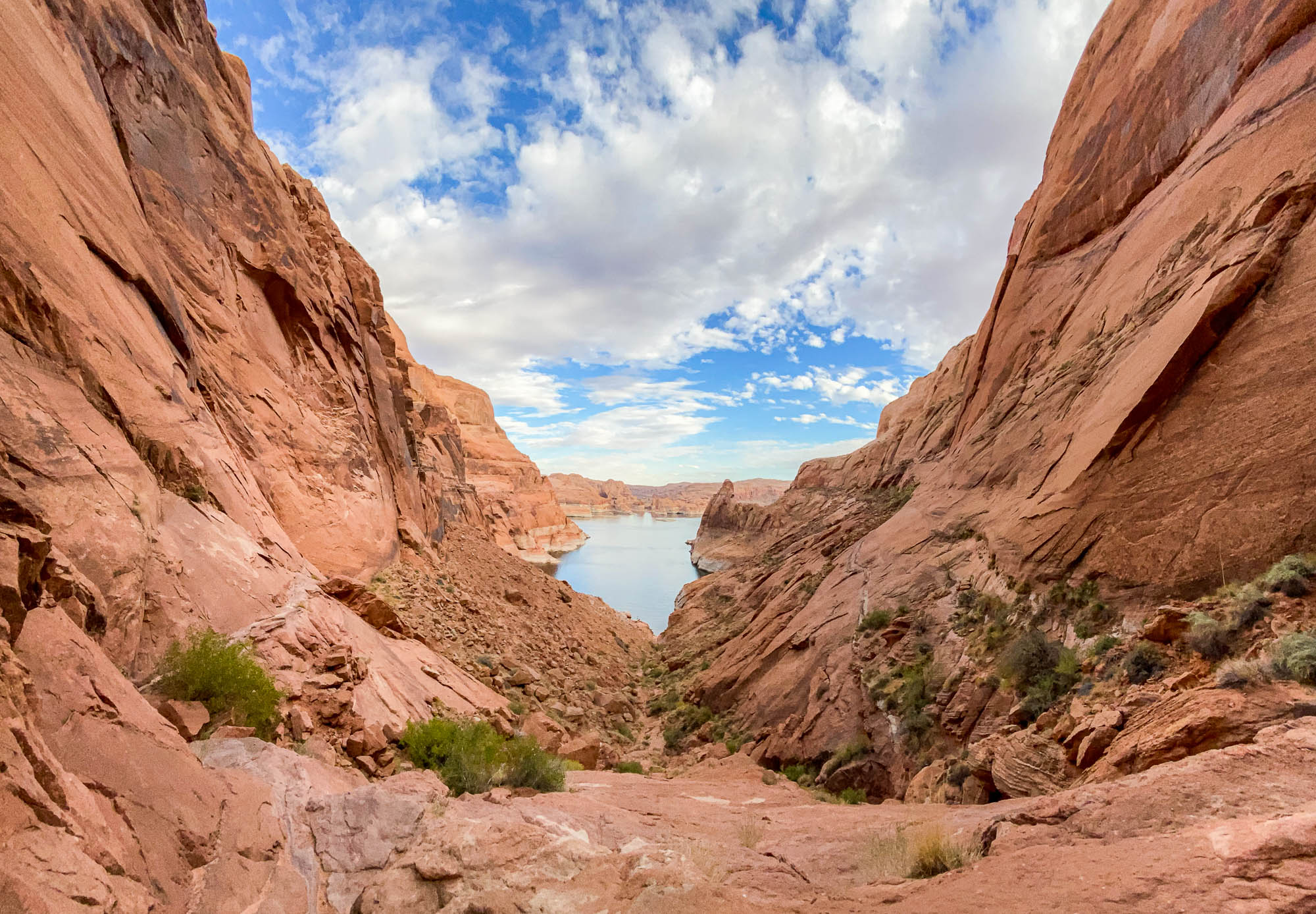 The Hole-in-the-Rock Trail is a historic 180-mile trail starting near the town of Escalante and ending in Bluff, Utah, located within the Grand Staircase-Escalante National Monument and the adjacent Glen Canyon National Recreation Area. It is named for the place where the San Juan Mission of Mormon Pioneers constructed a descent to the Colorado River in 1879-80, a geological feature called the Hole in the Rock. A modern unpaved road closely follows this historic trail to the point where it enters the Glen Canyon National Recreation Area. We drove the entire length of the Hole in the Rock Road, 60 miles, stopping at Peek-a-boo and Spooky slot canyons, and Dance Hall Rock before reaching the Hole in the Rock where we descended down the natural crevice on the 1,000 foot cliff to Lake Powell. Dance Hall Rock was an important staging area for the Mormon pioneers, while scouts looked for a viable route to their destination. They stayed here for months while the scouts drilled and blasted their way down the Hole in the Rock. They held square dances in the large sandstone formation shaped like an amphitheater, to keep their spirits high as they waited.