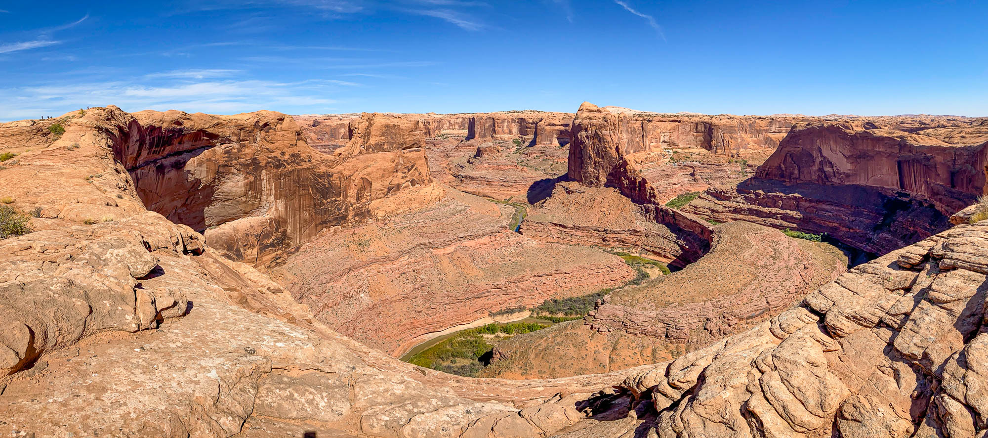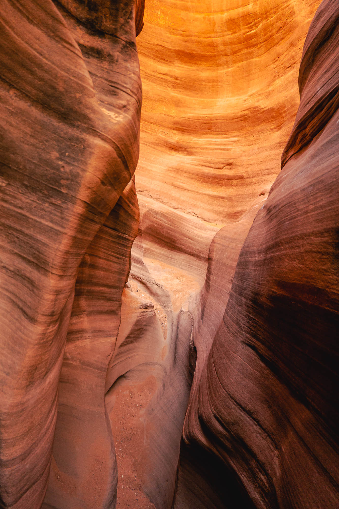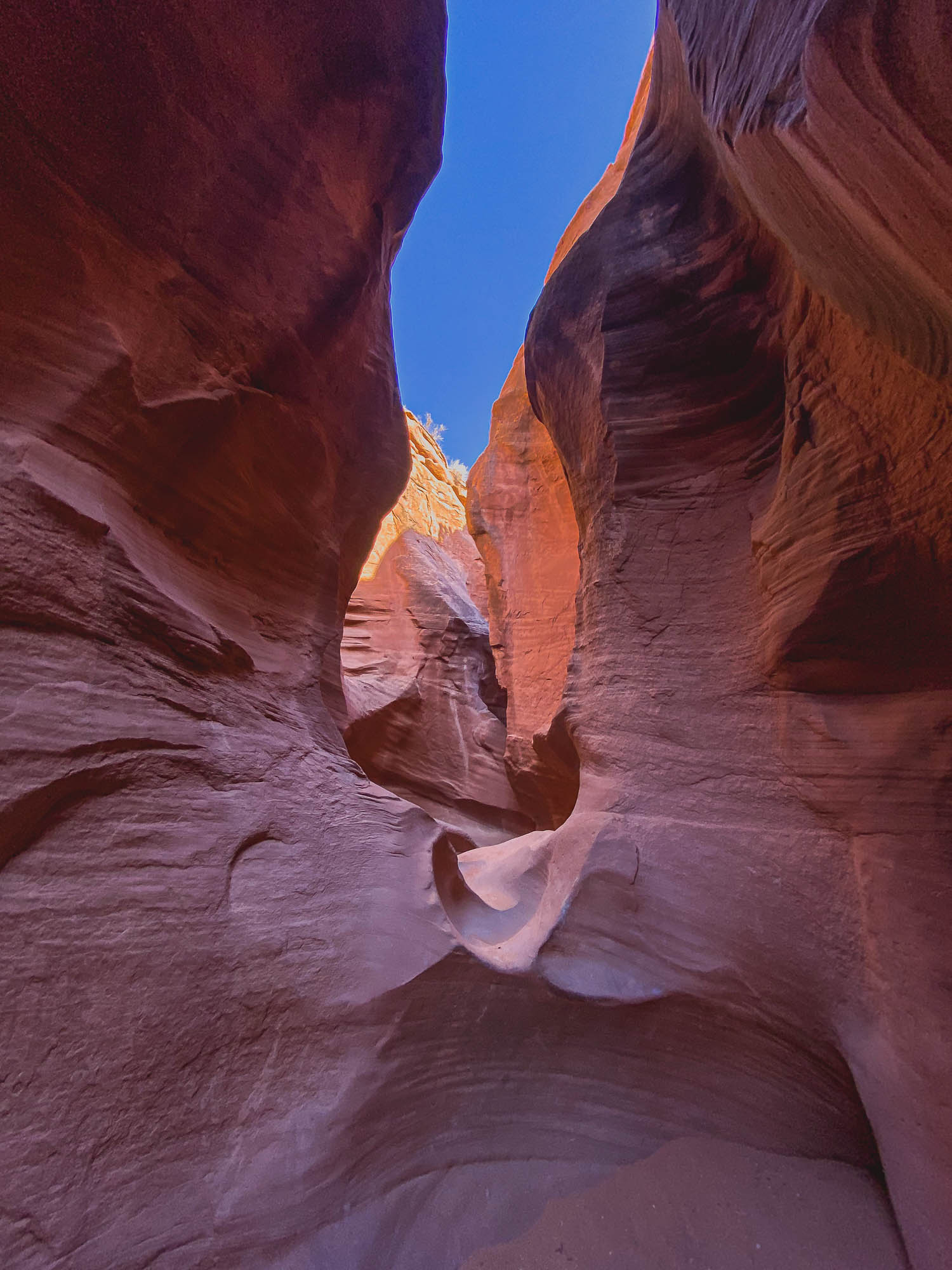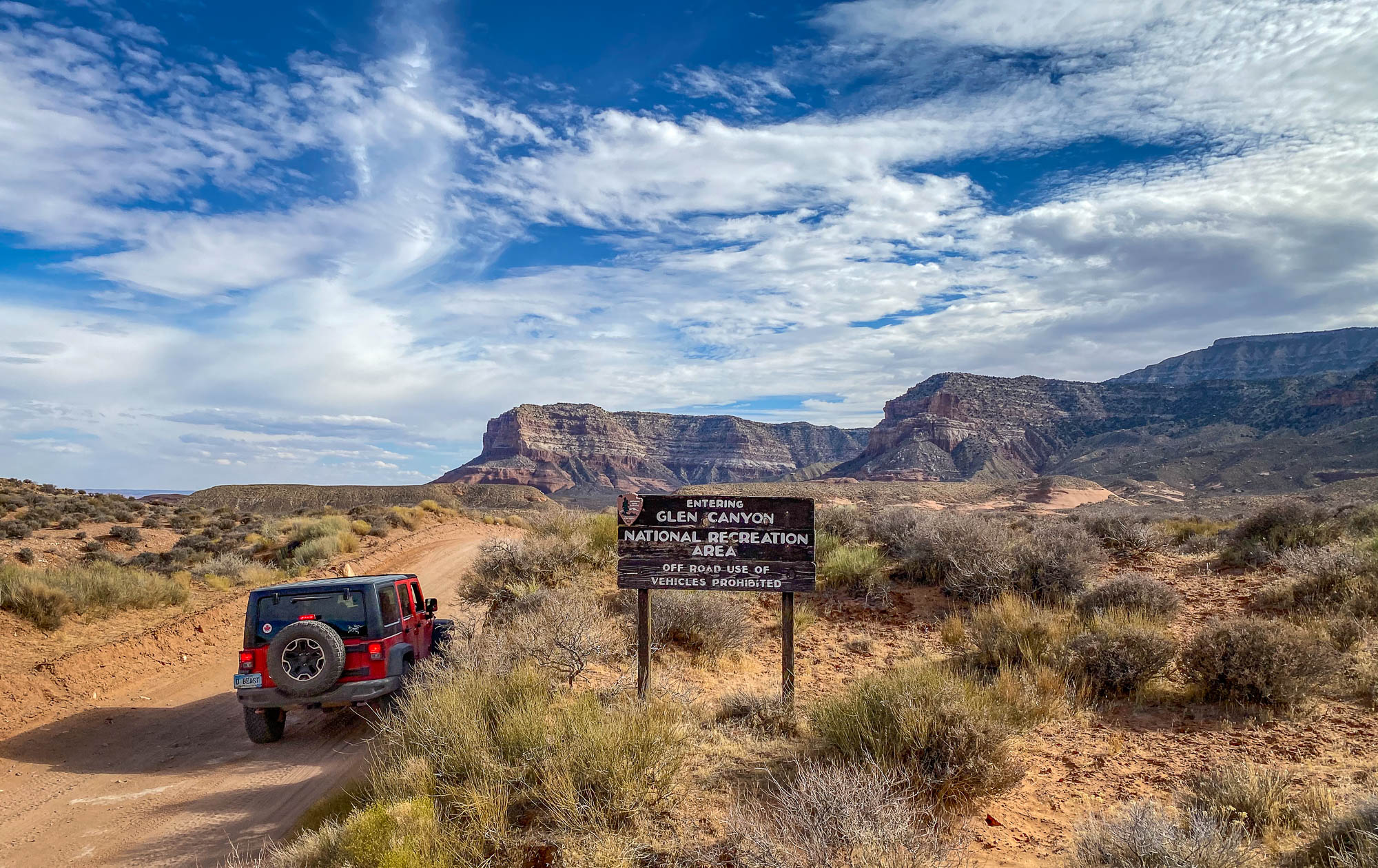 The Hole-in-the-Rock Trail is a historic 180-mile trail starting near the town of Escalante and ending in Bluff, Utah, located within the Grand Staircase-Escalante National Monument and the adjacent Glen Canyon National Recreation Area. It is named for the place where the San Juan Mission of Mormon Pioneers constructed a descent to the Colorado River in 1879-80, a geological feature called the Hole in the Rock. A modern unpaved road closely follows this historic trail to the point where it enters the Glen Canyon National Recreation Area. We drove the entire length of the Hole in the Rock Road, 60 miles, stopping at Peek-a-boo and Spooky slot canyons, and Dance Hall Rock before reaching the Hole in the Rock where we descended down the natural crevice on the 1,000 foot cliff to Lake Powell. Dance Hall Rock was an important staging area for the Mormon pioneers, while scouts looked for a viable route to their destination. They stayed here for months while the scouts drilled and blasted their way down the Hole in the Rock. They held square dances in the large sandstone formation shaped like an amphitheater, to keep their spirits high as they waited.