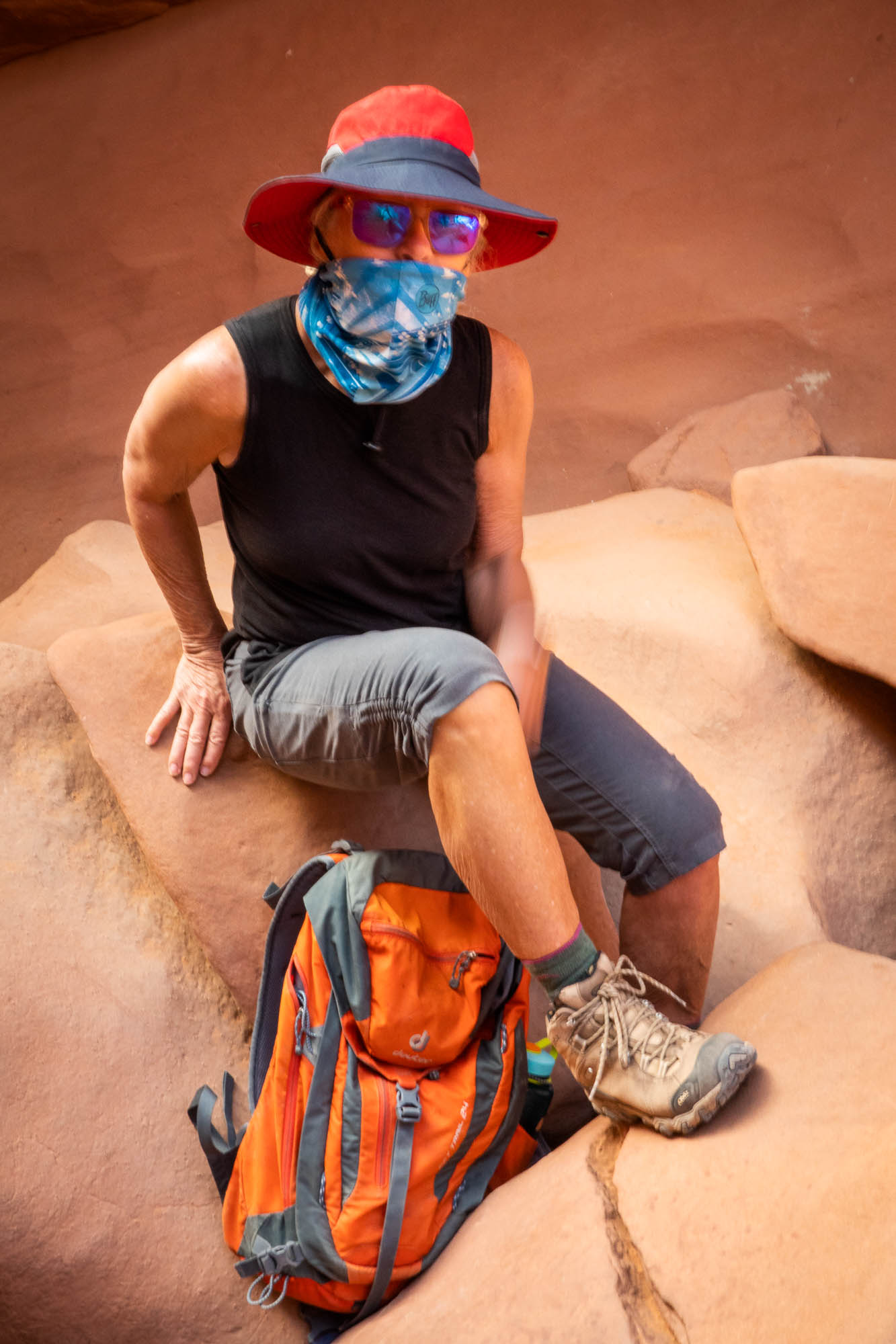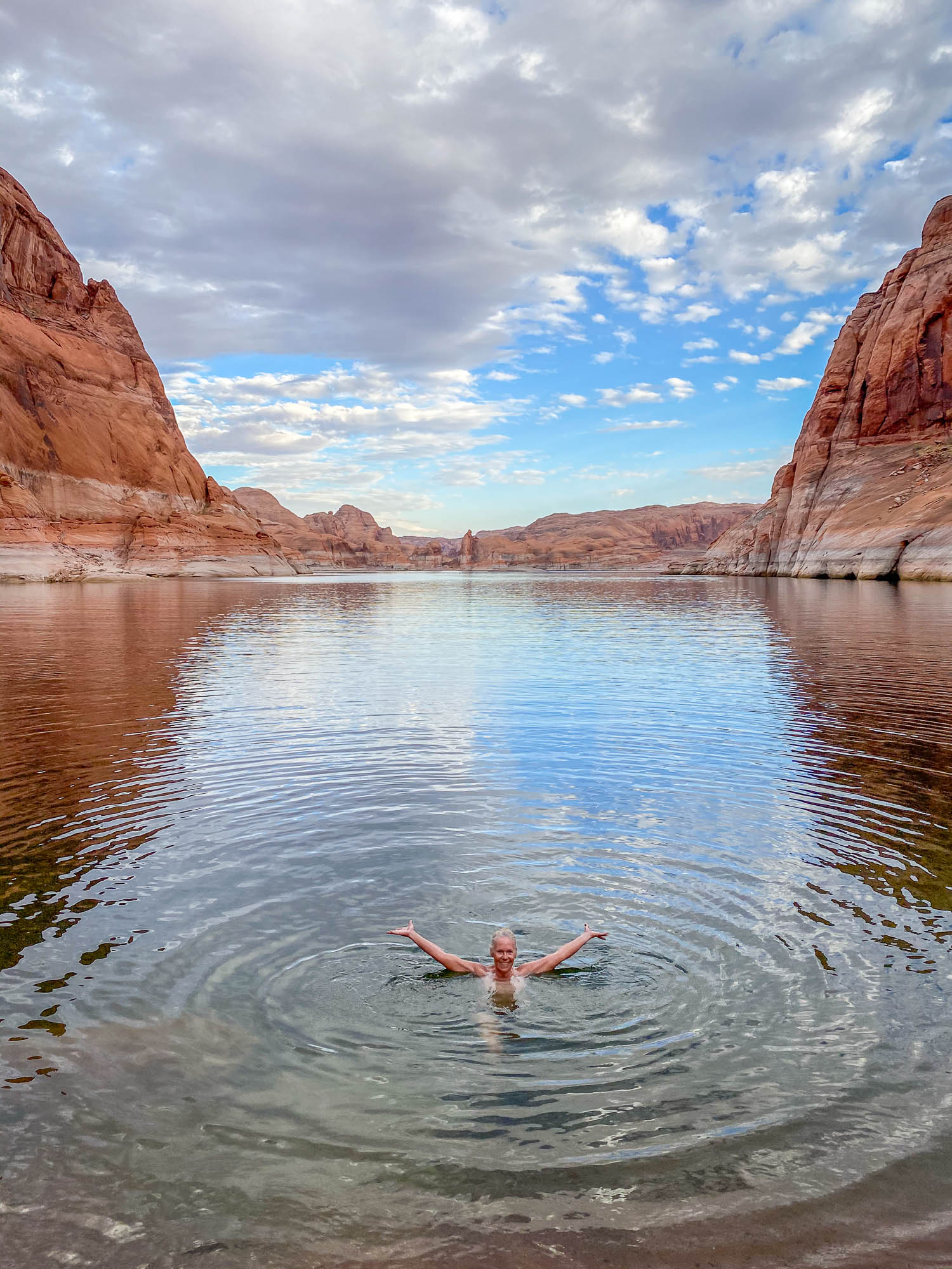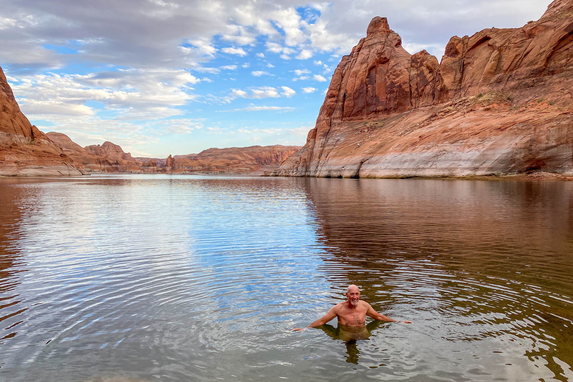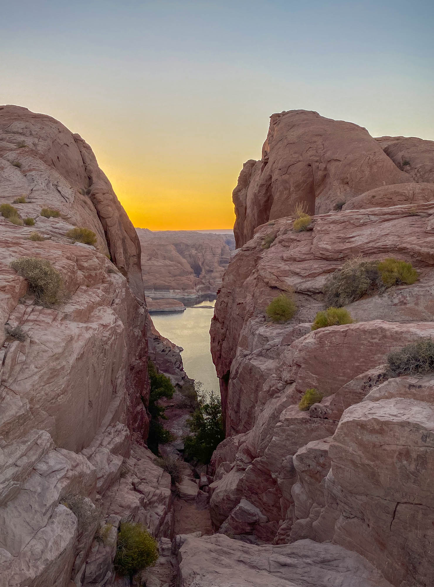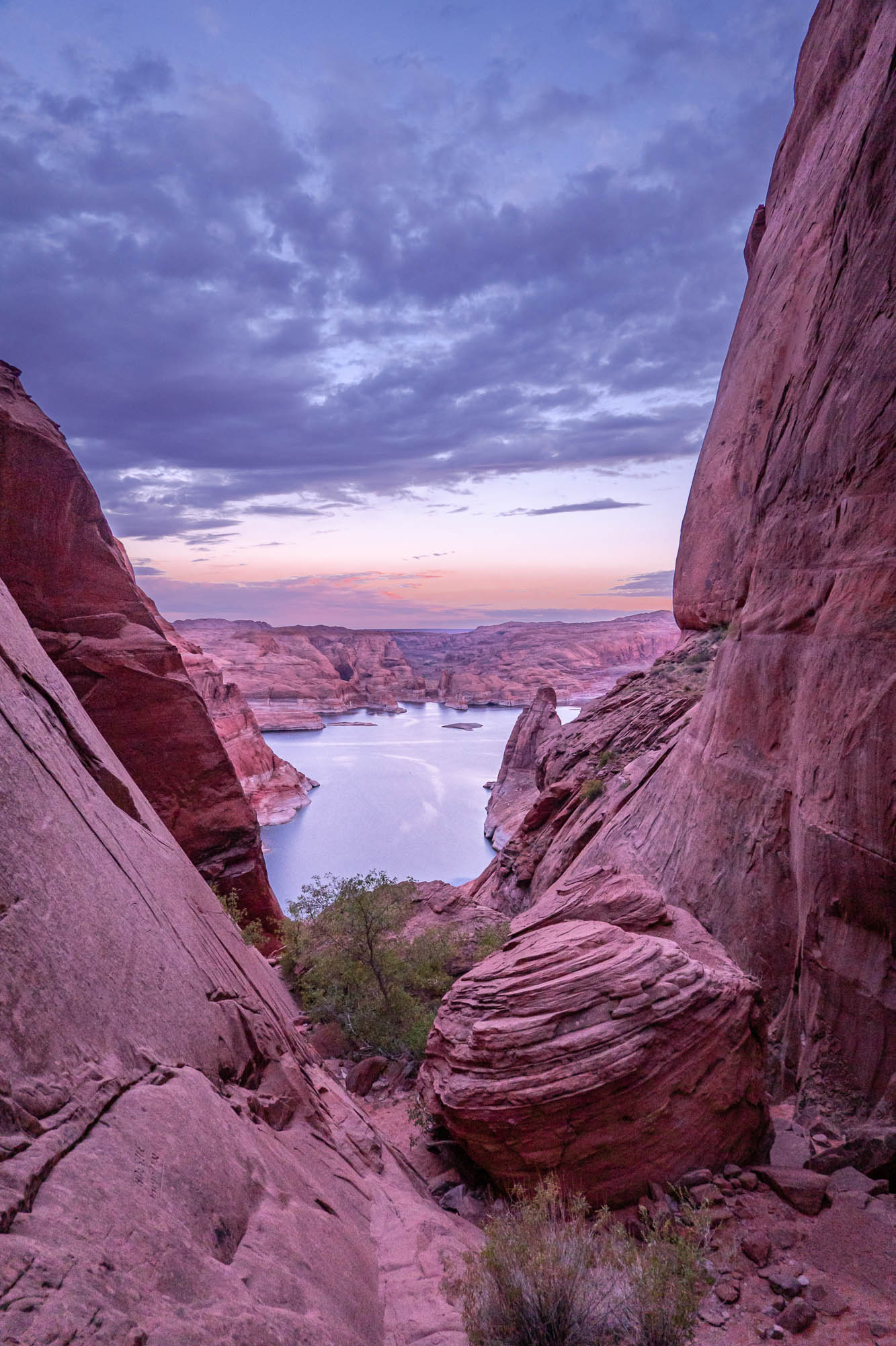 We finally reached the Hole in the Rock and began the 1,000 foot descent to Lake Powell, not for the feint-of-heart. Climbing down was not easy but we did make it all the way to Lake Powell Lake and went skinny-dipping in the warm water, so refreshing after a very long day. We set up camp at the top of Hole in the Rock and there was not another soul around. The sunrise was amazing at the top of Hole in the Rock, and still we were all alone in this most spectacular scenery. Click on thumbnail to view images