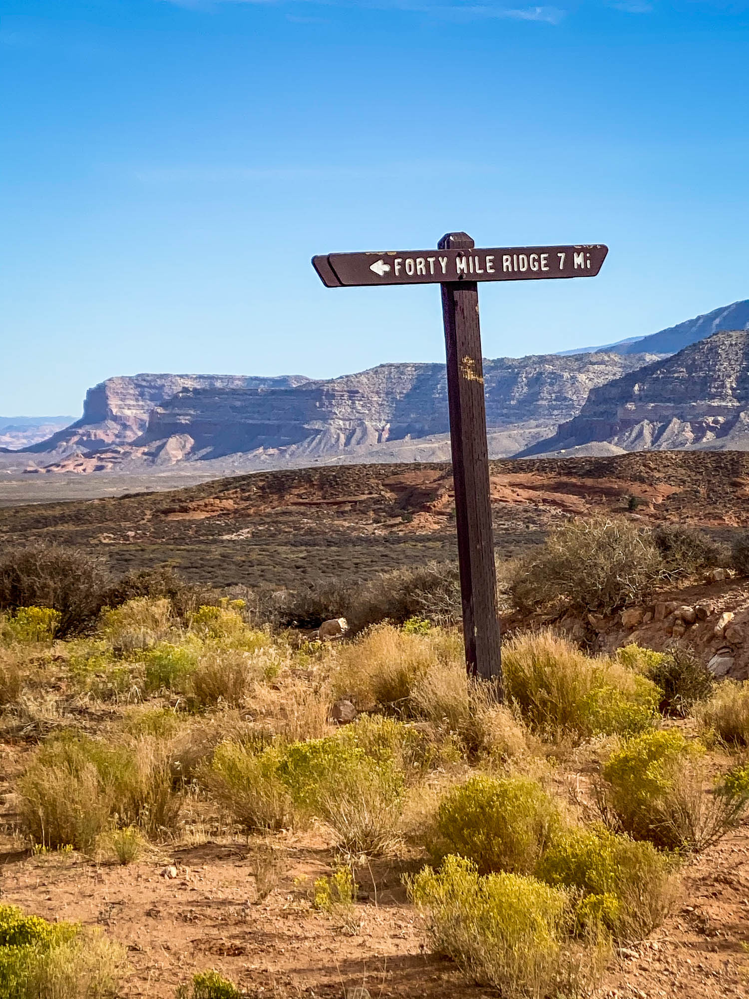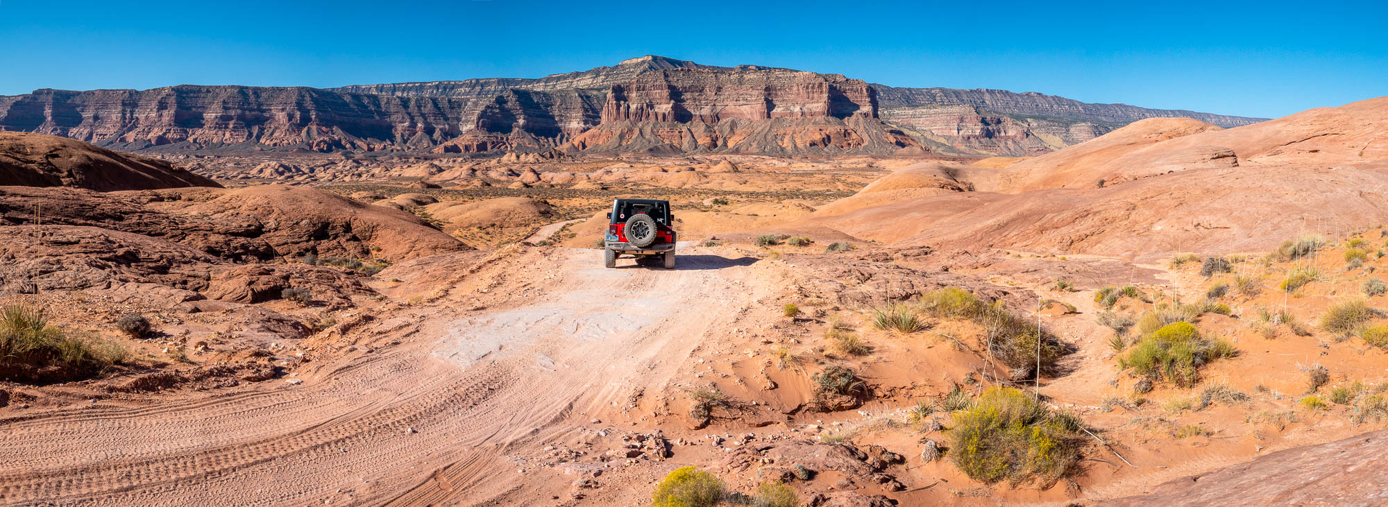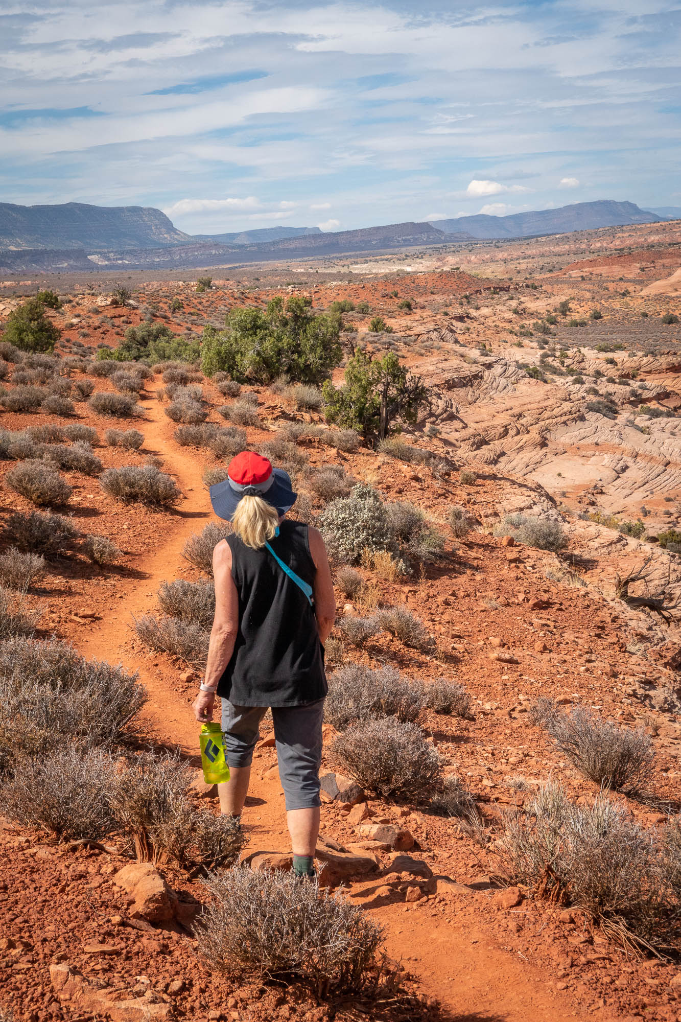On our way back on Hole in the Rock Road we drove out Forty Mile Ridge for 7 miles, definitely a 4WD road, to see the Crack where hikers descend down to the Escalante River. We followed some backpackers who showed us where the fabulous view looking down into the canyon below. Then we saw where they dropped their packs by rope to the bottom and they climbed down the Crack on their way to Coyote Gulch. The view of Stevens Arch in the distance was impressive and the Escalante River winding its way through the canyon. The hike back up the sand dunes was not much fun. We made it back to the Jeep and drove past the Water Tanks which is another sketchy access into Coyote Gulch. Click on thumbnail to view images