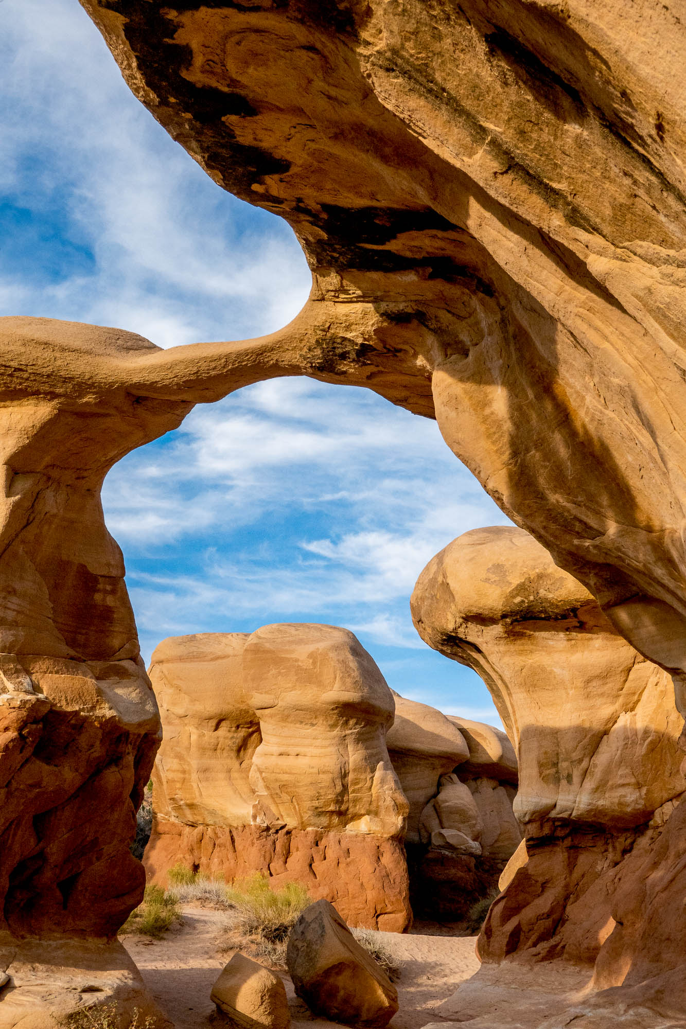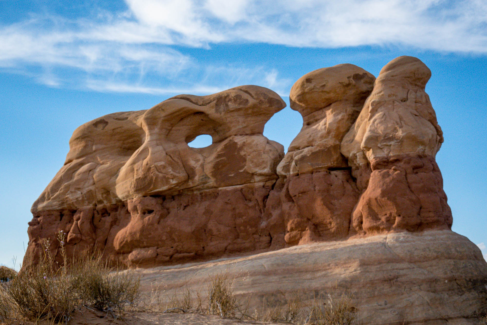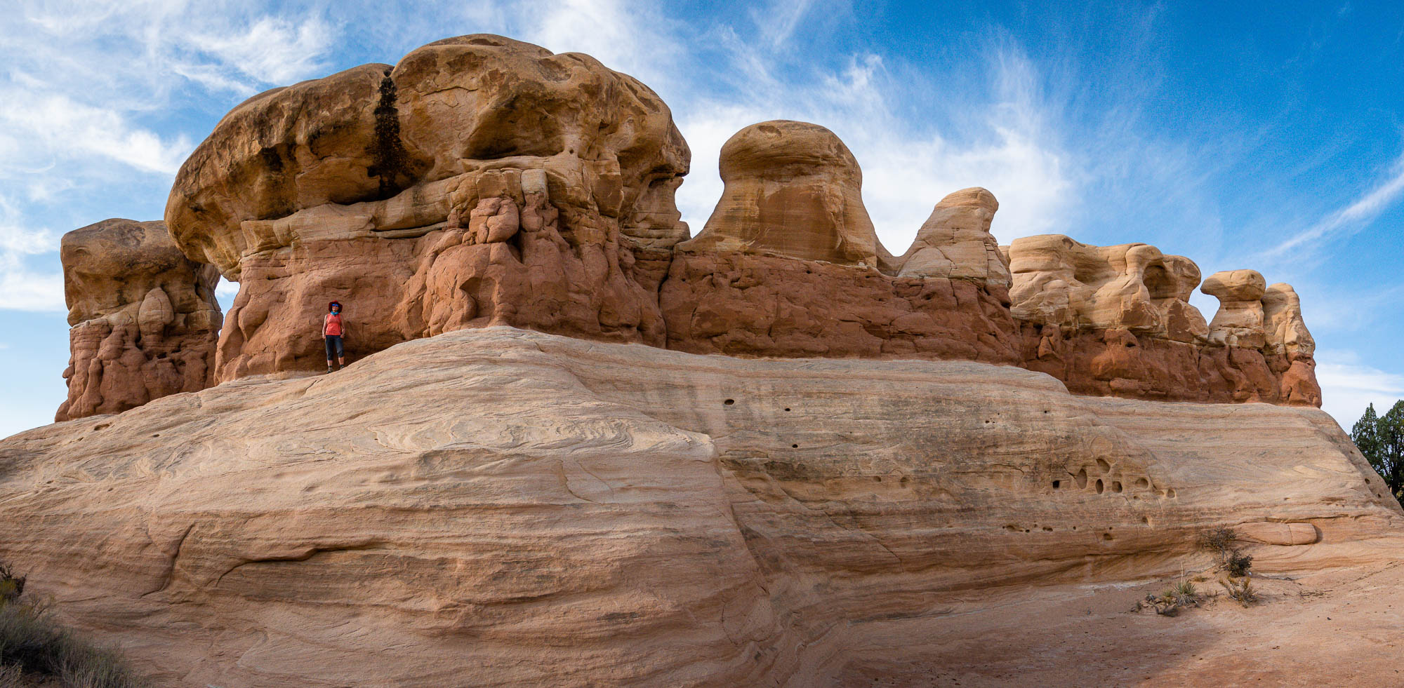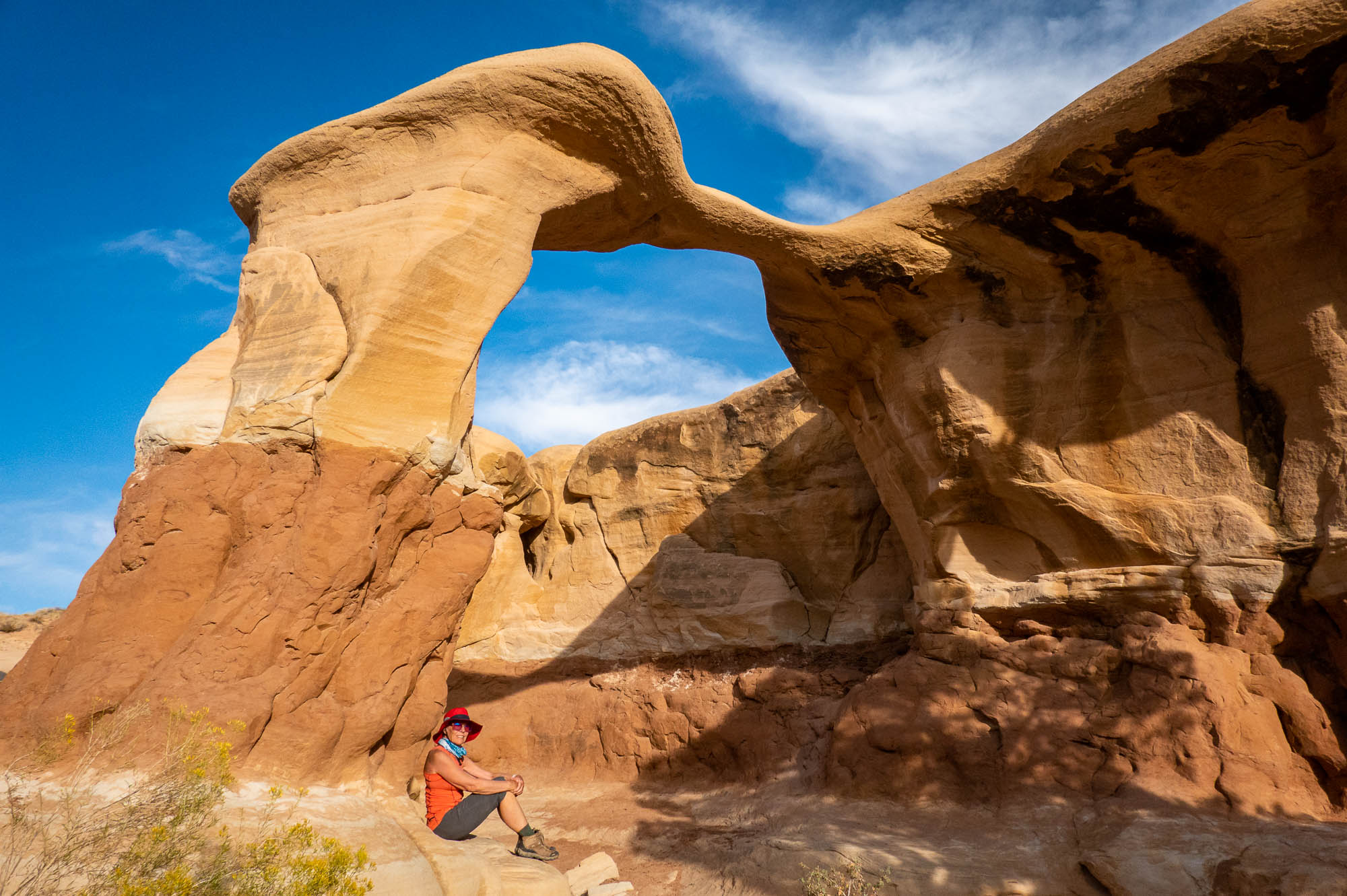 Our final stop off of Hole in the Rock Road was to view the Devils Garden featuring hoodoos, natural arches and other sandstone formations. Metate Arch is a slender caprock natural arch found in the center of the Devils Garden, and there are many hoodoos of varying sizes and shapes scattered throughout. We spent some time walking through the various formations of the hoodoos and Metate Arch enjoying the beautiful color of the sandstone formations. Click on thumbnail to view images