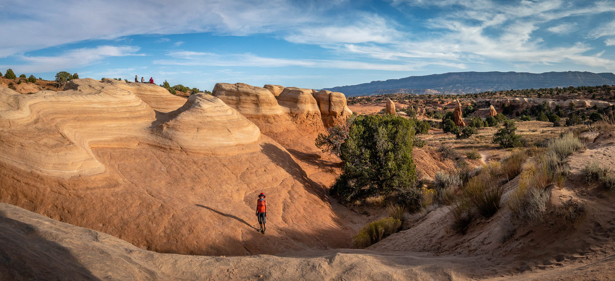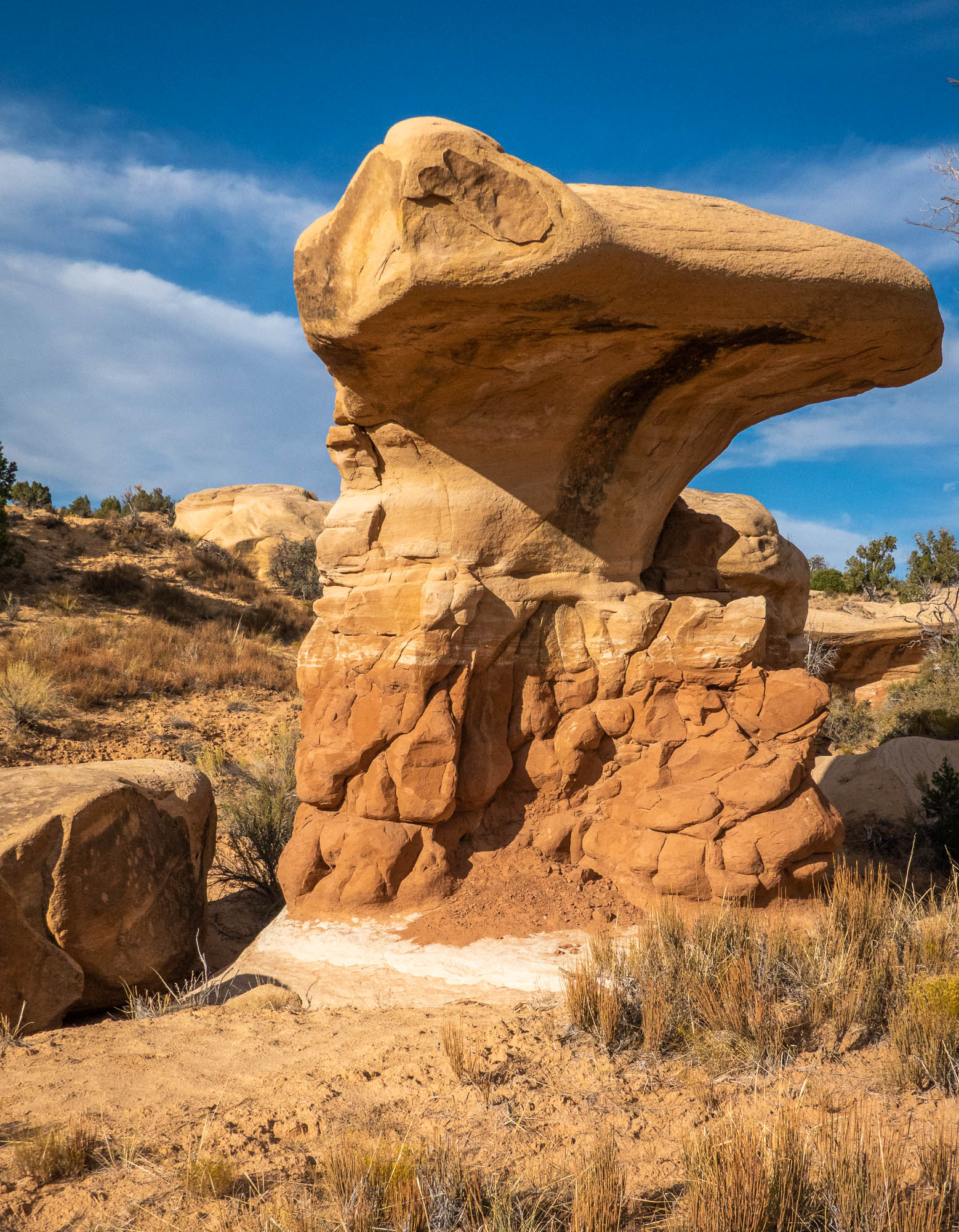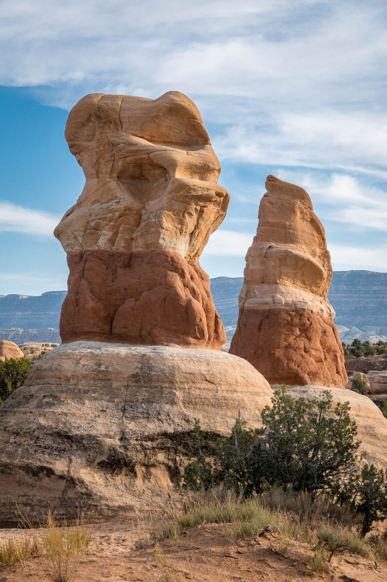 Our final stop off of Hole in the Rock Road was to view the Devils Garden featuring hoodoos, natural arches and other sandstone formations. Metate Arch is a slender caprock natural arch found in the center of the Devils Garden, and there are many hoodoos of varying sizes and shapes scattered throughout. We spent some time walking through the various formations of the hoodoos and Metate Arch enjoying the beautiful color of the sandstone formations. Click on thumbnail to view images