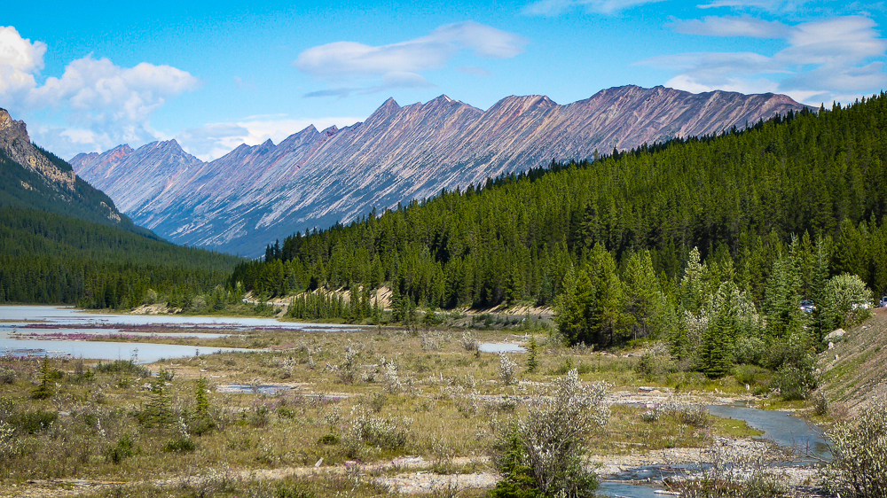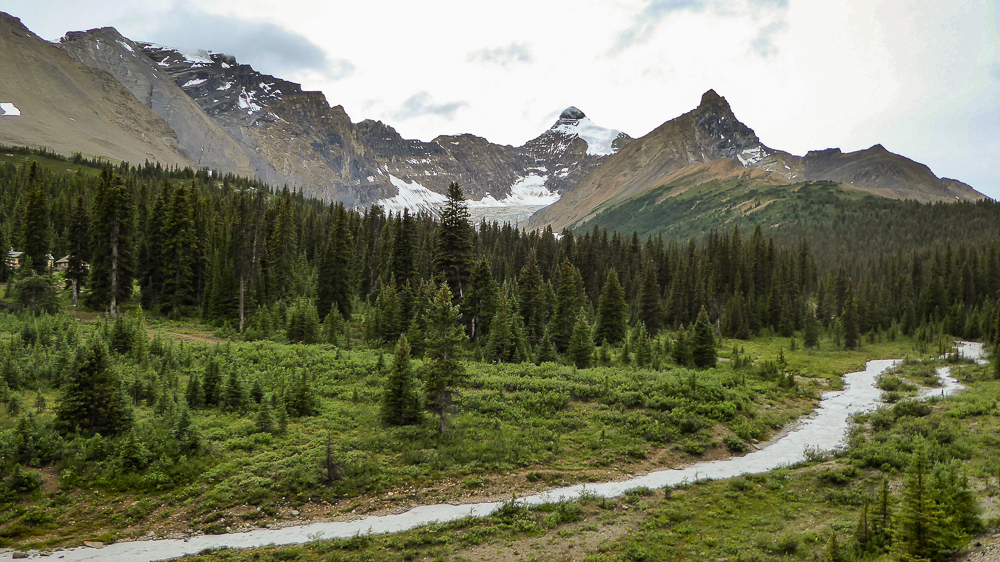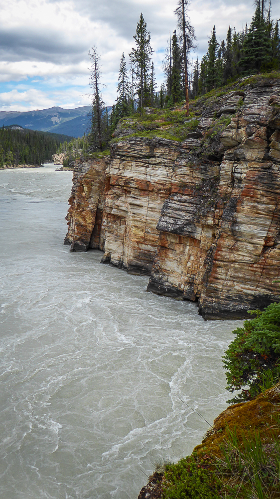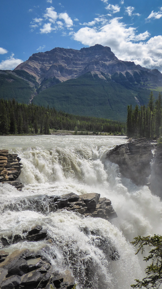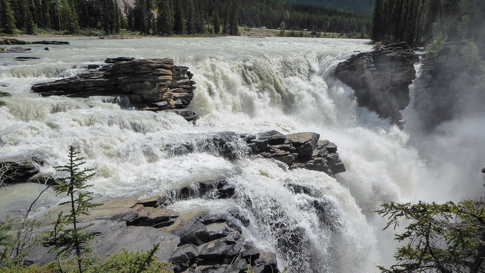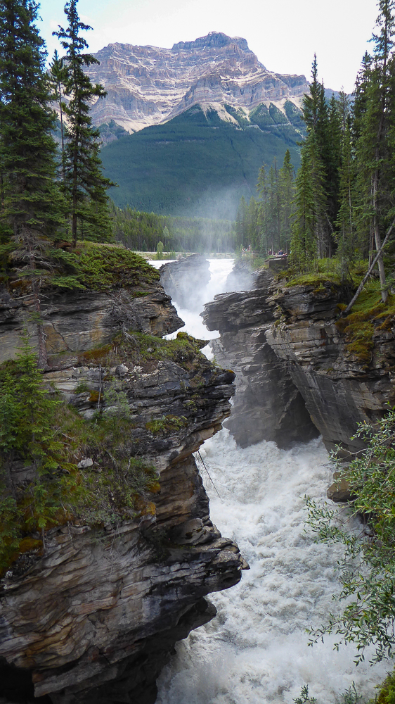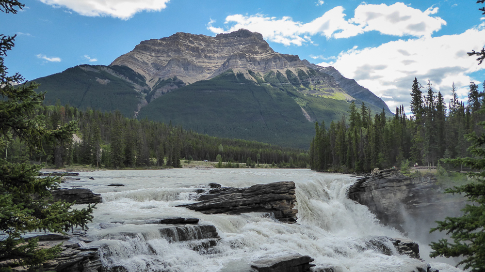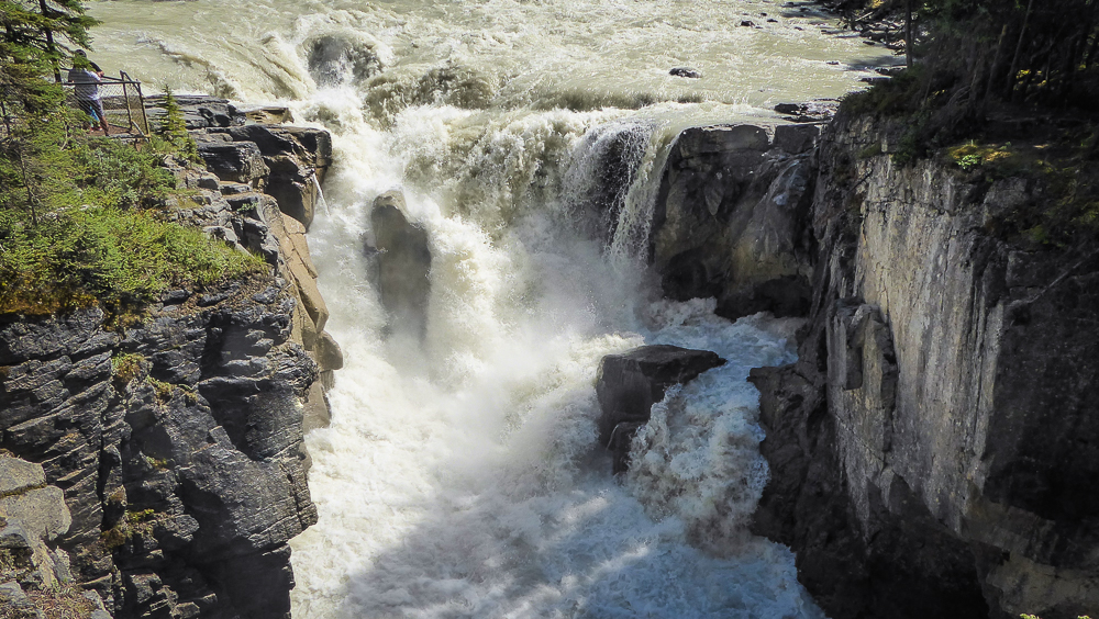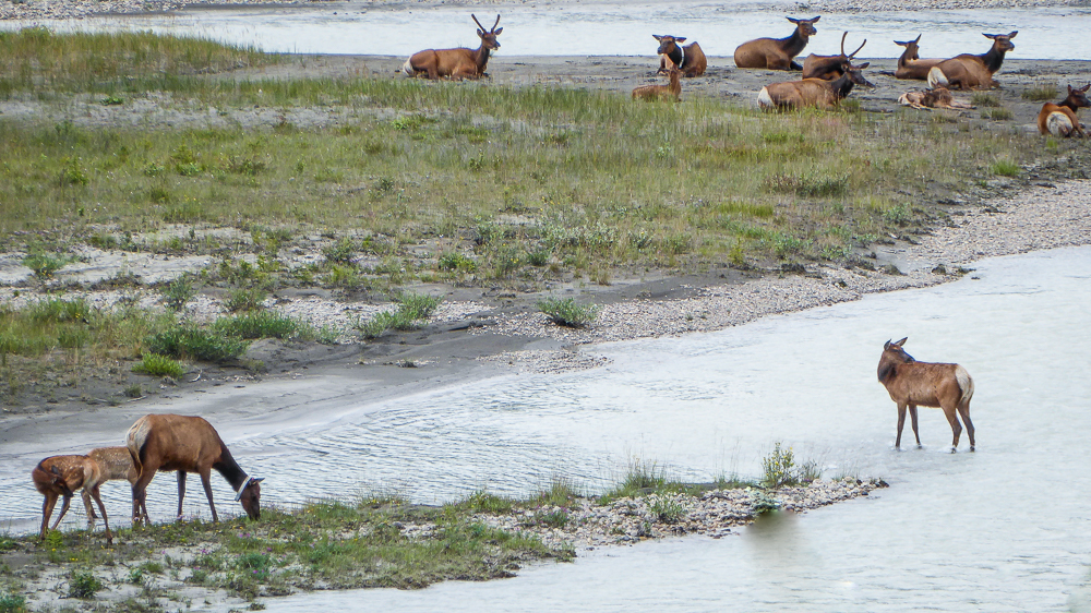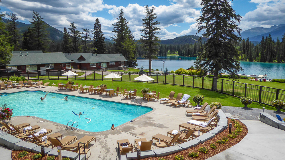 We continued along the Icefields Parkway, which links Lake Louise with Jasper, it is 140 miles long and was completed in 1940. After leaving the Columbia Icefields we stopped at the Athabasca Falls just off the highway located in Jasper NP. It is a class 5 waterfall, with a drop of 80 ft and a width of 60 ft, we walked along the various viewing platforms and trails around the falls. The large quantity of water falling into the gorge was very impressive and to see how it cut through the tall rock cliffs. The river “falls” over a layer of hard quartzite and through the softer limestone below carving the short gorge and a number of potholes. There were a lot of people walking around so we continued on the road to Jasper, where we stopped at the Fairmont Jasper Park Lodge. I worked here the summer of 1967 as a waitress and I was excited to go back and reminisce, as it was one of the best jobs I had when I was attending college. The views across Lake Beauvert to Mount Edith Cavell still were as magnificent as before and the the hotel has had many modification since 1967, but still very luxurious. We enjoyed a nice cold beer and snacks on the deck overlooking the large pool and the blue-green lake. We would love to return here again and be guests in the Lodge.