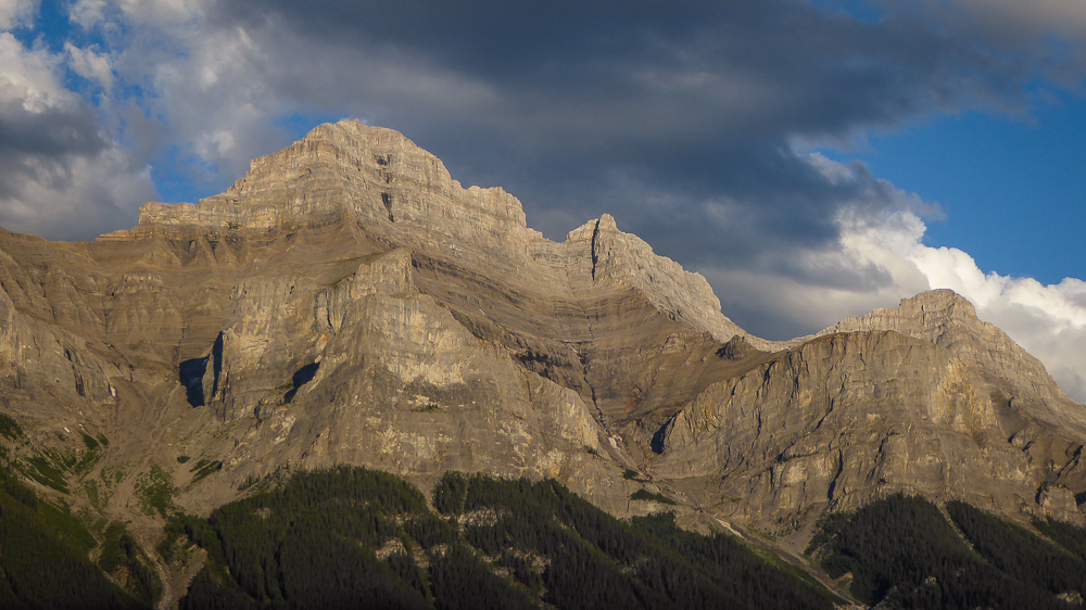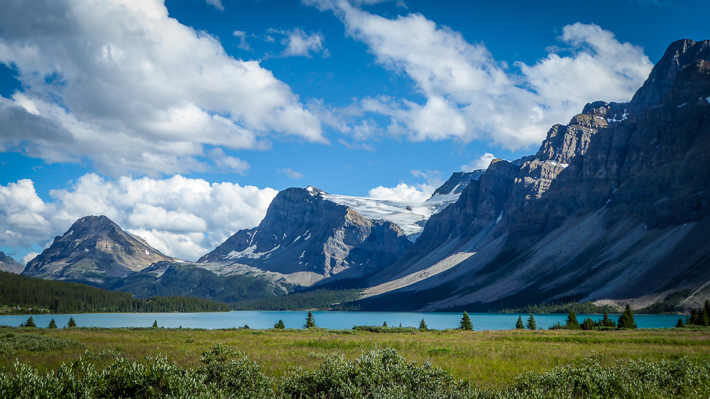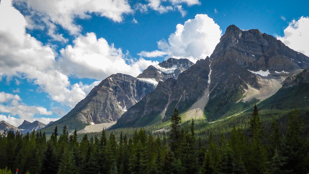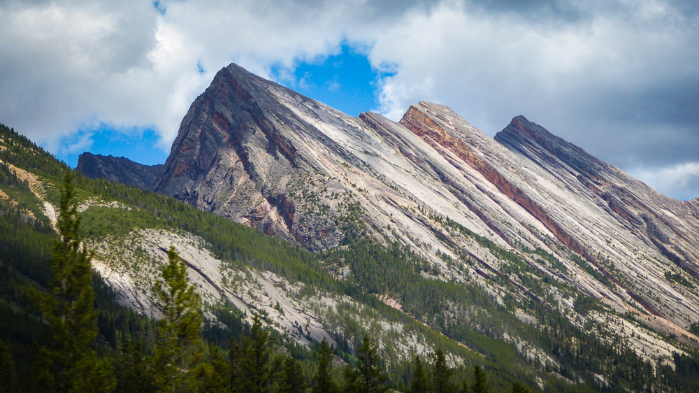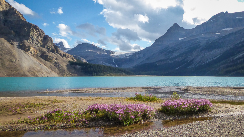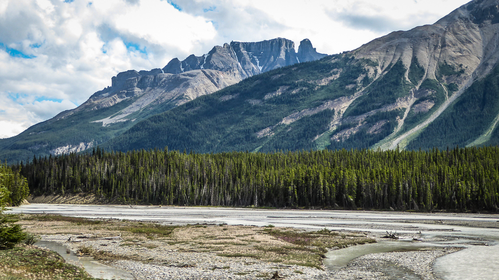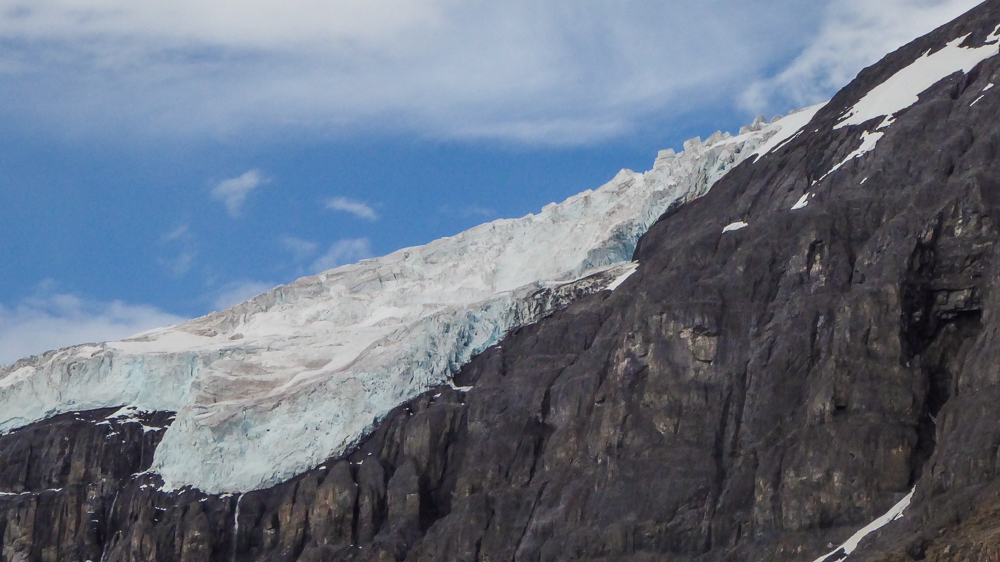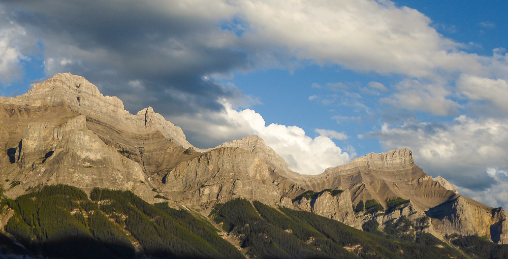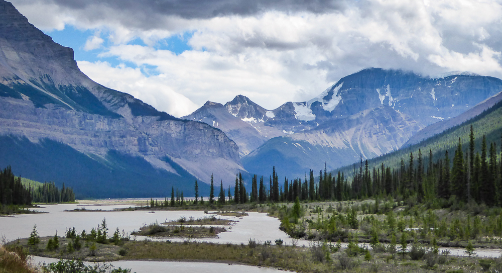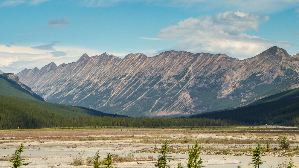 We continued along the Icefields Parkway, which links Lake Louise with Jasper, it is 140 miles long and was completed in 1940. After leaving the Columbia Icefields we stopped at the Athabasca Falls just off the highway located in Jasper NP. It is a class 5 waterfall, with a drop of 80 ft and a width of 60 ft, we walked along the various viewing platforms and trails around the falls. The large quantity of water falling into the gorge was very impressive and to see how it cut through the tall rock cliffs. The river “falls” over a layer of hard quartzite and through the softer limestone below carving the short gorge and a number of potholes. There were a lot of people walking around so we continued on the road to Jasper, where we stopped at the Fairmont Jasper Park Lodge. I worked here the summer of 1967 as a waitress and I was excited to go back and reminisce, as it was one of the best jobs I had when I was attending college. The views across Lake Beauvert to Mount Edith Cavell still were as magnificent as before and the the hotel has had many modification since 1967, but still very luxurious. We enjoyed a nice cold beer and snacks on the deck overlooking the large pool and the blue-green lake. We would love to return here again and be guests in the Lodge.