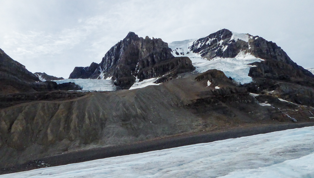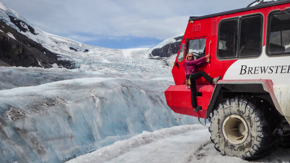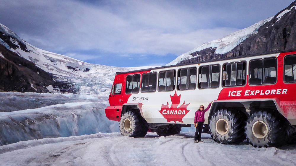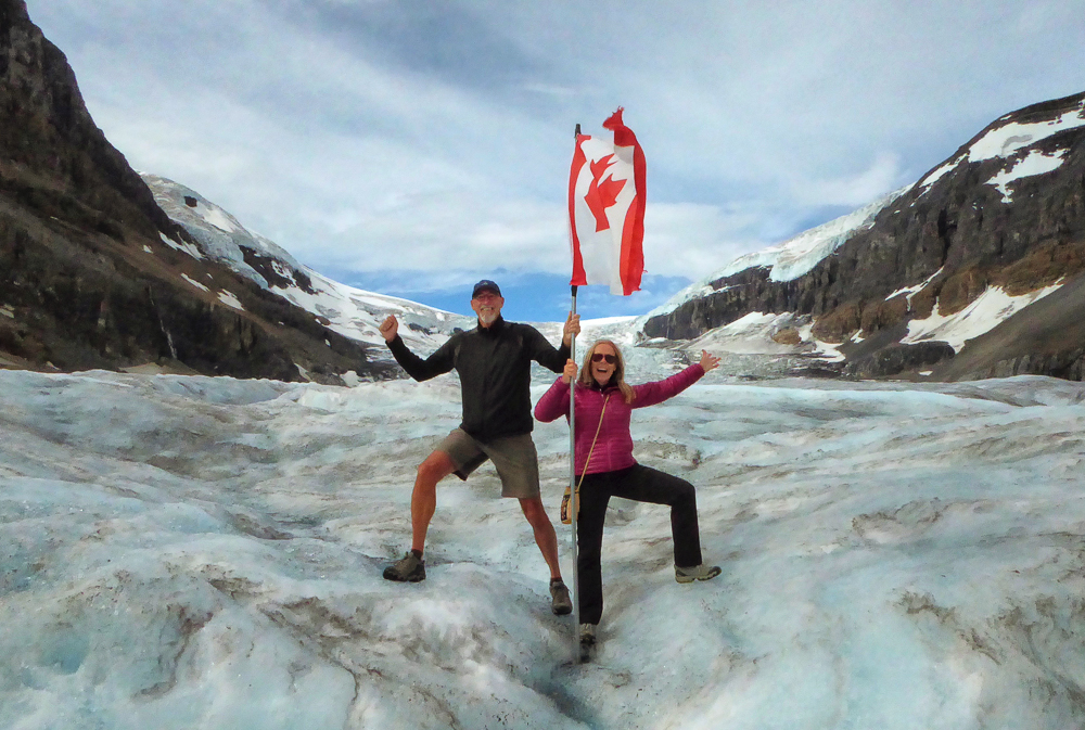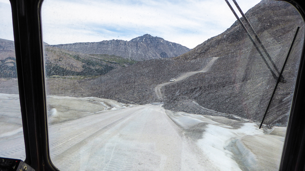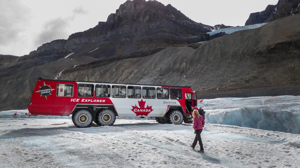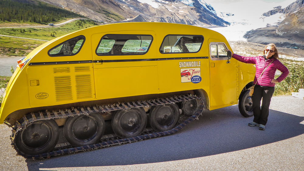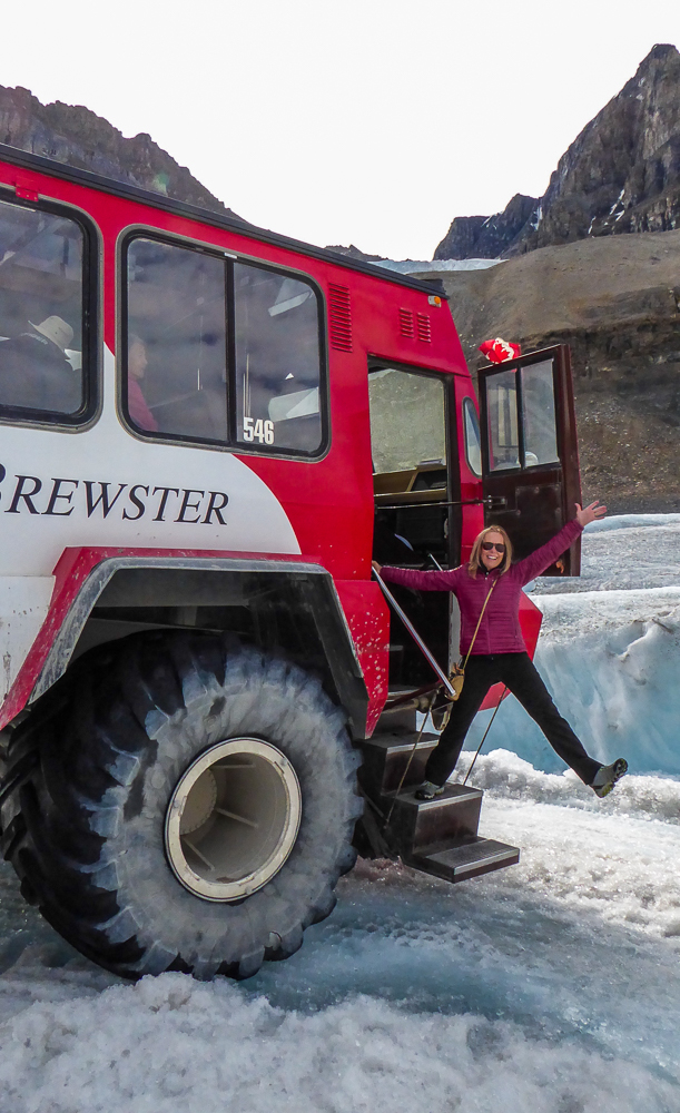 After leaving BC we and headed to Canmore, Alberta staying at the Spring Creek RV Park for three days. Early Monday morning we left at 6:30am to drive to the Columbia Icefields about 2 1/2 hour drive from Canmore. The whole way there it rained really hard and we were afraid that we wouldn’t be able to see the Icefields, however, when we arrived at 9am the sun came out and we went on the 9:30 tour in the Athabasca Glacier snow coach. A snow coach is a specialized vehicle, designed to operate over snow or ice, it weighs 33 tons, top speed is 25 mph but only 18 mph on the Athabasca Glacier, and it can transport 56 passengers, with six extra-large, low pressure tires. The Columbia Icefield is the largest ice field in the Rocky Mts of North America, astride the Continental Divide, it is about 125 sq mi in area, 330 ft to 1,198 ft in depth and receives up to 280 in of snowfall per year. The ice fields feeds 8 major glaciers, we could see 5 of them, North Face, Andromeda, Dome and Athabasca Glacier, which is the one we drove up onto in the snow coach. This glacier is approximately 3.7 mi long, covers an area of 2.3 sq mi and is measured to be 300-980 ft thick. However, it recedes at a rate of about 16 ft per year, when I was here in the 60’s it was massive compared to what I am standing upon today. We were excited to be able to see and experience the thrill of the glacier, without a mass of humanity.