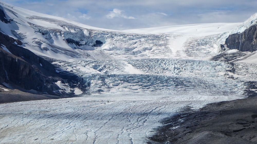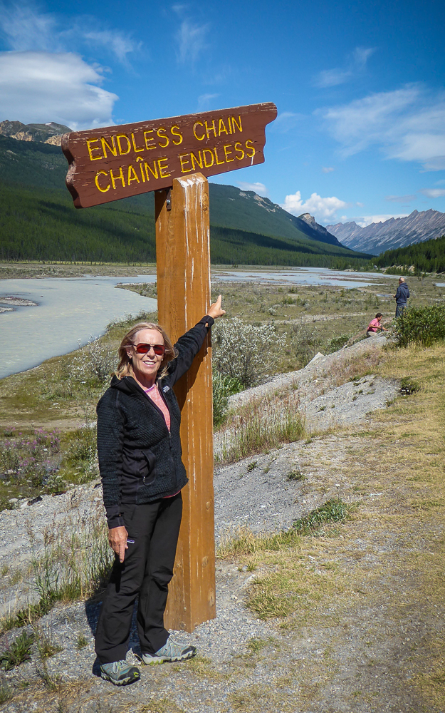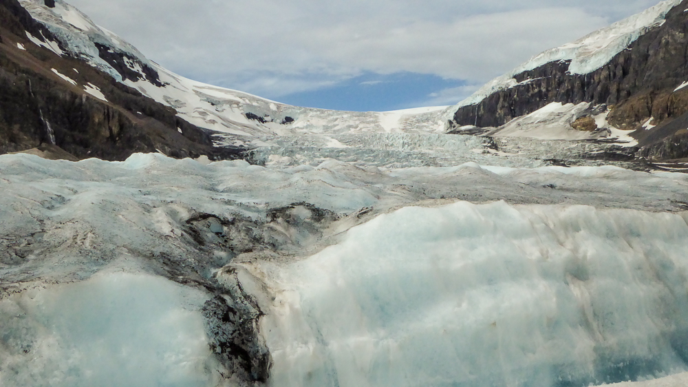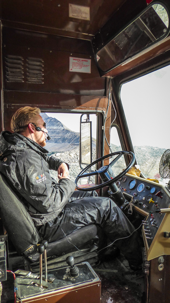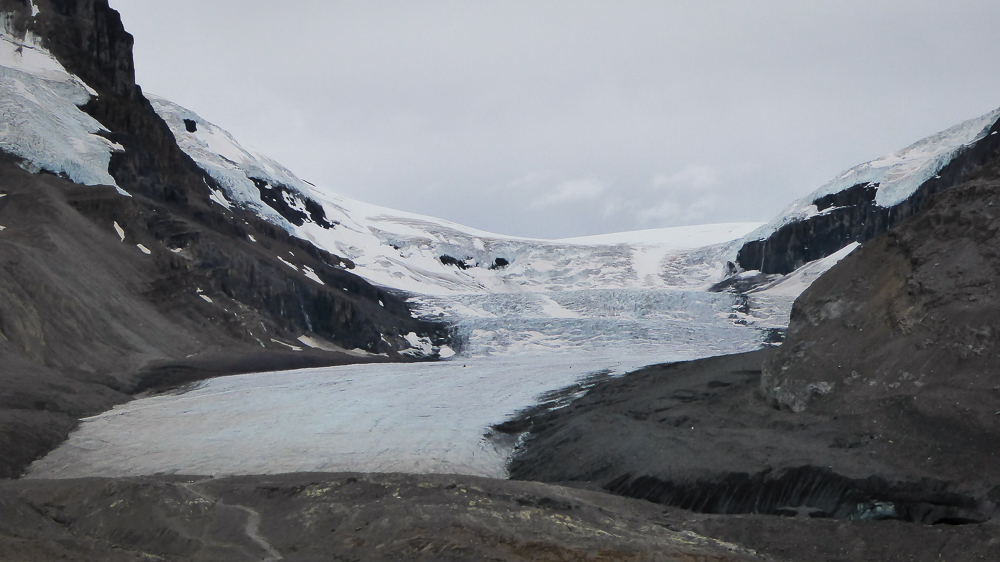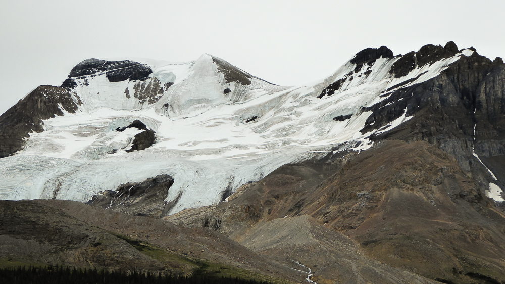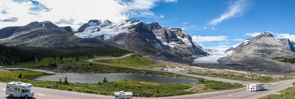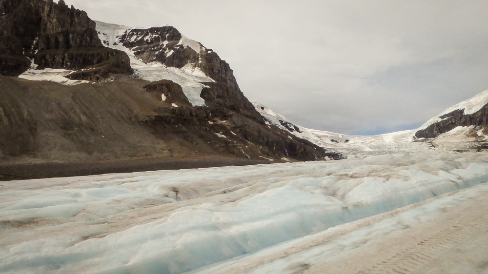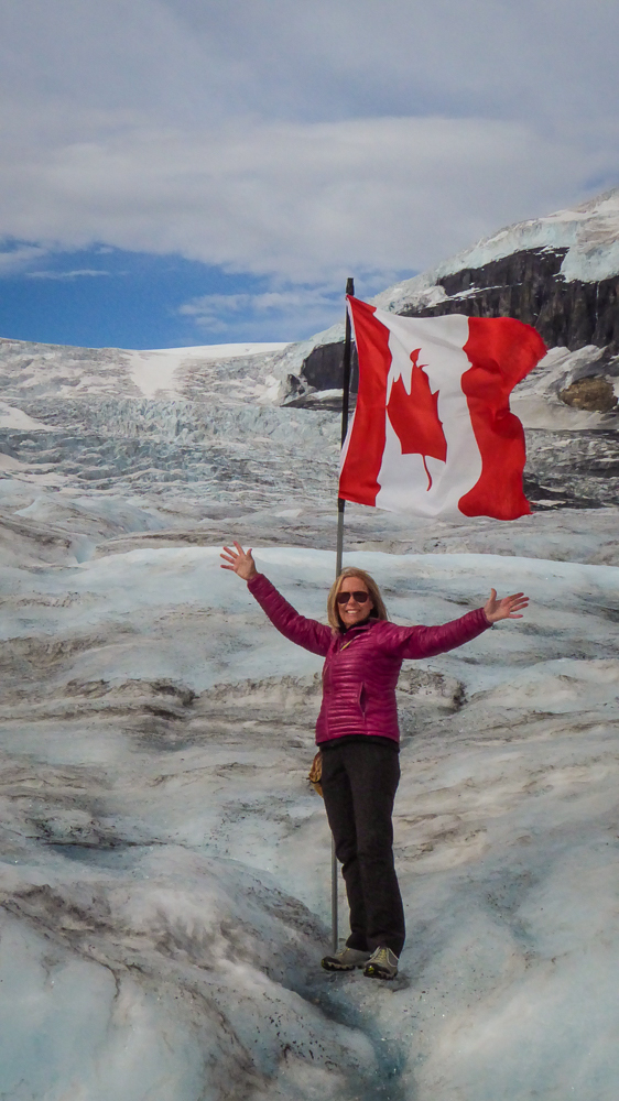 After leaving BC we and headed to Canmore, Alberta staying at the Spring Creek RV Park for three days. Early Monday morning we left at 6:30am to drive to the Columbia Icefields about 2 1/2 hour drive from Canmore. The whole way there it rained really hard and we were afraid that we wouldn’t be able to see the Icefields, however, when we arrived at 9am the sun came out and we went on the 9:30 tour in the Athabasca Glacier snow coach. A snow coach is a specialized vehicle, designed to operate over snow or ice, it weighs 33 tons, top speed is 25 mph but only 18 mph on the Athabasca Glacier, and it can transport 56 passengers, with six extra-large, low pressure tires. The Columbia Icefield is the largest ice field in the Rocky Mts of North America, astride the Continental Divide, it is about 125 sq mi in area, 330 ft to 1,198 ft in depth and receives up to 280 in of snowfall per year. The ice fields feeds 8 major glaciers, we could see 5 of them, North Face, Andromeda, Dome and Athabasca Glacier, which is the one we drove up onto in the snow coach. This glacier is approximately 3.7 mi long, covers an area of 2.3 sq mi and is measured to be 300-980 ft thick. However, it recedes at a rate of about 16 ft per year, when I was here in the 60’s it was massive compared to what I am standing upon today. We were excited to be able to see and experience the thrill of the glacier, without a mass of humanity.