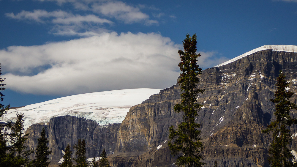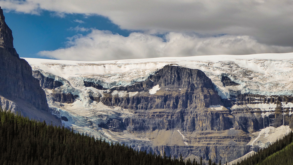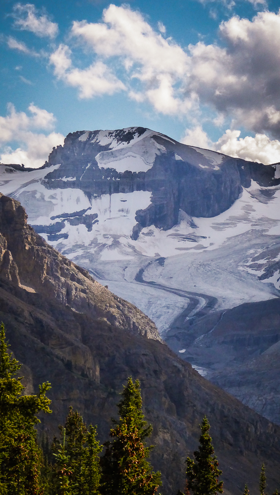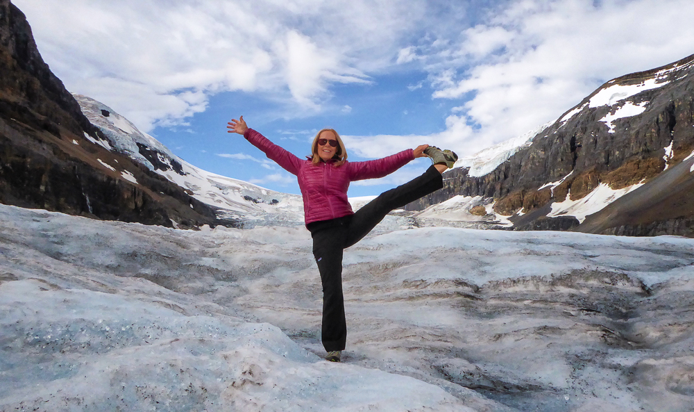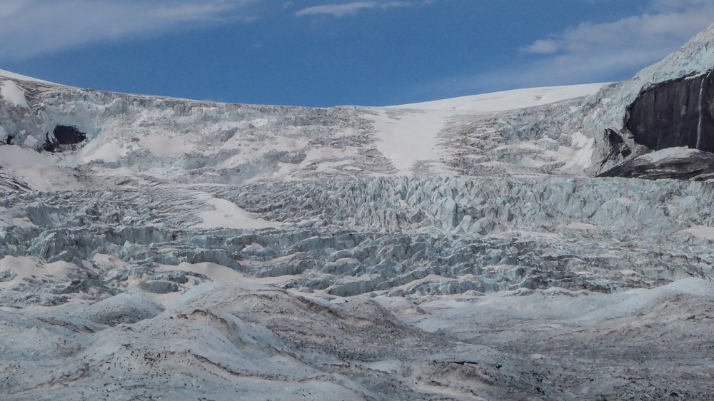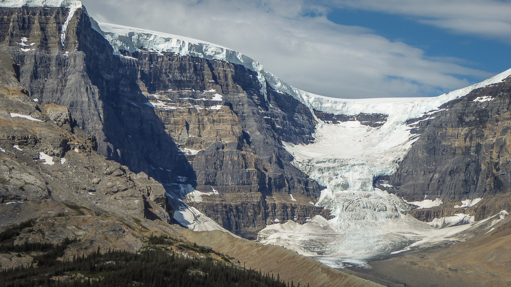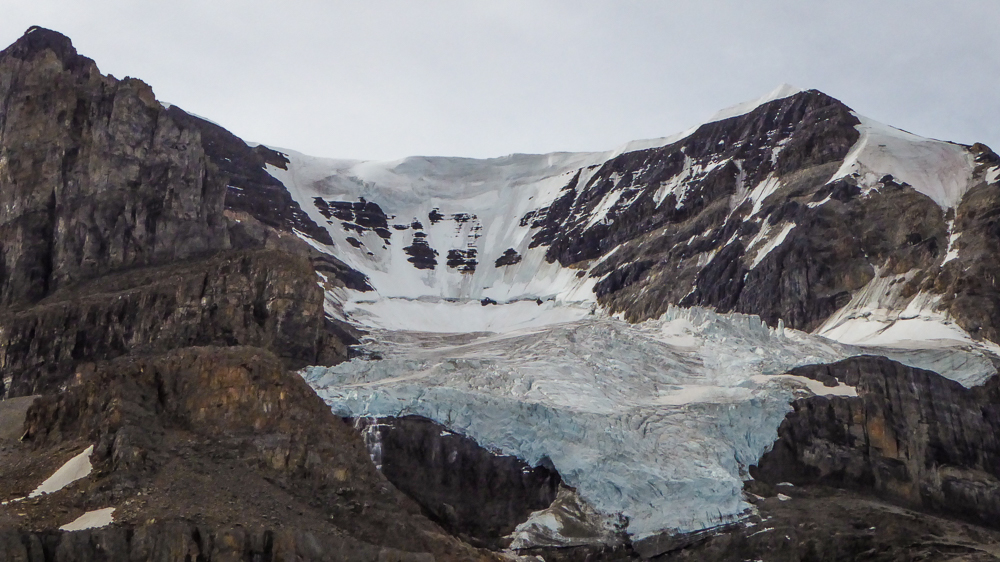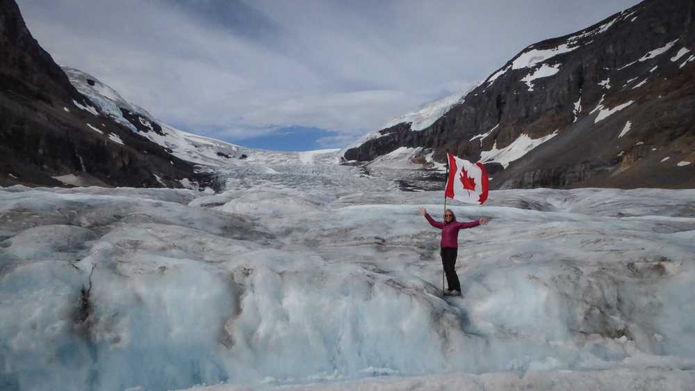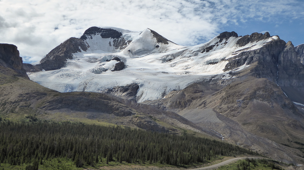 After leaving BC we and headed to Canmore, Alberta staying at the Spring Creek RV Park for three days. Early Monday morning we left at 6:30am to drive to the Columbia Icefields about 2 1/2 hour drive from Canmore. The whole way there it rained really hard and we were afraid that we wouldn’t be able to see the Icefields, however, when we arrived at 9am the sun came out and we went on the 9:30 tour in the Athabasca Glacier snow coach. A snow coach is a specialized vehicle, designed to operate over snow or ice, it weighs 33 tons, top speed is 25 mph but only 18 mph on the Athabasca Glacier, and it can transport 56 passengers, with six extra-large, low pressure tires. The Columbia Icefield is the largest ice field in the Rocky Mts of North America, astride the Continental Divide, it is about 125 sq mi in area, 330 ft to 1,198 ft in depth and receives up to 280 in of snowfall per year. The ice fields feeds 8 major glaciers, we could see 5 of them, North Face, Andromeda, Dome and Athabasca Glacier, which is the one we drove up onto in the snow coach. This glacier is approximately 3.7 mi long, covers an area of 2.3 sq mi and is measured to be 300-980 ft thick. However, it recedes at a rate of about 16 ft per year, when I was here in the 60’s it was massive compared to what I am standing upon today. We were excited to be able to see and experience the thrill of the glacier, without a mass of humanity.