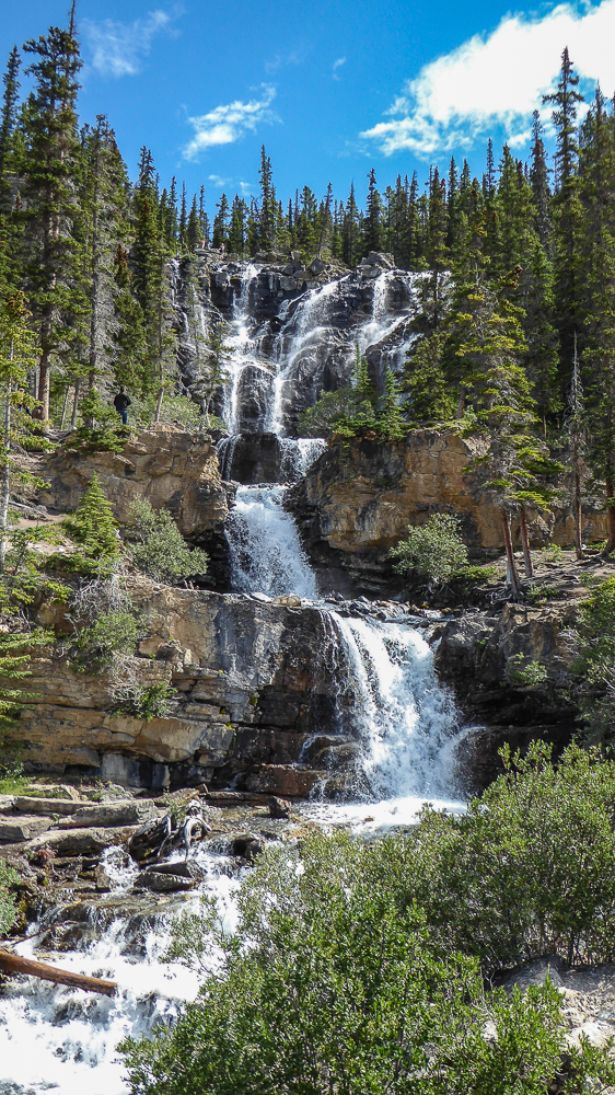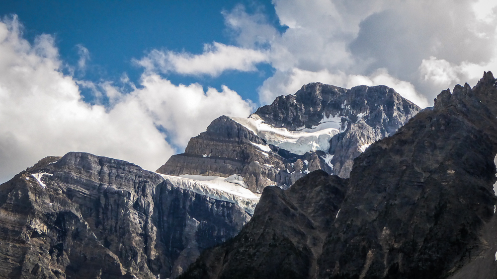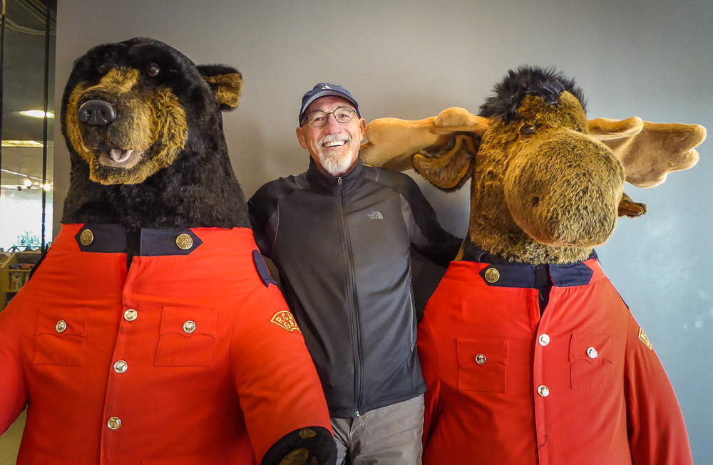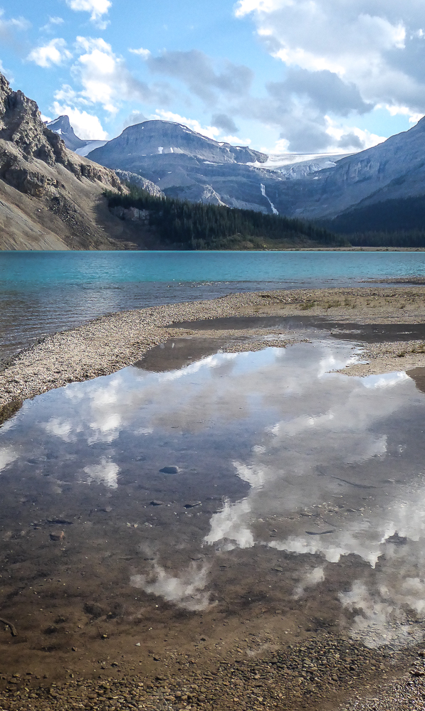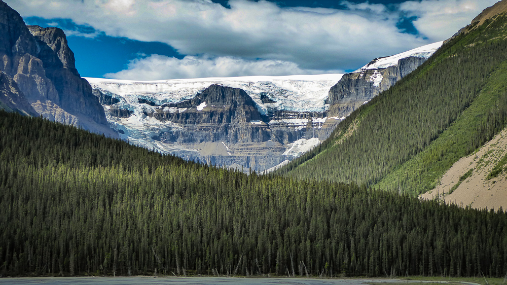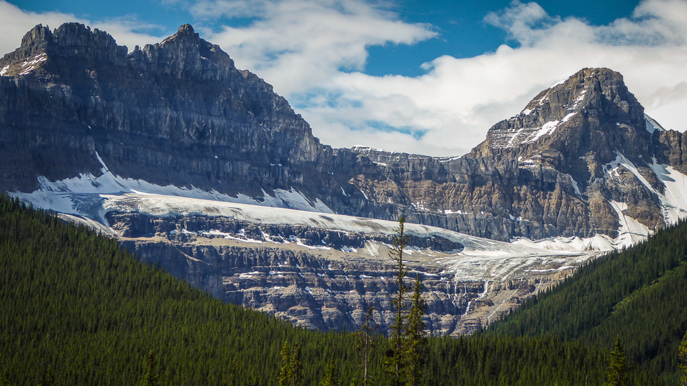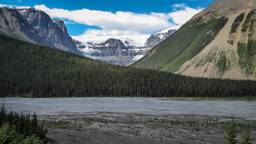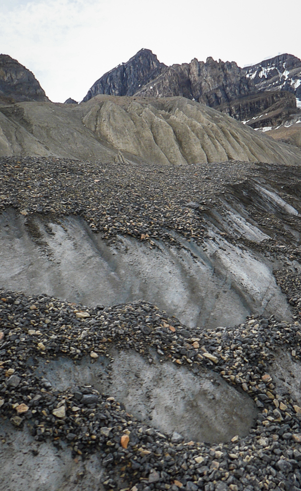After leaving BC we and headed to Canmore, Alberta staying at the Spring Creek RV Park for three days. Early Monday morning we left at 6:30am to drive to the Columbia Icefields about 2 1/2 hour drive from Canmore. The whole way there it rained really hard and we were afraid that we wouldn’t be able to see the Icefields, however, when we arrived at 9am the sun came out and we went on the 9:30 tour in the Athabasca Glacier snow coach. A snow coach is a specialized vehicle, designed to operate over snow or ice, it weighs 33 tons, top speed is 25 mph but only 18 mph on the Athabasca Glacier, and it can transport 56 passengers, with six extra-large, low pressure tires. The Columbia Icefield is the largest ice field in the Rocky Mts of North America, astride the Continental Divide, it is about 125 sq mi in area, 330 ft to 1,198 ft in depth and receives up to 280 in of snowfall per year. The ice fields feeds 8 major glaciers, we could see 5 of them, North Face, Andromeda, Dome and Athabasca Glacier, which is the one we drove up onto in the snow coach. This glacier is approximately 3.7 mi long, covers an area of 2.3 sq mi and is measured to be 300-980 ft thick. However, it recedes at a rate of about 16 ft per year, when I was here in the 60’s it was massive compared to what I am standing upon today. We were excited to be able to see and experience the thrill of the glacier, without a mass of humanity.