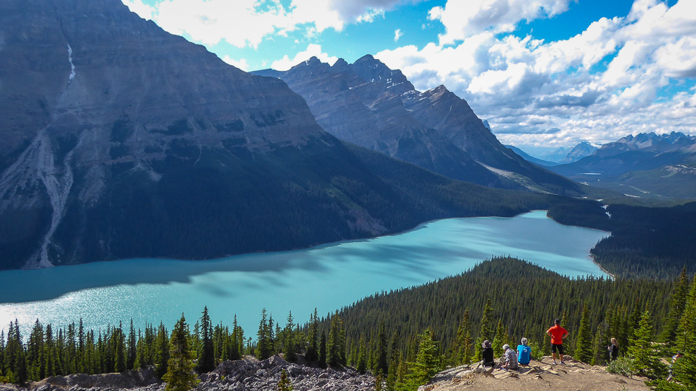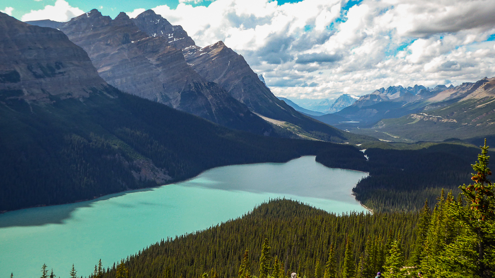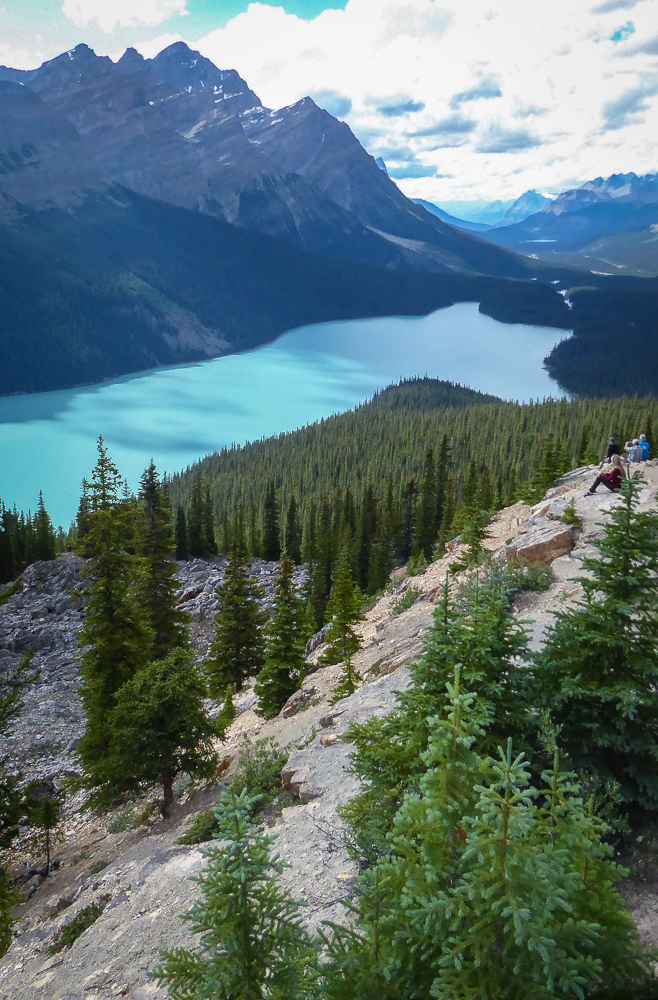 After leaving Jasper we drove back to visit Peyto Lake in Banff NP, it is just a short walking trail from the Icefields Parkway to view the Lake. It is a glacier-fed lake, and during the summer the significant amounts of glacial rock flour flow into the lake, and these suspended rock particles give the lake a bright, beautiful turquoise colour. This lake is still as wonderful as it was back in 1967 except for the number of tourists everywhere!!!