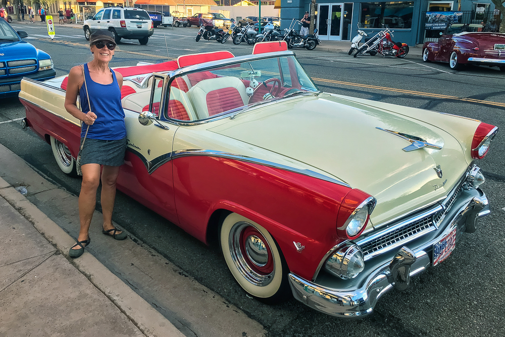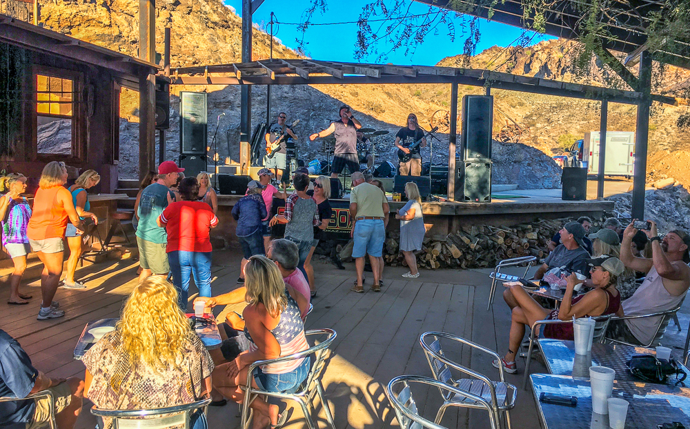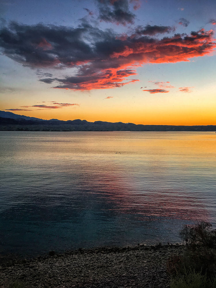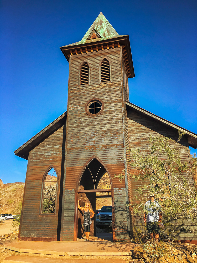 On Sunday we visited The Desert Bar, the Nellie E Saloon, on land that was an old mining camp, open on Sat and Sun only. It’s a 4-wheel drive road to reach the Desert Bar in the middle of nowhere and a covered bridge is the entrance to the Bar, built in 1991. The Desert Bar was completed in 1988 and the inside of the saloon is unique in many ways. The church was completed in 1996, and is made of solid steel, the walls and ceiling are made of the same stamped tin used inside the bar, and the roof is made of cooper. The church is a unique place for weddings. There is live music every Sat and Sun and we listened to the band while eating lunch. Loved watching the beautiful colors as the sun set across the lake. Click on thumbnail to view images