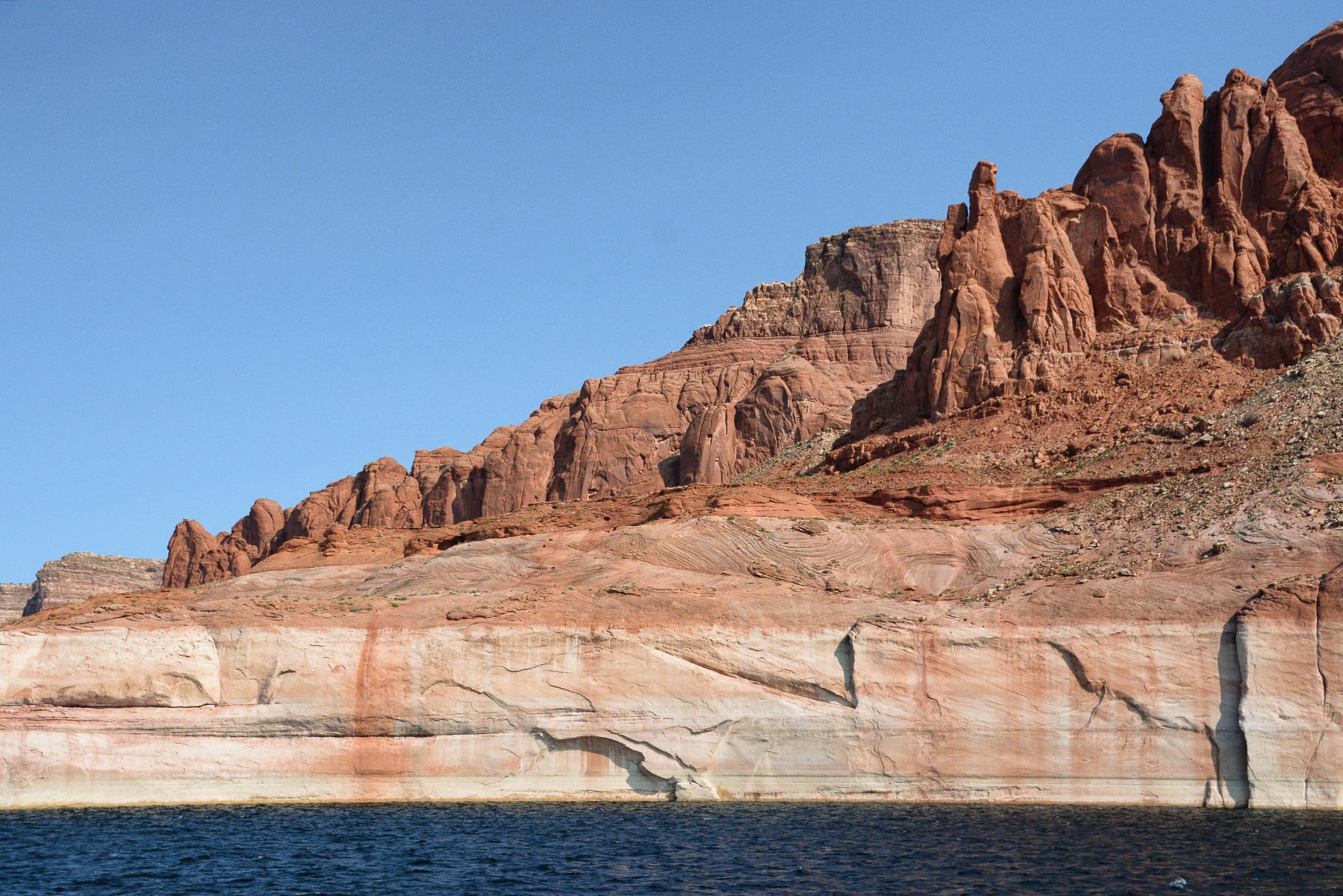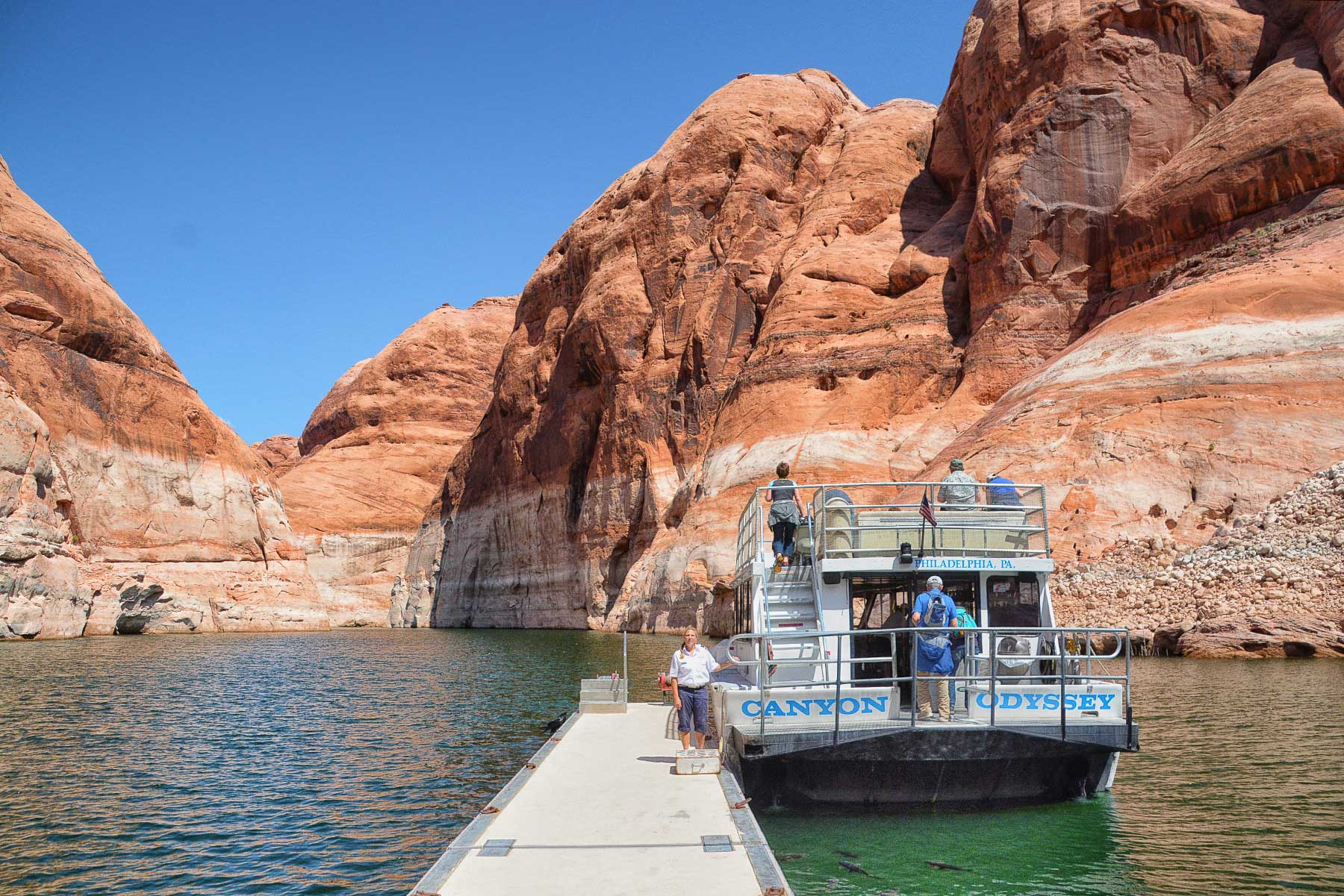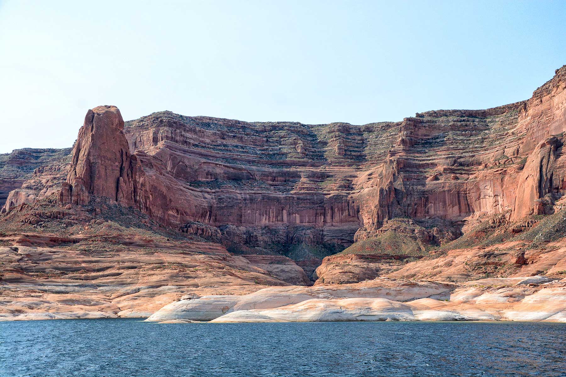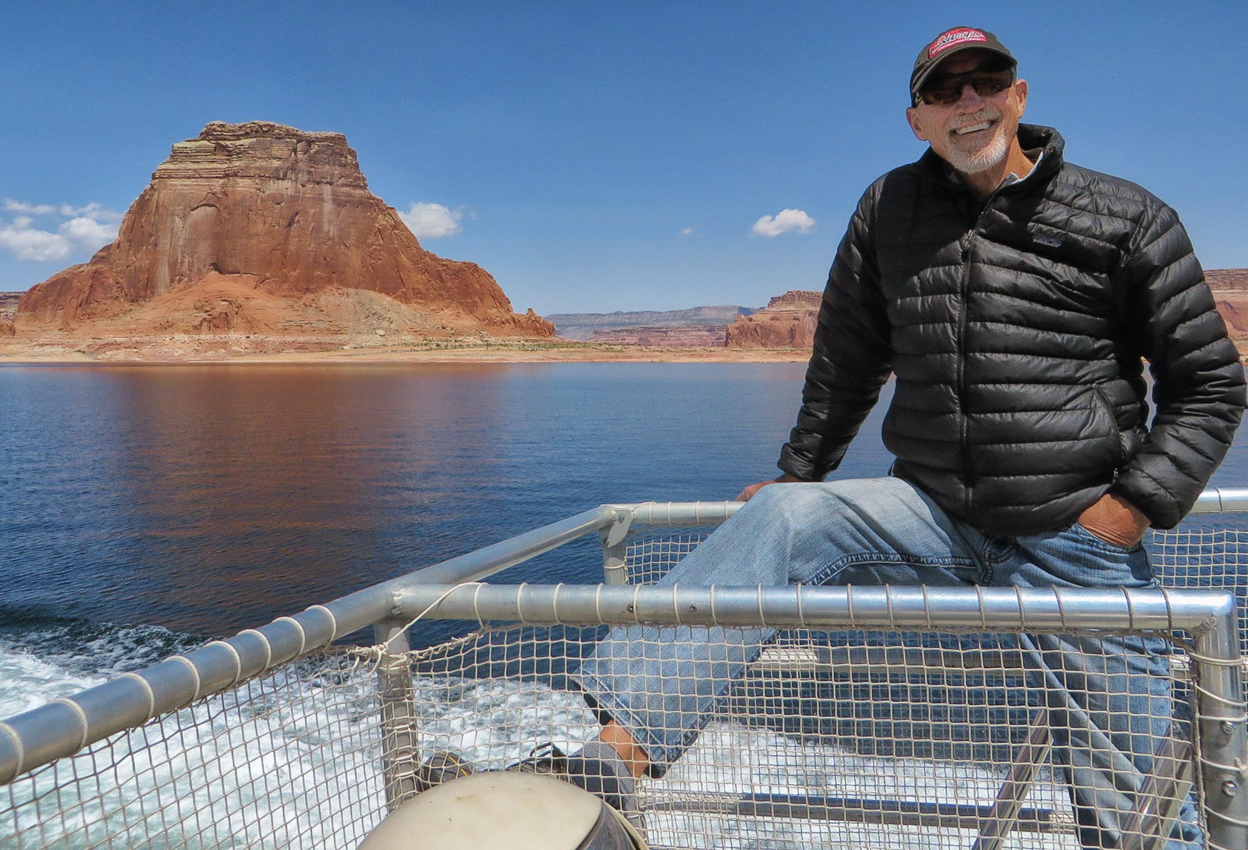 We saved the best for today a cruise on Lake Powell to the Rainbow Bridge Natural Arch. Lake Powell, named after John Wesley Powell, is 186 miles long and backs up into more than 96 major side canyons, and is the second-largest man-made lake in the US. Today we are going to take the cruise boat 50 nautical miles from the Wahweap Marina to Bridge Canyon where the Rainbow Bridge was discovered in 1909. The lake’s crystal clear blue water, more than 500 feet deep in places, is wonderful to explore as we cruised through narrow waterways, past sandstone cliffs and buttes, including the well known Tower Butte.