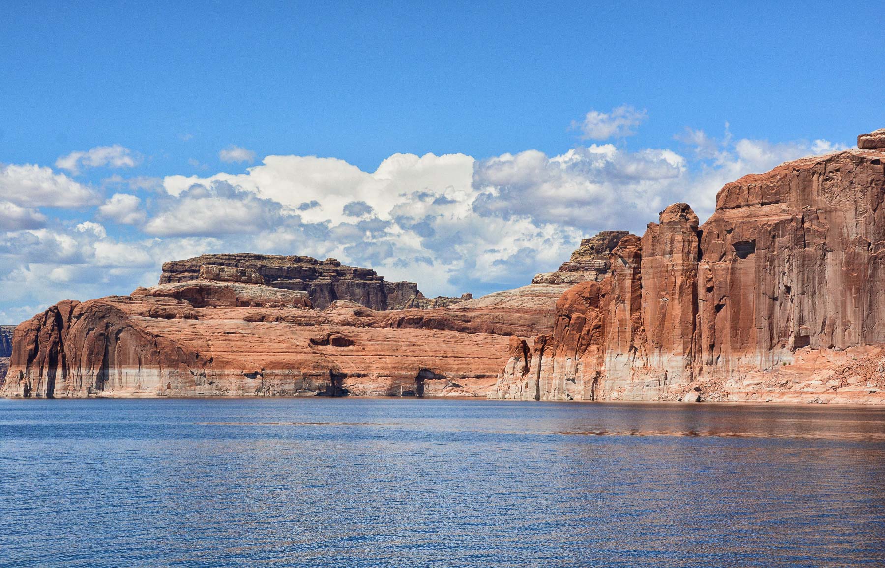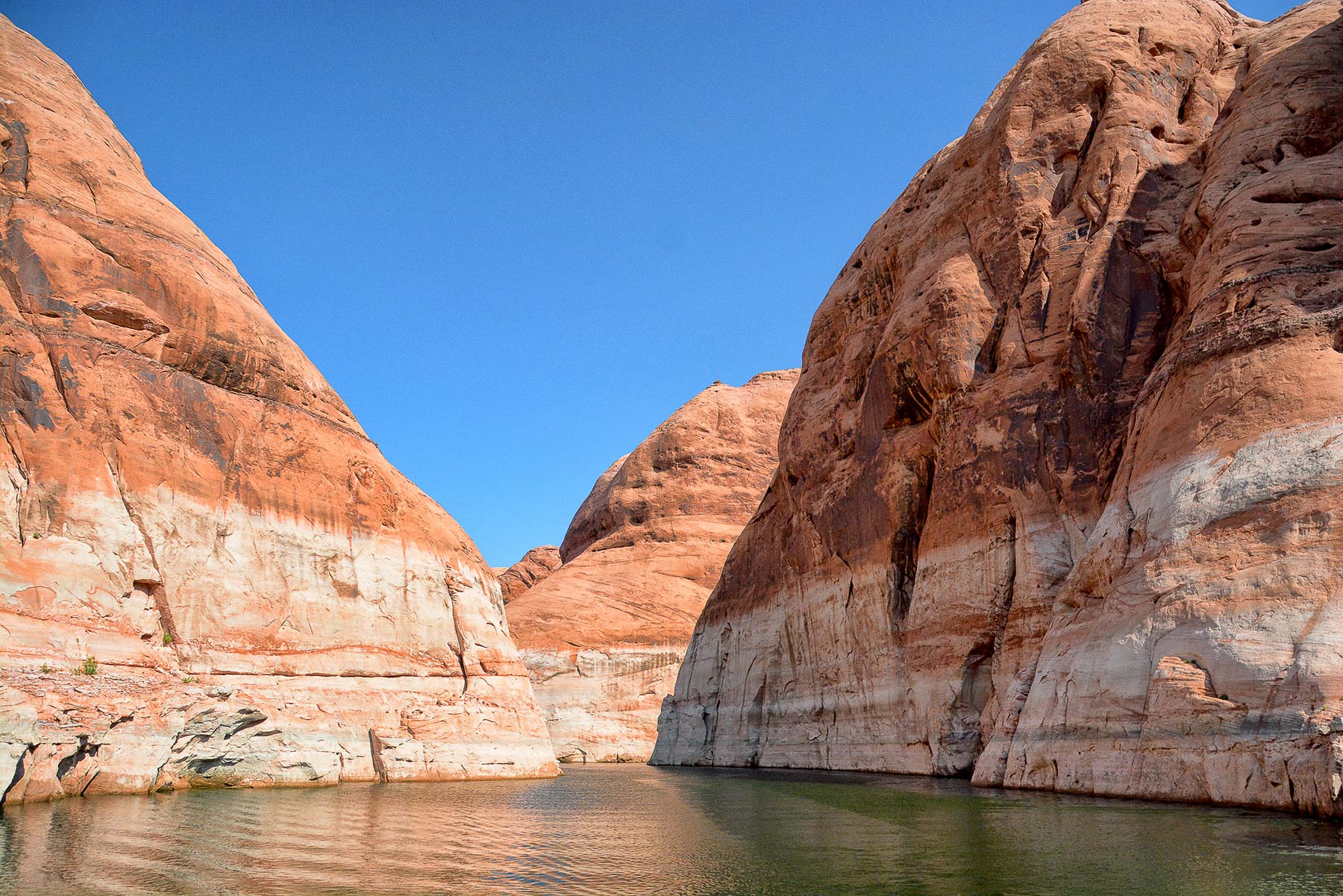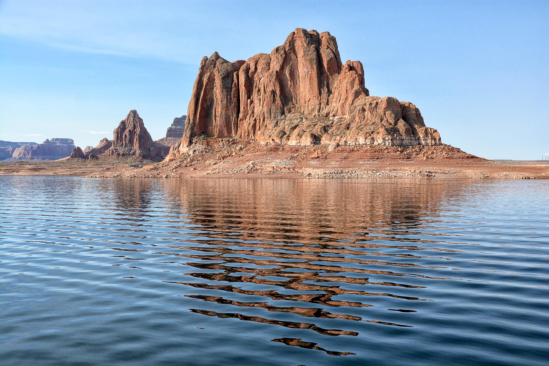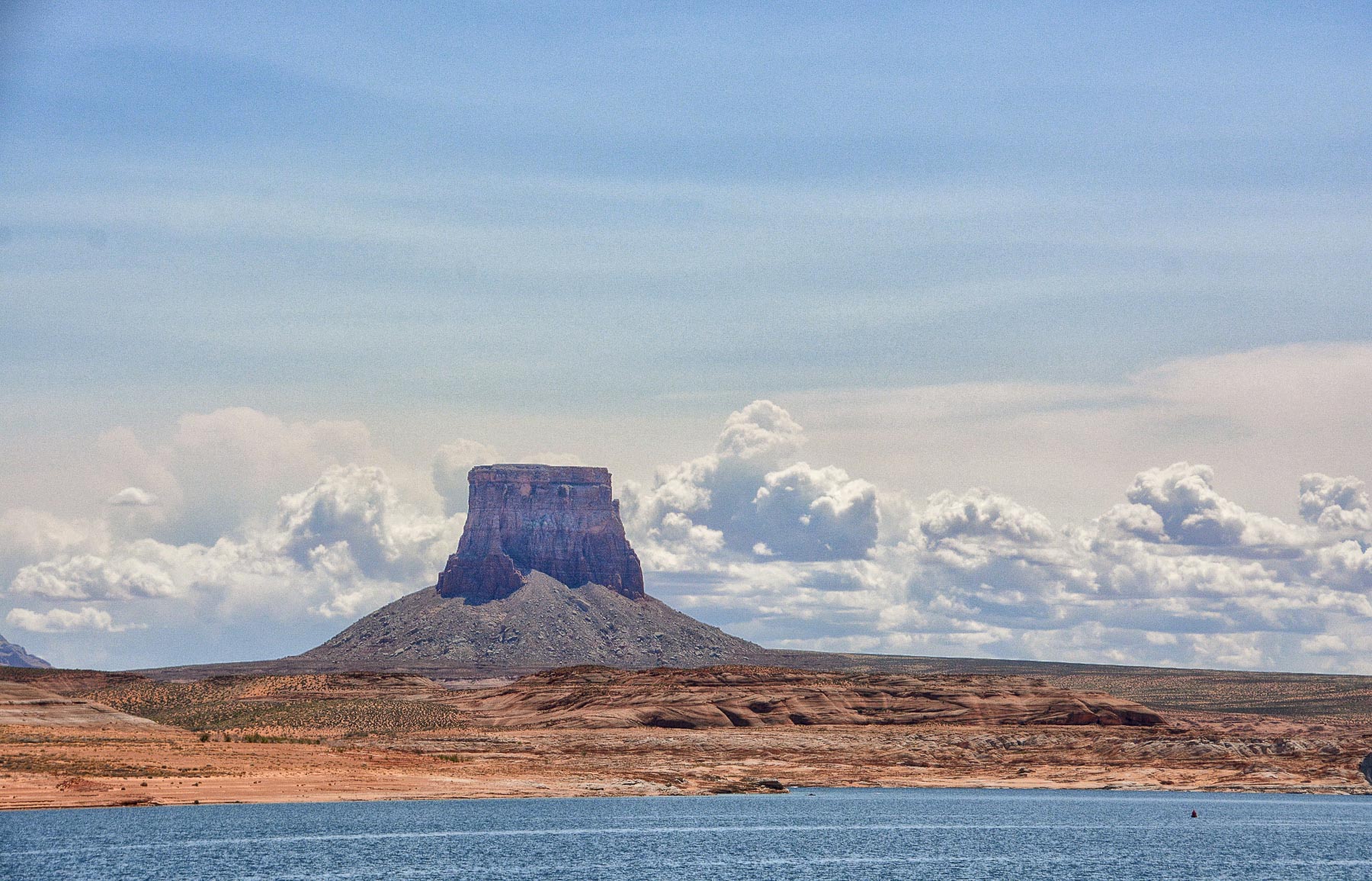 We saved the best for today a cruise on Lake Powell to the Rainbow Bridge Natural Arch. Lake Powell, named after John Wesley Powell, is 186 miles long and backs up into more than 96 major side canyons, and is the second-largest man-made lake in the US. Today we are going to take the cruise boat 50 nautical miles from the Wahweap Marina to Bridge Canyon where the Rainbow Bridge was discovered in 1909. The lake’s crystal clear blue water, more than 500 feet deep in places, is wonderful to explore as we cruised through narrow waterways, past sandstone cliffs and buttes, including the well known Tower Butte.