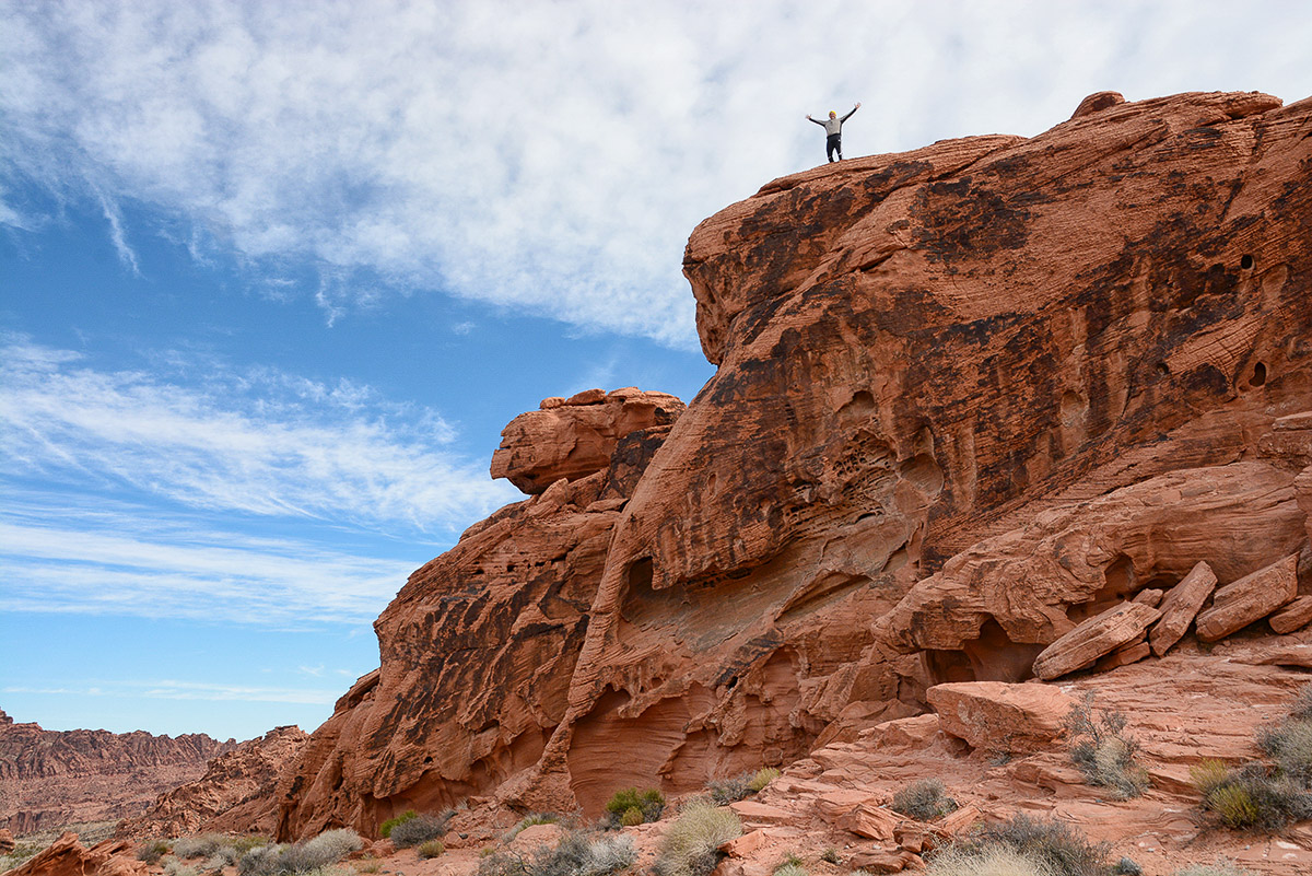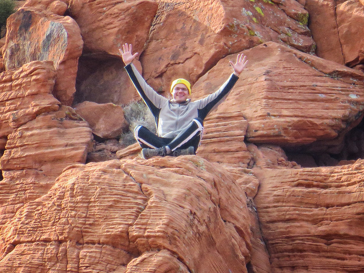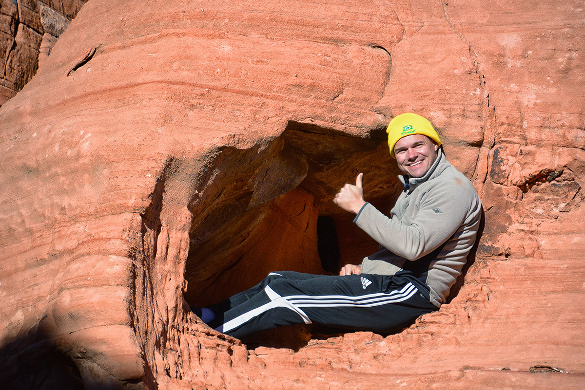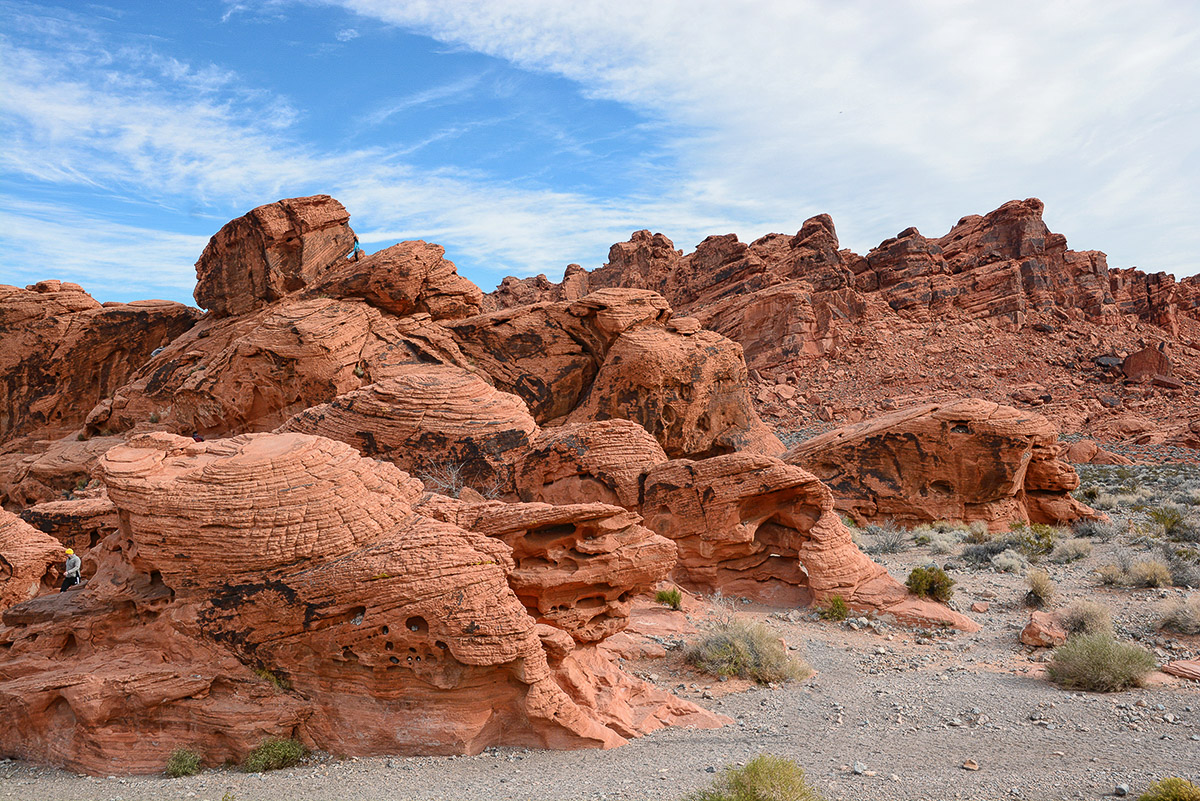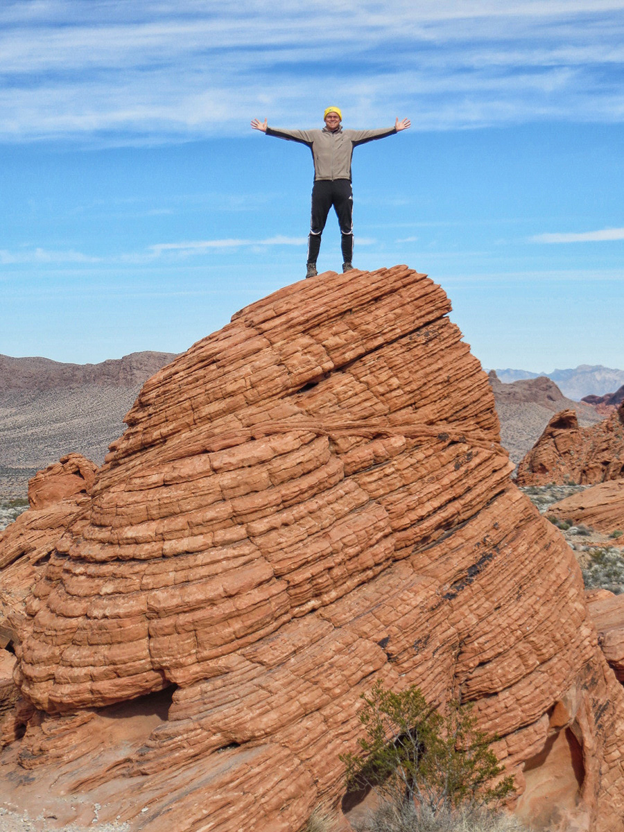 The next morning we drove 55 miles NE from Vegas to the Valley of Fire State Park; dedicated in 1935, the Park is Nevada’s oldest and largest state park. We hiked several trails: Balancing Rock Trail, Petrified Logs Trail, Mouse’s Tank Trail, White Domes Trail and the Beehive Trail. Eric was in his element running up and down the huge sandstone formations and peeking through the many carved out holes in the cliffs. The sandstone cliffs appear to be on fire when reflecting the sun’s rays, a beautiful light show.