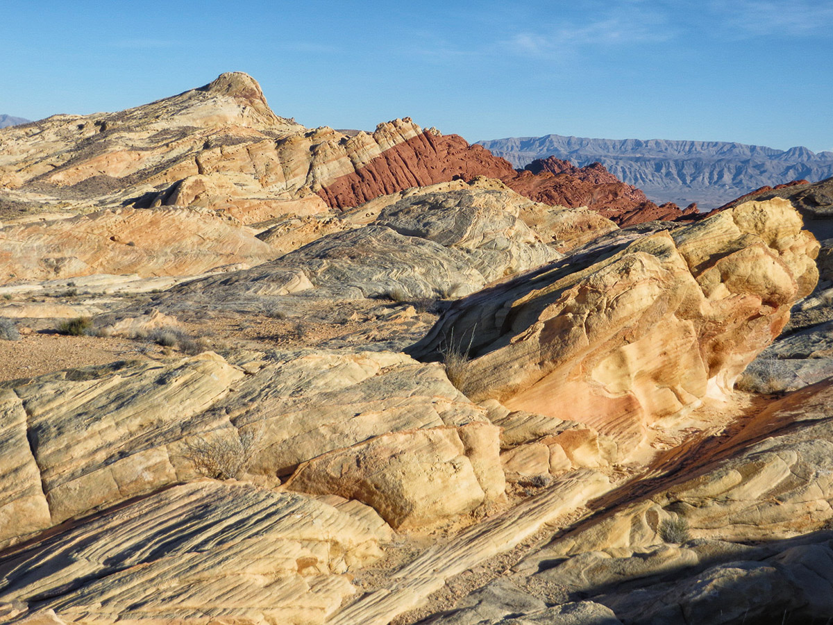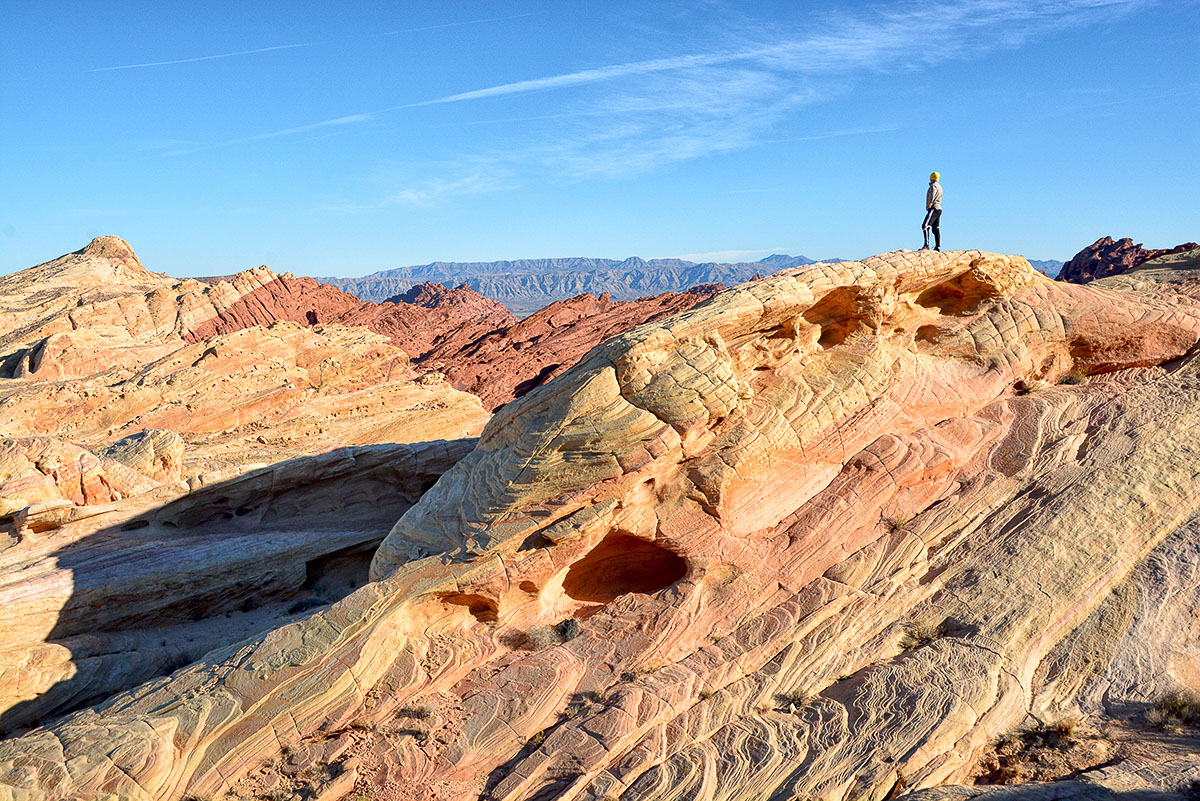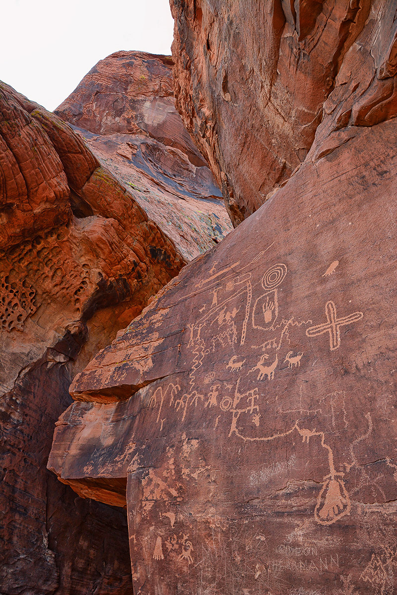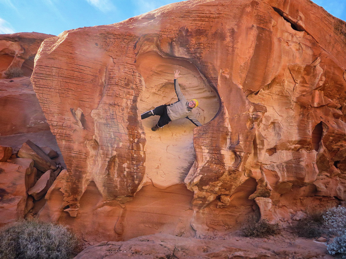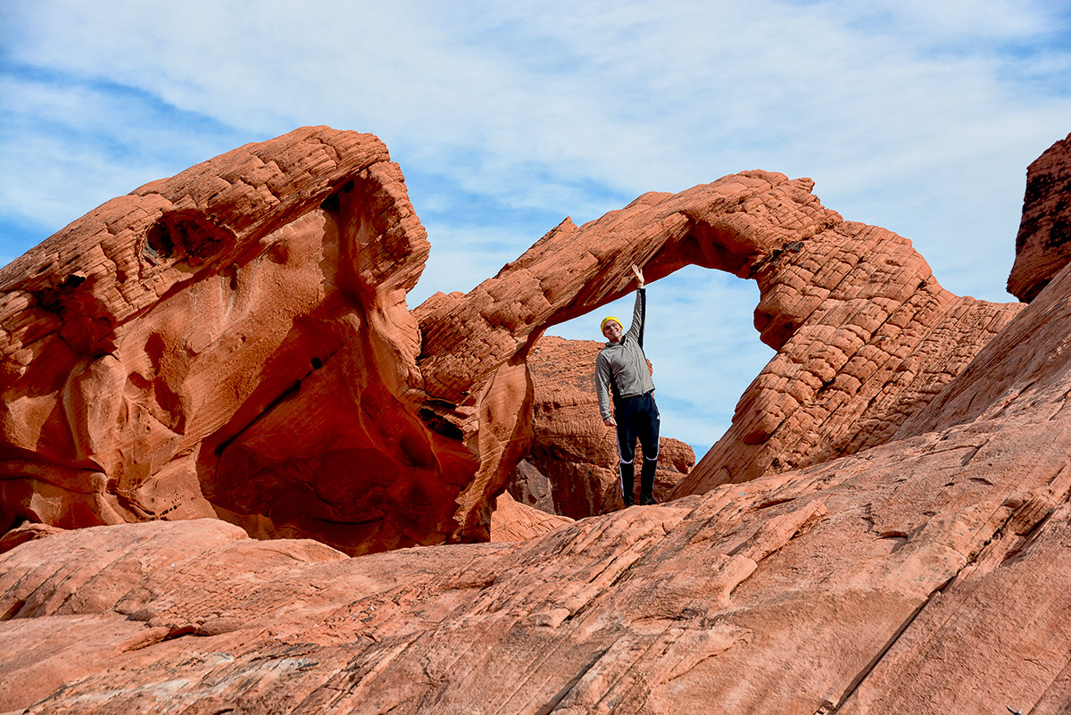 The next morning we drove 55 miles NE from Vegas to the Valley of Fire State Park; dedicated in 1935, the Park is Nevada’s oldest and largest state park. We hiked several trails: Balancing Rock Trail, Petrified Logs Trail, Mouse’s Tank Trail, White Domes Trail and the Beehive Trail. Eric was in his element running up and down the huge sandstone formations and peeking through the many carved out holes in the cliffs. The sandstone cliffs appear to be on fire when reflecting the sun’s rays, a beautiful light show.