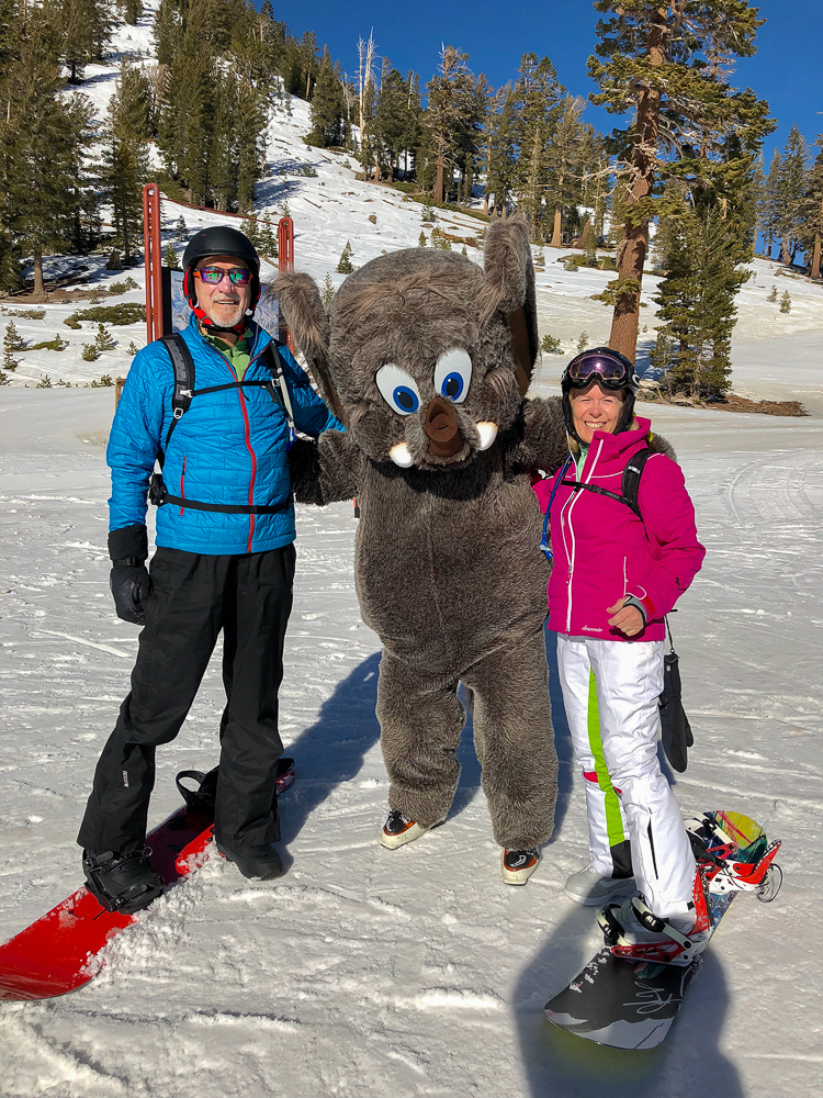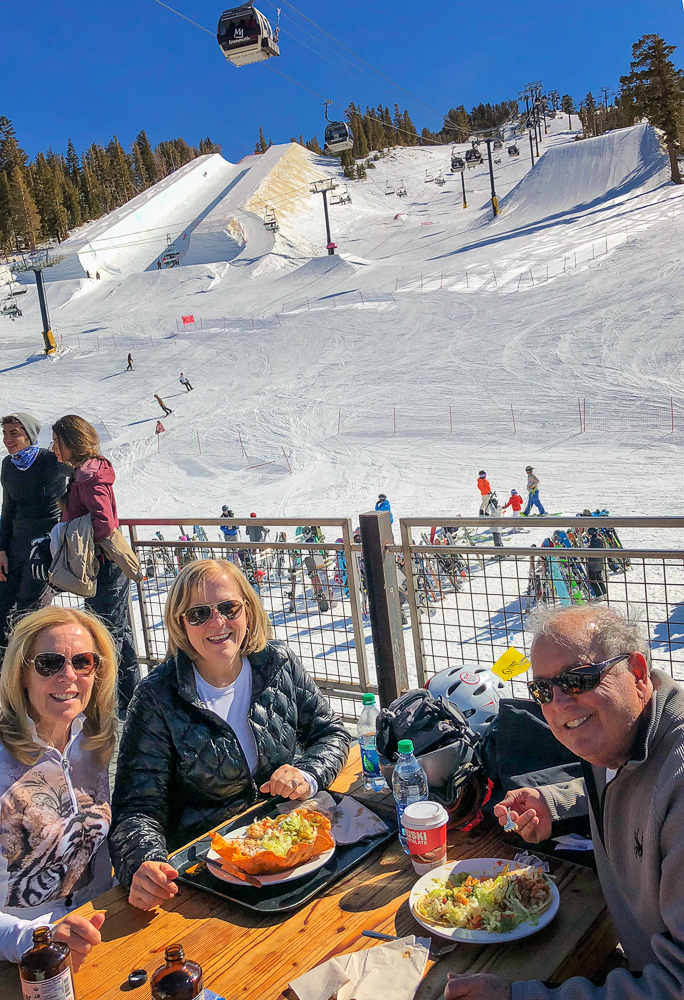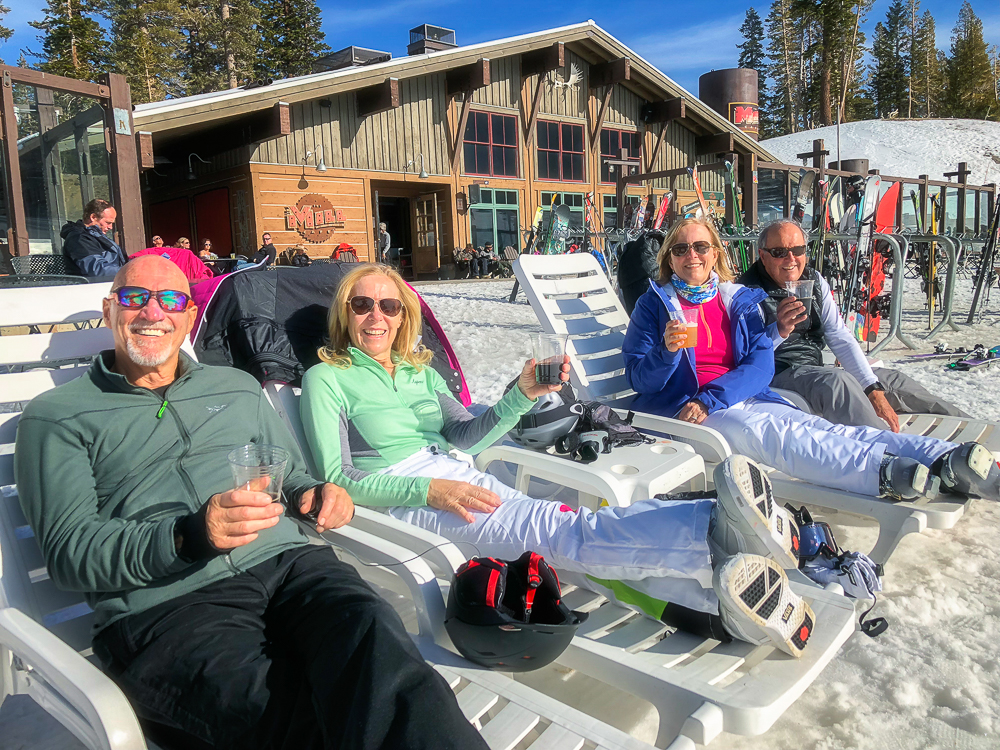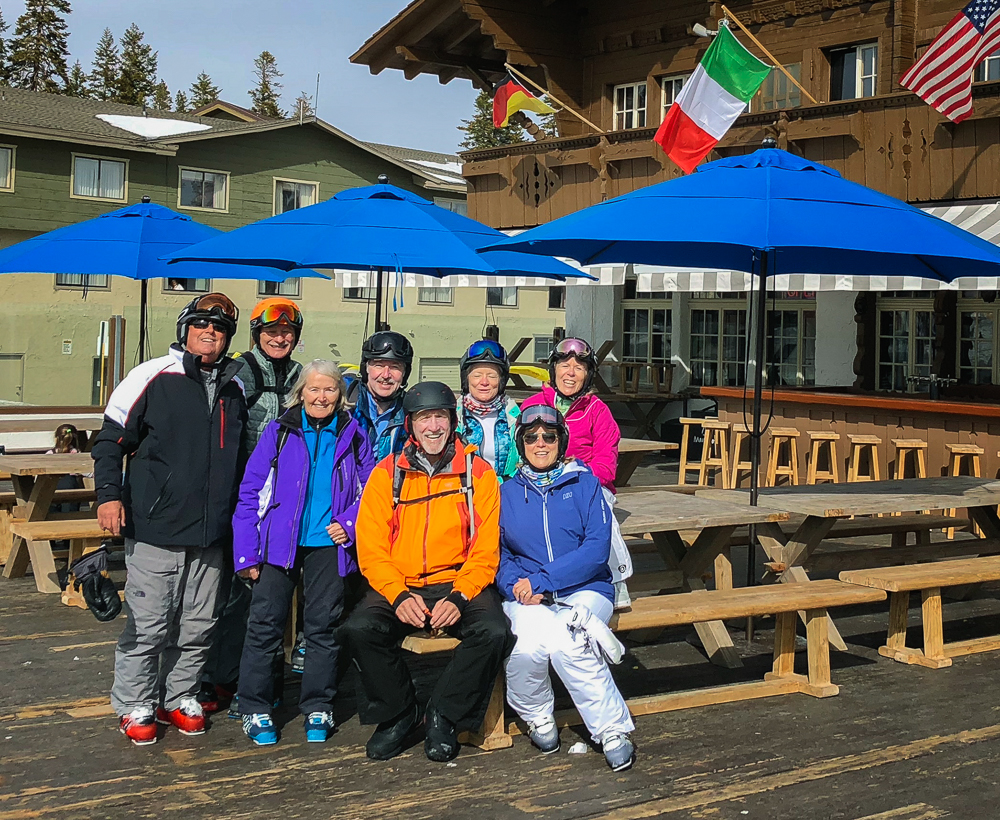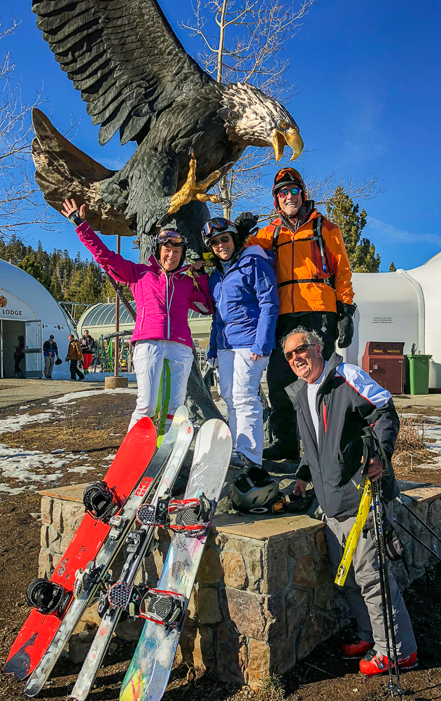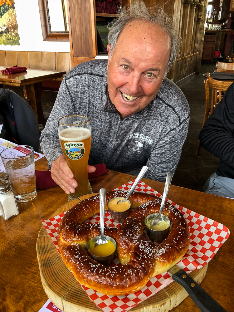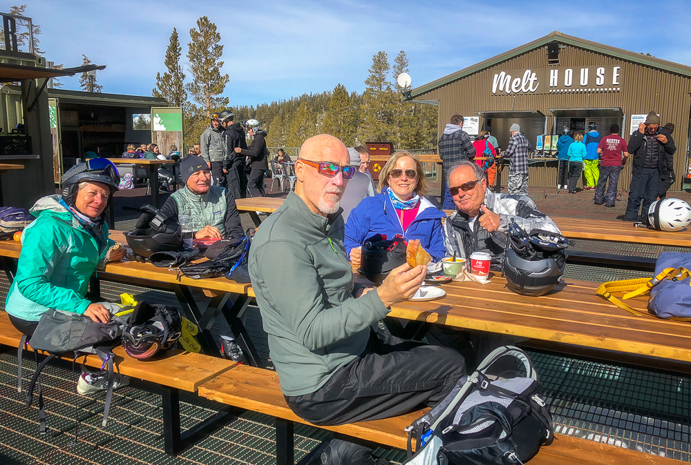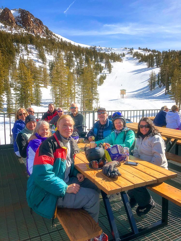 The next morning we started off at the big eagle and skied over to the back side where we had lunch with some of the others in our group at the Melt House and Boundary Bar at the Outpost. Located at the base of chair 13 and 14 lies this hidden gem, menu includes delicious grilled cheese variations, hearty soup, and drinks. The expansive sun deck was a great place to relax and enjoy the Sierra views, or hang out in the fireplace lounges that are built inside shipping containers. That evening we went to the Tamarack Lodge for dinner. We drove past Lake Mary, the largest lake in the Lakes Basin and then on to Twin Lakes where we walked around enjoying the view of Crystal Crag across the Lake and the reflections of the dark granite wall of the Mammoth Crest. The Tamarack Lodge is perched on the shore of Twin Lakes and it is steeped in rustic charm, with one of Mammoth’s most refined restaurants. We took a day off from skiing, while Karen and Bruce were pampered with massages, Bob and drove to Convict Lake and had lunch at Erik Schat’s Bakery in Bishop. Our last day on the slopes we stopped for lunch at the Yodler Restaurant & Bar with some of our group. This Swiss Chalet famous for its authentic Bavarian menu, with the Giant Pretzel, was dismantled in Switzerland 50 years ago and brought over to Mammoth Mountain, situated next to the Main Lodge. Mammoth Mountain is one of our favorite places to snowboard and it was so much fun sharing it with our friends from Chagrin Valley Ski Club in Ohio. Click on thumbnail to view images