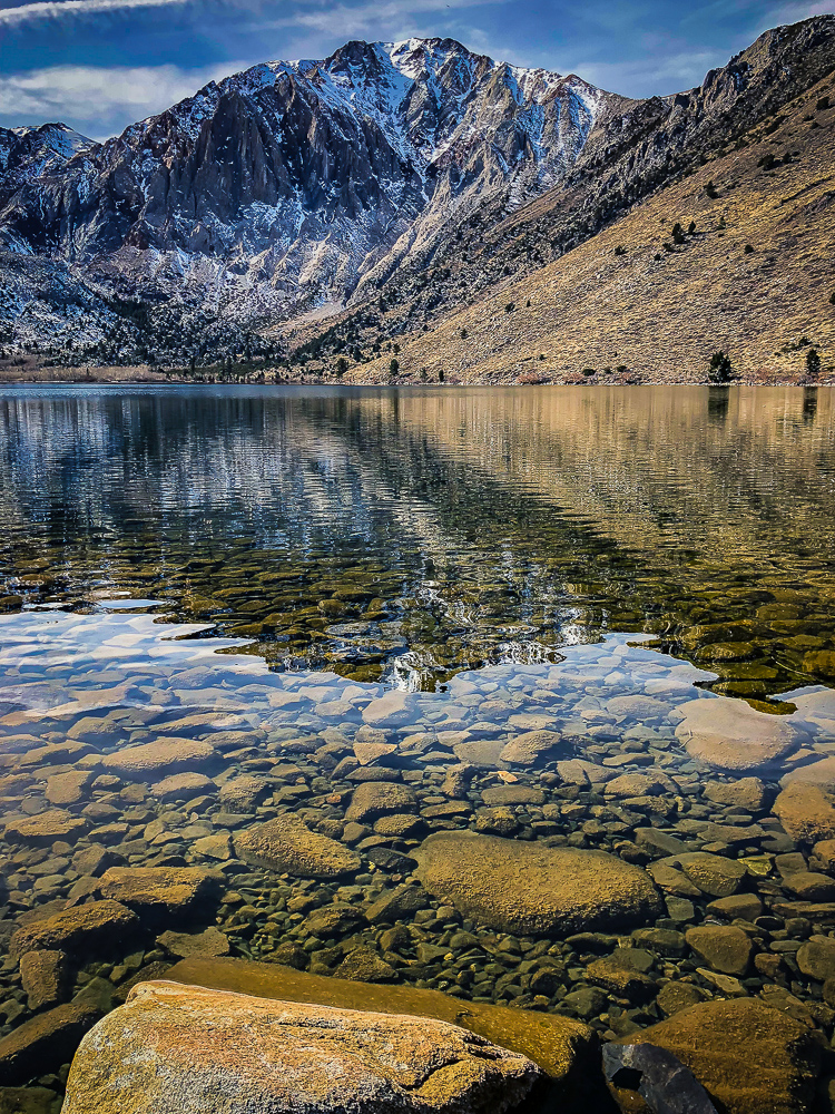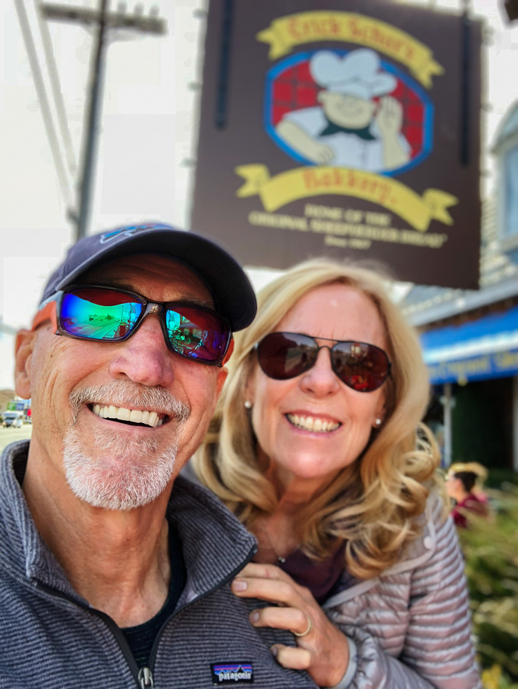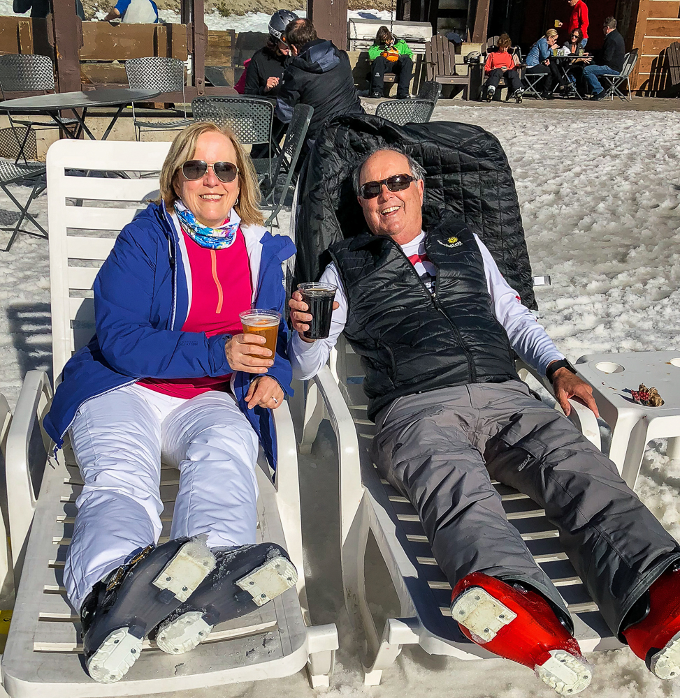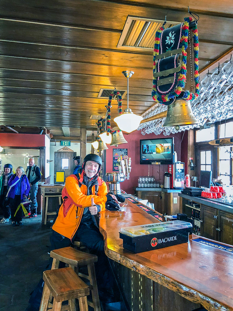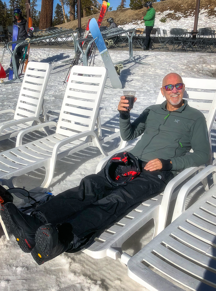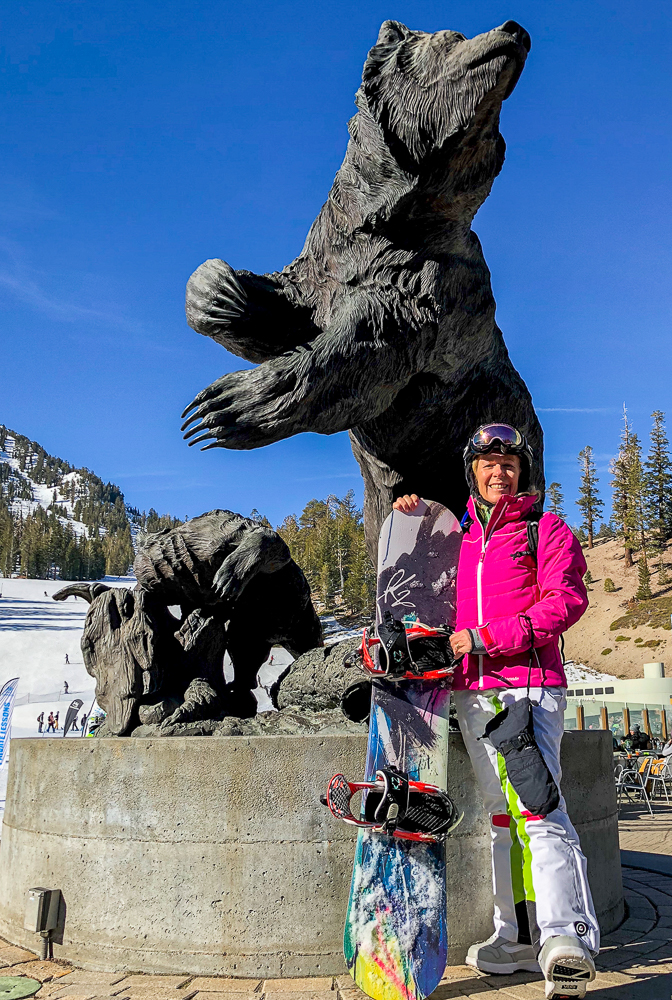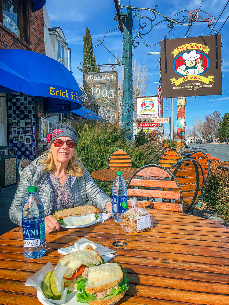The next morning we started off at the big eagle and skied over to the back side where we had lunch with some of the others in our group at the Melt House and Boundary Bar at the Outpost. Located at the base of chair 13 and 14 lies this hidden gem, menu includes delicious grilled cheese variations, hearty soup, and drinks. The expansive sun deck was a great place to relax and enjoy the Sierra views, or hang out in the fireplace lounges that are built inside shipping containers. That evening we went to the Tamarack Lodge for dinner. We drove past Lake Mary, the largest lake in the Lakes Basin and then on to Twin Lakes where we walked around enjoying the view of Crystal Crag across the Lake and the reflections of the dark granite wall of the Mammoth Crest. The Tamarack Lodge is perched on the shore of Twin Lakes and it is steeped in rustic charm, with one of Mammoth’s most refined restaurants. We took a day off from skiing, while Karen and Bruce were pampered with massages, Bob and drove to Convict Lake and had lunch at Erik Schat’s Bakery in Bishop. Our last day on the slopes we stopped for lunch at the Yodler Restaurant & Bar with some of our group. This Swiss Chalet famous for its authentic Bavarian menu, with the Giant Pretzel, was dismantled in Switzerland 50 years ago and brought over to Mammoth Mountain, situated next to the Main Lodge. Mammoth Mountain is one of our favorite places to snowboard and it was so much fun sharing it with our friends from Chagrin Valley Ski Club in Ohio. Click on thumbnail to view images